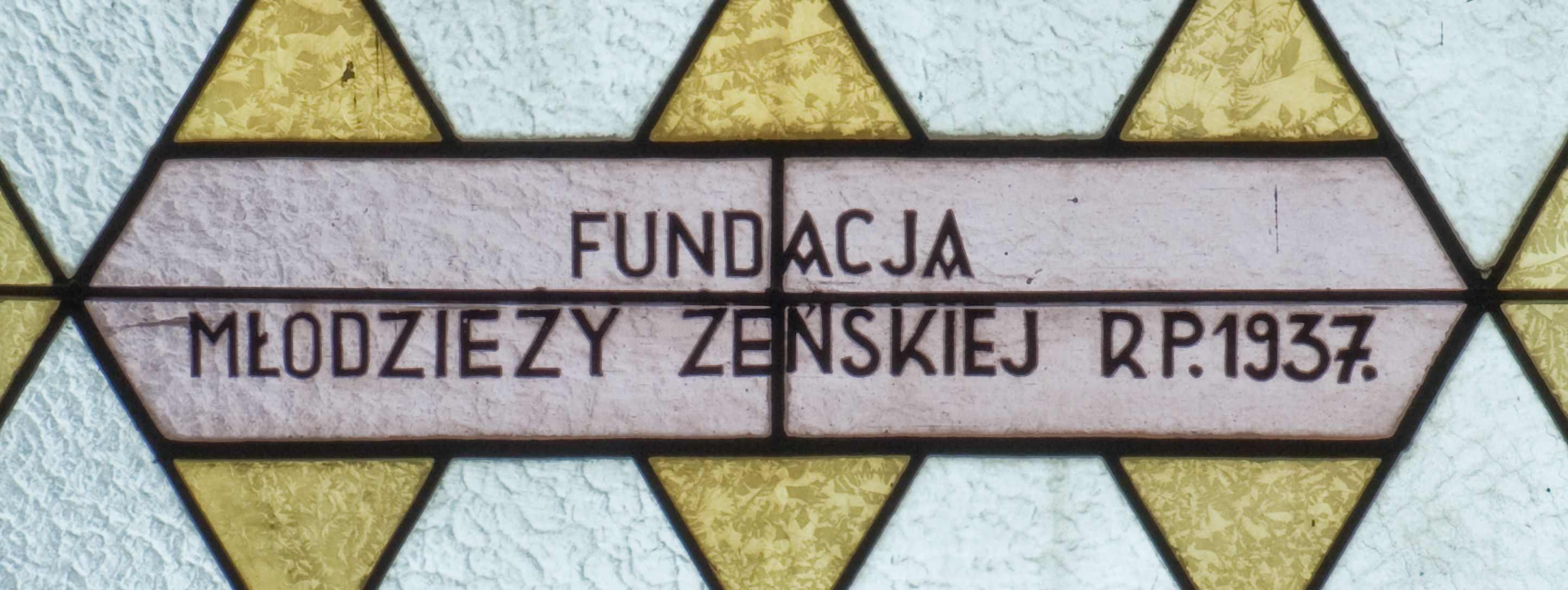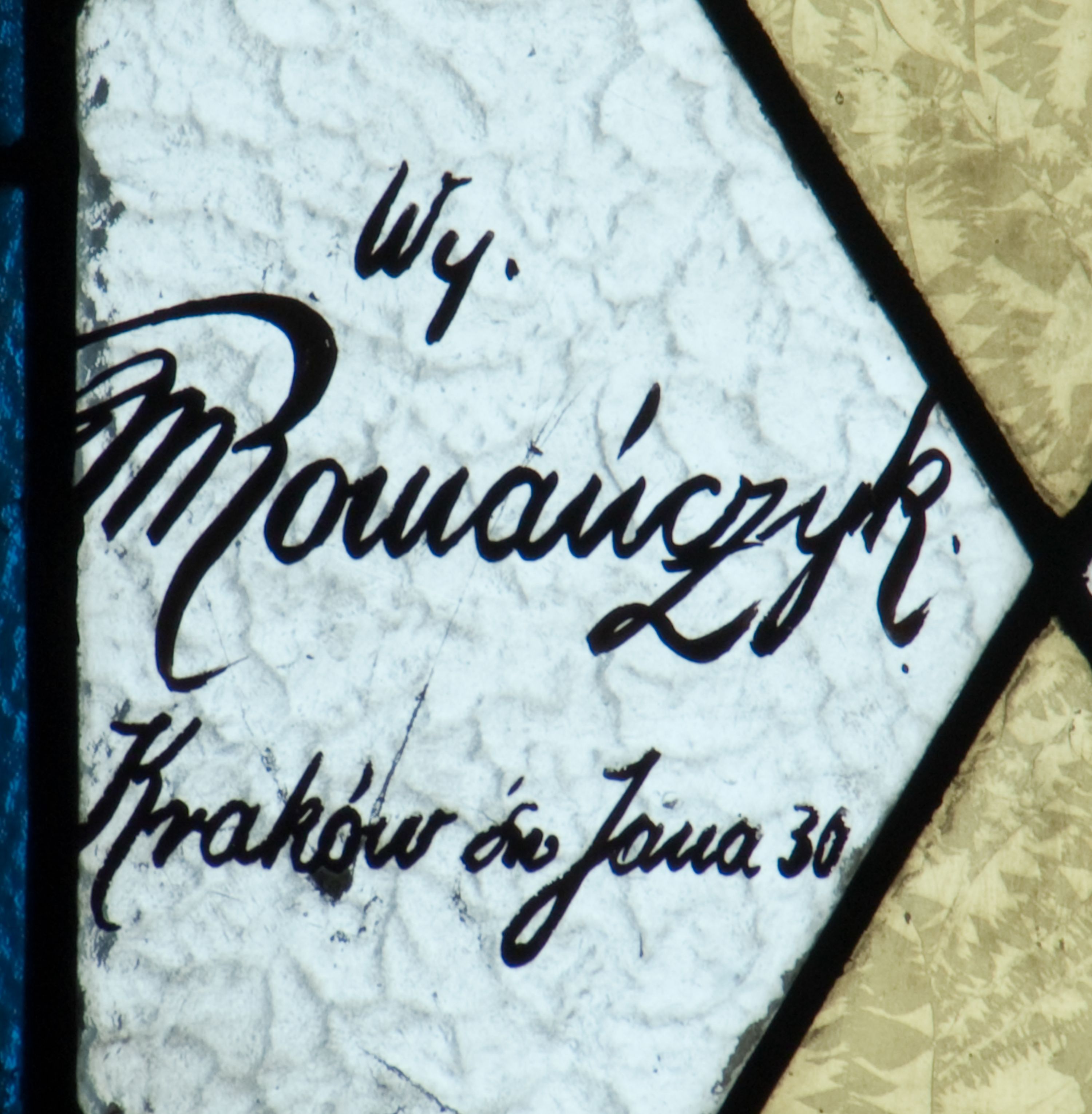 The stained glass was made in 1937 in a workshop carried out by Maksymilian Romańczyk at the following street: św. Jana 30, in Cracow. The work was funded by Young Women's from the parish of the Protection of the Virgin Mary in Zabierzów Bocheński. The medallion depicts St. Thérèse of Lisieux, also called the Saint Thérèse of the Child Jesus. The woman saint was born in 1873 in Normandy and she died in 1897. At the age of 15, she joined the convent of Discalced Carmelites. In iconography she is depicted based on authentic photographs. She often has a crucifix or a bunch of roses in her hand. She is a patroness of the following orders: Discalced Carmelites, Calced Carmelites, France and also of people suffering from headaches and heart diseases.