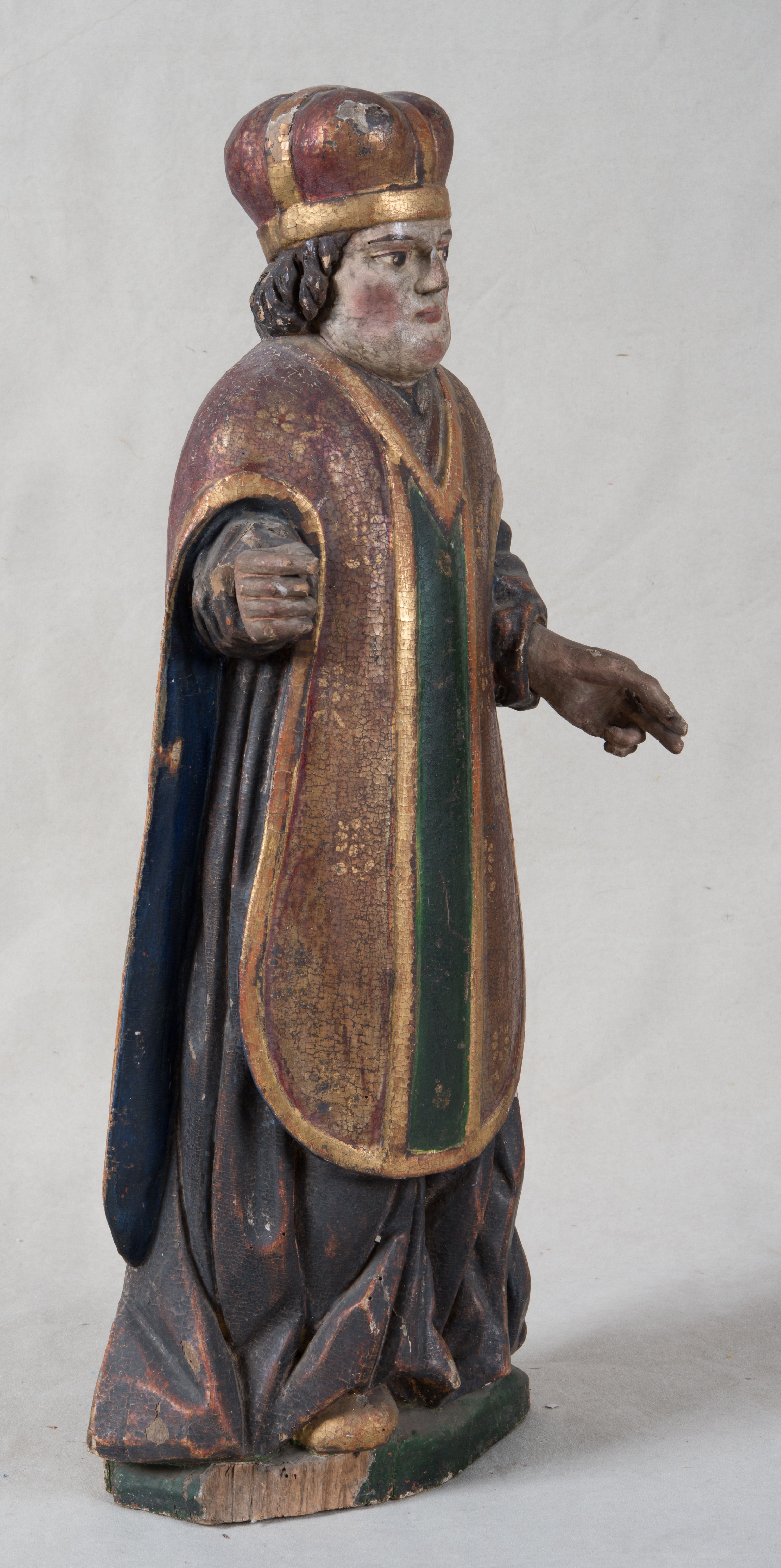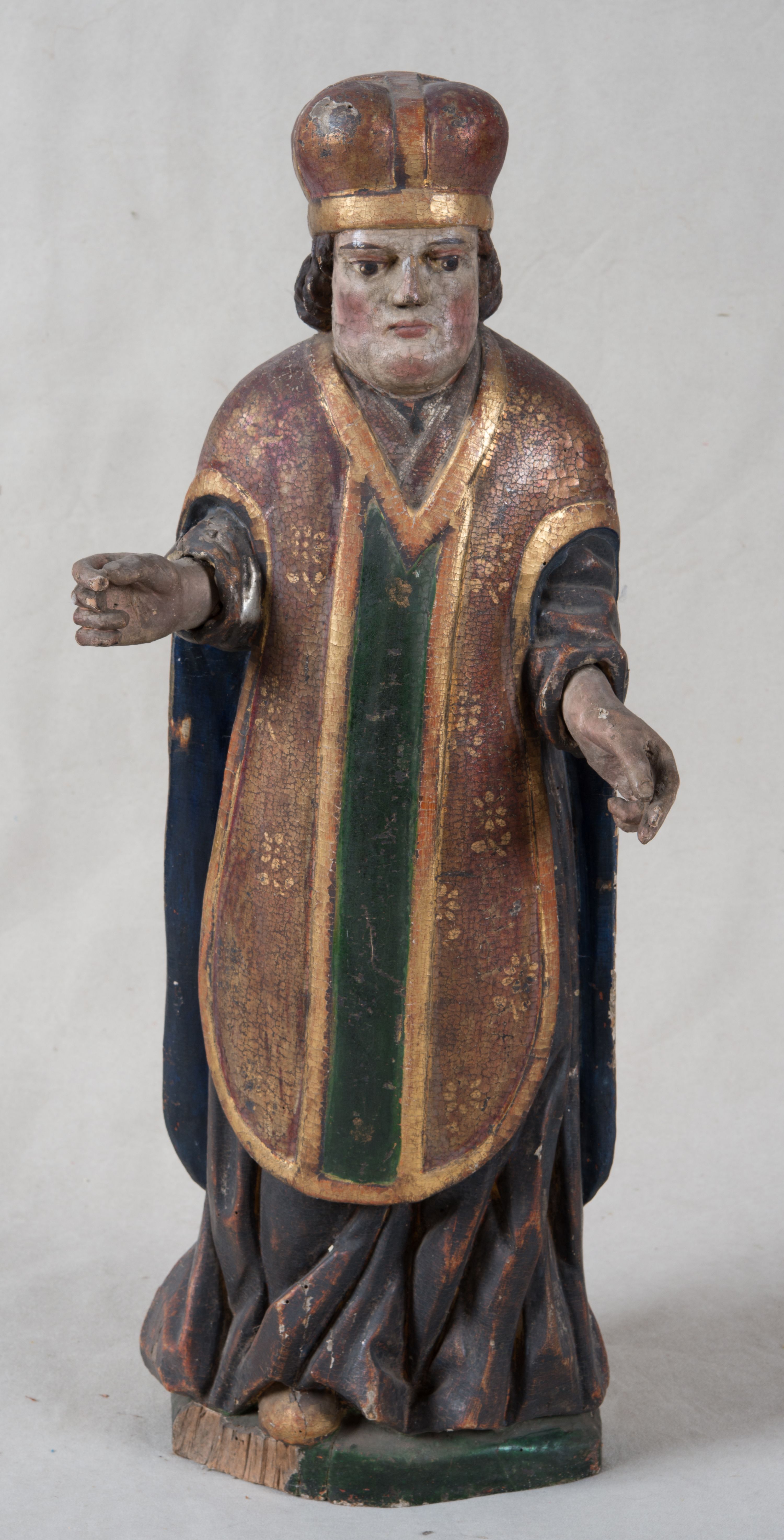 Statue of St. Valentine was created in the 17th century. Probably it was a sculptural decoration of one of the old altars in the church. Saint Valentine was a bishop and a martyr. In iconography, he is usually depicted wearing a priest attire, alb with a chasuble. With regard to the statue being discussed, a bishop's dignity is visible by mitre on his head and probably a pastoral staff which was held by the saint in his right hand.