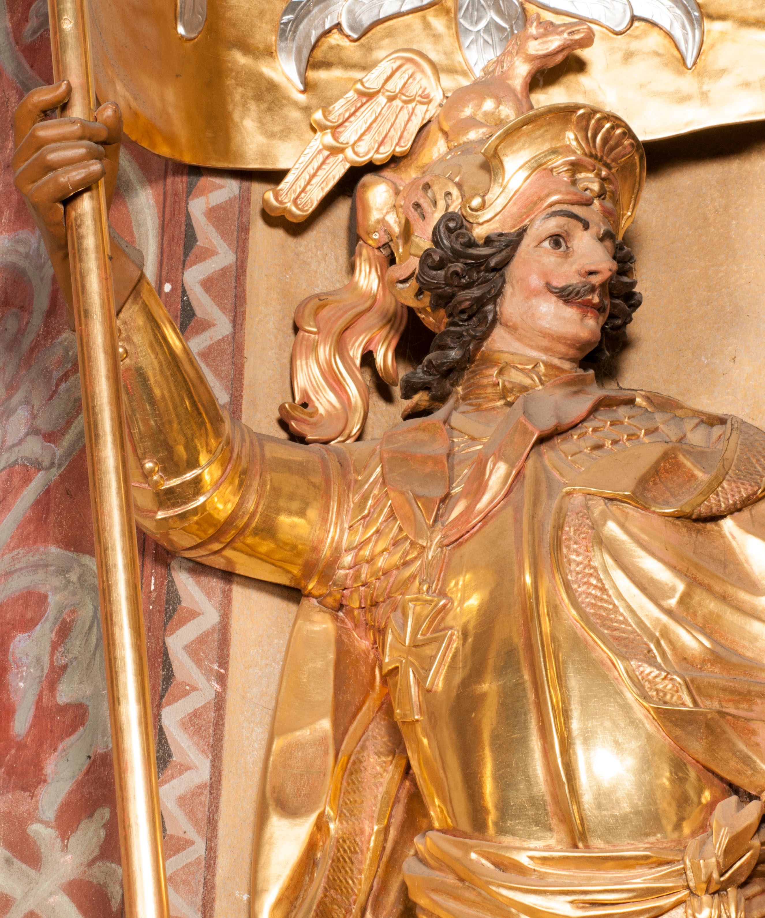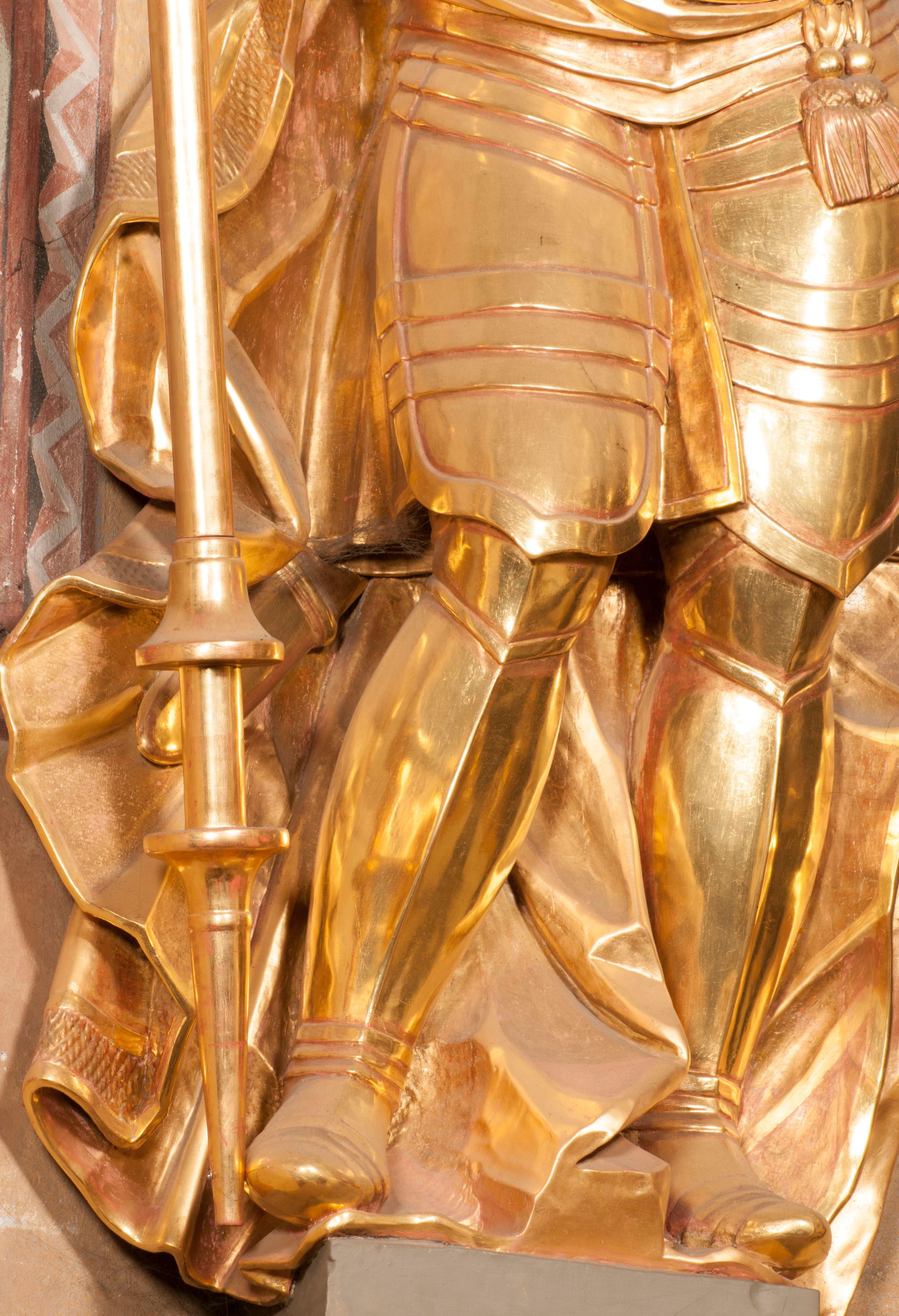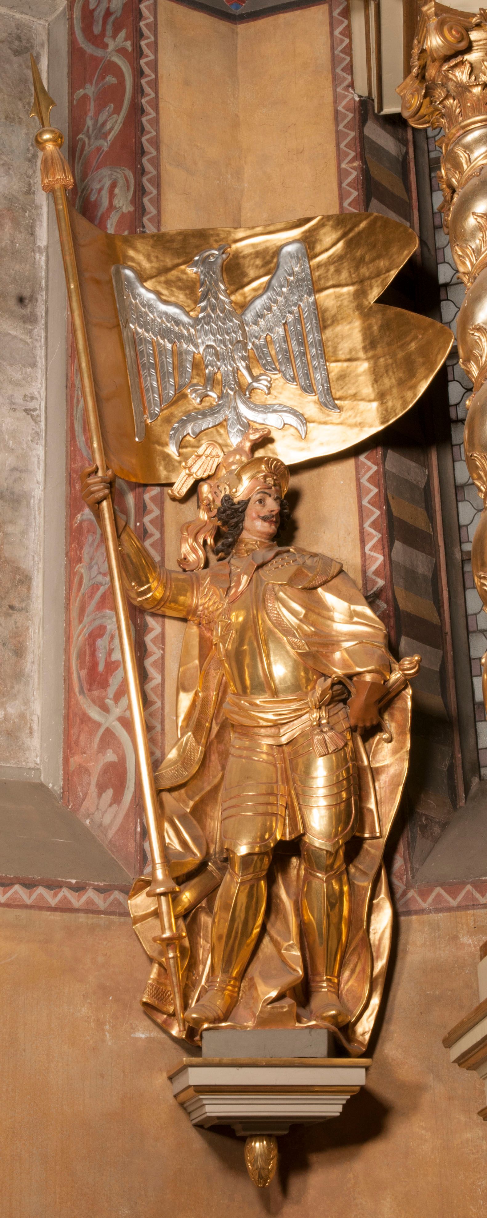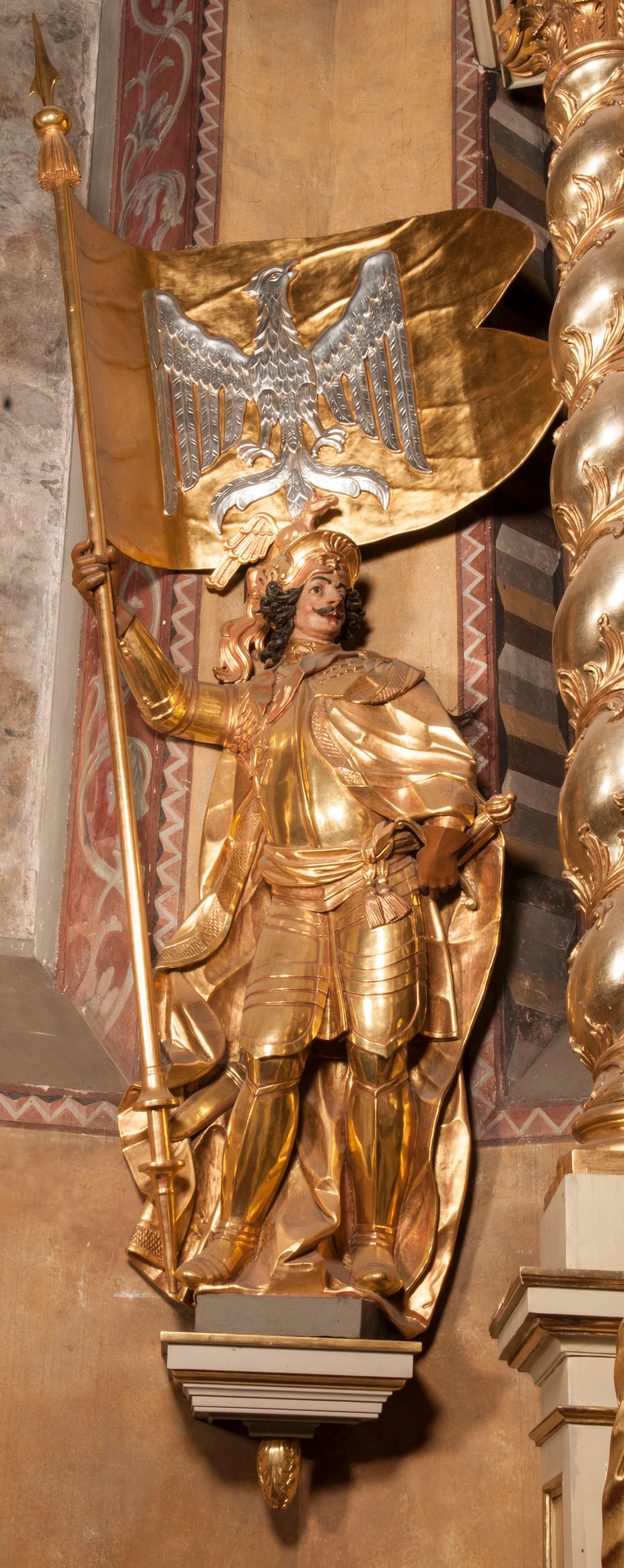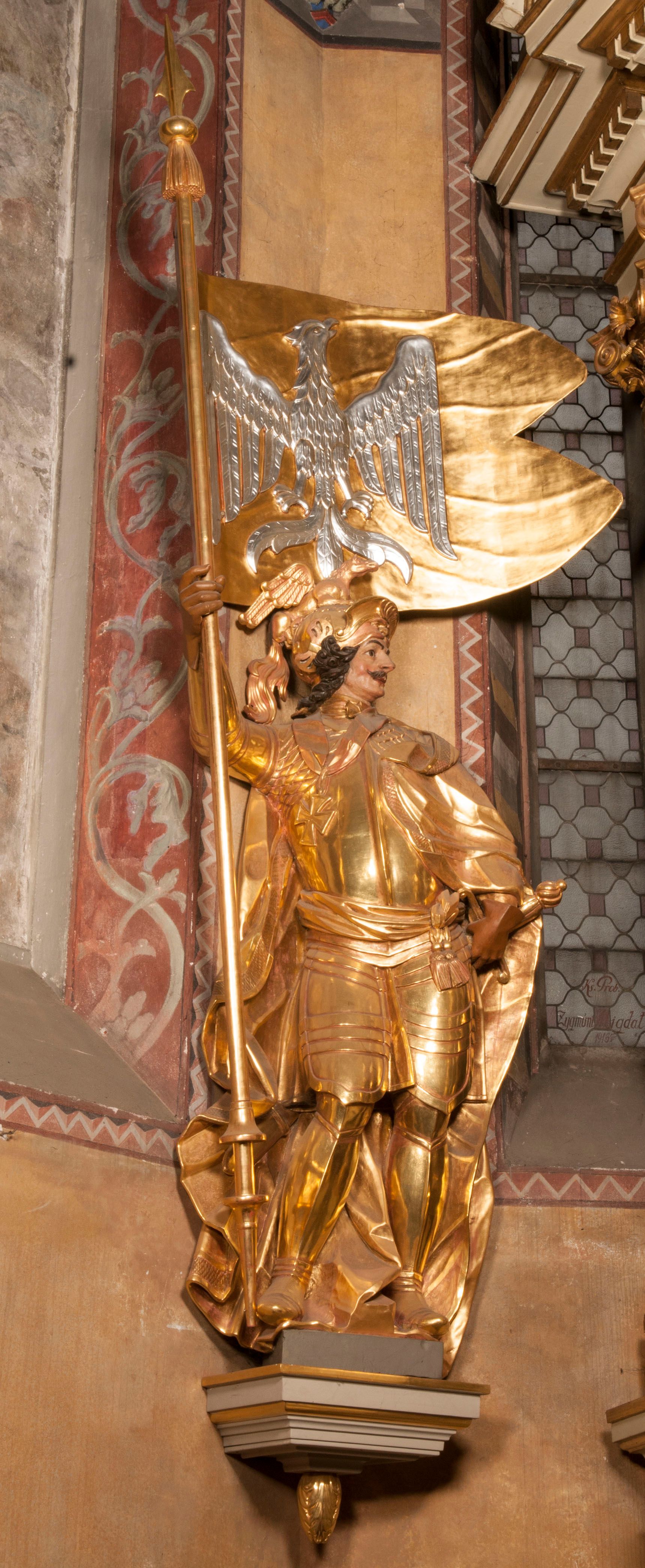 The figures of St. Wenceslaus and St. Florian were created in the fourth quarter of the 18th century. They were then re-mounted on both sides of the high altar in Niepołomice. These works are characterised by an incredibly high level of workmanship, which is not characteristic of the works of sculptors operating in Cracow at that time. Wenceslaus was a historical figure. He is considered a saint and martyr. He was the son of the Czech prince Vratislav I, after the death of whom he assumed the throne. He died in the church in Stary Bolesławiec at the hands of the emissaries of his brother, Boleslaw.