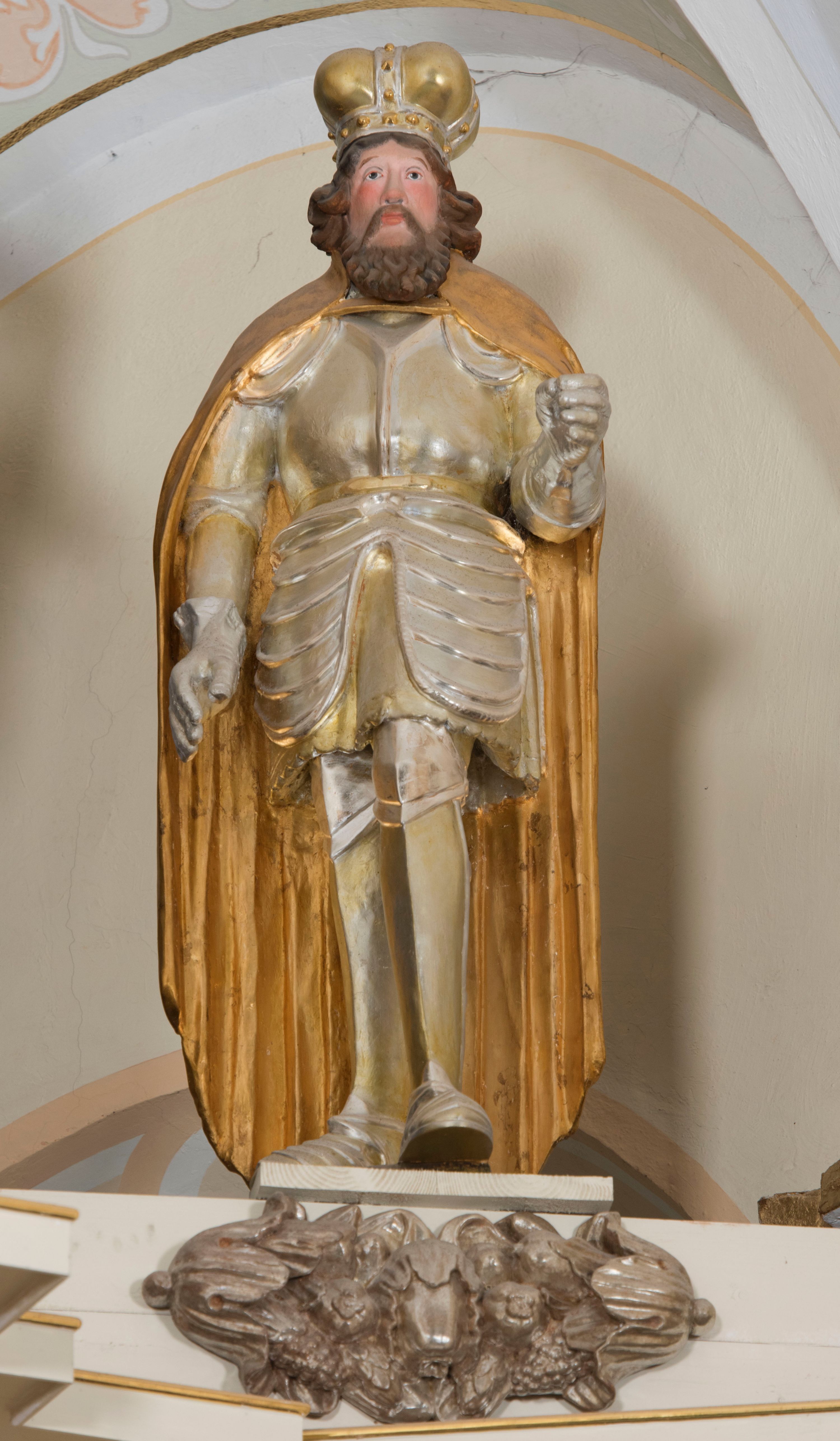 One of the sculptures adorning the structure of the high altar at the parish church in Kęty, which represents St. Wenceslaus from Czechia, displays style traits characteristic of the Polish sculptures of the mid-17th century.