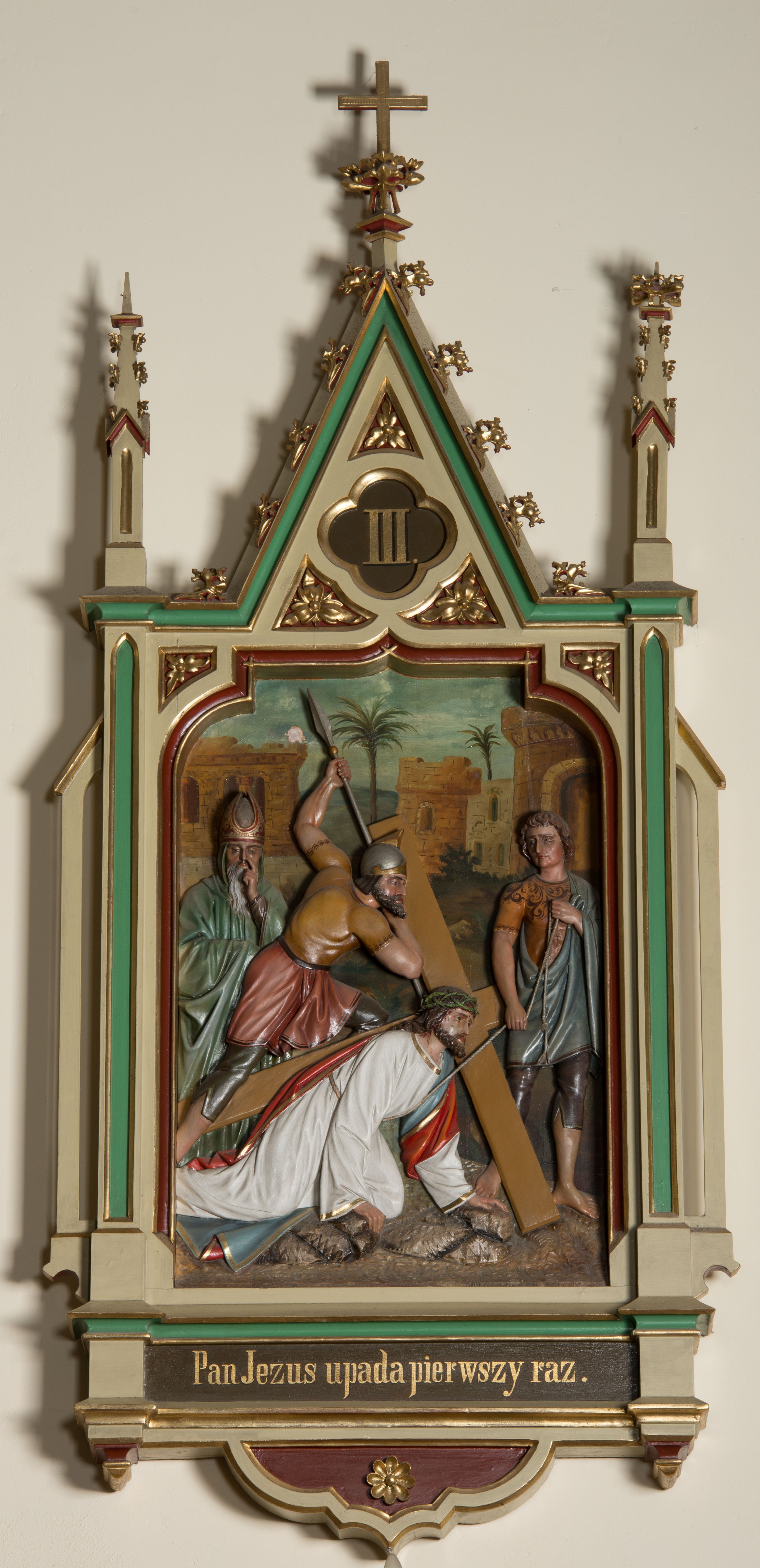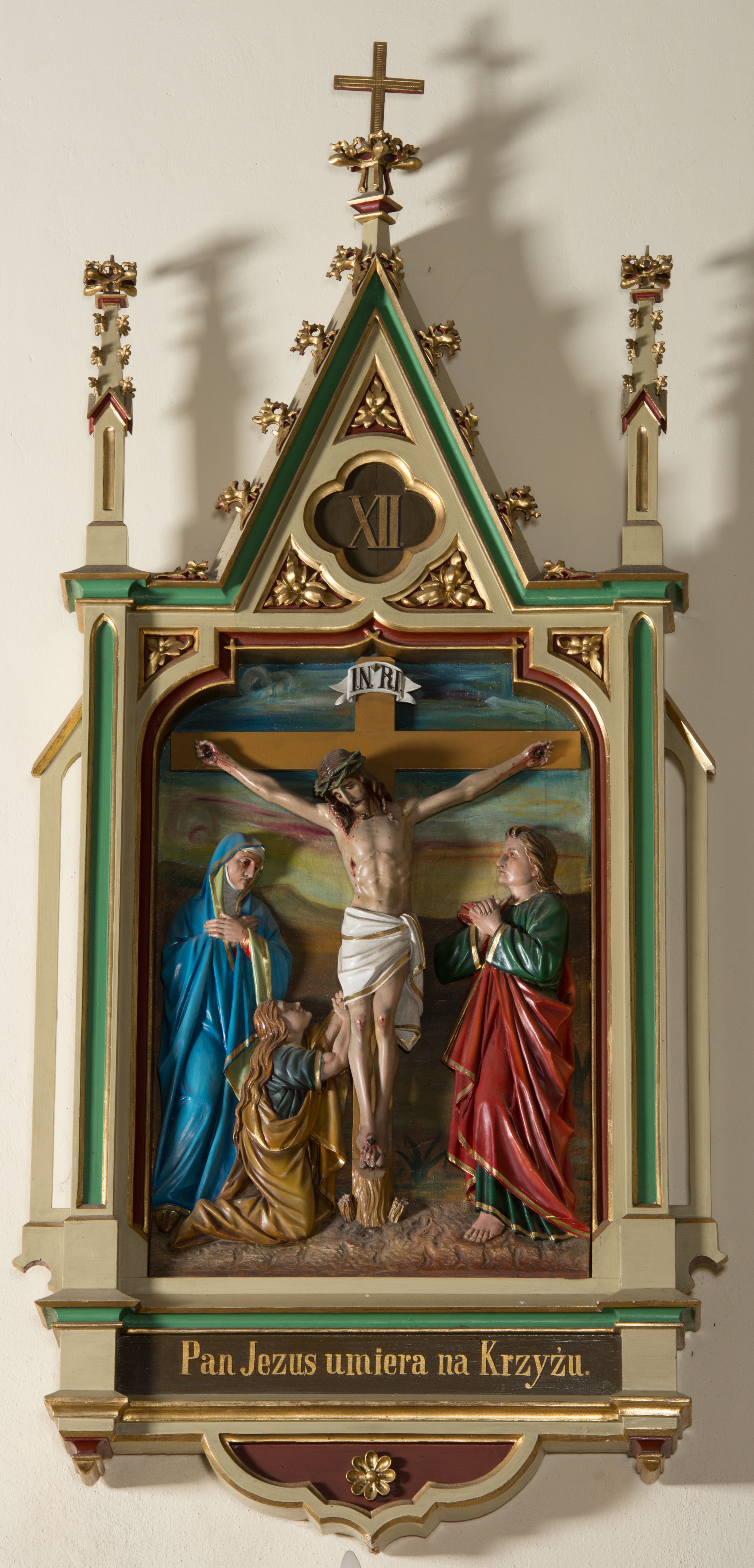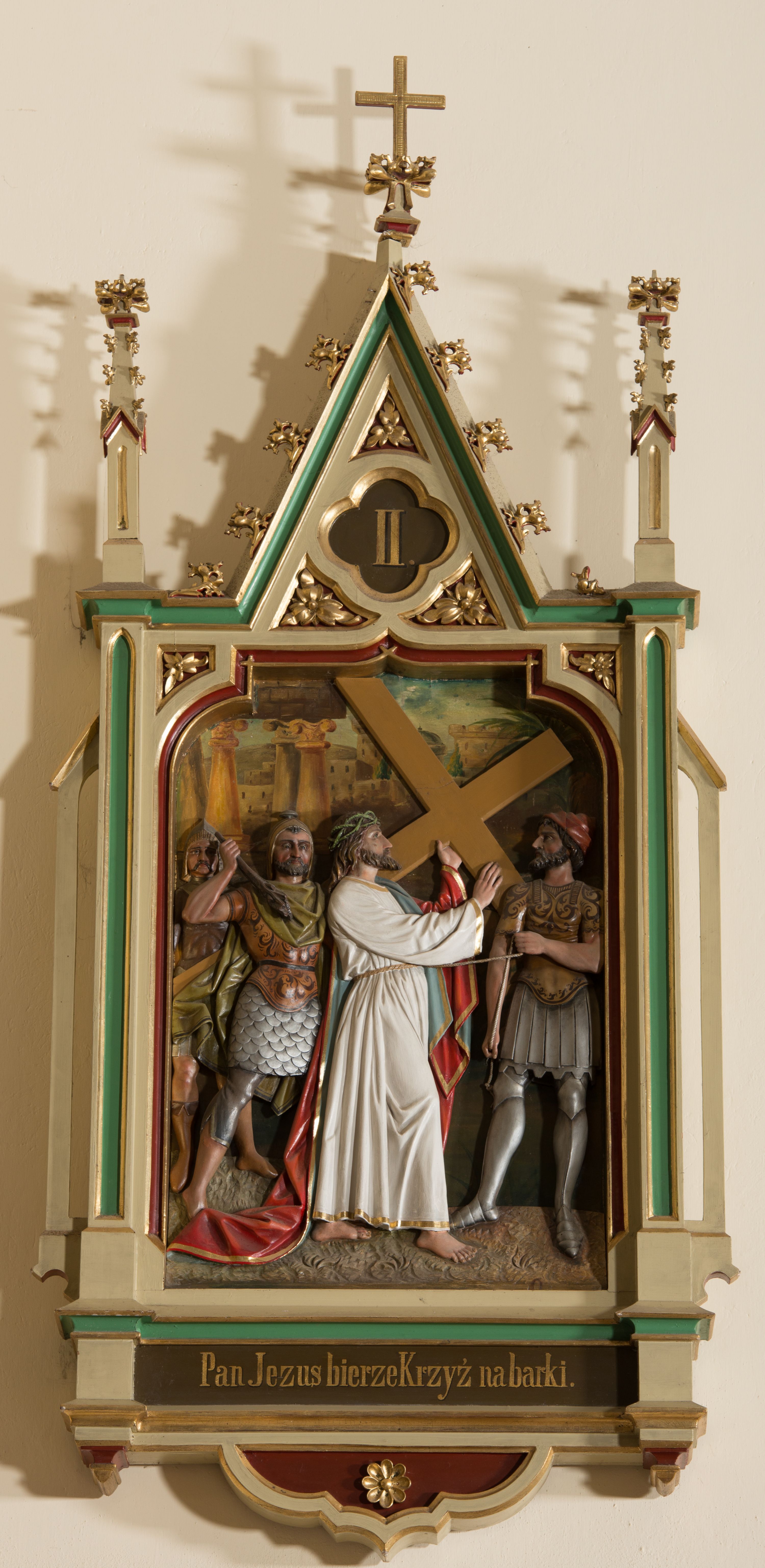 The Stations of the Cross in the church in Krzeszów were made by Ferdinand Stuflesser, Tyrolean sculptor, author of the largest part of furnishings of a newly-built church (under the invocation of Our Lady of Perpetual Help) in Krzeszów, around 1903. The funder of the work was Michał Baca and other parishioners. Apart from stations of the cross, there are also other works of Stuflesser, namely, high altar and side altars with sculpture decorations. Ferdinand Stuflesser was the owner of one of leading workshops in Gröden which he found in 1875, probably after he returned from Munich, where he studied under the supervision of Josef Knabel.