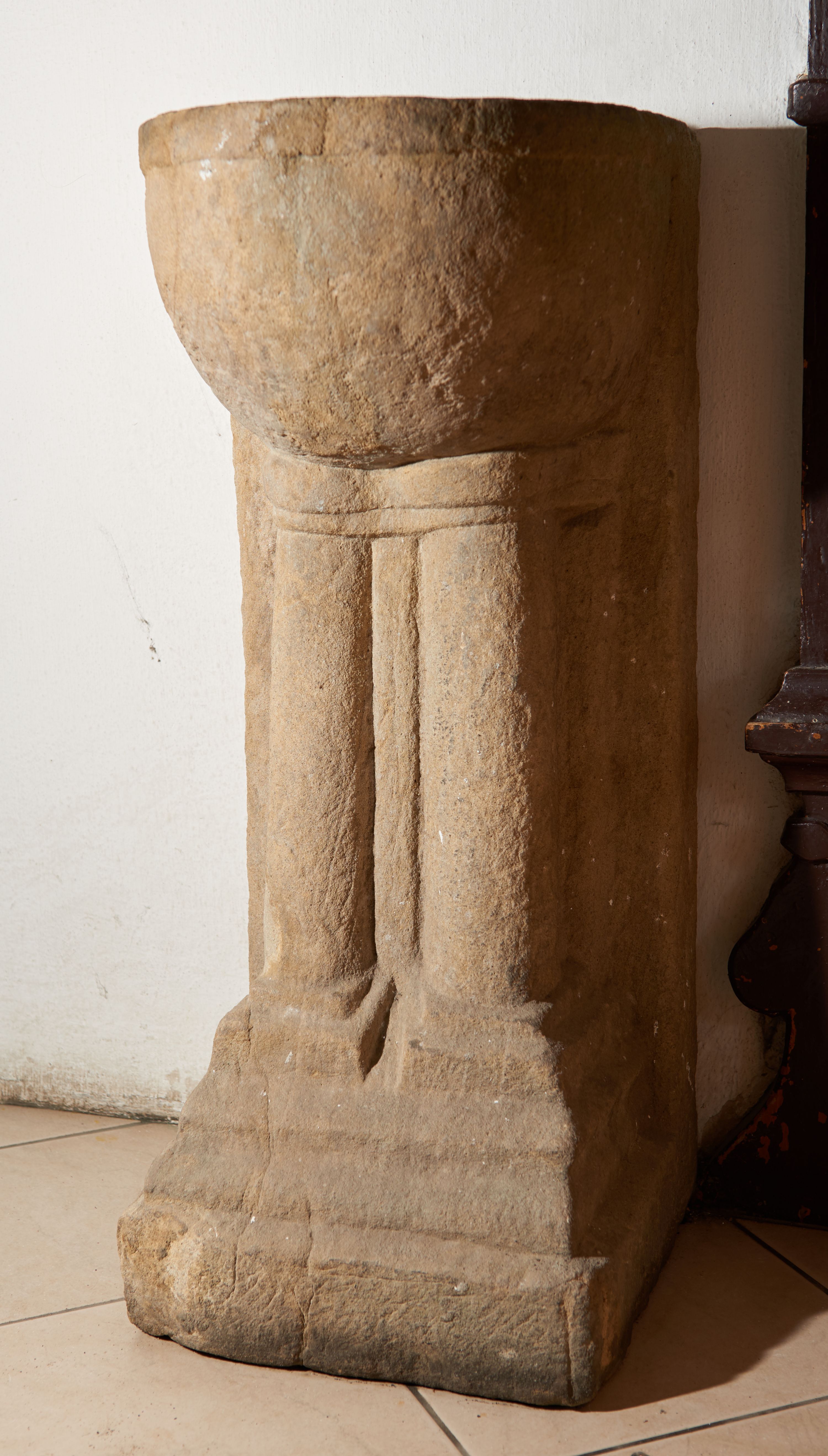 A stoup is a tank for holy water placed in the vestibule of the church, usually in the porch. It may be wall-mounted or free-standing, as is this case. The font in question was made in the nineteenth century, most probably in 1856 on the initiative of the priest Ludwik Nawarry.