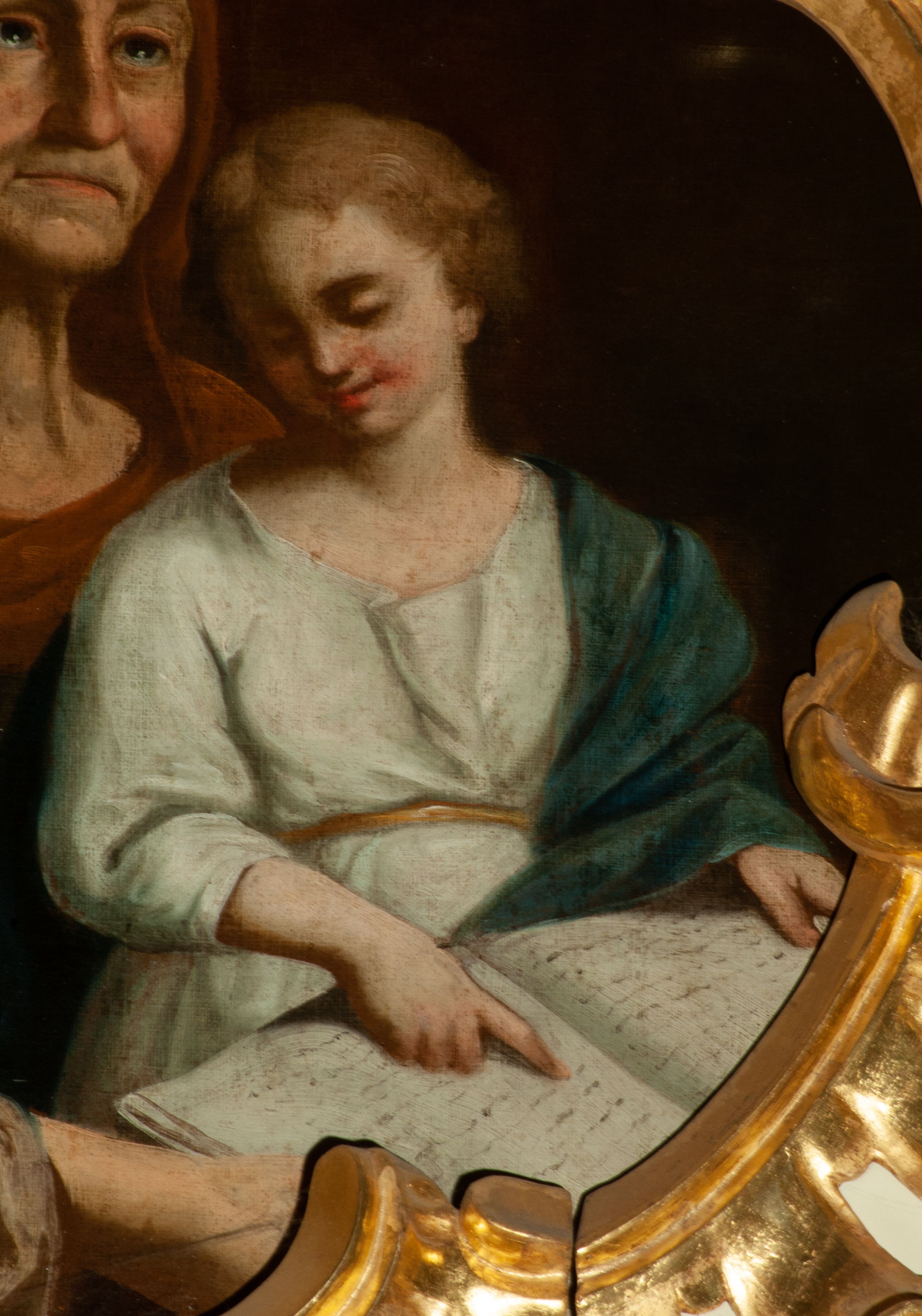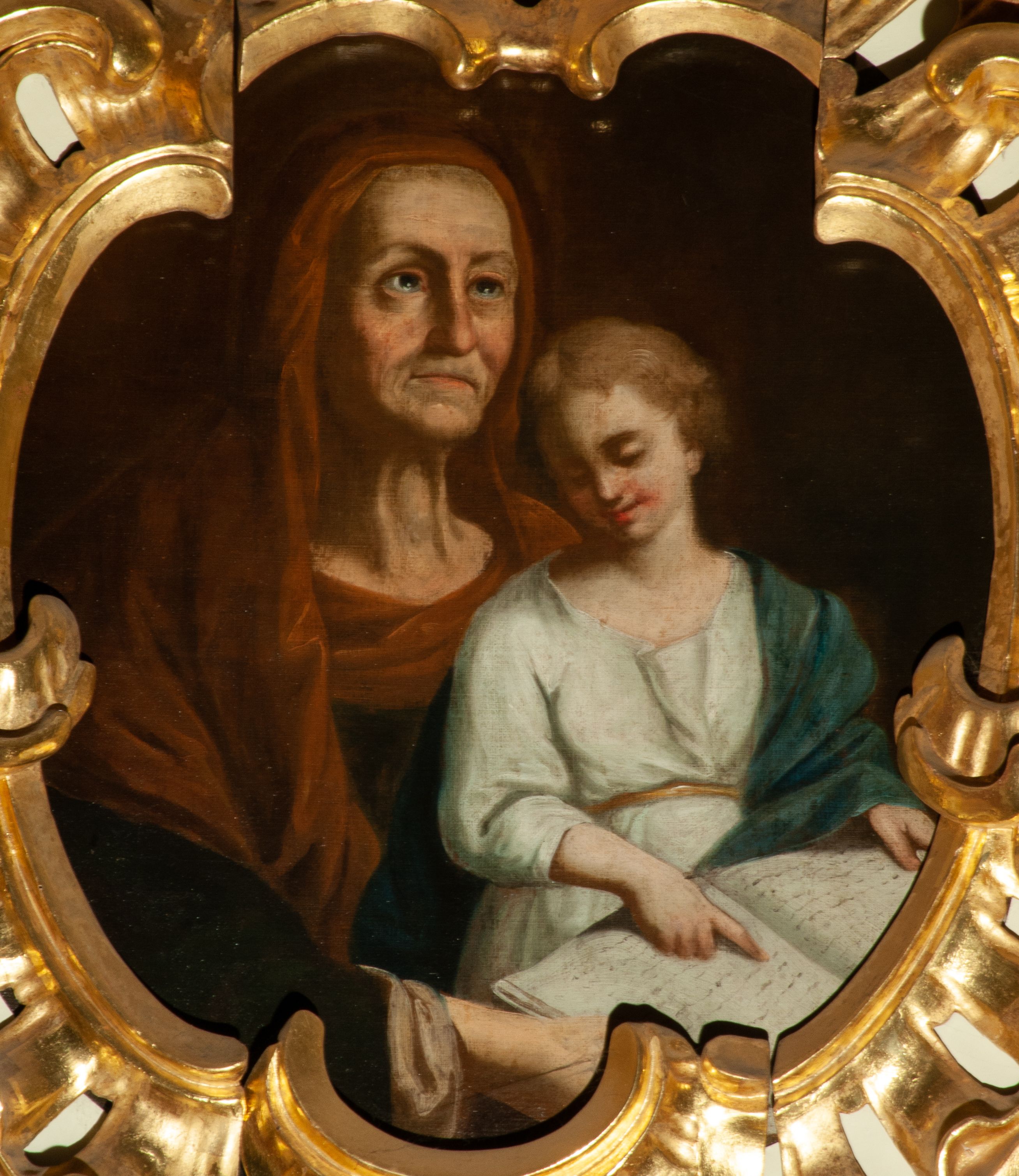 The painting of unidentified attribution was created in the third quarter of the 18th century and inserted into the finial of the side altar. It depicts the Teaching Mary – a theme illustrating the childhood of the Mother of God.