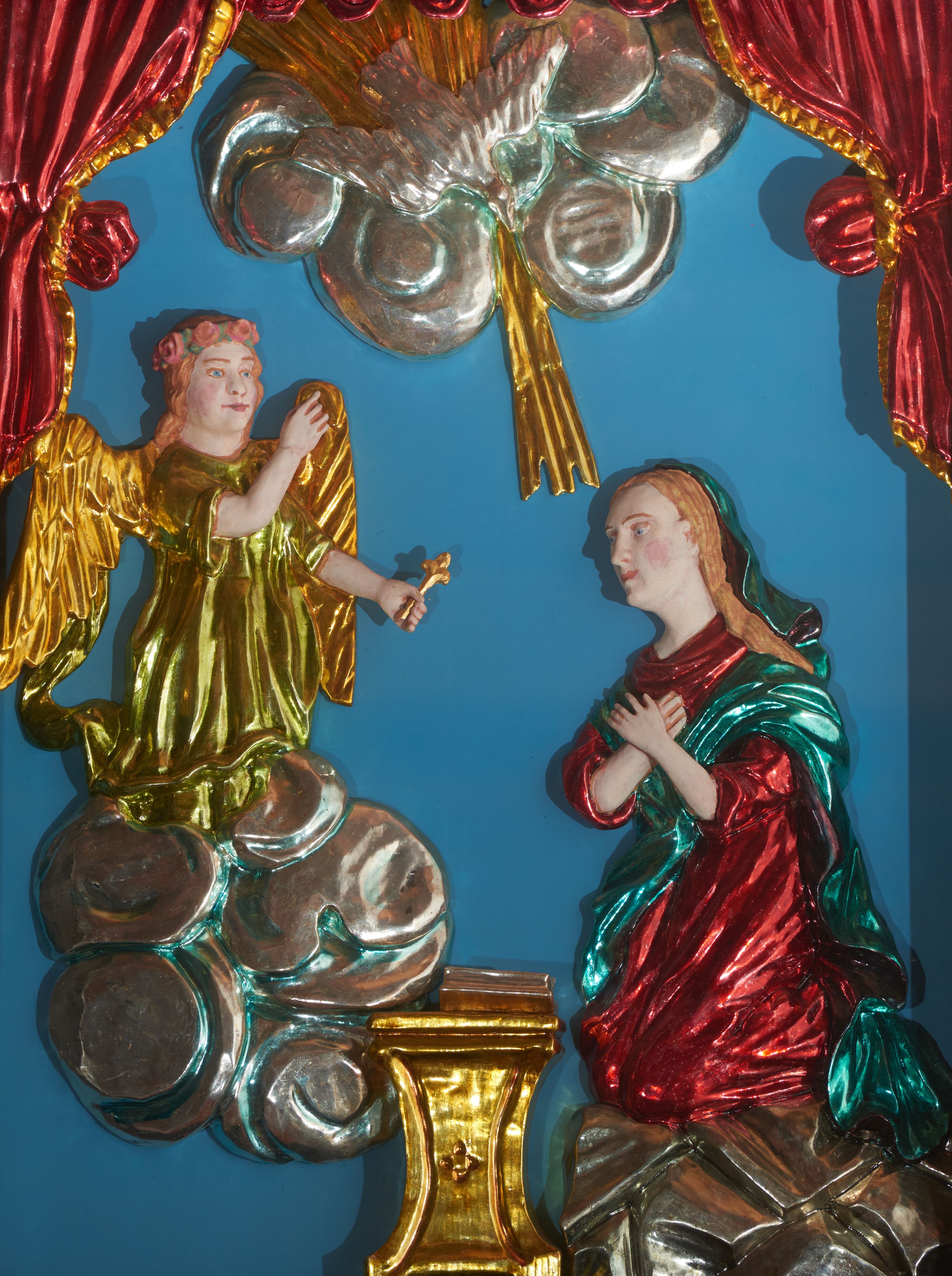 The relief "Annunciation" was created in the 18th century in an unknown workshop. The scene is arranged in a manner typical of Western art – Mary sitting in front of the lectern, on which there is an open book, is visited by archangel holding a lily in his hand, symbolising her chastity, pointing at the dove (symbolising the Holy Spirit) hovering above them.