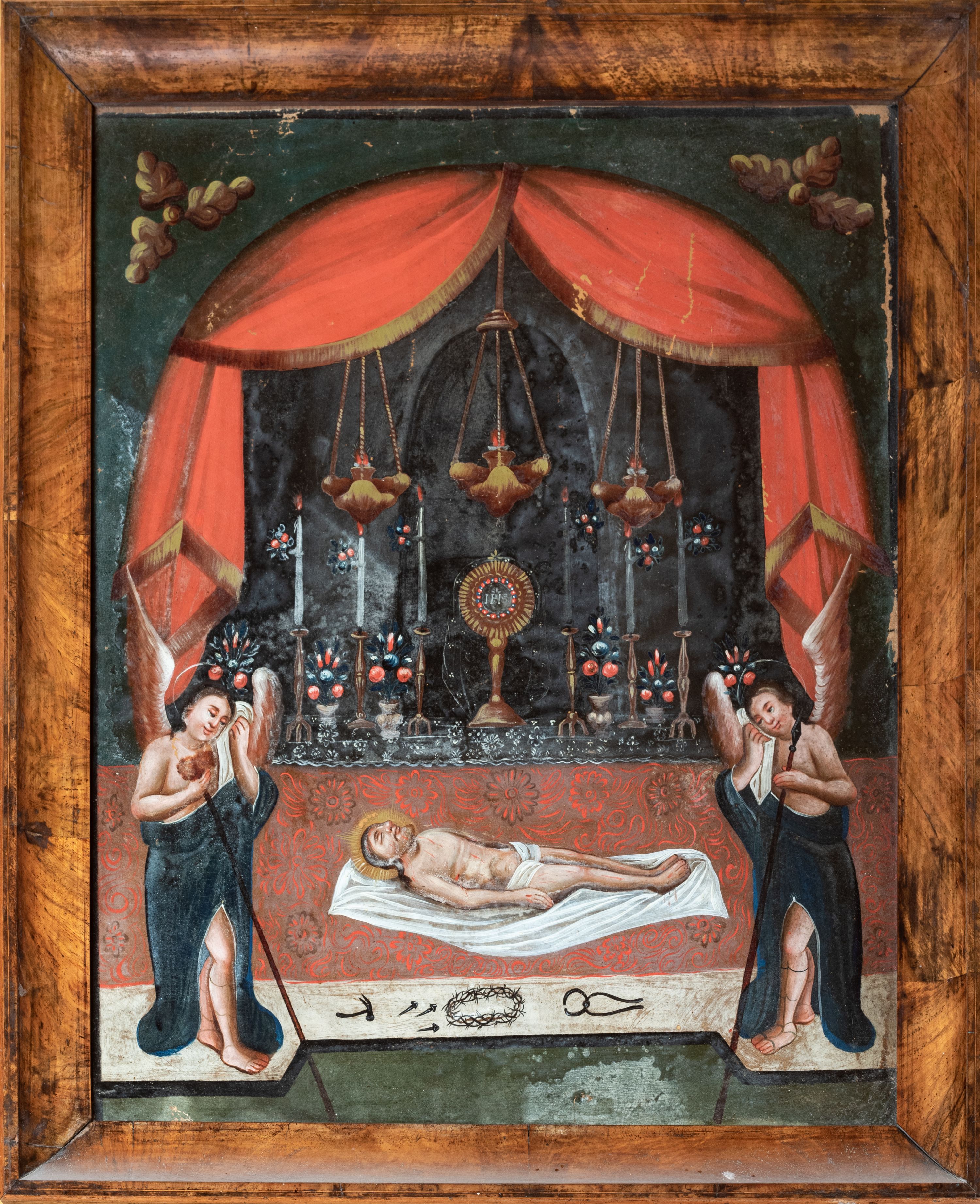 The painting in question, in the church in Paczółtowice, is an independent painting composition depicting the Easter design of the Holy Sepulchre. The fact that the dead body of Christ, flanked by statues of angels holding the arma Christi, was laid on the altar, is evidenced by a monstrance with the Host and candle holders in the background. The painting is the work of an unknown artist with modest workmanship skills. It might have been created in the second half of the 18th century or at the beginning of the 19th century. In 1996, the work, together with a second painting of Christ in a Mystical Winepress, was maintained in the workshop of Małgorzata Schuster-Gawłowska, a professor at the Academy of Fine Arts in Cracow.