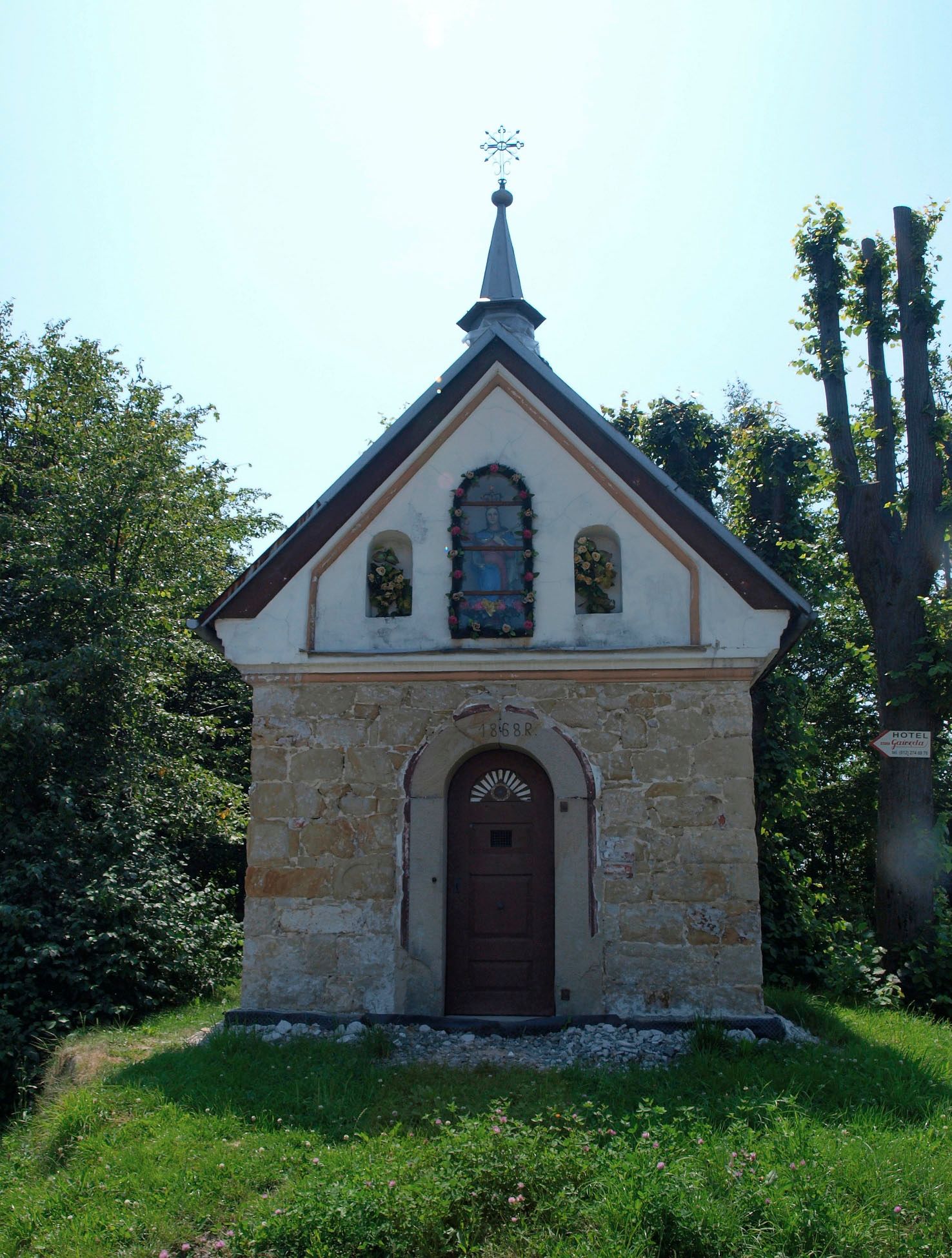 The chapel was built in 1868 on the site of the previous one, taken by the Świątnik stream. Until erection of the parish church in Gorzków, it served as a mass chapel. Since 1909, father Stanisław Hałatek of Wieliczka has been visiting the chapel to offer Holy Mass. The statue of St. John of Nepomuk placed inside comes from 1875 and the statue of Our Lady from 1881. Both were made of limewood. Their author is unknown. It is a chapel in a form of house. Usually such chapels were made by the funders themselves or by local craftsmen employed by them.