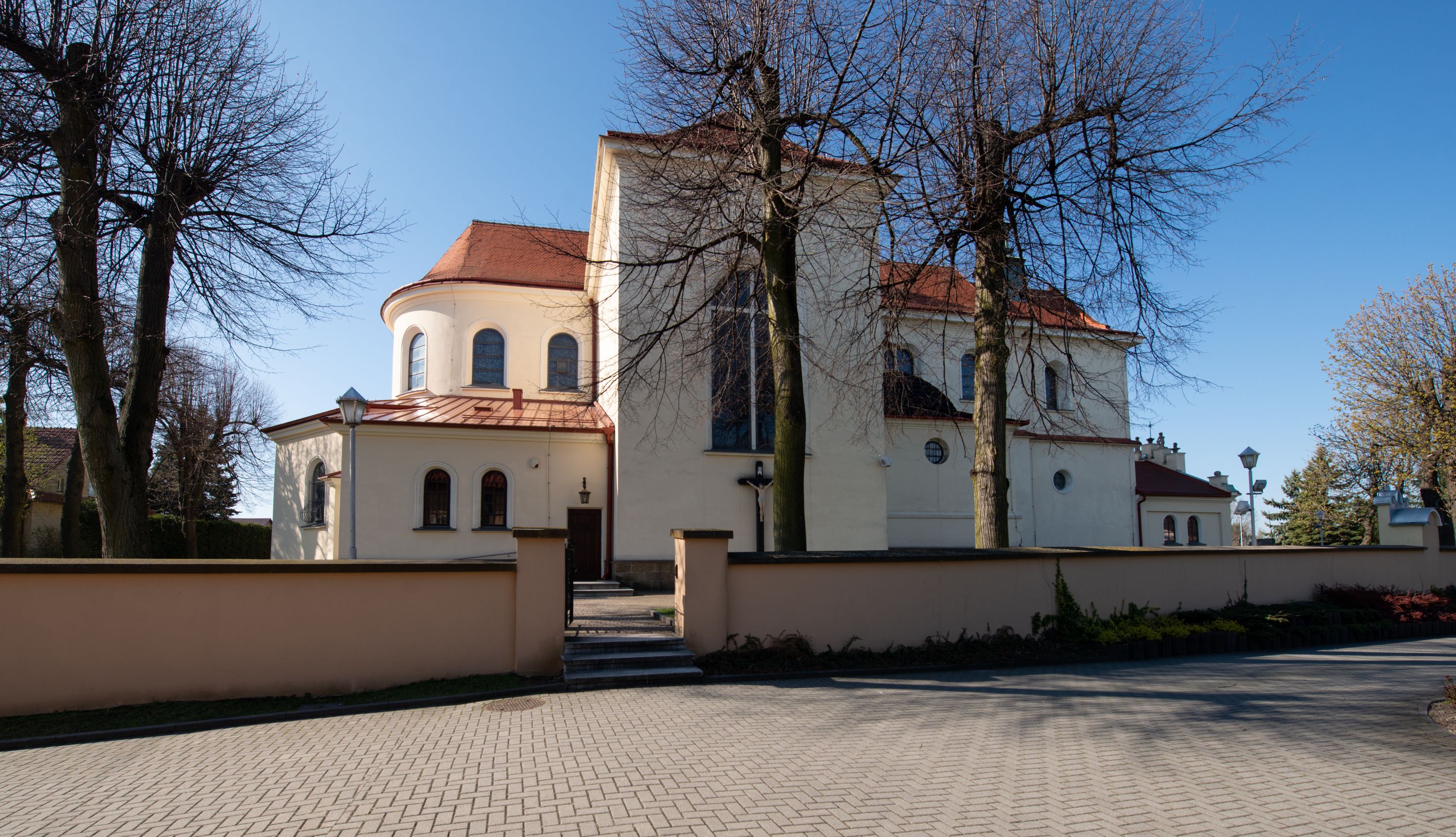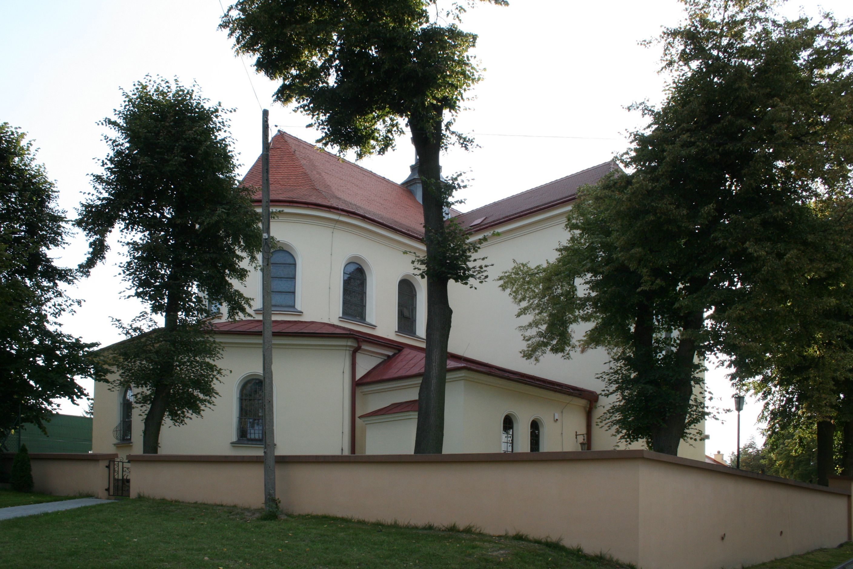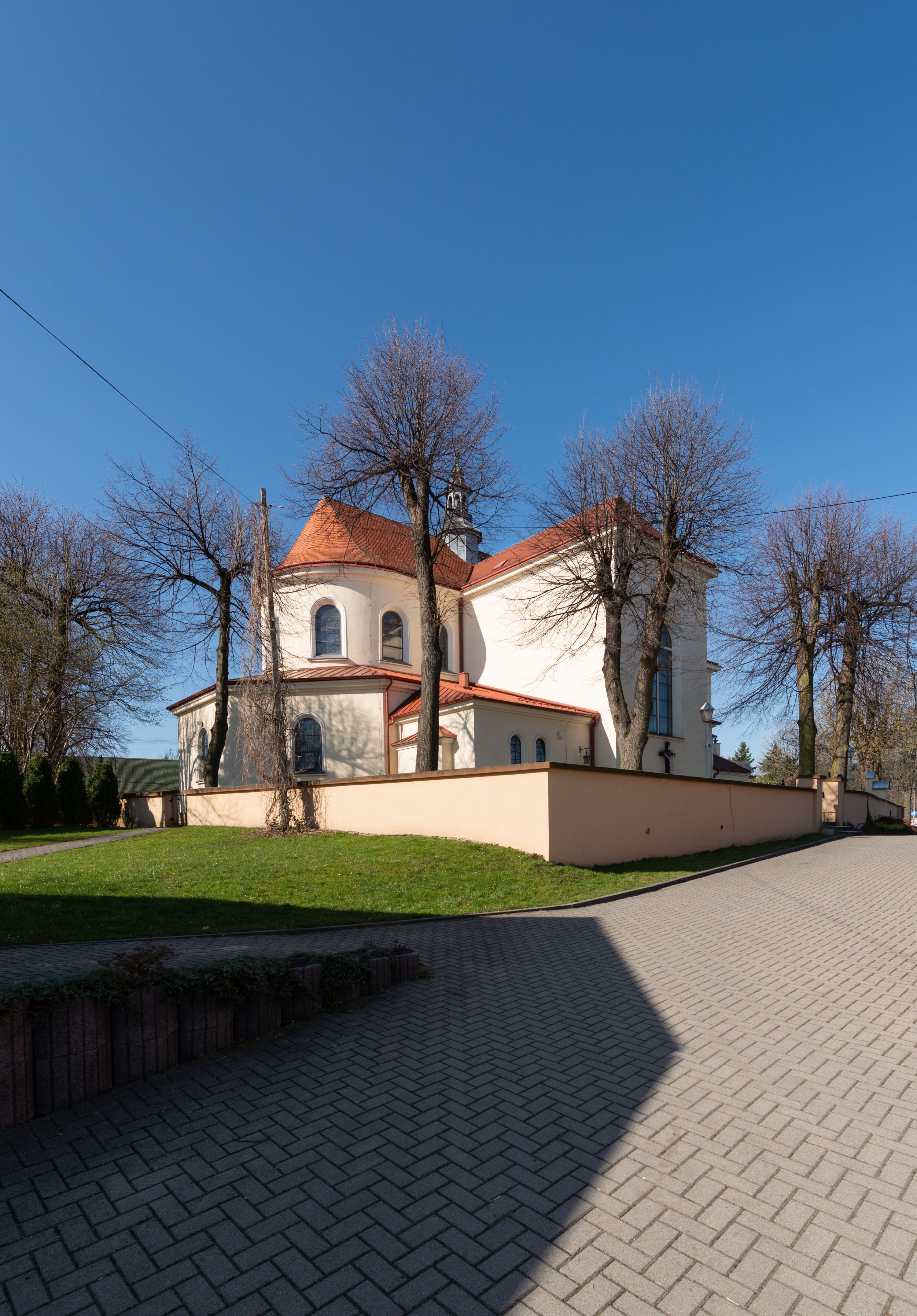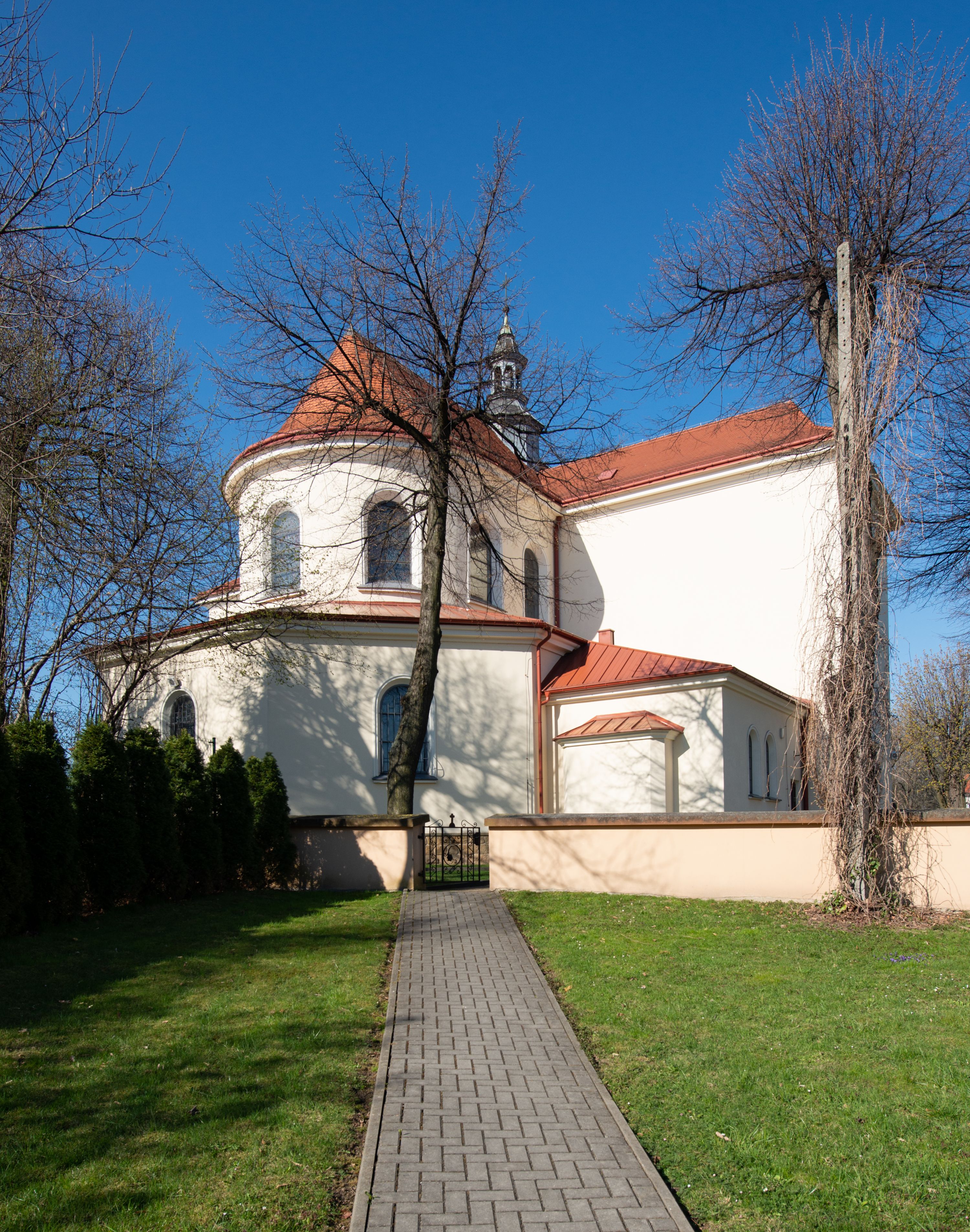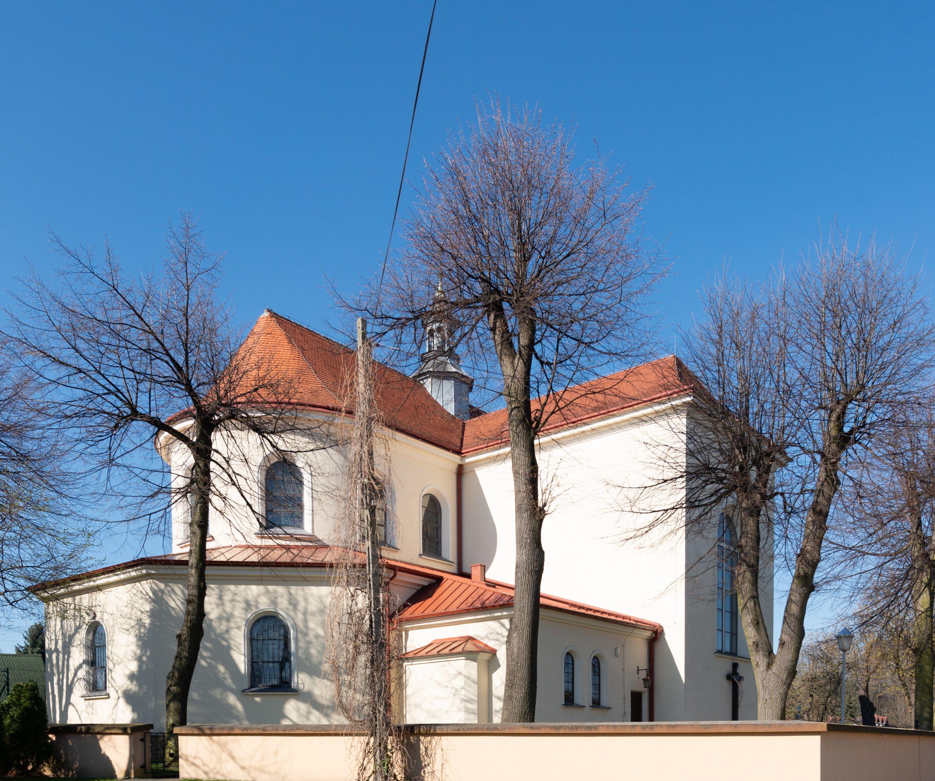 The church along with the chapel of St. Nicolas were made of bricks in 1604 with the funds of Mikołaj Borek from Trzciniec. In the first half of the nineteenth century, the nave was extended and the western porch was annexed, and in 1929 it was rebuilt in accordance with the designs of Franciszek Mączyński and in 1975 according to the designs by Wanda Łopatowa. The high altar from around the year 1700 along with the reredos made from the openwork-covered wine leaves, the Mannerist side altar and the seventeenth-century baptismal font, created in the workshop of Santi Gucci, are the most interesting relics of the church.