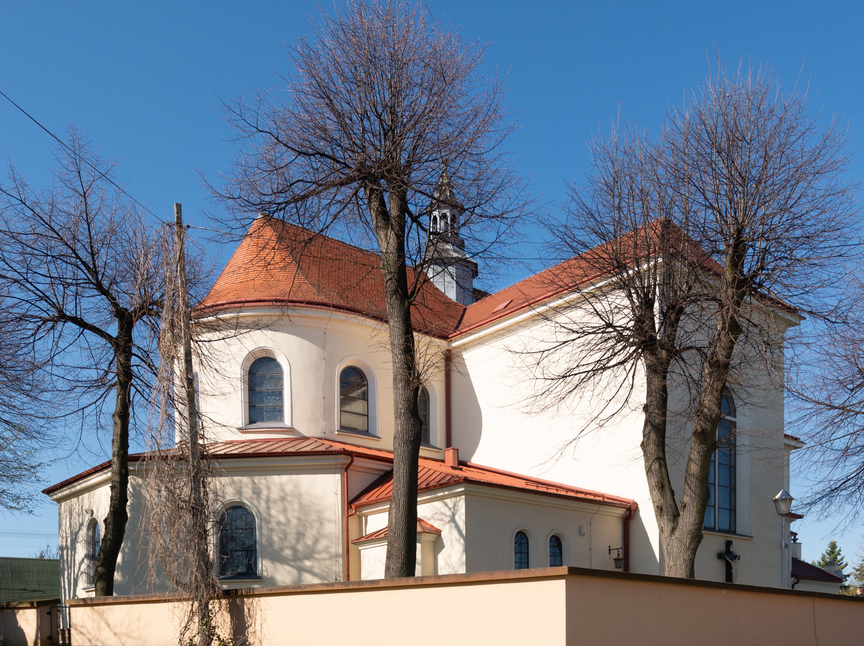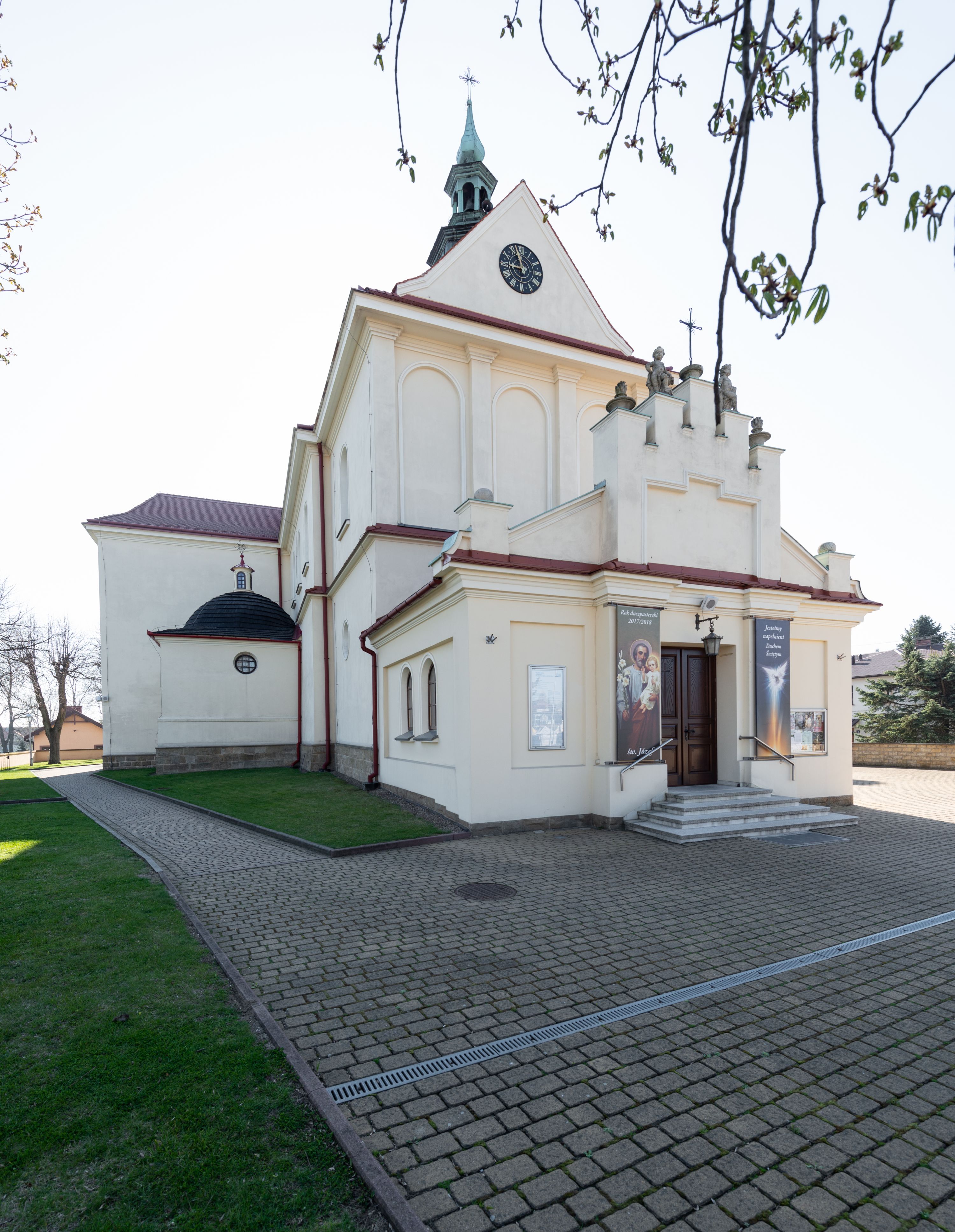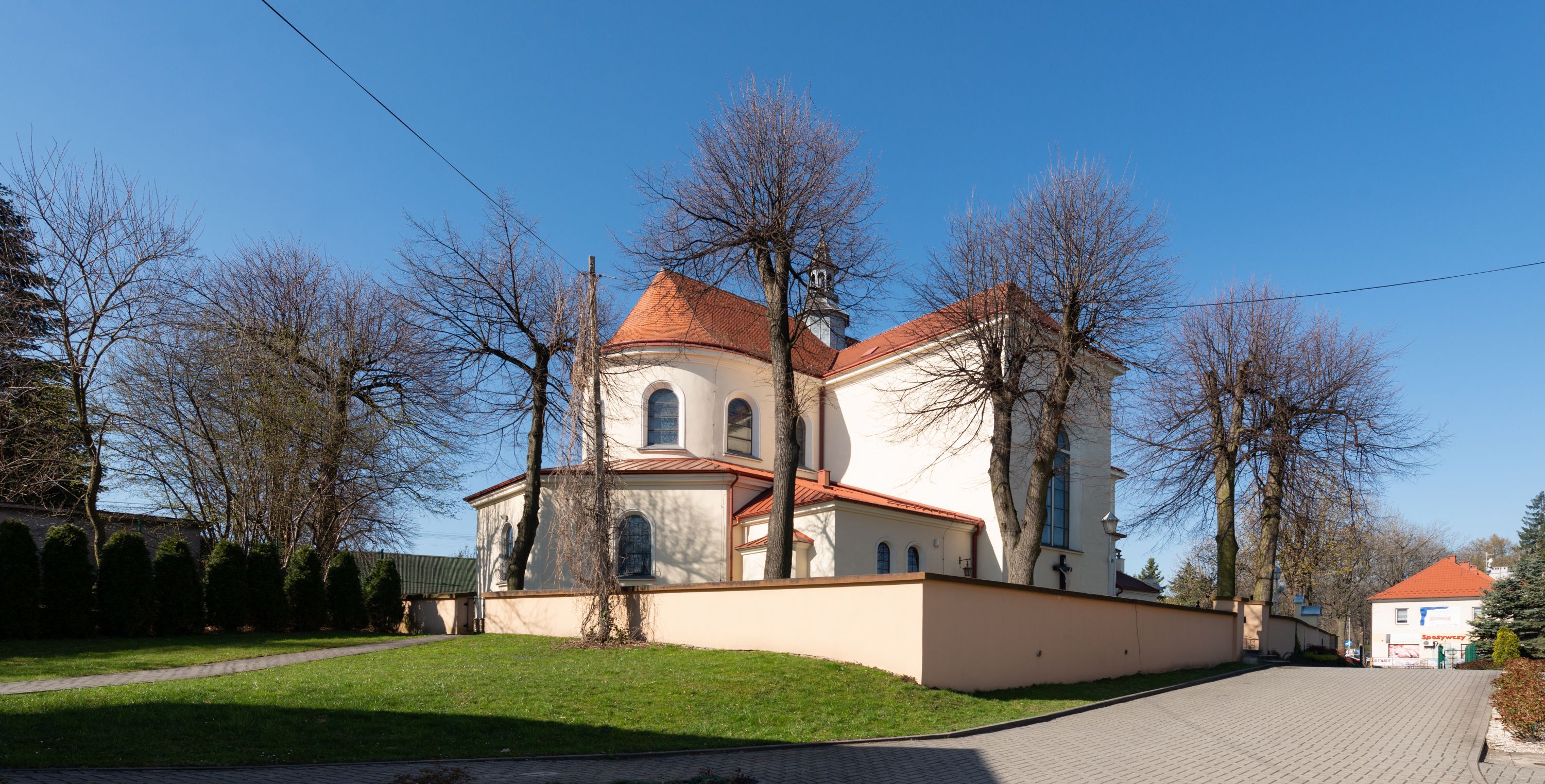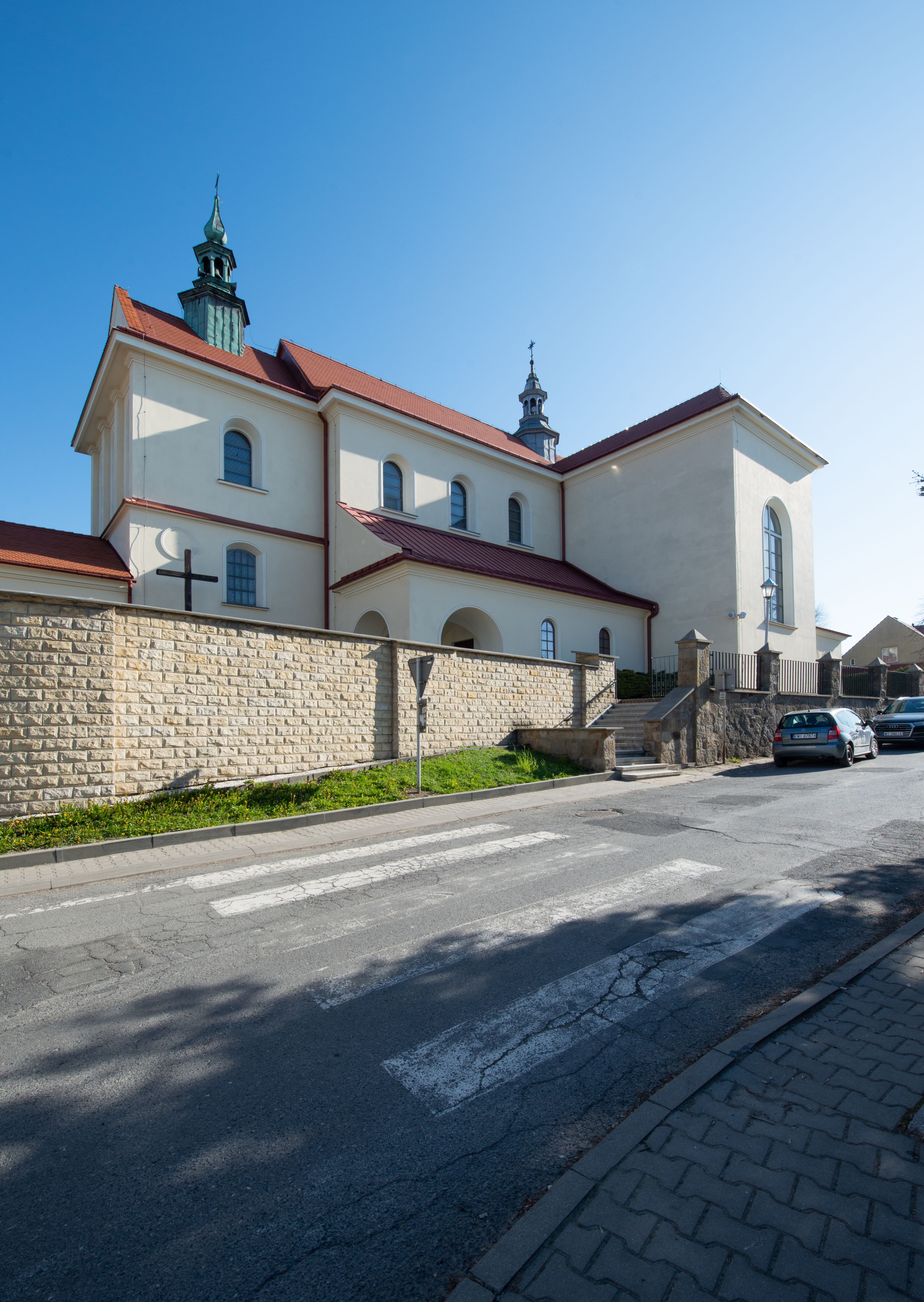 The church along with the chapel of St. Nicolas were made of bricks in 1604 with the funds of Mikołaj Borek from Trzciniec. In the first half of the nineteenth century, the nave was extended and the western porch was annexed, and in 1929 it was rebuilt in accordance with the designs of Franciszek Mączyński and in 1975 according to the designs by Wanda Łopatowa. The high altar from around the year 1700 along with the reredos made from the openwork-covered wine leaves, the Mannerist side altar and the seventeenth-century baptismal font, created in the workshop of Santi Gucci, are the most interesting relics of the church.