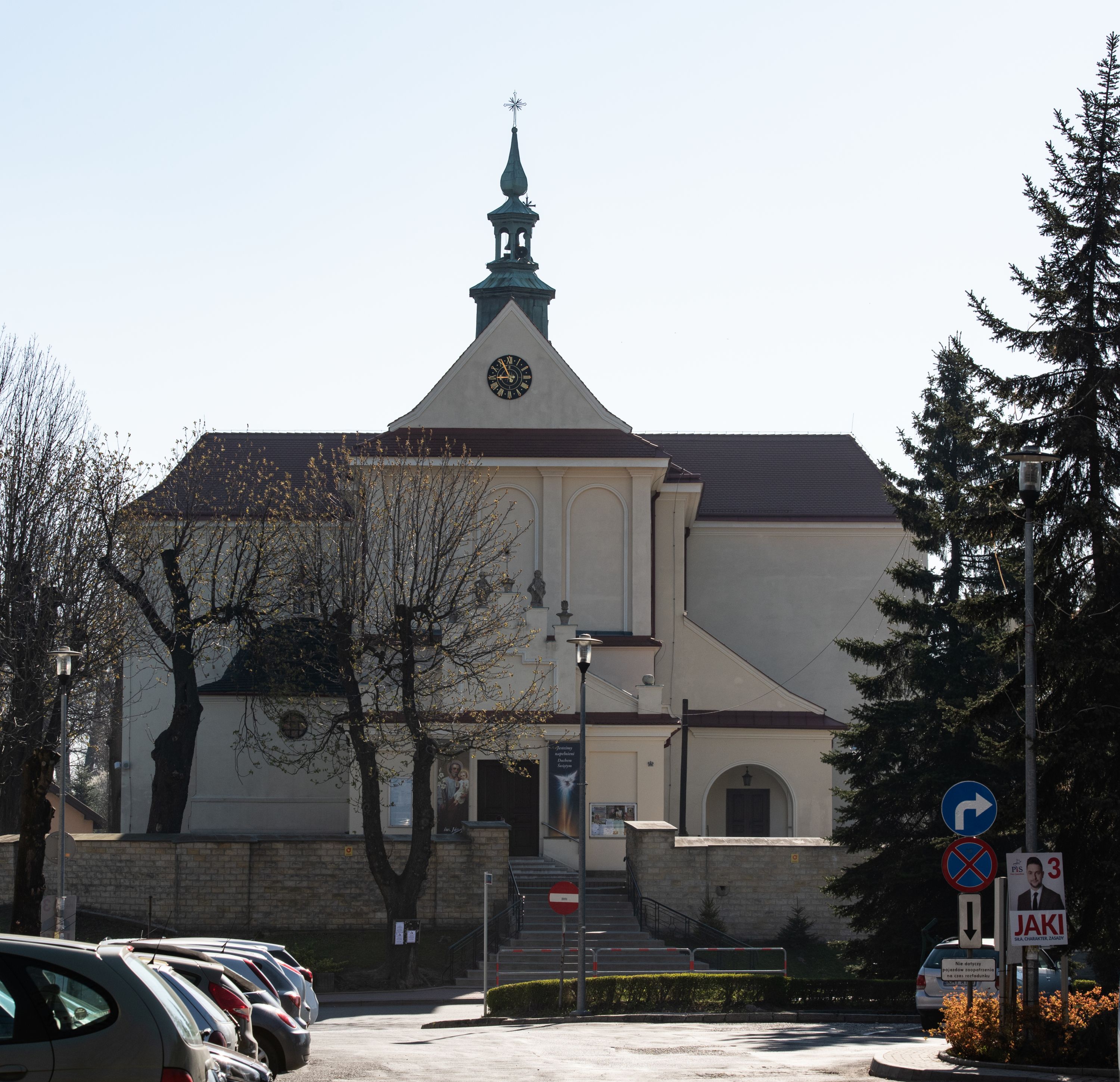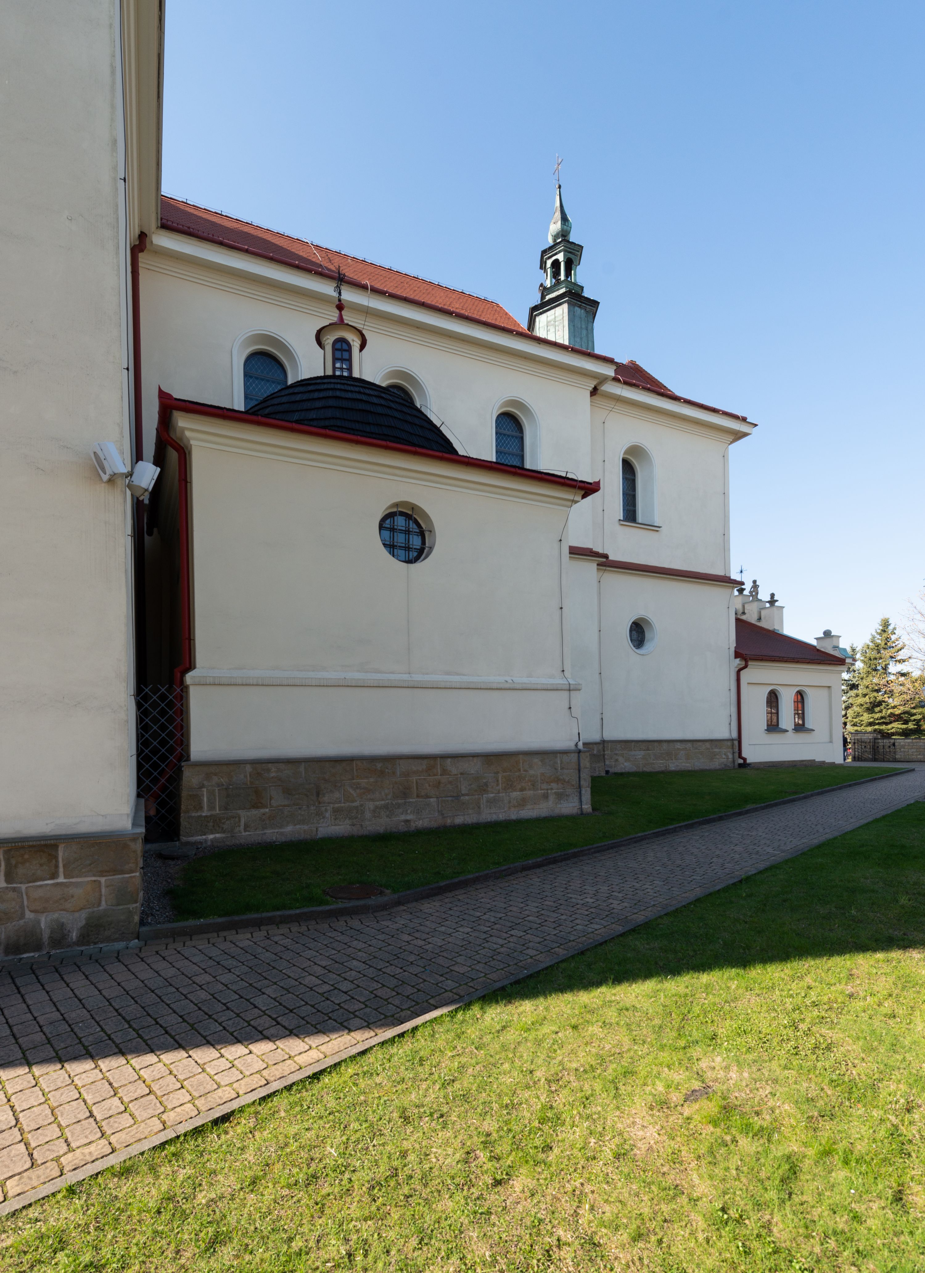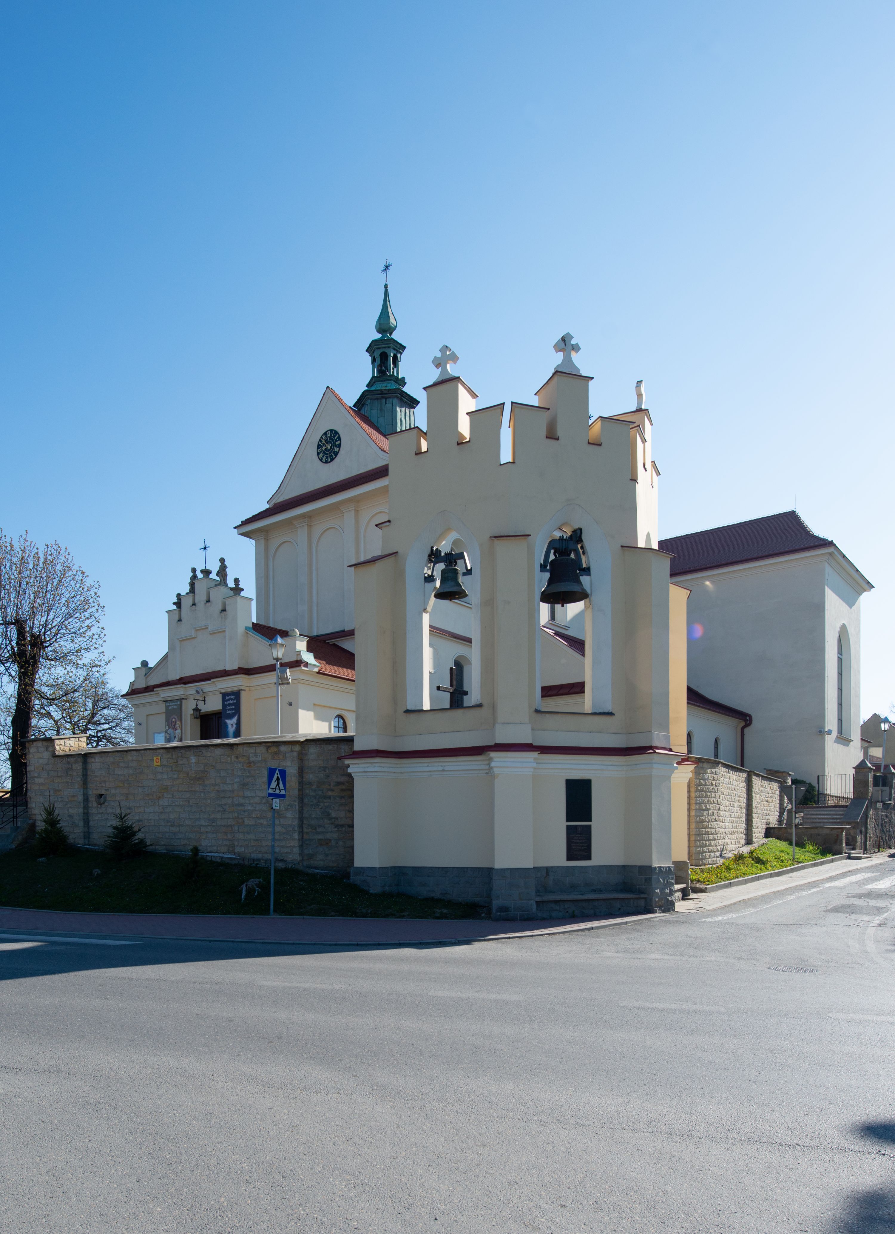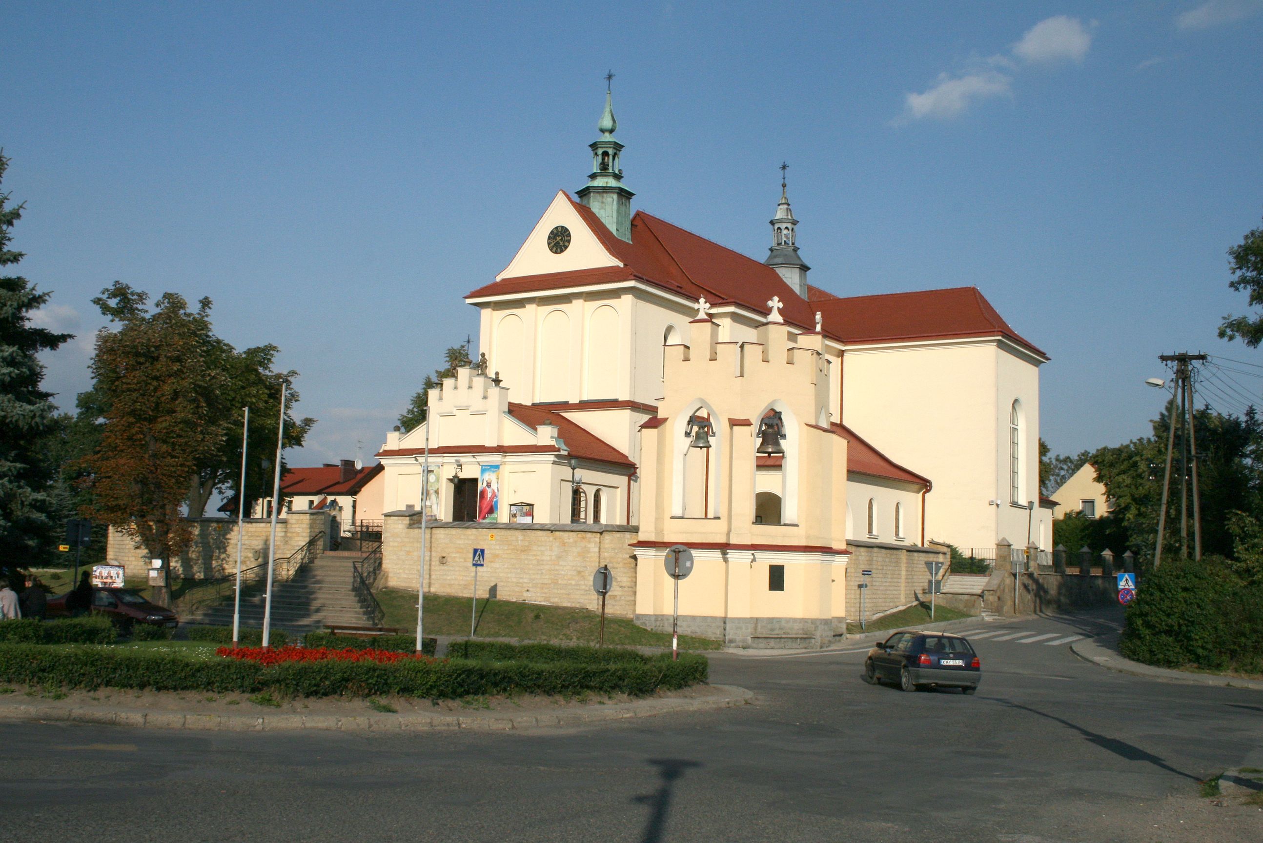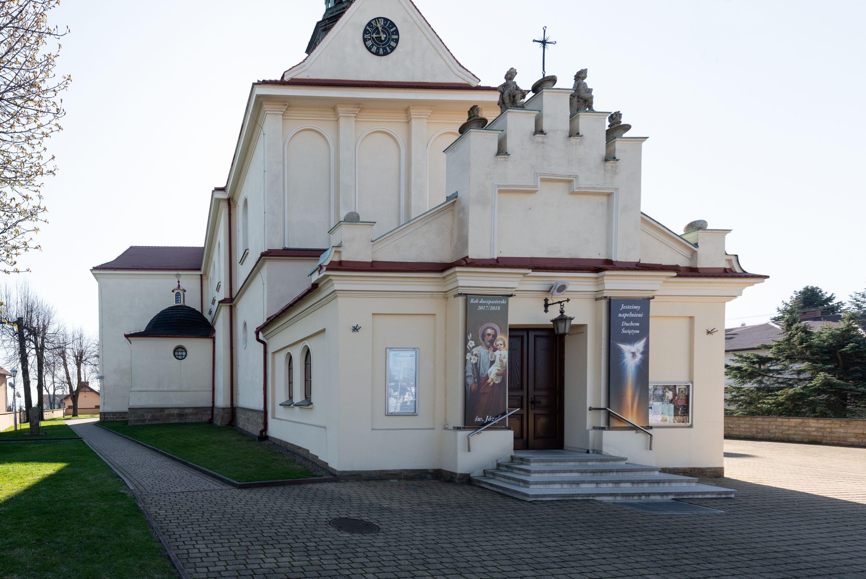 The church along with the chapel of St. Nicolas were made of bricks in 1604 with the funds of Mikołaj Borek from Trzciniec. In the first half of the nineteenth century, the nave was extended and the western porch was annexed, and in 1929 it was rebuilt in accordance with the designs of Franciszek Mączyński and in 1975 according to the designs by Wanda Łopatowa. The high altar from around the year 1700 along with the reredos made from the openwork-covered wine leaves, the Mannerist side altar and the seventeenth-century baptismal font, created in the workshop of Santi Gucci, are the most interesting relics of the church.