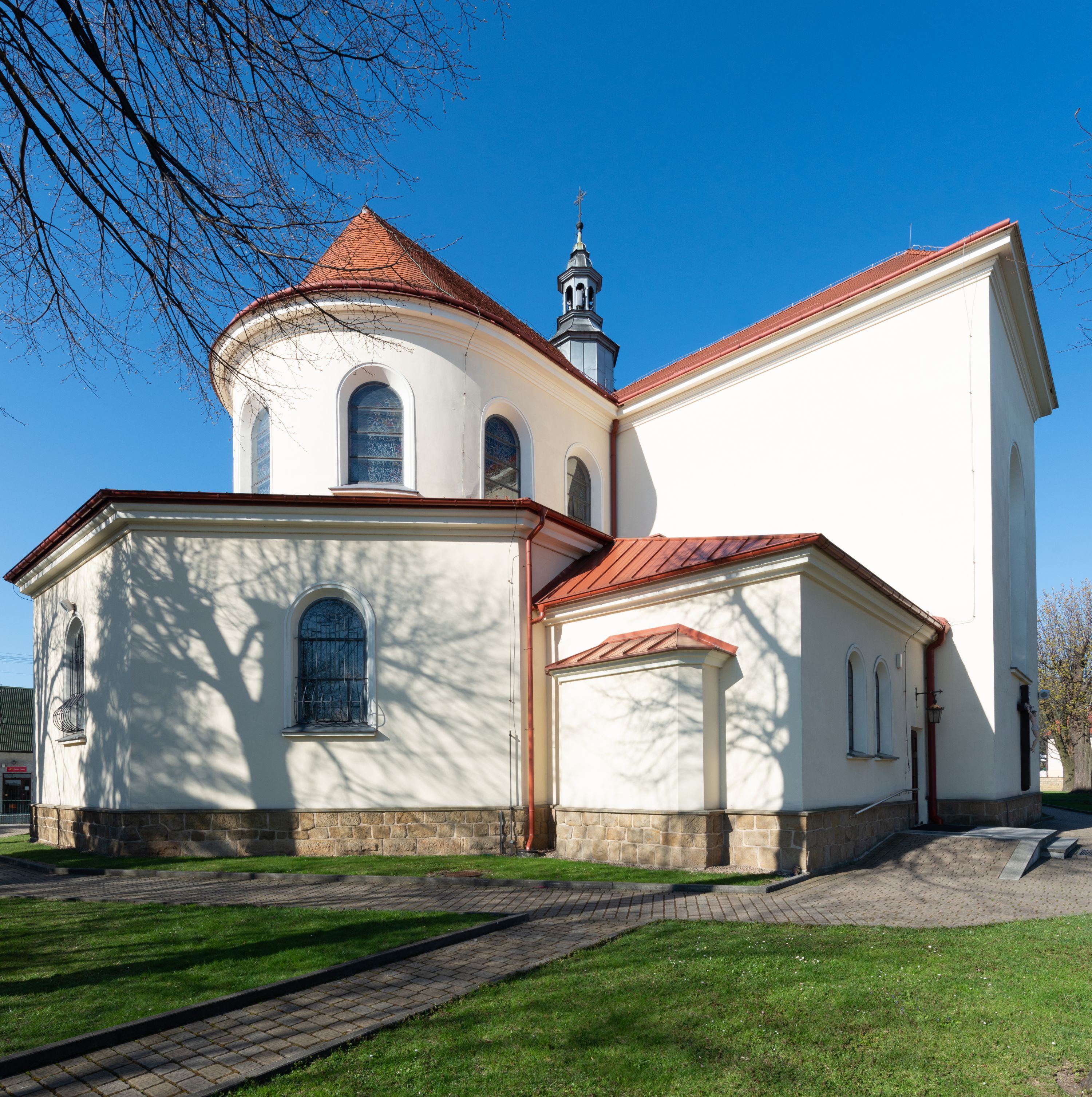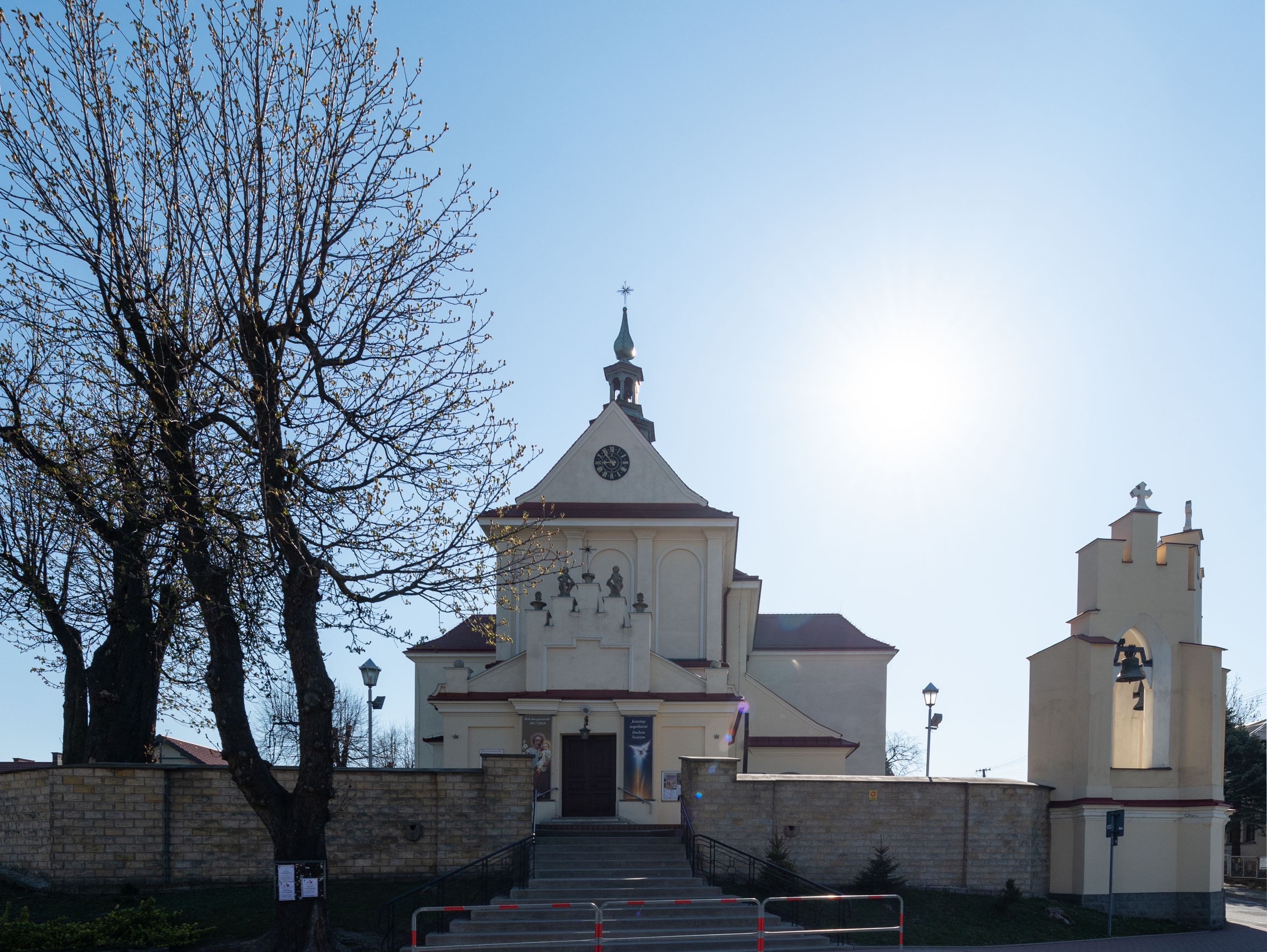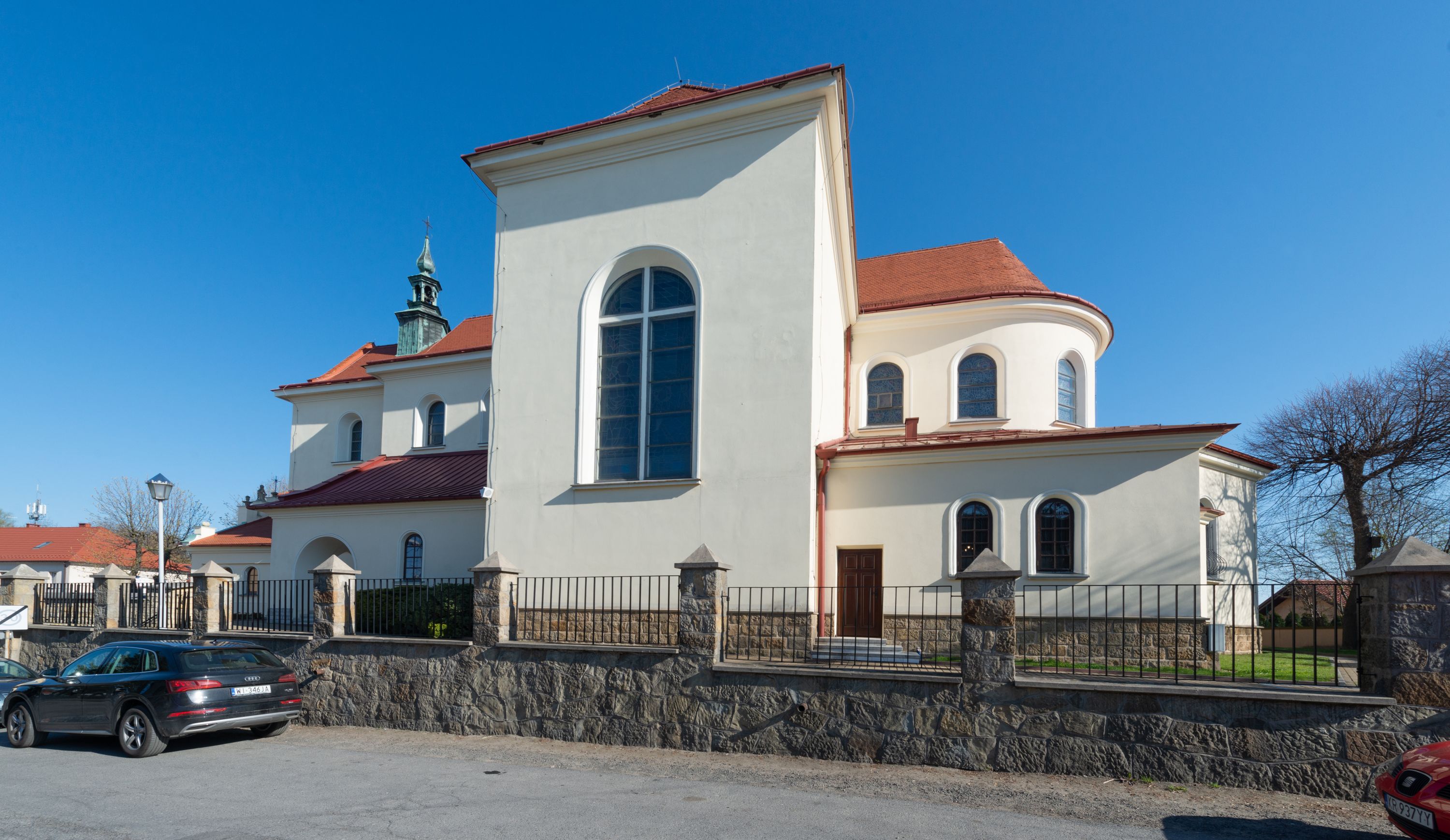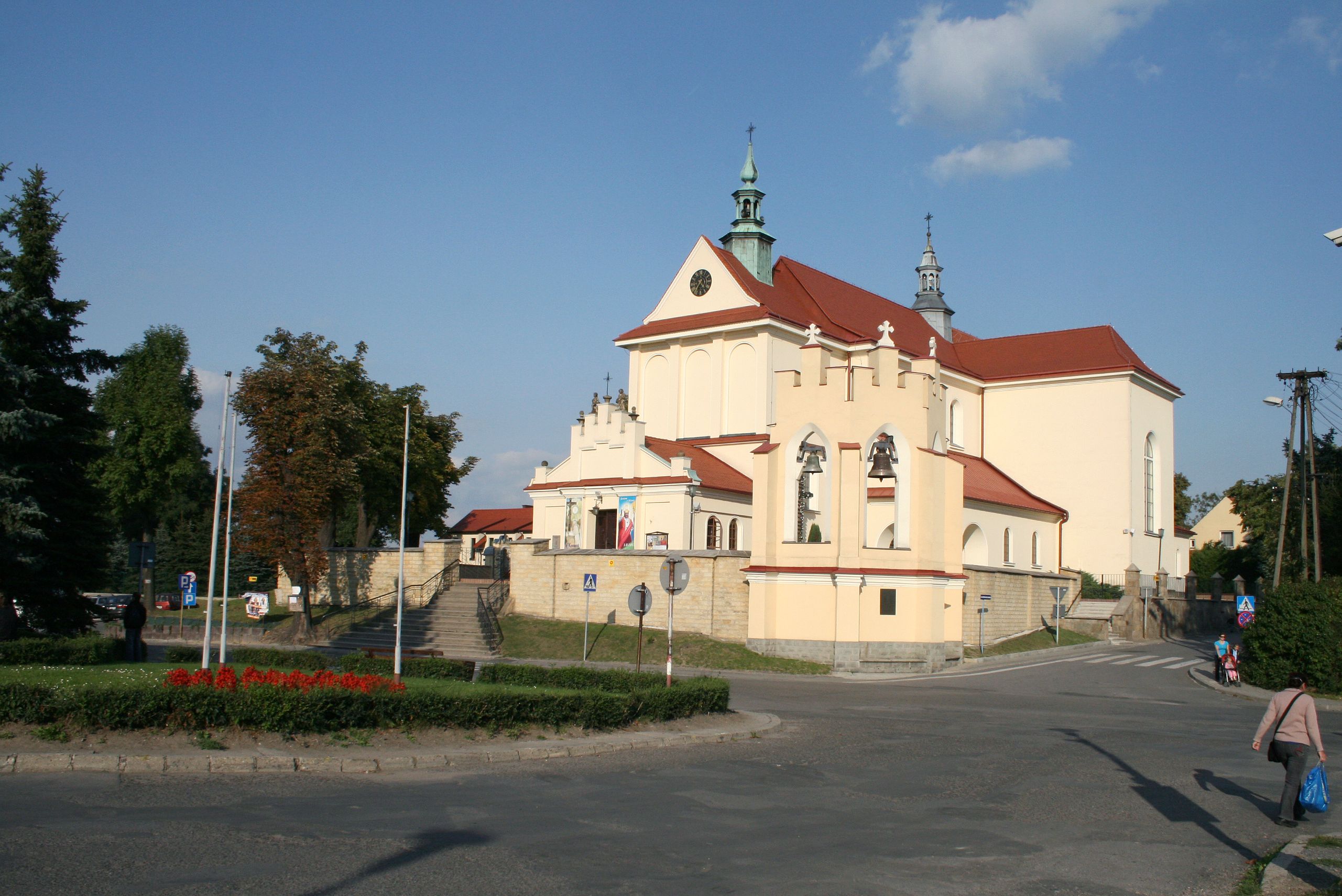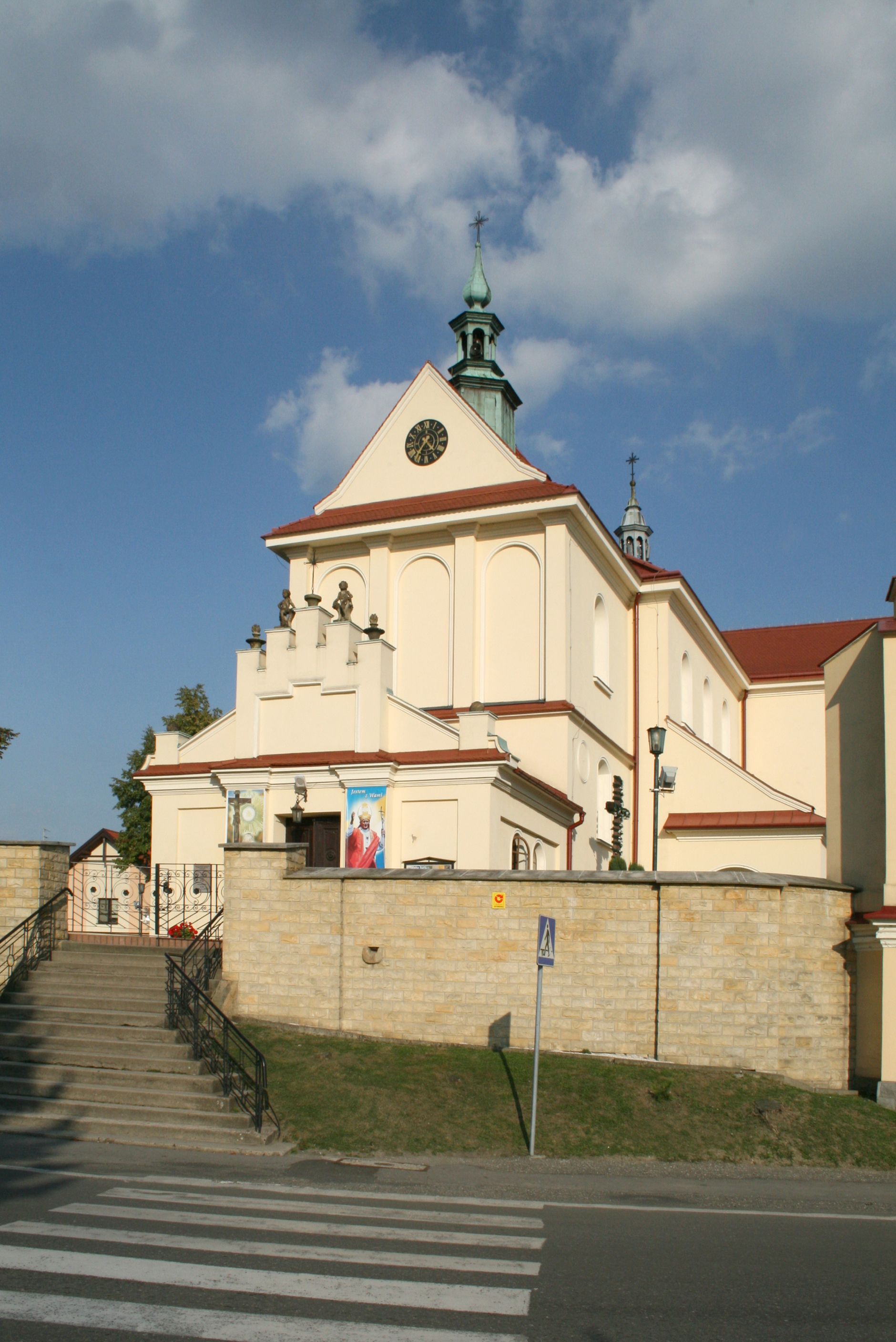 The church along with the chapel of St. Nicolas were made of bricks in 1604 with the funds of Mikołaj Borek from Trzciniec. In the first half of the nineteenth century, the nave was extended and the western porch was annexed, and in 1929 it was rebuilt in accordance with the designs of Franciszek Mączyński and in 1975 according to the designs by Wanda Łopatowa. The high altar from around the year 1700 along with the reredos made from the openwork-covered wine leaves, the Mannerist side altar and the seventeenth-century baptismal font, created in the workshop of Santi Gucci, are the most interesting relics of the church.