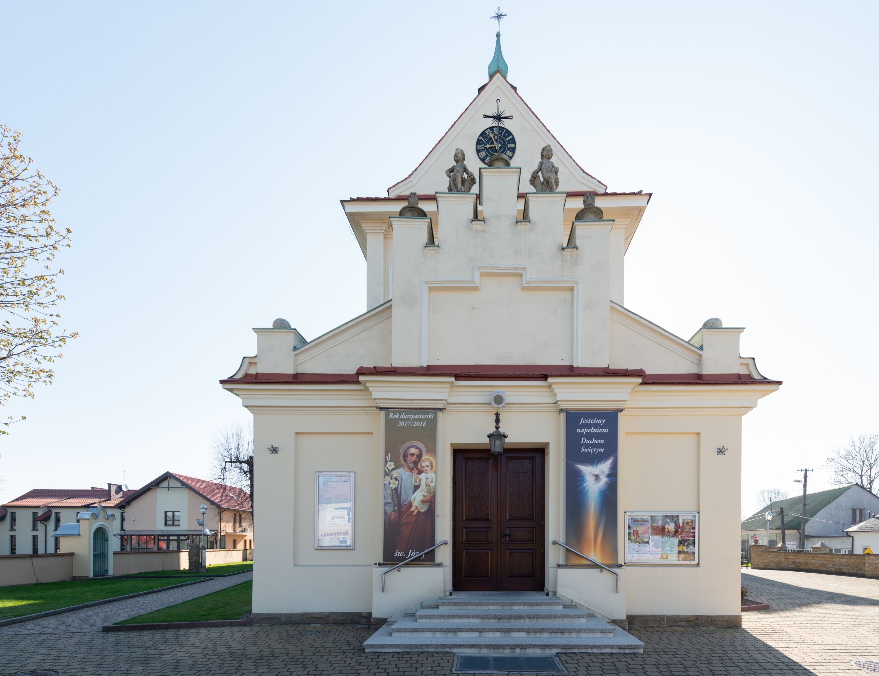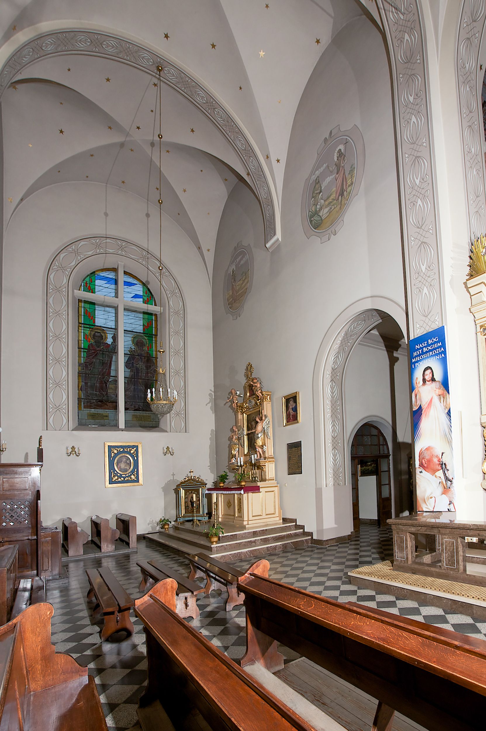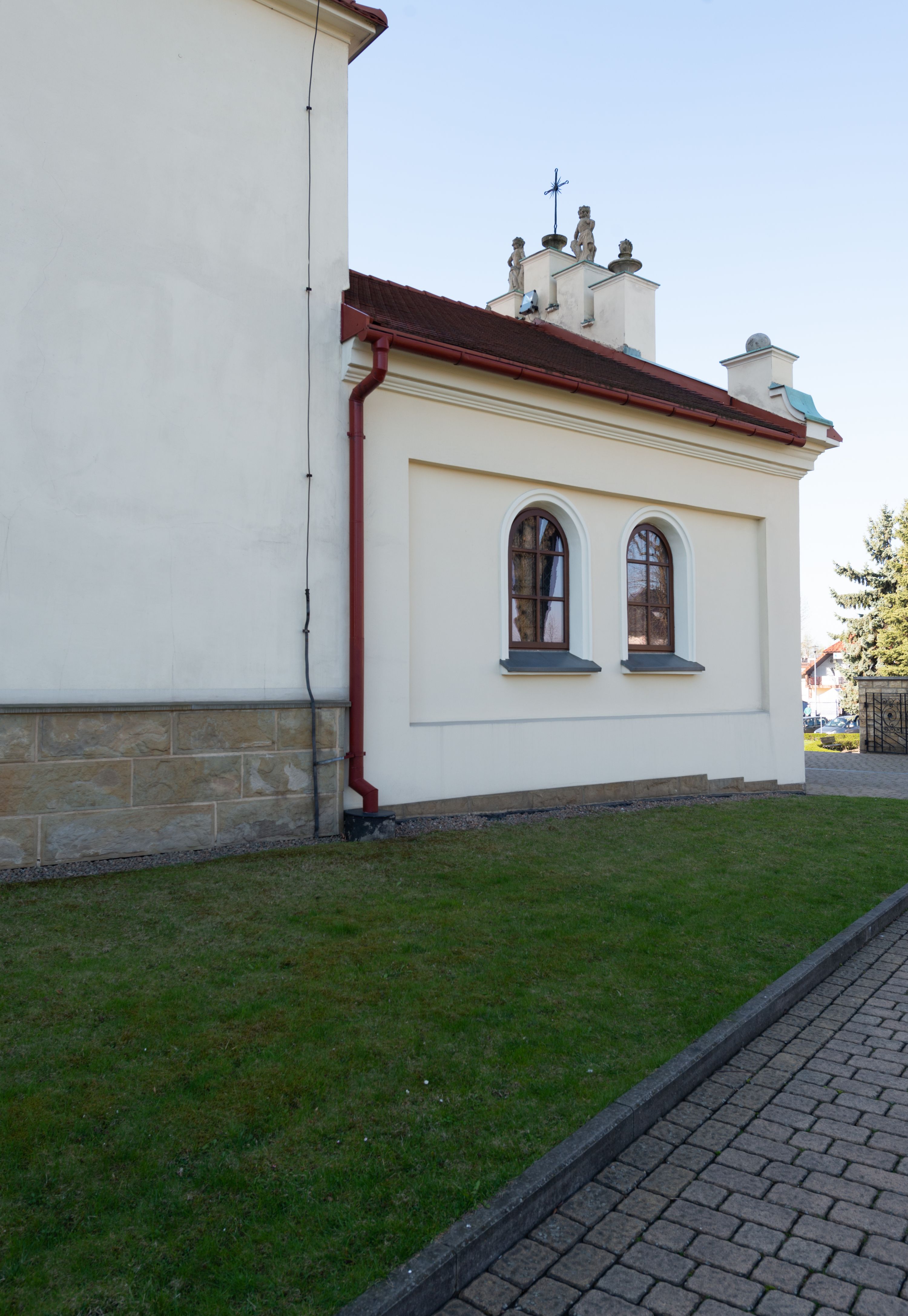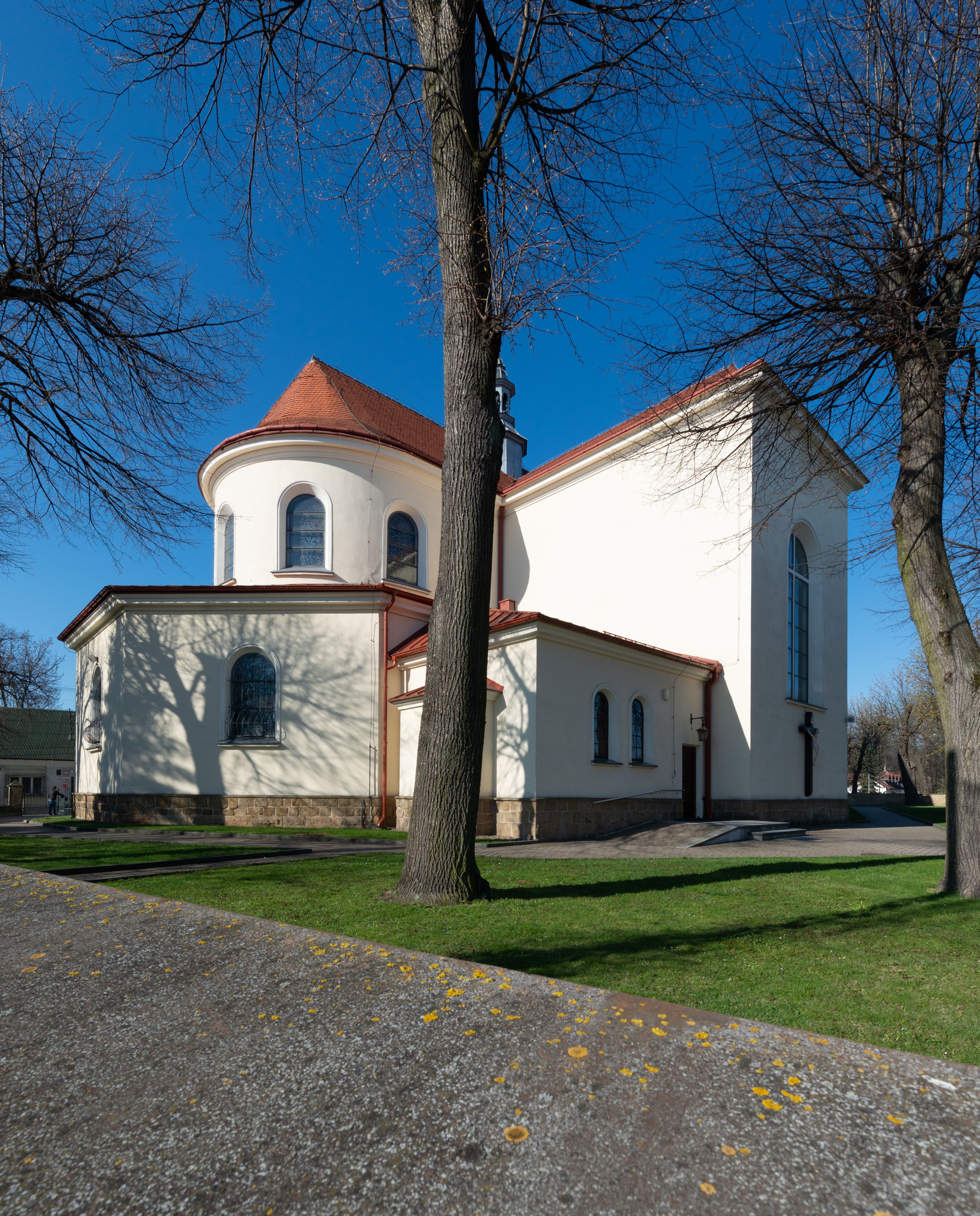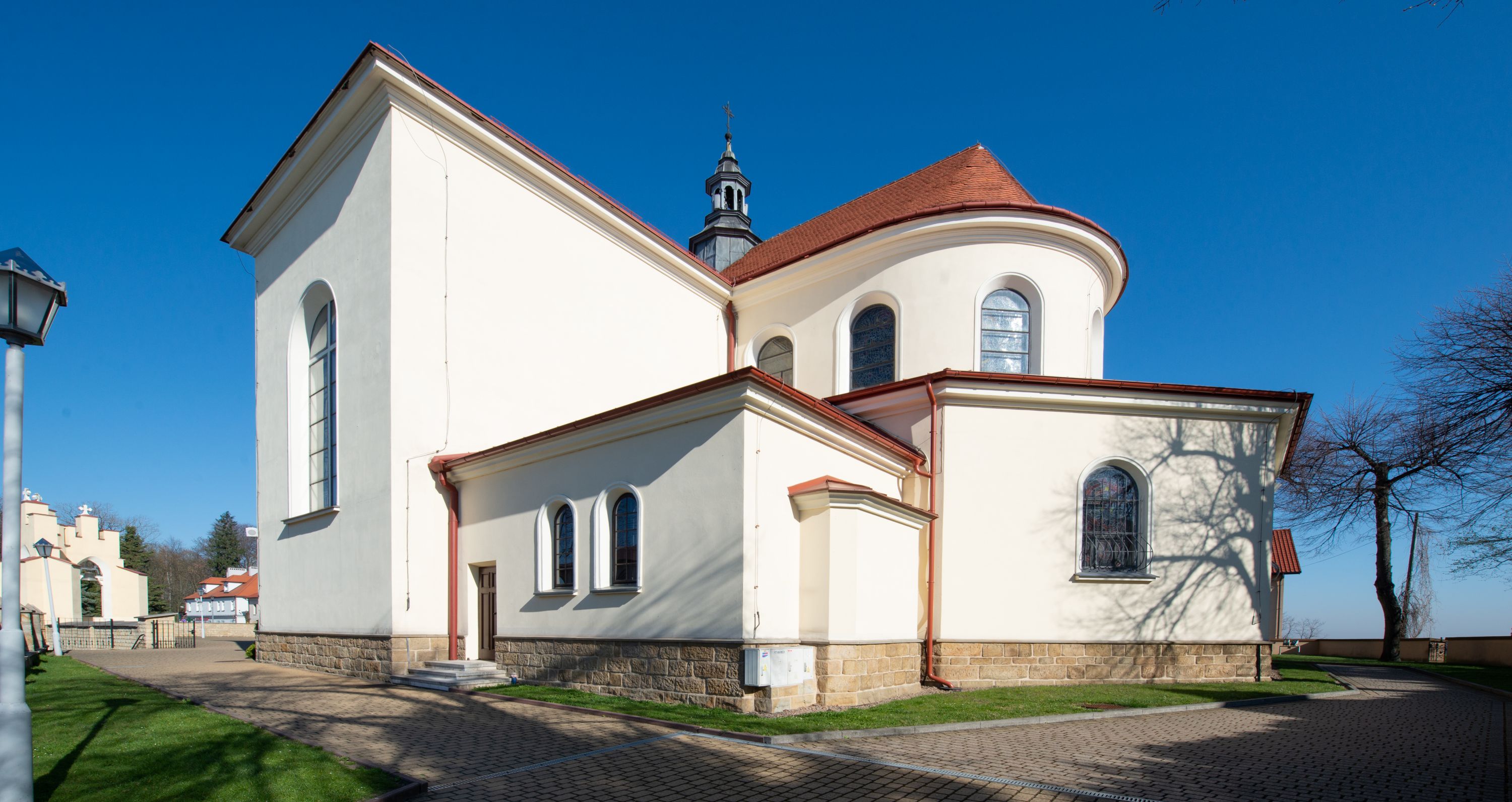The church along with the chapel of St. Nicolas were made of bricks in 1604 with the funds of Mikołaj Borek from Trzciniec. In the first half of the nineteenth century, the nave was extended and the western porch was annexed, and in 1929 it was rebuilt in accordance with the designs of Franciszek Mączyński and in 1975 according to the designs by Wanda Łopatowa. The high altar from around the year 1700 along with the reredos made from the openwork-covered wine leaves, the Mannerist side altar and the seventeenth-century baptismal font, created in the workshop of Santi Gucci, are the most interesting relics of the church.