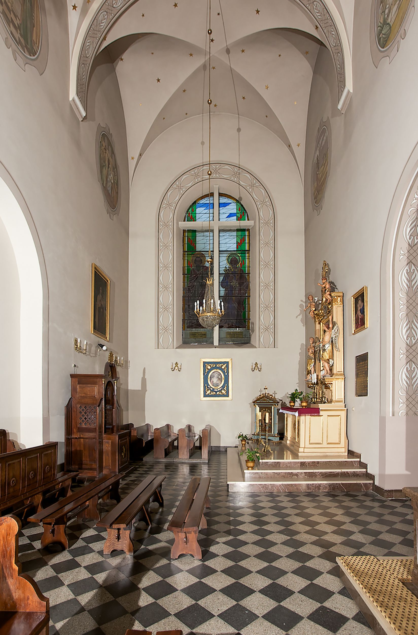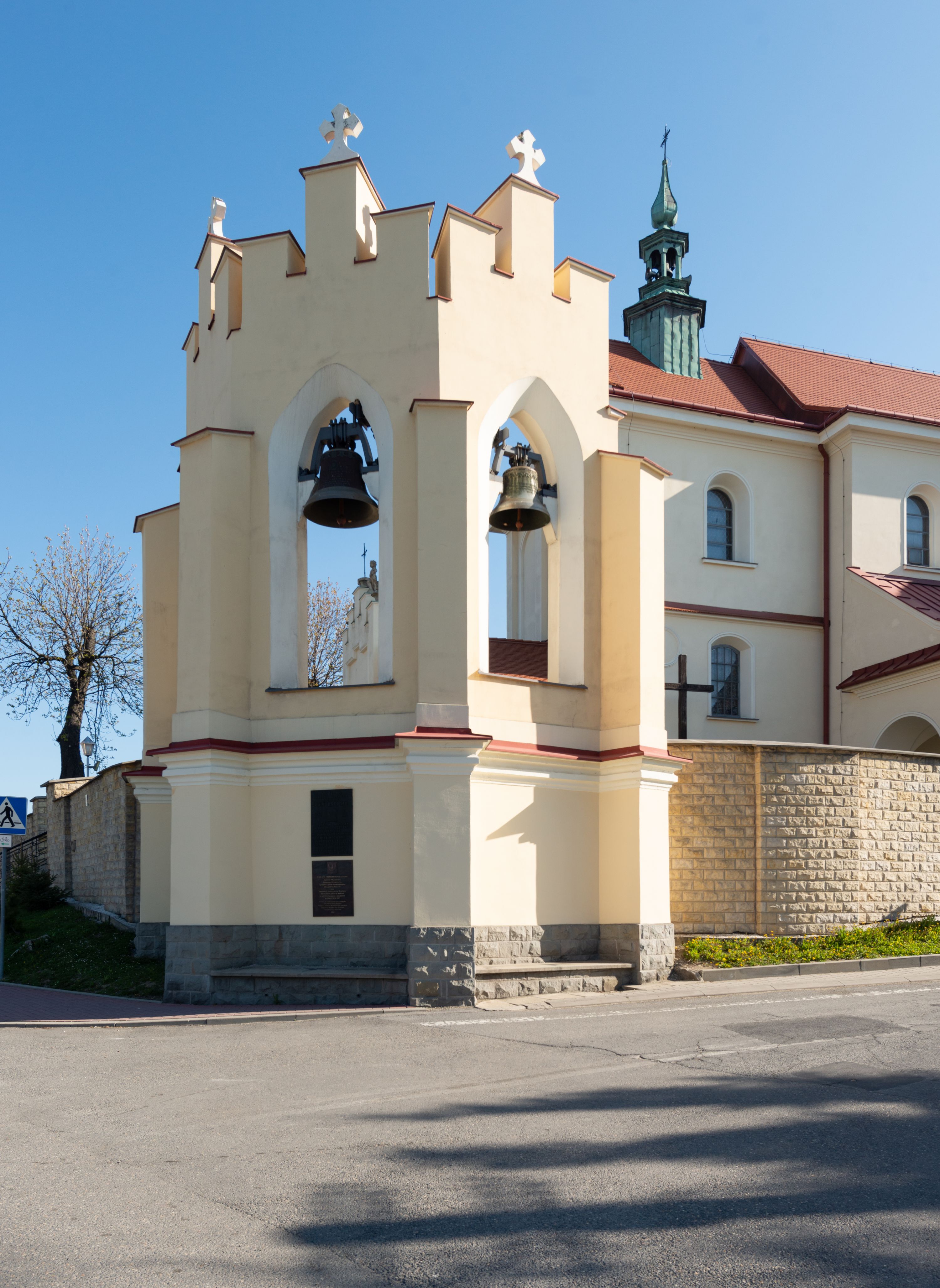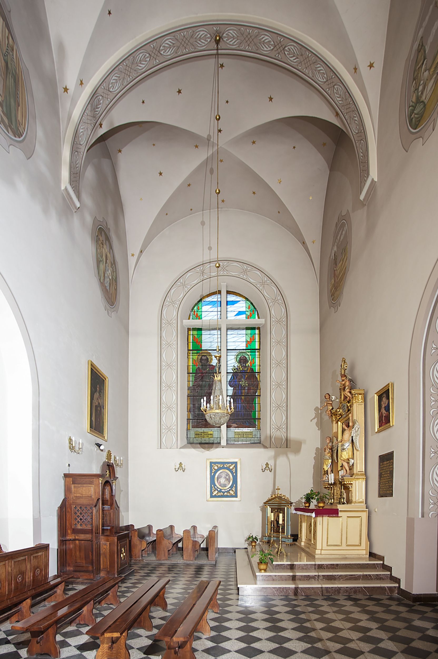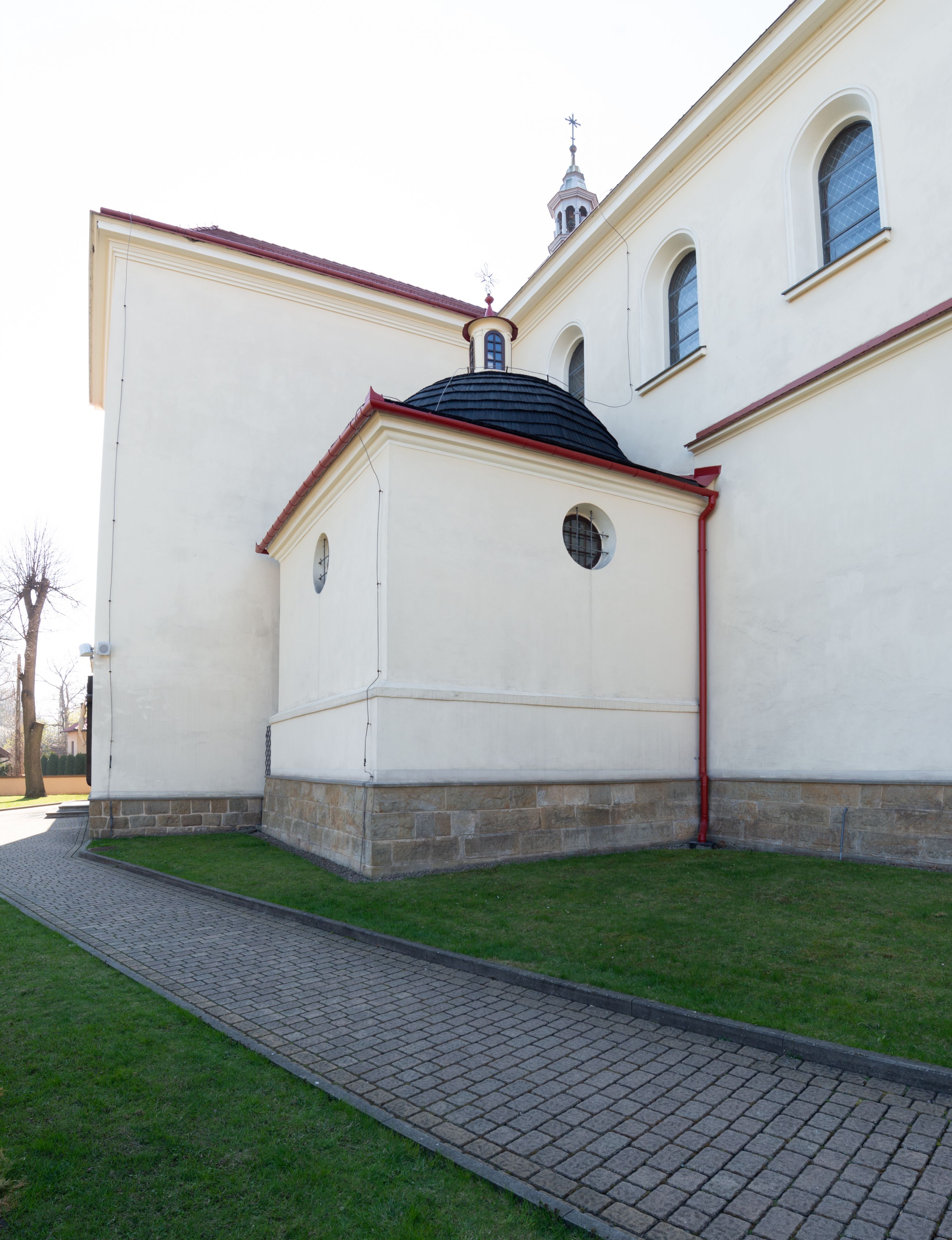 The church along with the chapel of St. Nicolas were made of bricks in 1604 with the funds of Mikołaj Borek from Trzciniec. In the first half of the nineteenth century, the nave was extended and the western porch was annexed, and in 1929 it was rebuilt in accordance with the designs of Franciszek Mączyński and in 1975 according to the designs by Wanda Łopatowa. The high altar from around the year 1700 along with the reredos made from the openwork-covered wine leaves, the Mannerist side altar and the seventeenth-century baptismal font, created in the workshop of Santi Gucci, are the most interesting relics of the church.
