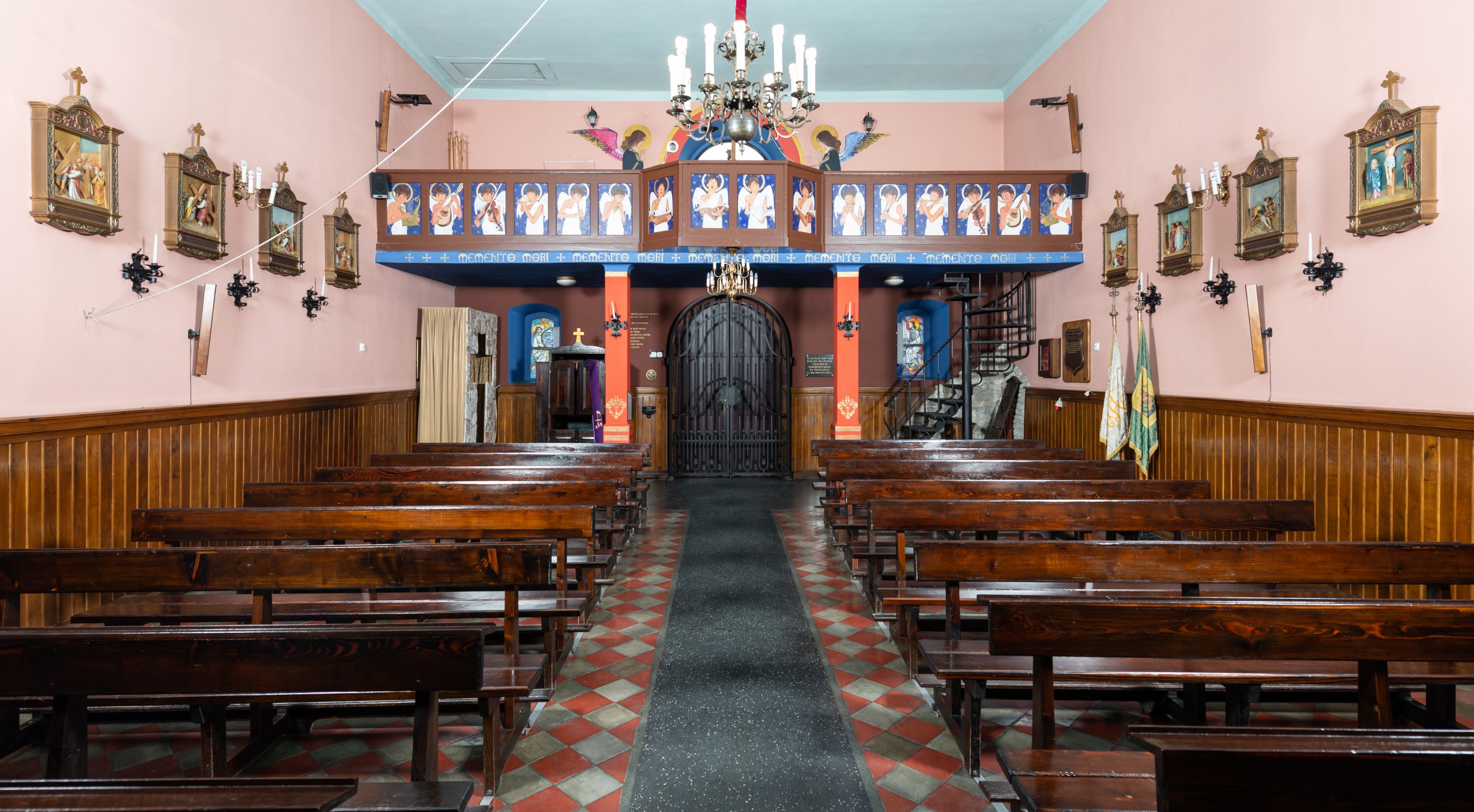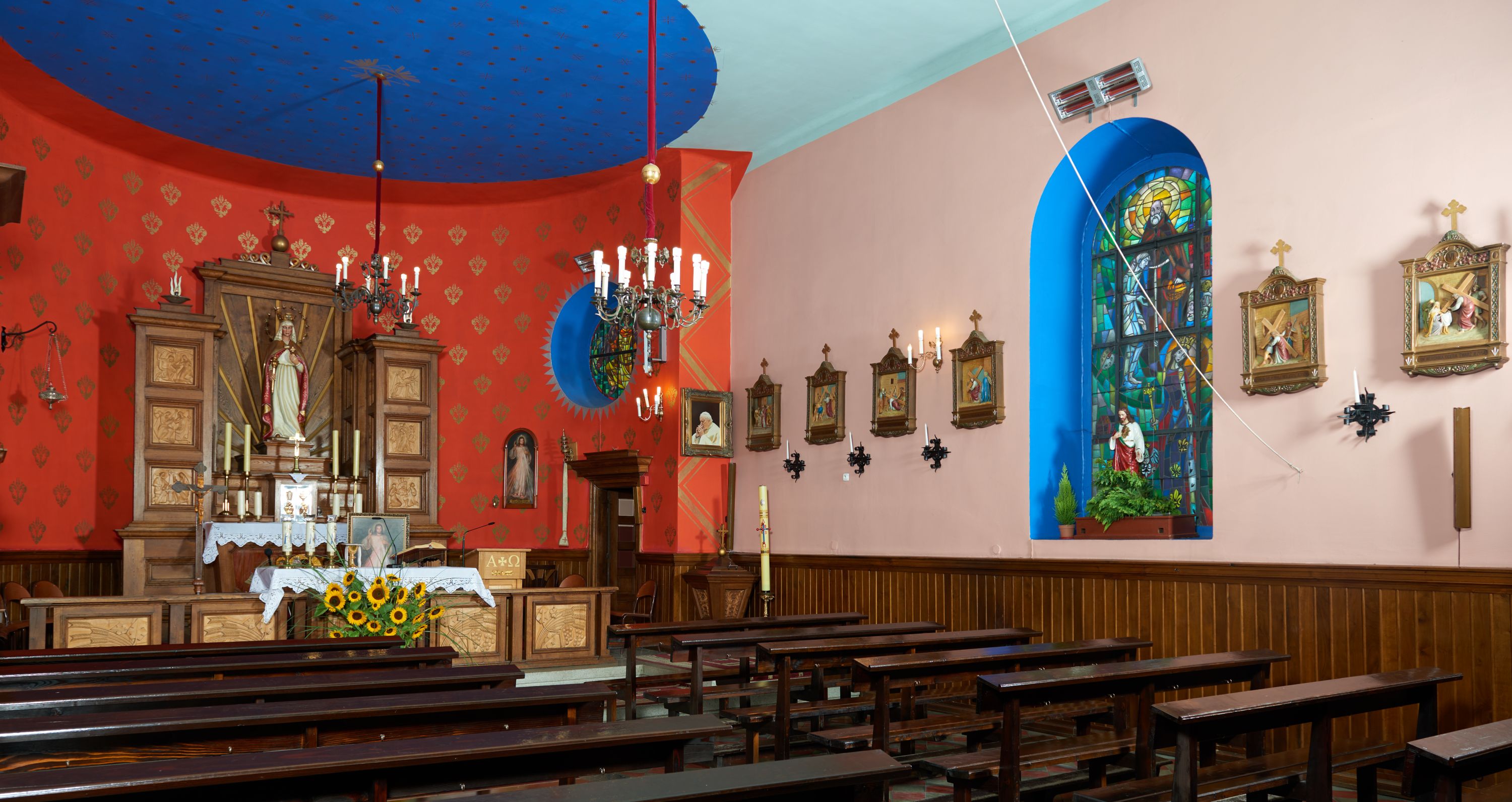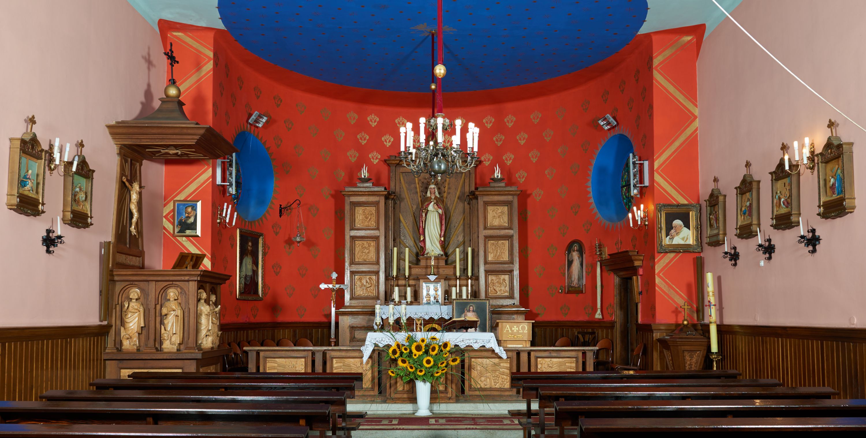 The Church of The Most Holy Virgin Mary, the Queen in Będkowice is an interesting temple built of a local, white limestone sett consisting of numerous fossils. The temple was built in 1938-1939. The small church was built in Neo-Romanesque style. Before entering the temple, it is worth paying attention to the statue placed in the top of the facade. This is a sculpture depicting Pensive Christ. Inside the church, there are modern furnishings (mainly) from the mid-20th century. A high altar, made in the third quarter of the 20th century by Ludwik Jurga of Zabierze, is located in the chancel. Plaquettes, decorating the altar with scenes from the life of the Virgin Mary, were carved by Władysław Kozyra from the White Church. Particularly interesting is the painting from 1935, depicting the Most Sacred Heart of Jesus, made by Stanisław Ciężadlik. This image directly refers to the work of Pompeo Batoni from the Church of Il Gesù in Rome. The author of the painting in Będkowice is an artist from Mszana Dolna, whose numerous works are placed in the furnishings of the churches from Lesser Poland. The artist created designs of altars, baptismal fonts, stations of the cross and confessionals. He also made portraits, which constituted one of the main branches of his work.