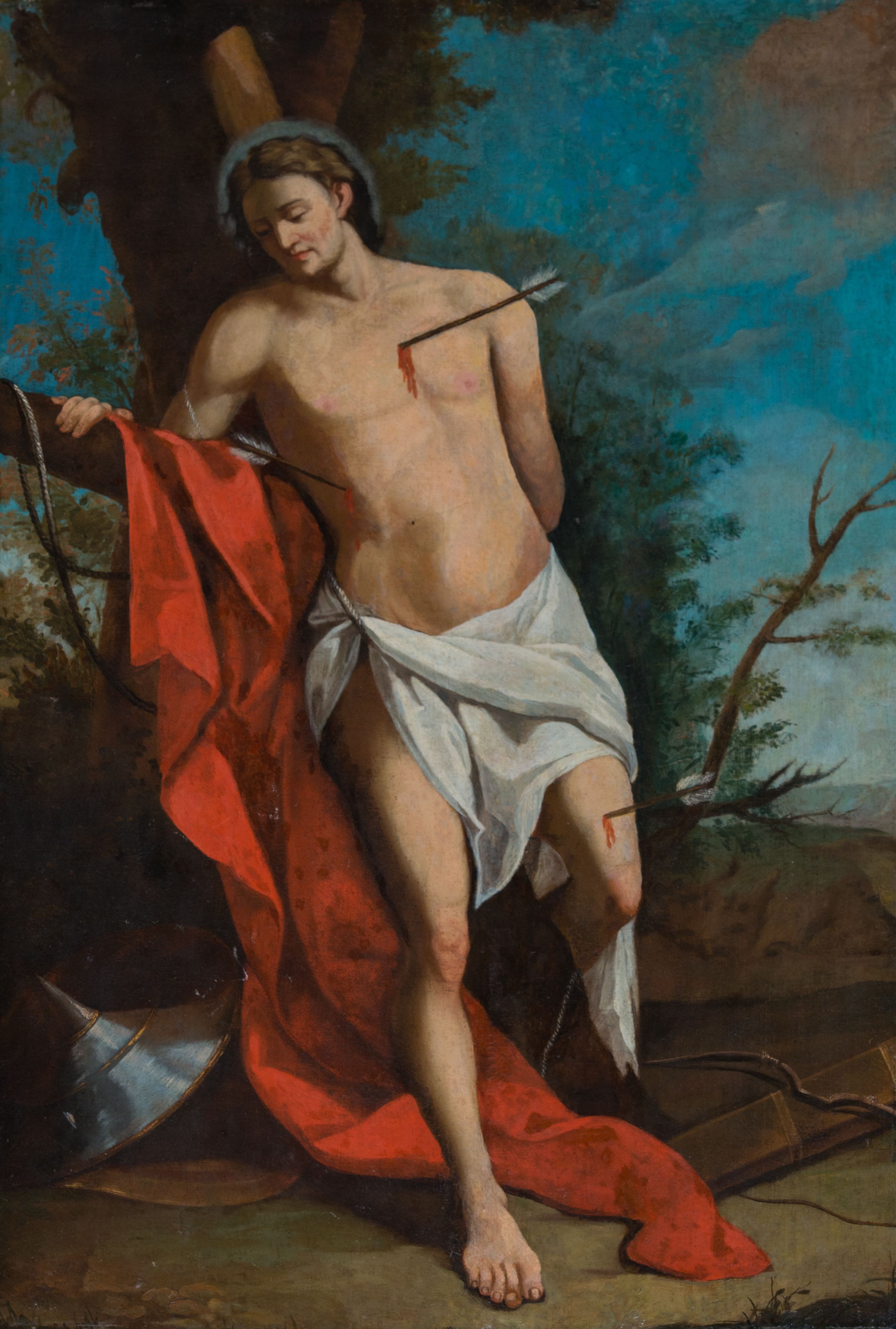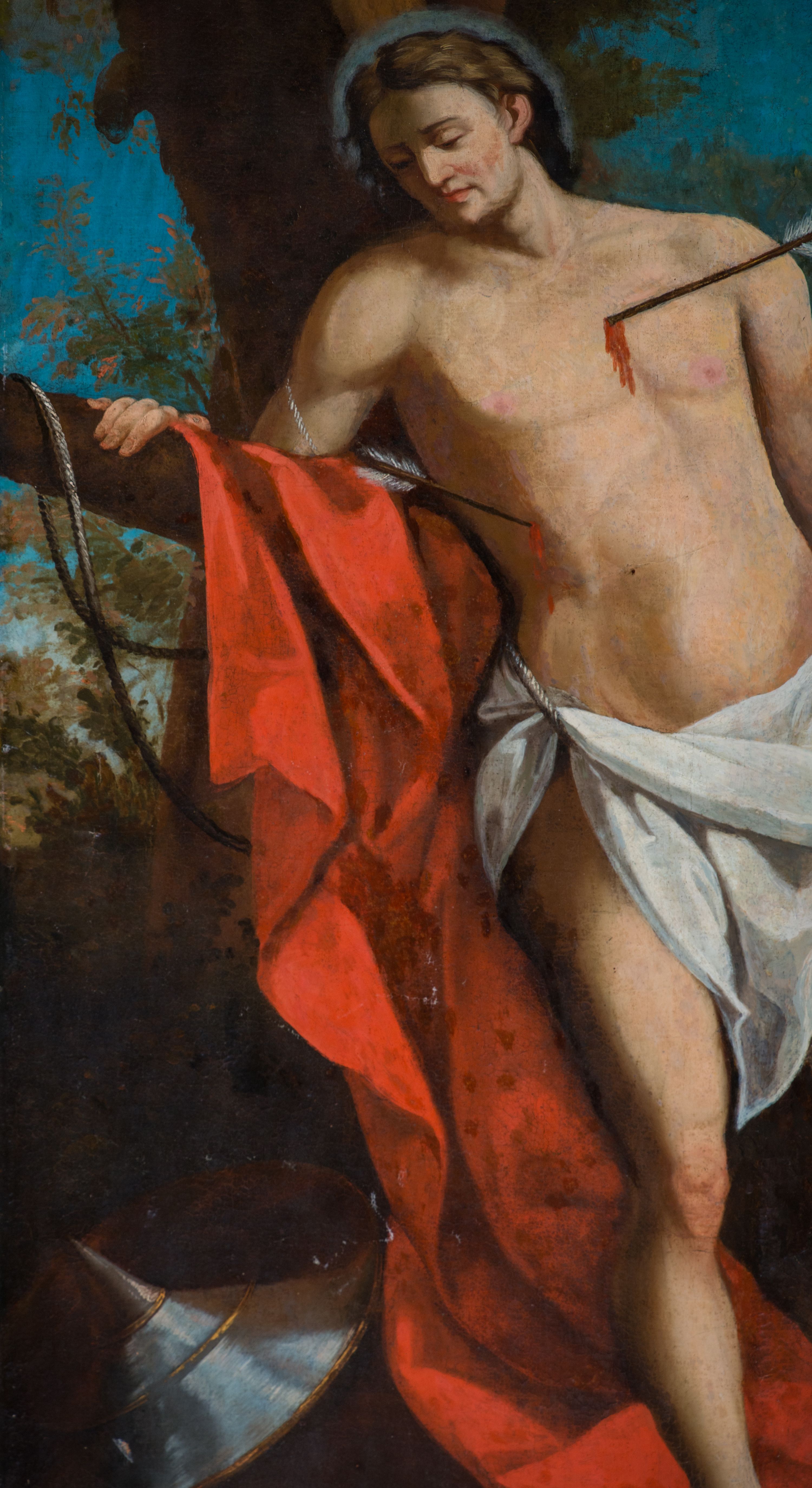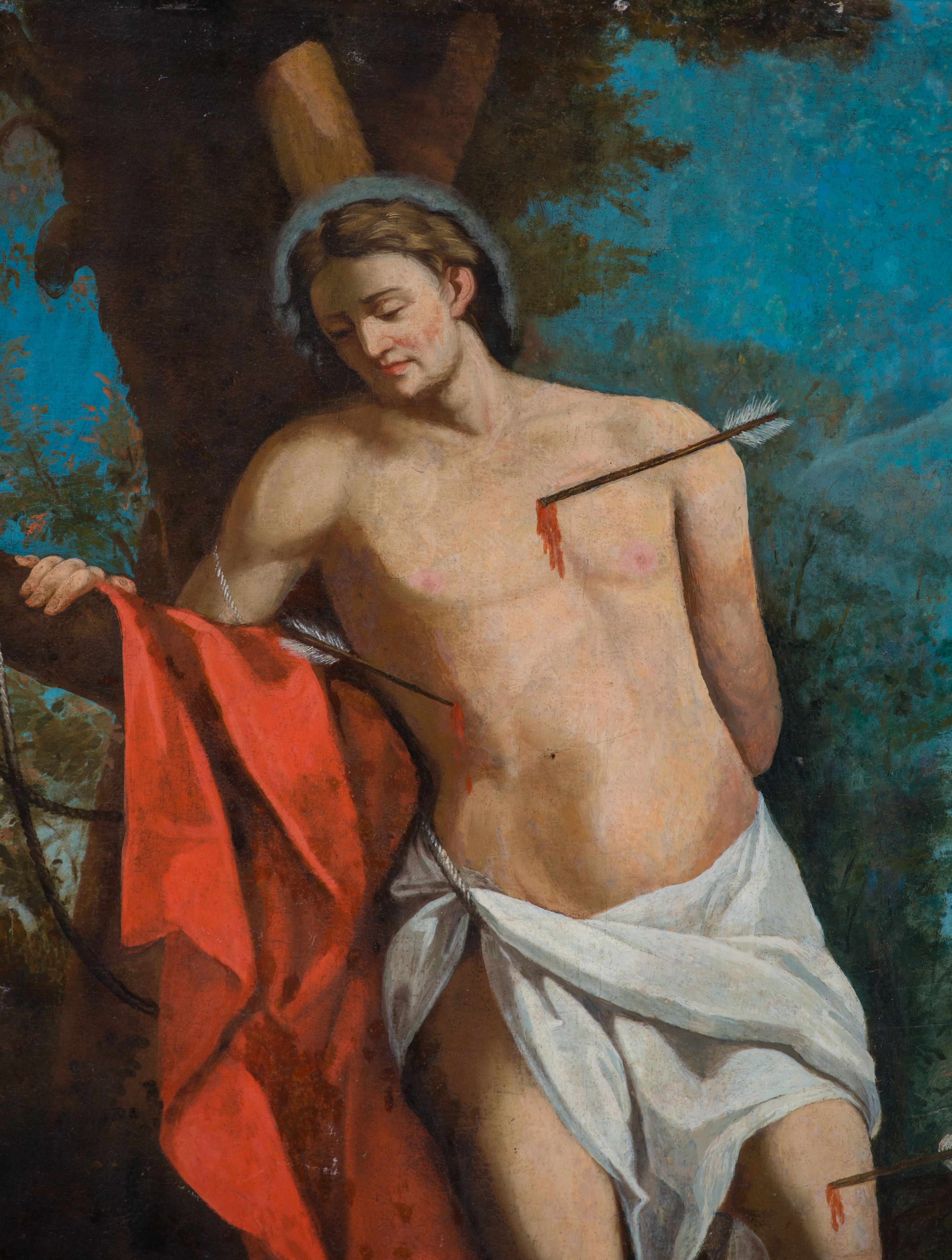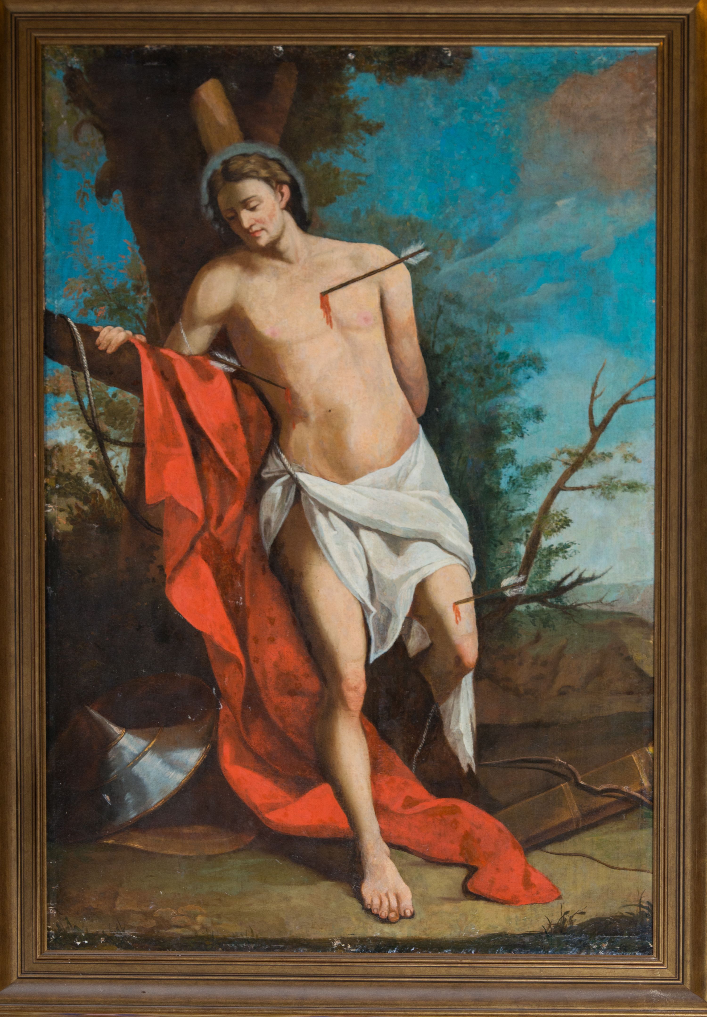 The painting of St. Sebastian was probably created in the first half of the 18th century. In the records of the visit from 1748, there is a mention of the side altar of the saint, in which it was probably originally located. In the second half of the 20th century it was removed from the altar and hung on the wall of the nave. Saint Sebastian served as commander in Diocletian's guard. He once opposed the Emperor's persecution of Christians, for which he was tied to a tree and pierced with arrows. This moment of the martyrdom of the saint is illustrated in the painting discussed.