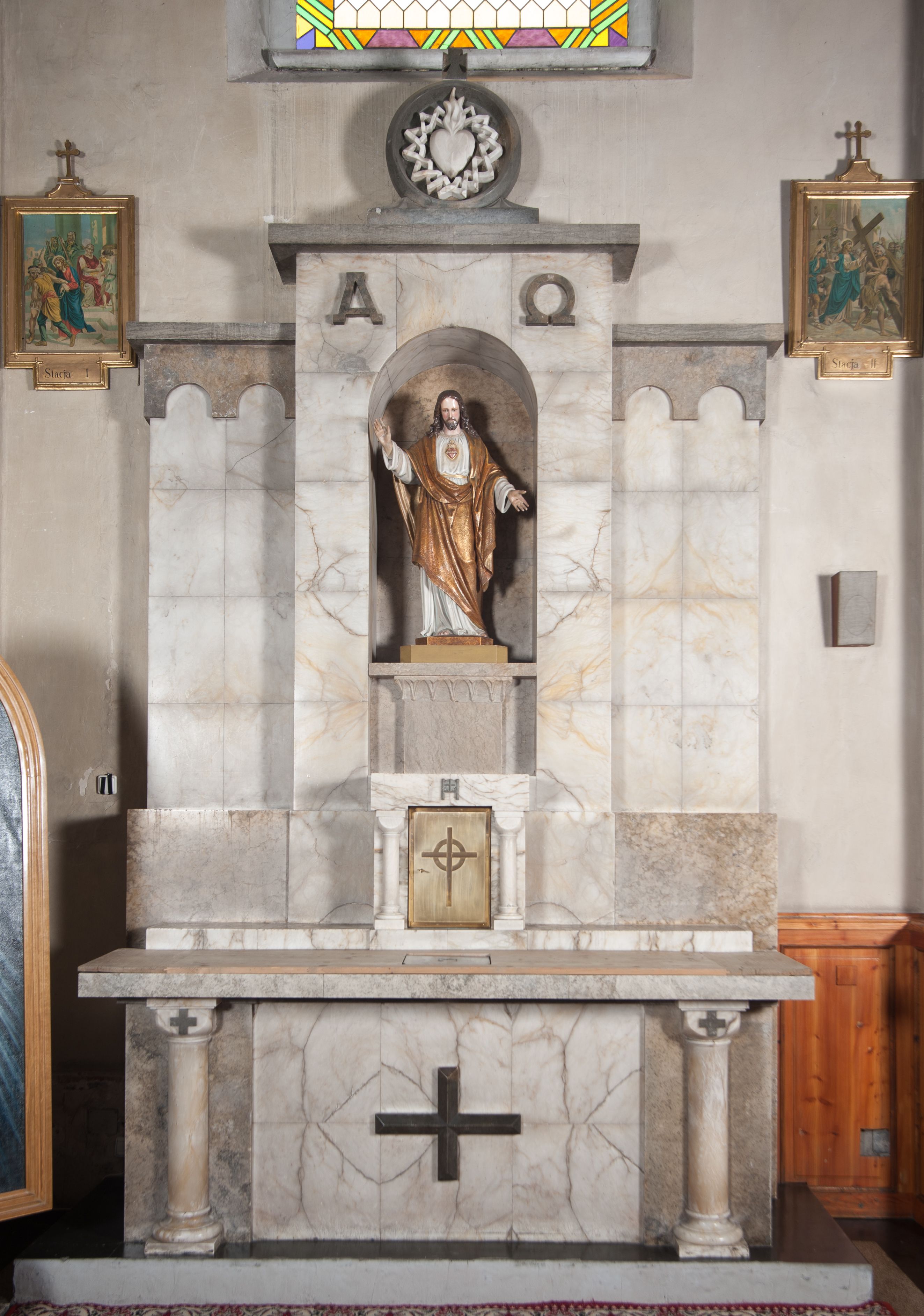 The cult of the Heart of Jesus developed under the influence of the revelations of Margaret Mary Alacoque from the Visitation Order. The order of worship was approved by Pope Clement XIII in 1765. The iconography of the Most Sacred Heart of Jesus evolved in the fourth quarter of the 18th century, and developed in devotional art in the 19th and early 20th centuries. Its shape was influenced by the dissemination of printed paintings on this subject by the Italian painter Pompeo Batoni. In the 19th- and 20th-century sculpture, two variants of the representation were particularly popular: the image of the Most Sacred Heart of Jesus according to Batoni and Venite ad me (Mt 11, 28), in which Jesus is depicted in a standing position, with arms spread wide apart. The sculpture in the church in Kamień refers to the latter of the mentioned variants.
