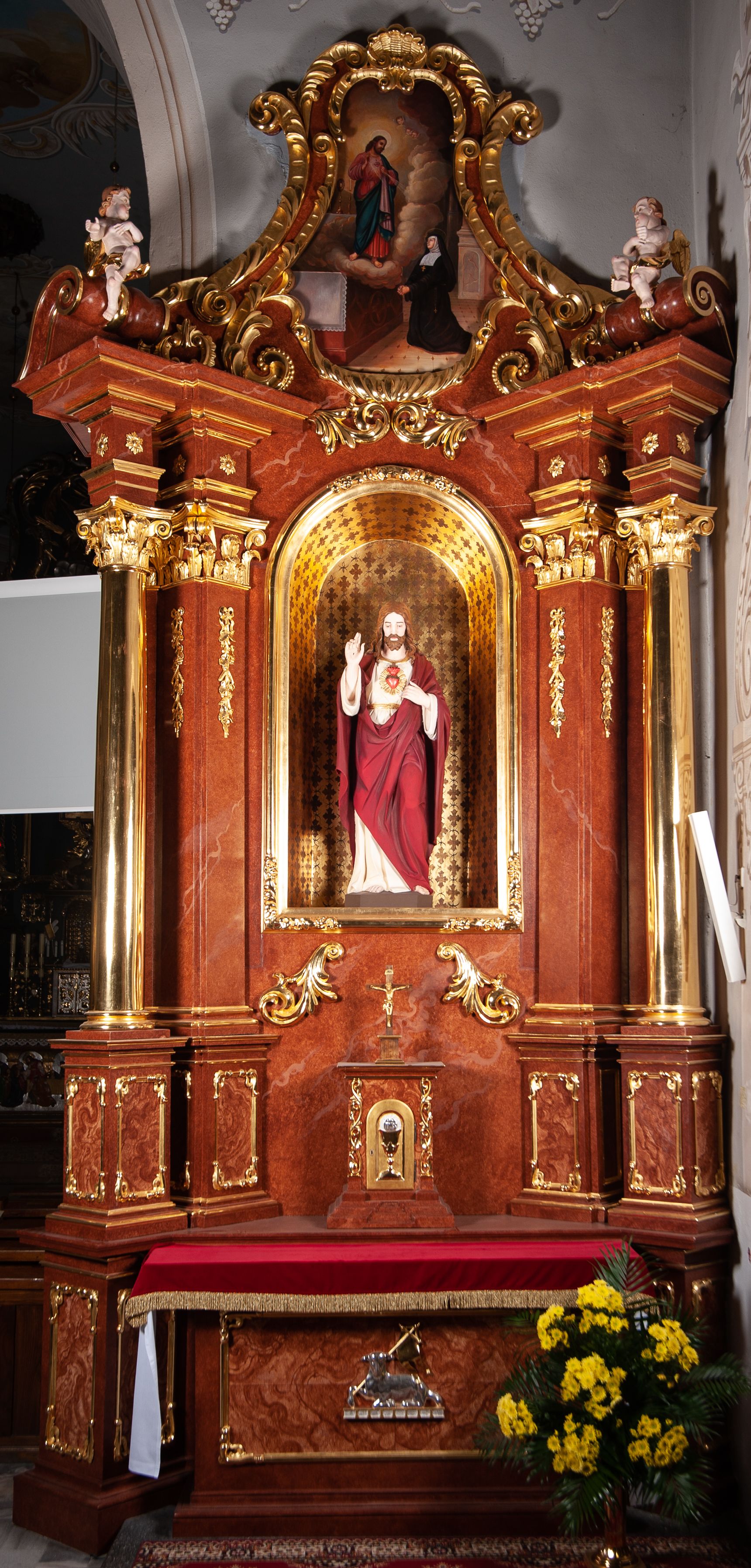 The statue of the Most Sacred Heart of Jesus was created in 1826 to the altar where it is located. It represents a type of representation of Christ very popular in the 19th century with a burning heart girded with a crown of thorns in front of his chest.