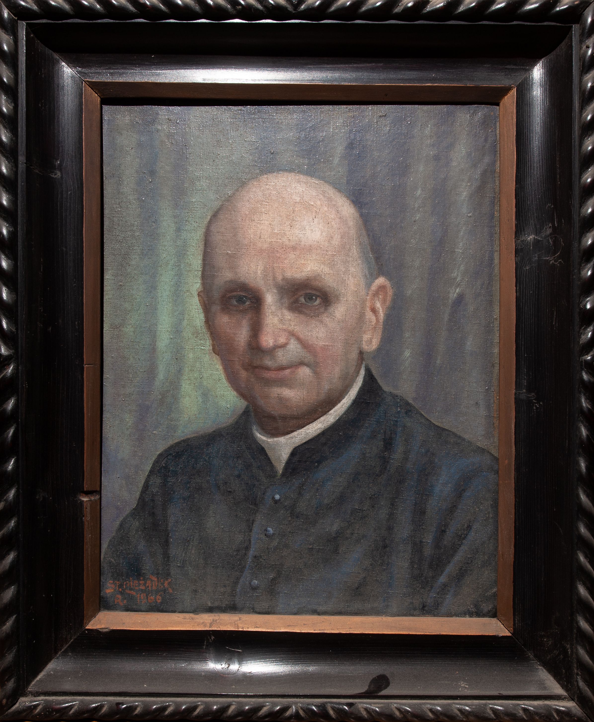 The portrait depicts father Andrzej Braś, a parish priest in Kasinka Mała, acting from 31 October 1945 to 6 August 1966. The priest provided the church with crucial furnishings and renovated the altars. When he was the parish priest in the church in Kasinka, a range of works were created by the author of the portrait in question, Stanisław Ciężadlik (altars, Stations of the Cross, confessionals). The parish priest died suddenly in 1966. Thus, the painting is a posthumous portrait or one made during the final year of life of father Braś.