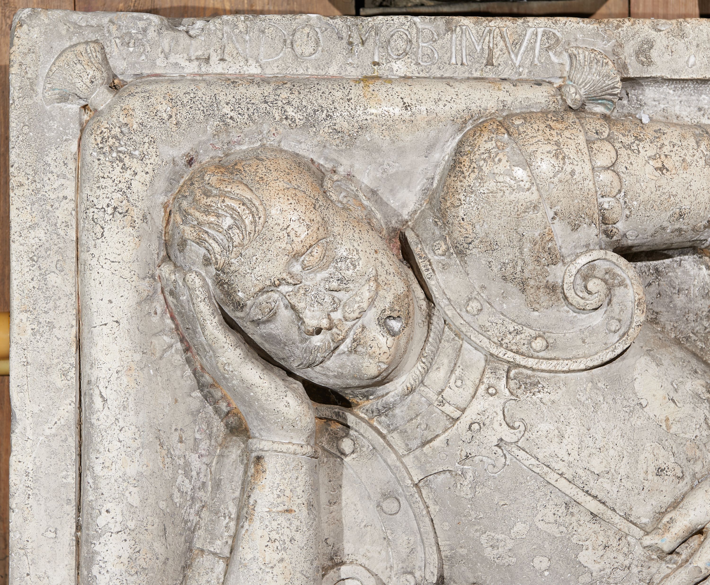 A rectangular slab with a relief of a figure and a cartouche of arms - the remains of a mannerist tombstone of a knight of the Rawicz coat of arms from the beginning of the 17th century depicts a knight in the so-called "sansovinowska pose".