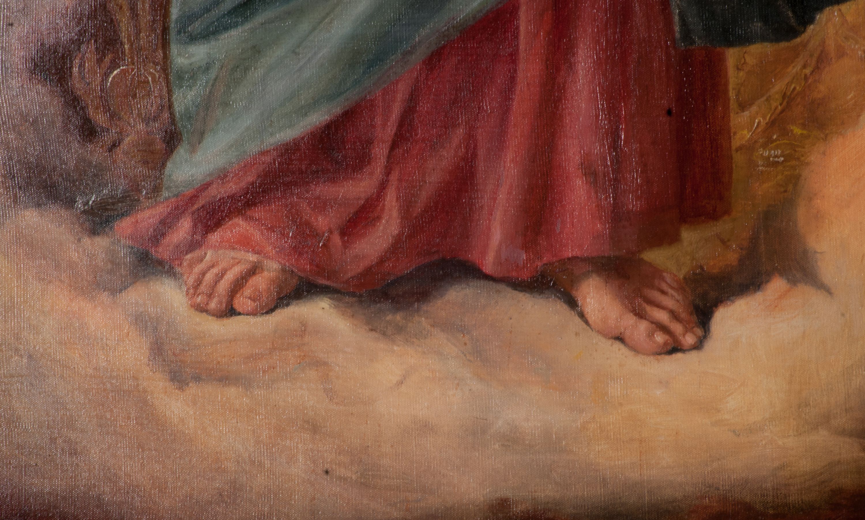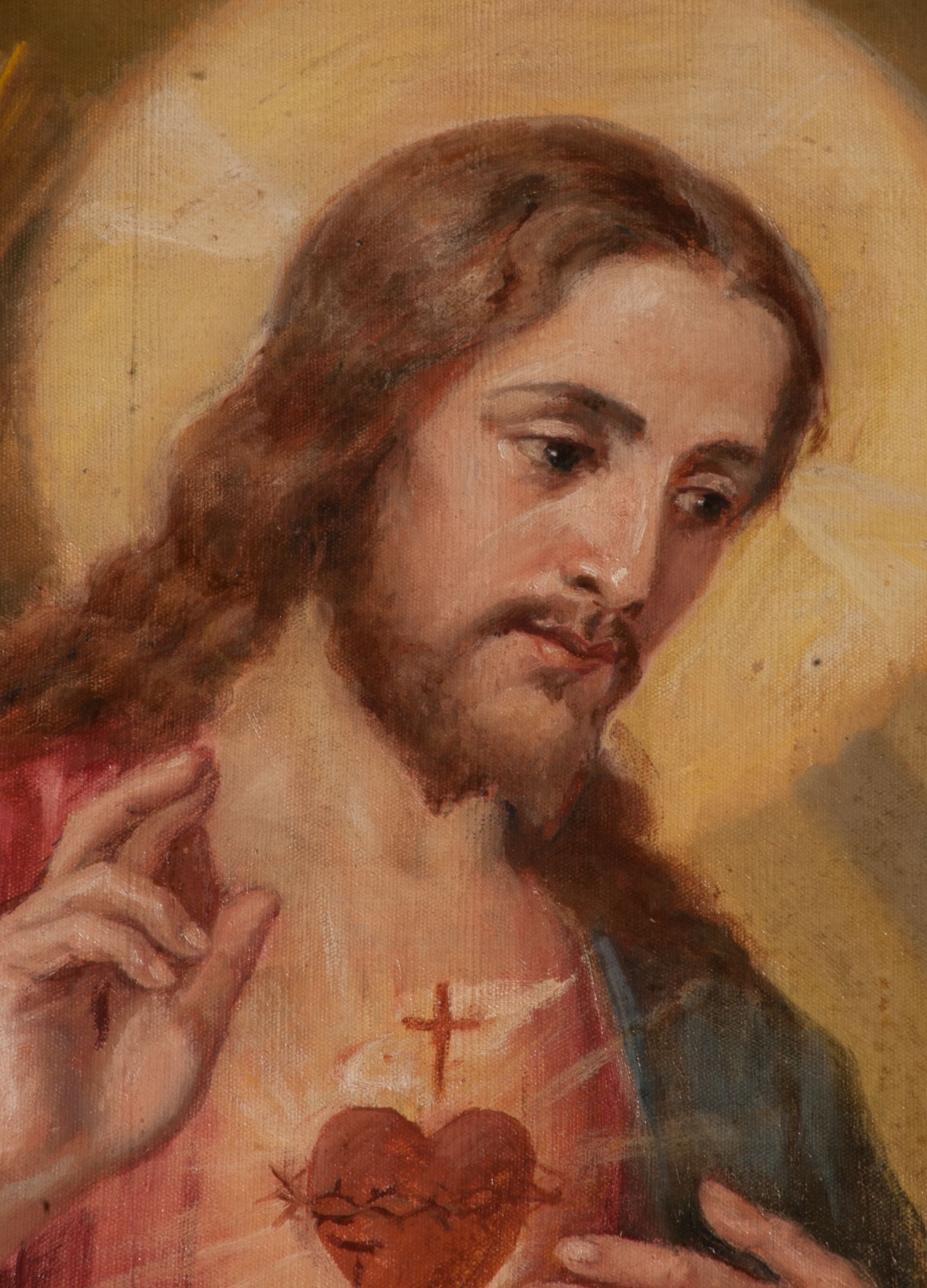 The painting displaying St. Maragaret Mary Alacoque's vision was painted in 1910 by Antoni Zembaczyński. The work illustrates one of the four revelations of Christ with burning heart, received by Margaret Alacoque in the years 1673 - 1675. The painting adheres to the traditional iconography of the subject, presenting St. Margaret kneeling before Christ with burning heart appearing among clouds, against the background of an altar.