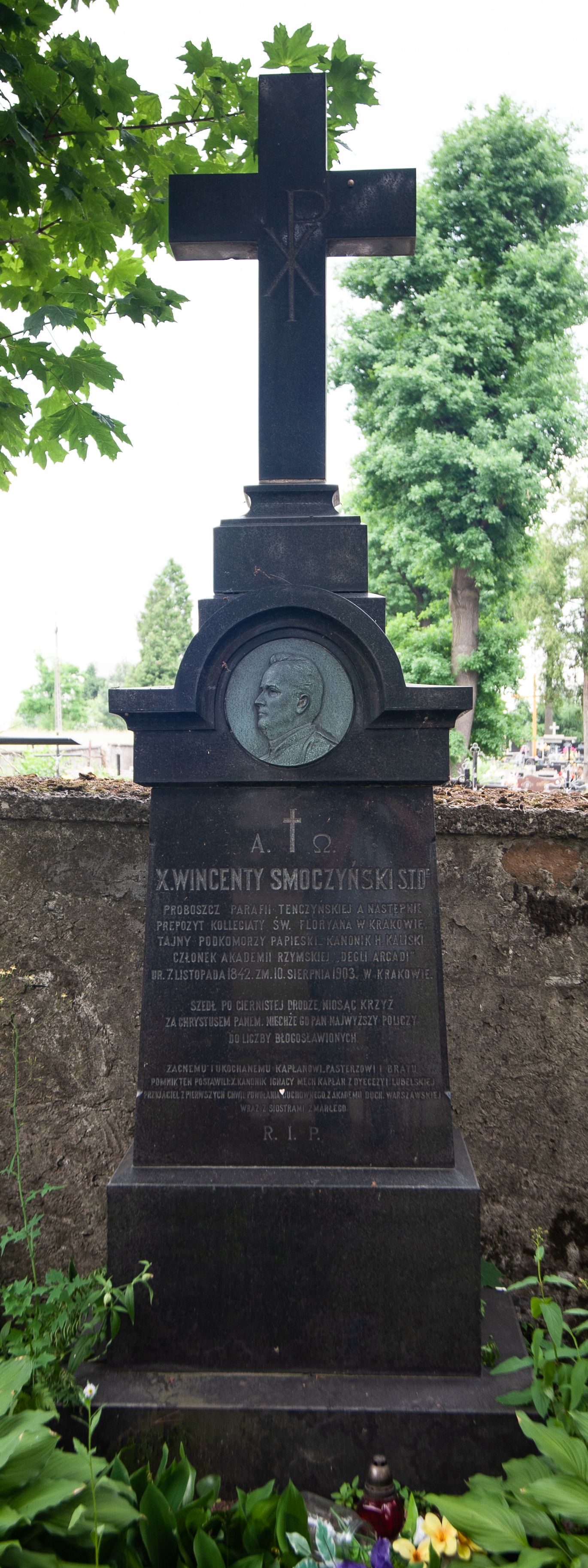 The tombstone of father Wincenty Smoczyński (1842-1903) located within the walls surrounding the church was made in 1903 with the funds of canon Ignacy Mech. Smoczyński was an enlightened preacher and an important figure in Tenczynek's history. During his more than twenty years of service, he became famous for his extraordinary care for the morality and temperance of the inhabitants, and brought to the village the order of the Sisters of Mercy, who since then took care of and educated parishioners.