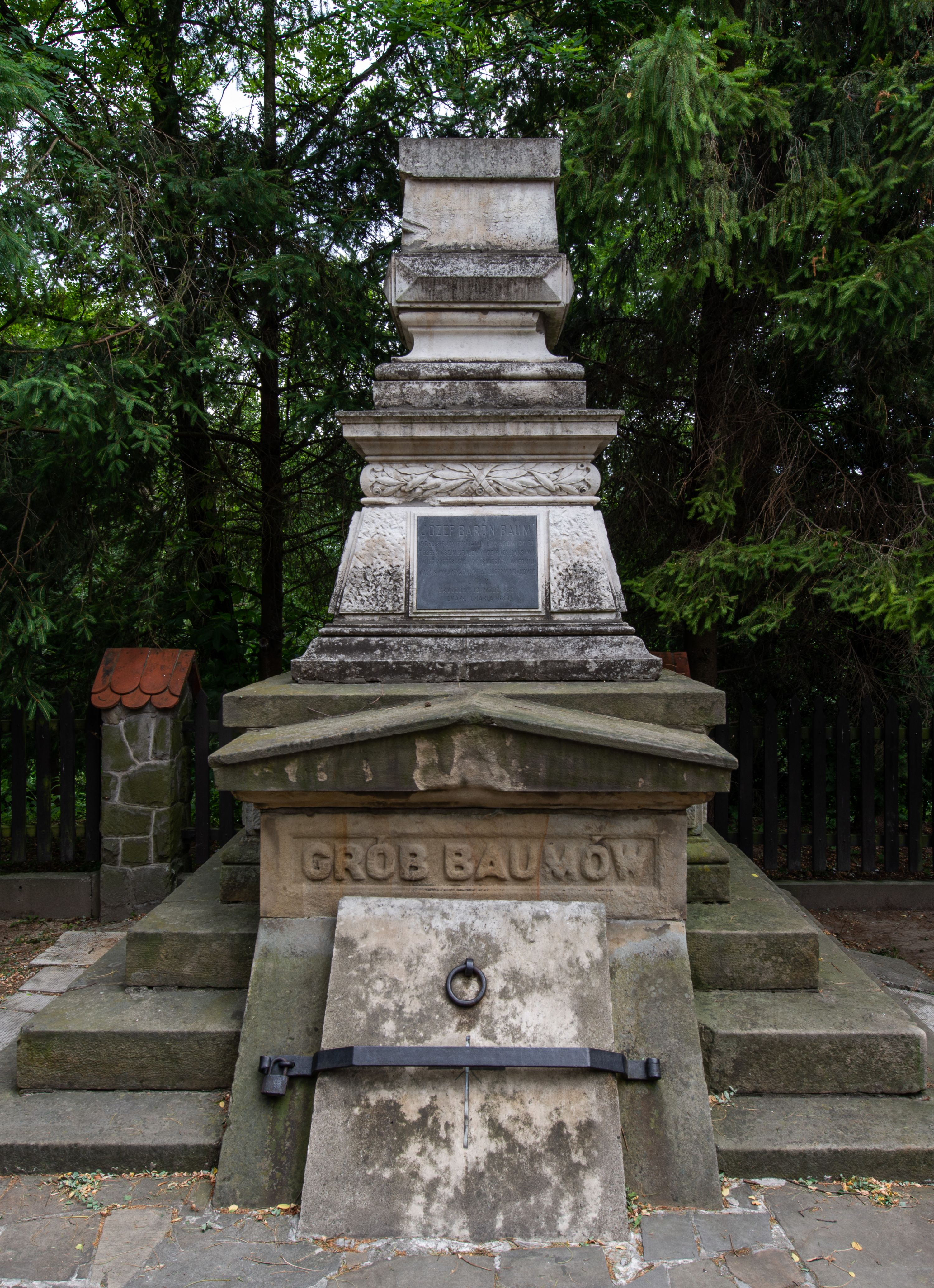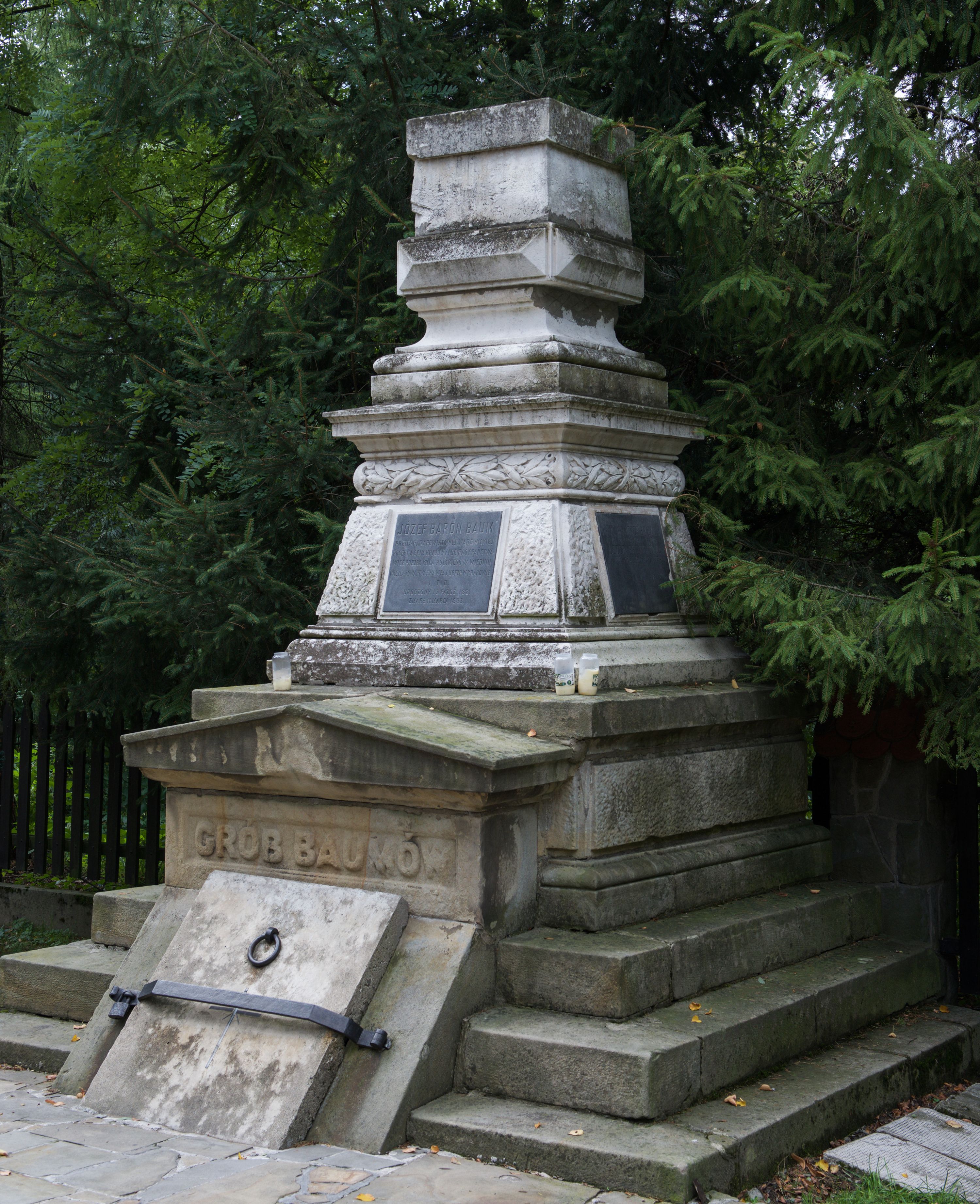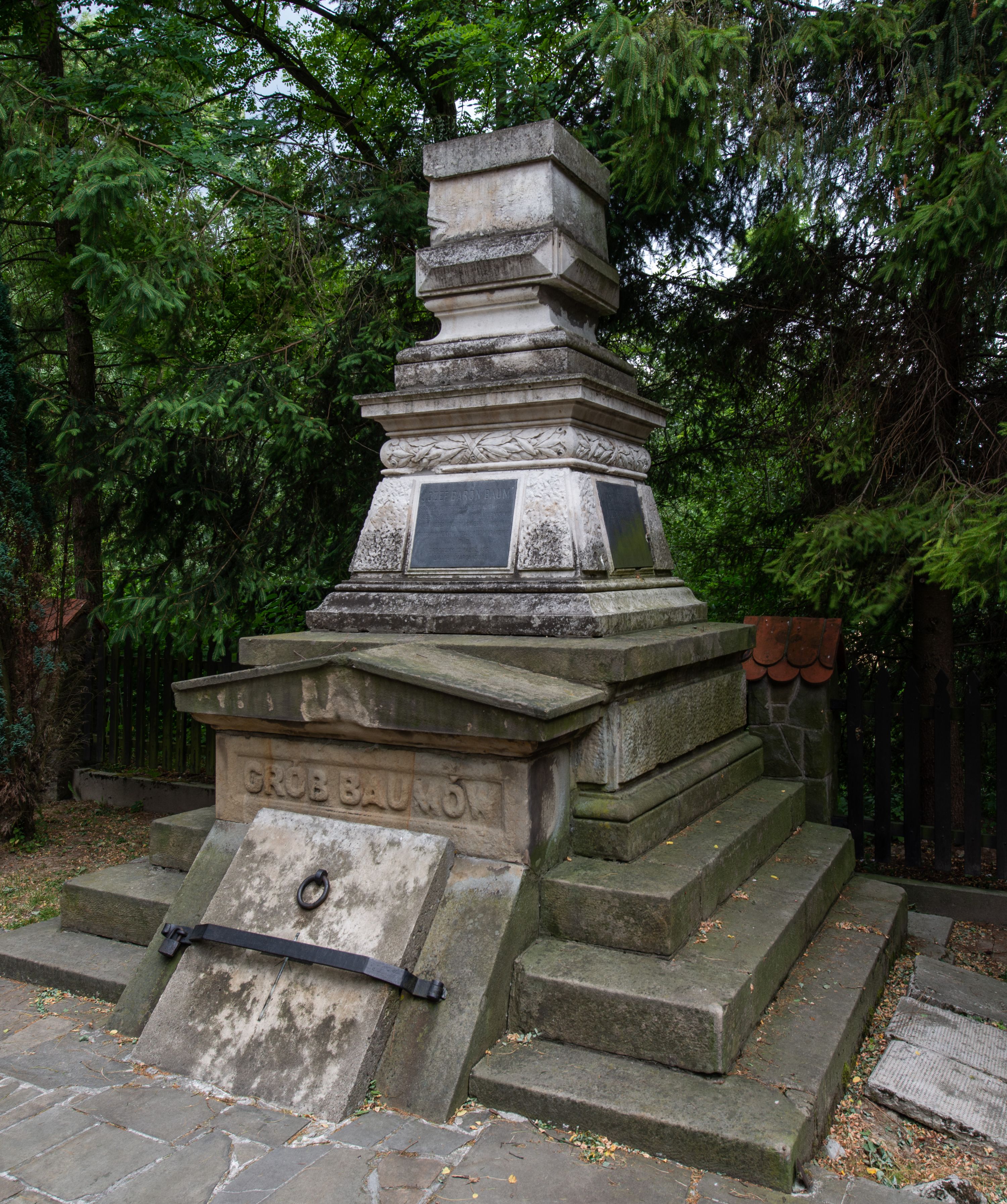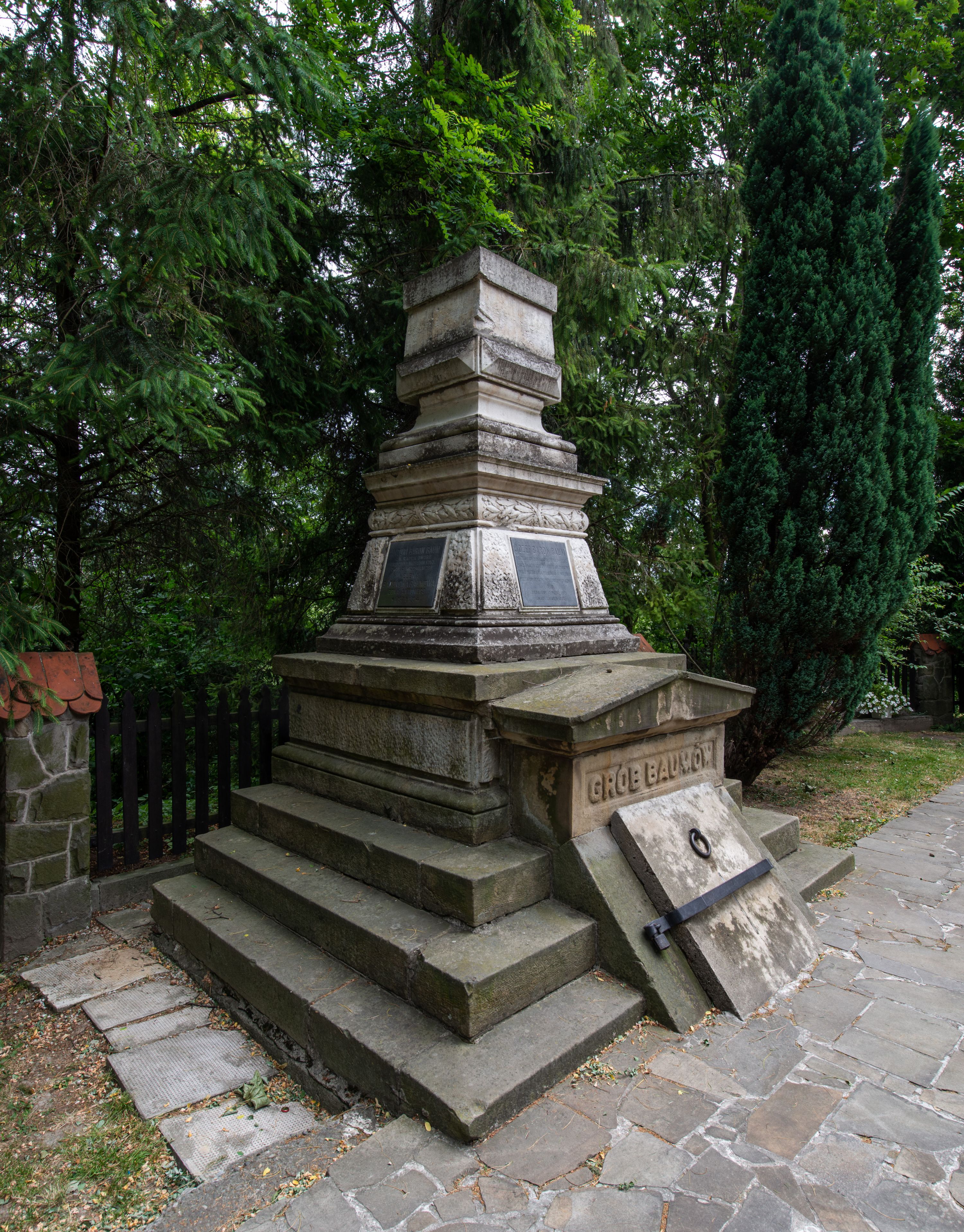 The monumental tomb of the Baum family was made by Edward Stehlik (1825-1888) in the second half of the 19th century. Dozens of tombstones, epitaphs, grave chapels, altars and other works of art were created in his stonemasonry company. The tomb is dedicated to the Baum family. It is the rest place for: Antoni Baum (1763-1829) and his wife Helena (1797-1884); his son Józef Baum (1821-1883); as well as the children of Józef: Wiktor Józef Baum (23.10.1845-3.10.1846) and Józefa Baum (4.04.1854-18.04.1854).