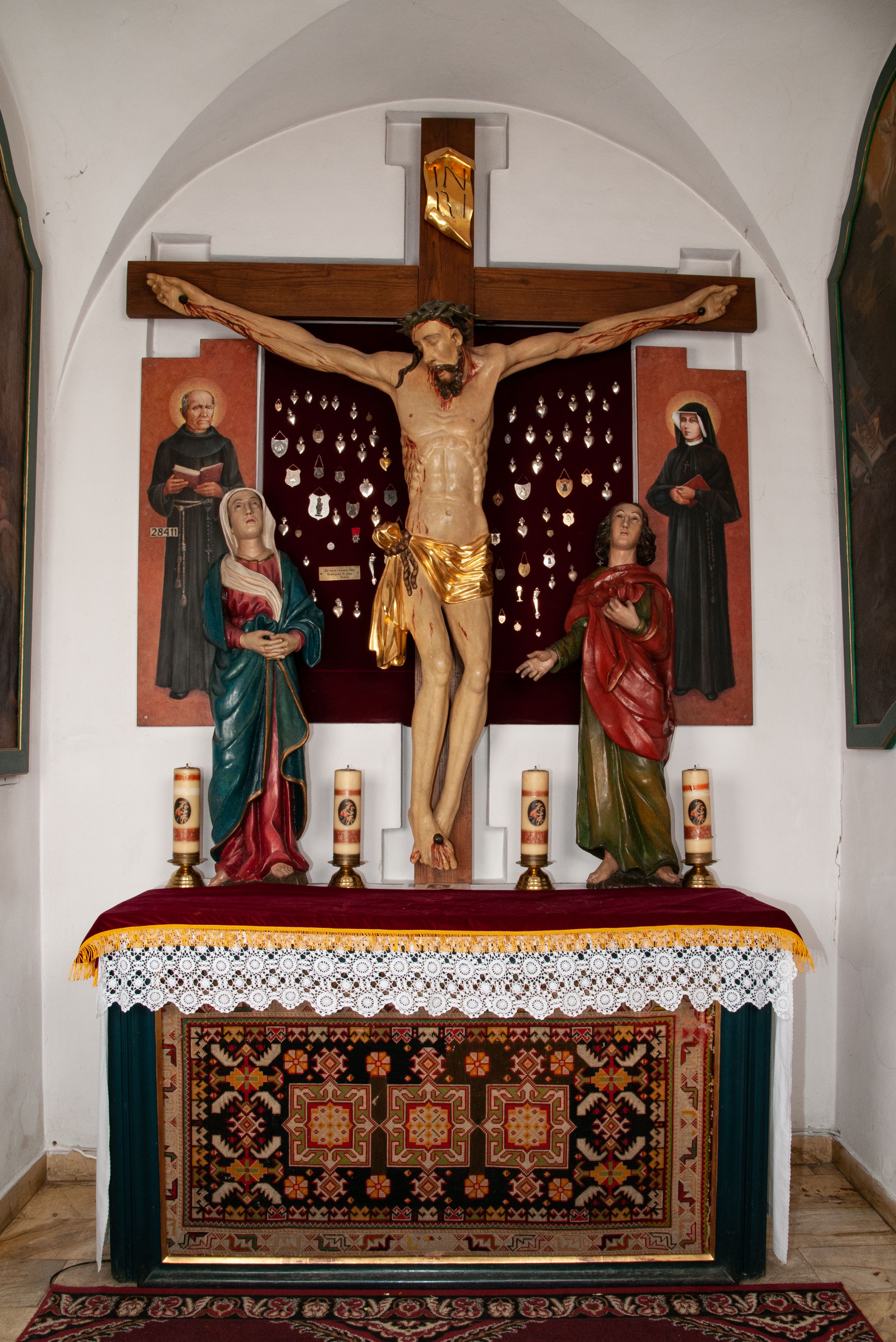 The sculpture of Virgin Mary and St. John the Evangelist were placed in the 20th century at the sides of crucifix dated to the 17th century. Currently all the sculptures comprise the so called Crucifixion Group.