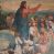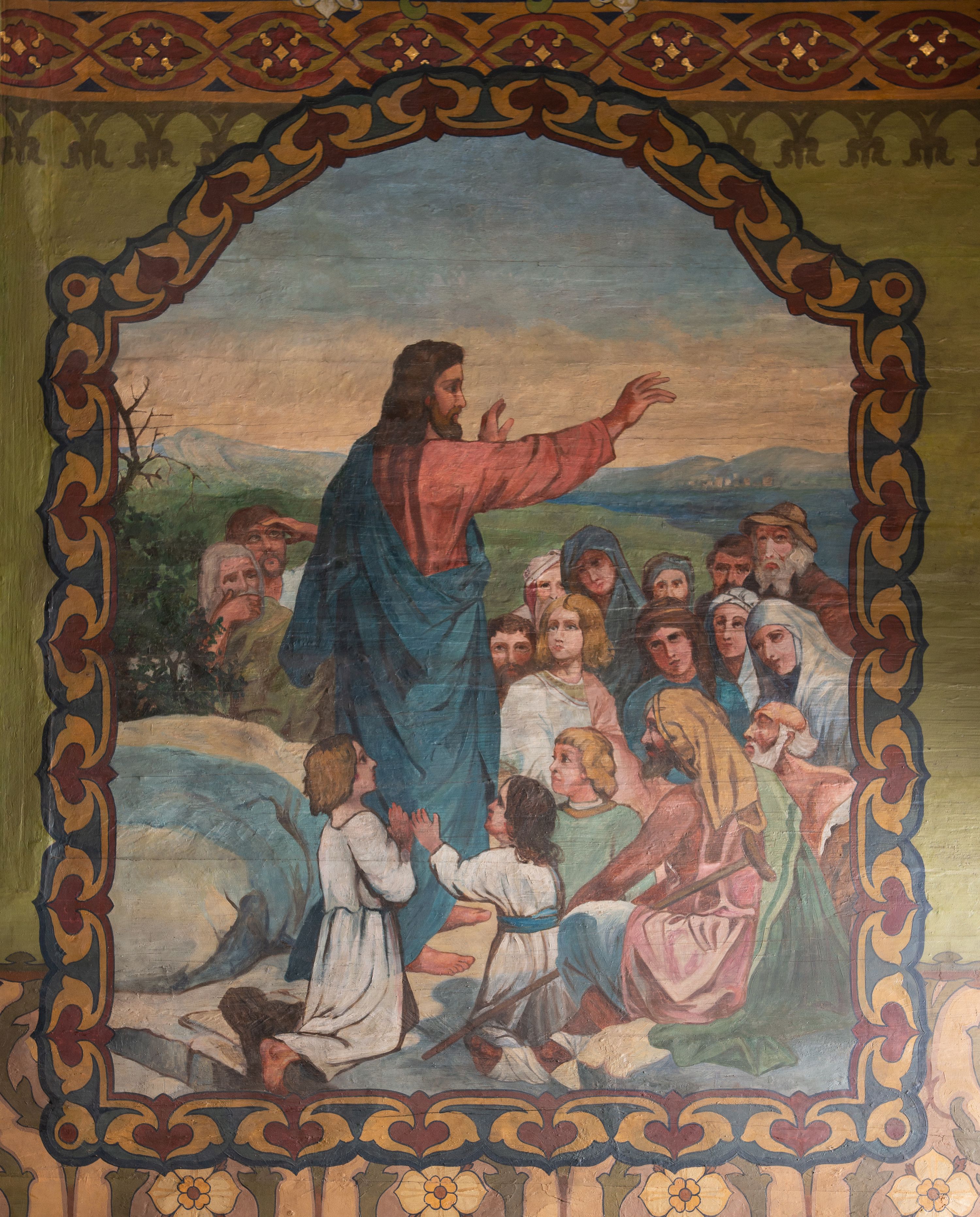 The scene of chancel wall polychrome, characterised by the style and colour scheme typical of the period Young Poland, depicts a narrative evangelical presentation with Jesus teaching the crowd.