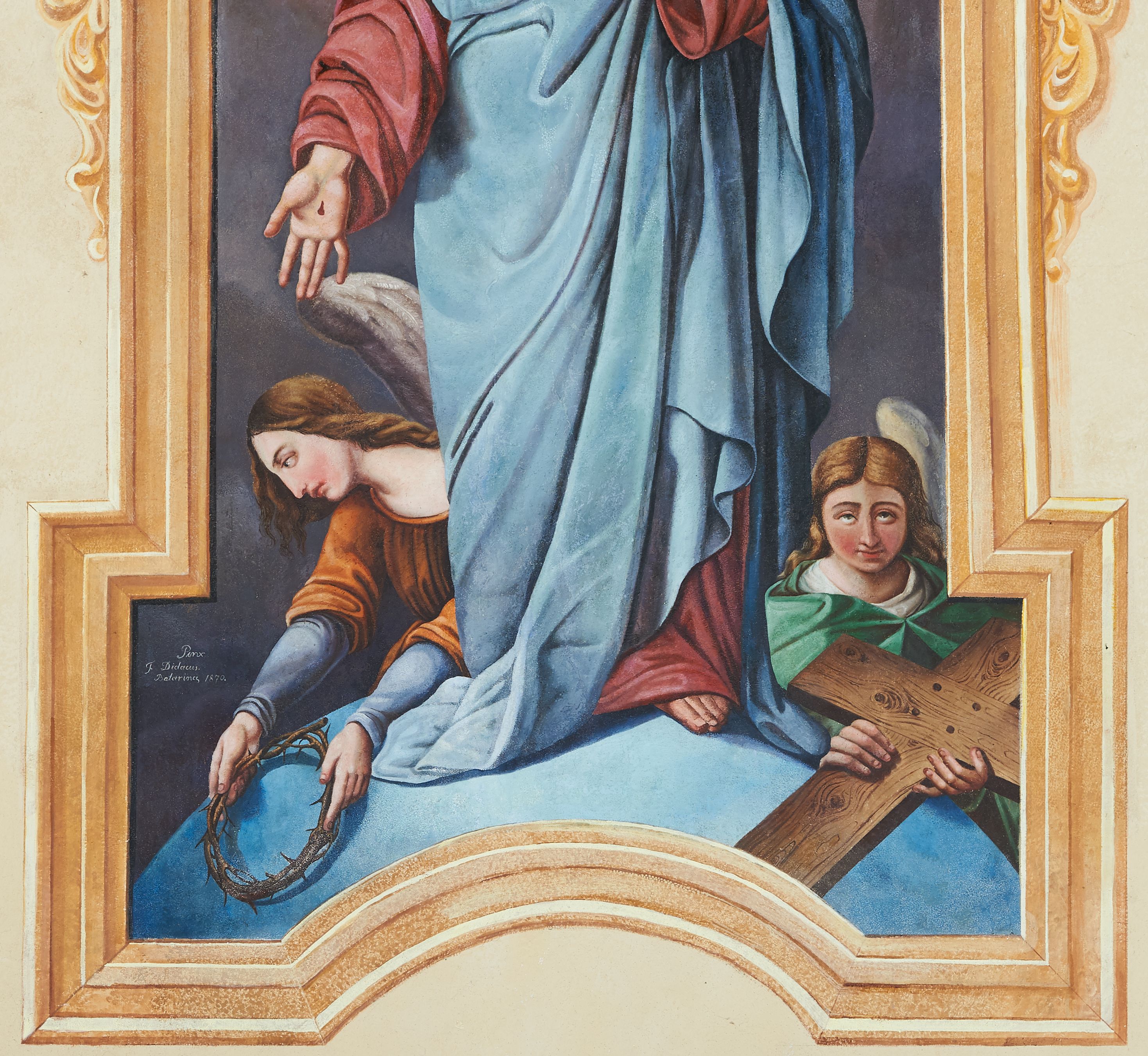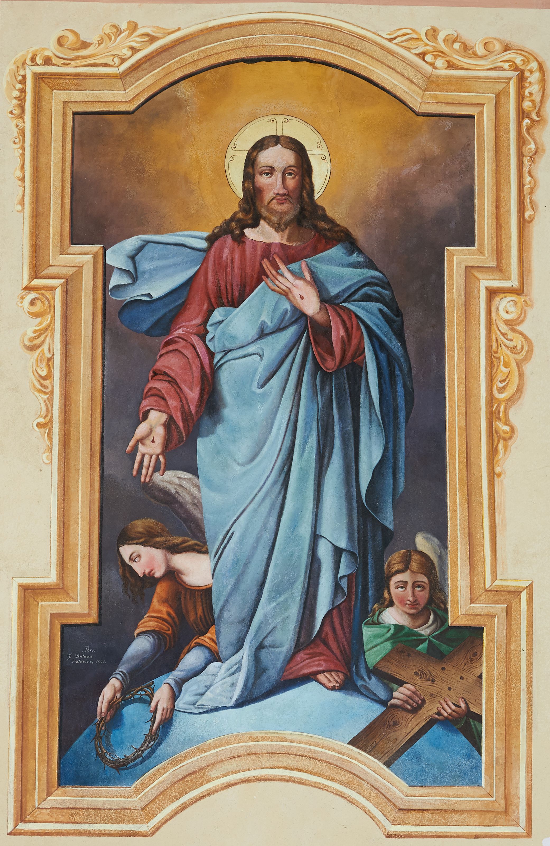 The author of this work was Bernardine painter Dydak Baturyna (Bataryna), who deceased in 1879. The polychrome depicts Christ after the resurrection, the composition of which refers to common depictions of the Most Sacred Heart of Jesus in the 19th century art.