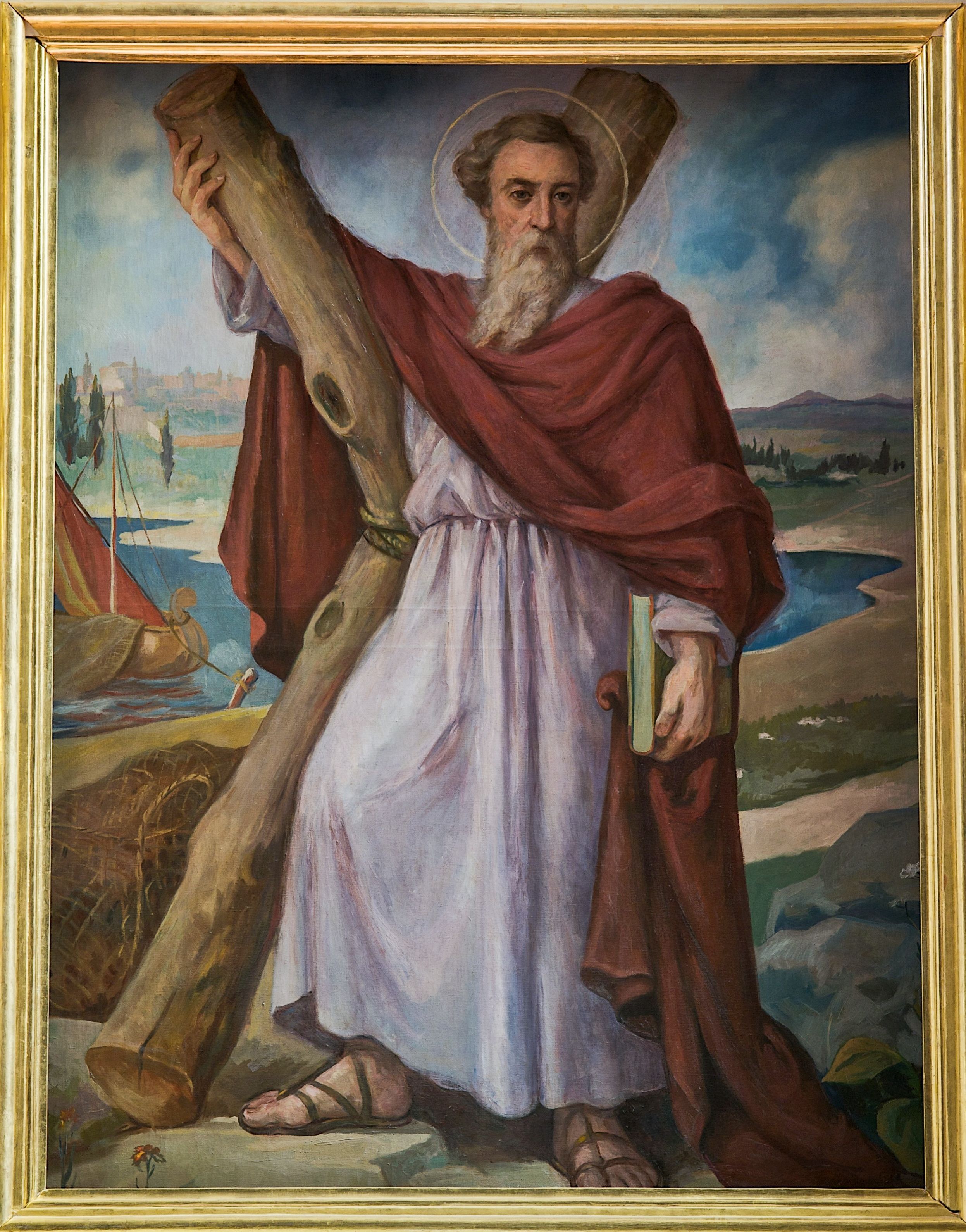 Święty Andrzej Apostoł urodził się w Betsaidzie, a zmarł w Patras 30 listopada około 62-70; był bratem św. Piotra. Zanim został uczniem Jezusa i przyjął chrzest w Jordanie był rybakiem. Po śmierci Jezusa głosił Ewangelię w Bizancjum, Azji Mniejszej, Tracji, Scytii, Grecji i Abchazji. Zginął śmiercią męczeńską w greckim Patras, gdzie umarł na krzyżu w kształcie litery „X”. W 356 roku jego relikwie przewieziono do Konstantynopola, a w 1202 roku krzyżowcy przenieśli je do Amalfi. W XV wieku na polecenie Piusa II sprowadzono je do rzymskiej bazyliki św. Piotra. W 1964 roku Paweł VI zwrócił je do pierwotnego miejsca. W ikonografii przedstawiany jest jako starszy mężczyzna o gęstych, siwych włosach i krótkiej brodzie. Jego atrybuty to krzyż w kształcie litery „X”, księga, sieć oraz ryba. Jest patronem narodów słowiańskich, krajów takich jak Grecja, Rosja, Hiszpania czy Niemcy, a także małżeństw, podróżujących, rybaków, rycerzy i rzeźników. Jego święto liturgiczne obchodzone jest 30 listopada.