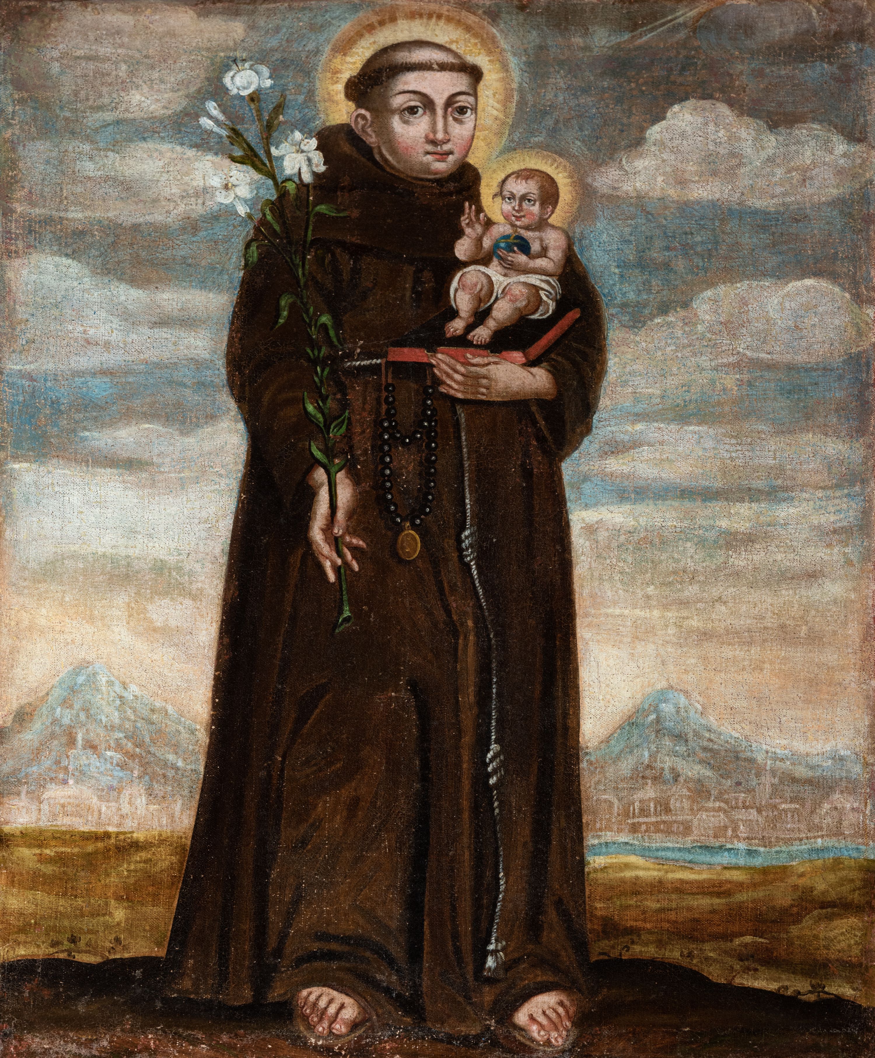 Święty Antoni urodził się w Lizbonie w 1195 roku, w 15. roku życia wstąpił do zakonu kanoników regularnych św. Augustyna. Po dwóch latach przeniósł się do portugalskiego Santa Cruz, by tam uczyć się teologii. W 1220 roku wstąpił do klasztoru franciszkanów św. Antoniego Pustelnika i przyjął imię patrona. Zgodnie ze swoją wolą został wysłany na misję do Maroka, na jego decyzję wpłynęła wiadomość o męczeńskiej śmierci pięciu działających tam franciszkańskich zakonników. Niestety musiał wrócić z powodu choroby i został wysłany do Monte Paolo koło Forli, gdzie zaczął wieść życie pustelnika i 18 listopada 1221 przyjął święcenia kapłańskie. W następnych latach wykładał teologię i głosił kazania we Włoszech i Francji, po 1224 roku został wysłany na południe Francji, aby przeciwdziałać albigensom (katarom). Był autorem pism, kaznodzieją, teologiem i mistykiem. Zaczął być czczony zaraz po śmierci w 1231 roku - jego kult koncentruje się w Padwie, ale ma duże znaczenie również w Rzymie, Sienie, Lizbonie i Tuluzie, gdzie znajdują się cudami słynące obrazy z przedstawieniem świętego. Wyobrażany jest najczęściej w habicie, z książką oraz lilią, czasem z chlebem, płonącym sercem lub samym płomieniem na dłoni. Wiele dzieł ukazuje go z Dzieciątkiem Jezus, które przejmuje od Marii lub które trzyma na rękach. Ta scena nawiązuje do legendy, zgodnie z którą Dzieciątko ukazało mu się, by umocnić go w wierze. Święty Antoni zmarł 13 czerwca 1231 w Arcelli i został pochowany w Padwie.