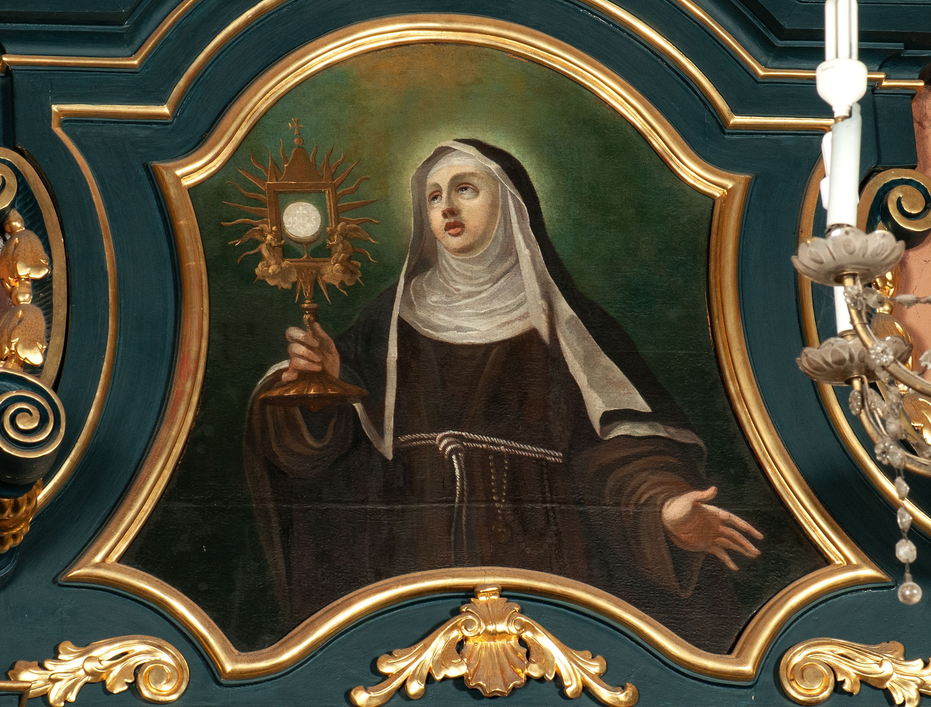 Święta Klara, a właściwie Chiara Offerduccio urodziła się 16 lipca 1194 w Asyżu. Była córką Ortolany i Favarone Offerduccio. Święta jest założycielką pierwszego klasztoru żeńskiego św. Franciszka, z którego rąk przyjęła habit zakonny w 1212 roku. Nowo powstały zakon przyjął nazwę klarysek od imienia założycielki. Do zakonu, idąc jej śladem, wstąpiło wiele mieszkanek miasta, w tym jej matka oraz siostry: św. Agnieszka i Beatrycze. W 1215 roku św. Franciszek ustanowił ją przełożoną konwentu. Wiatyku udzielił jej Innocenty IV. Święta zmarła 11 sierpnia 1253 w klasztorze San Damiano w Asyżu i została pochowana w bazylice św. Klary w Asyżu. Jest patronką Asyżu i Florencji, zakonu klarysek i kapucynek, zawodów: bieliźniarek, hafciarek, praczek oraz osób z chorobami oczu. W 1255 roku została kanonizowana przez Aleksandra IV. Jej wspomnienie liturgiczne obchodzone jest 11 sierpnia, zaś w zakonie klarysek 23 września. W ikonografii przedstawiana jest w brązowym habicie przepasanym białym sznurem z trzema węzłami symbolizującymi śluby ubóstwa, posłuszeństwa i czystości, a w dłoniach trzyma monstrancję, lilię, krucyfiks lub lampę. Monstrancja nawiązuje do legendy, według której podczas napadu Saracenów na Asyż w 1233 roku święta miała wyjść im naprzeciw i odeprzeć najazd, trzymając w rękach Najświętszy Sakrament.