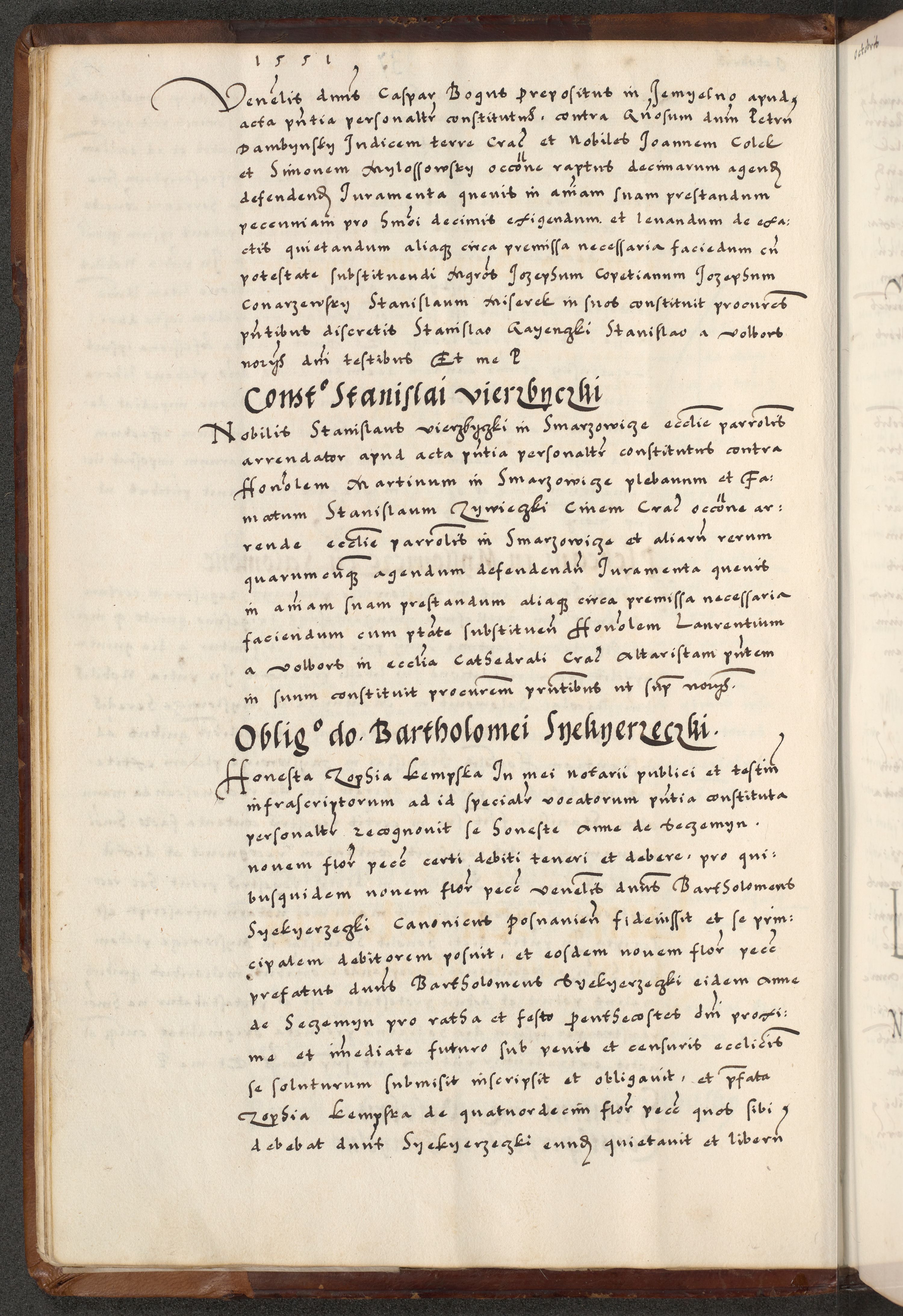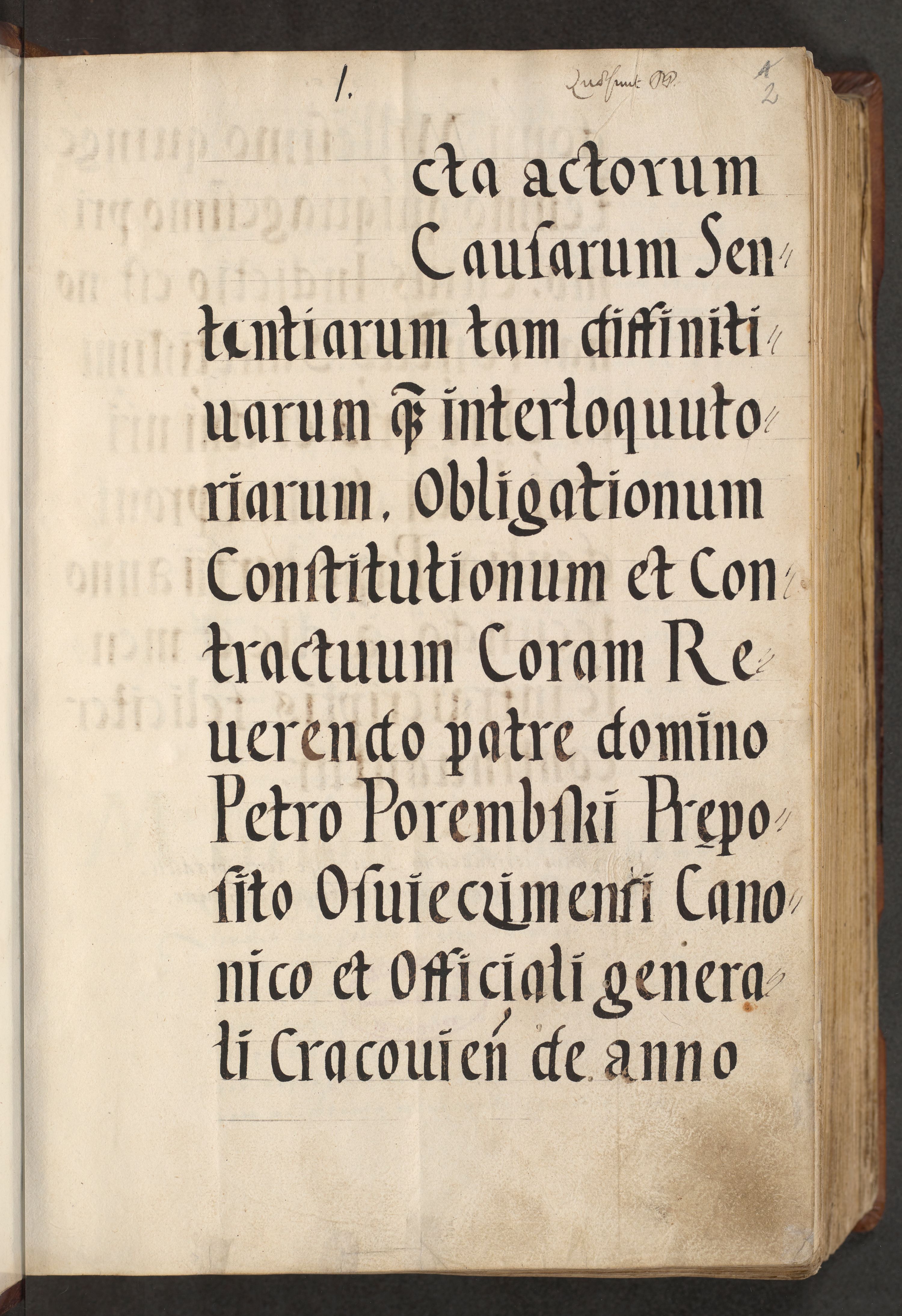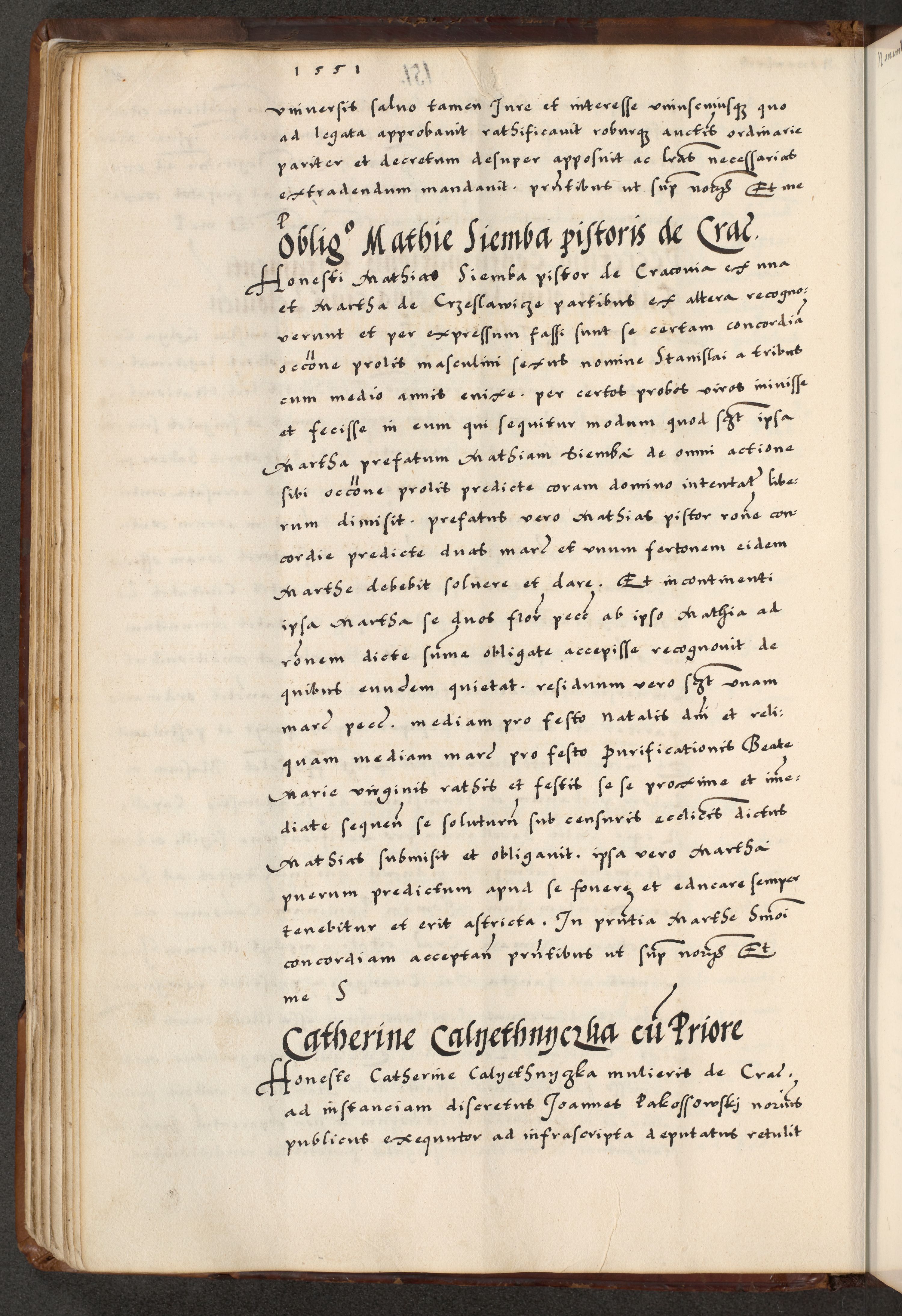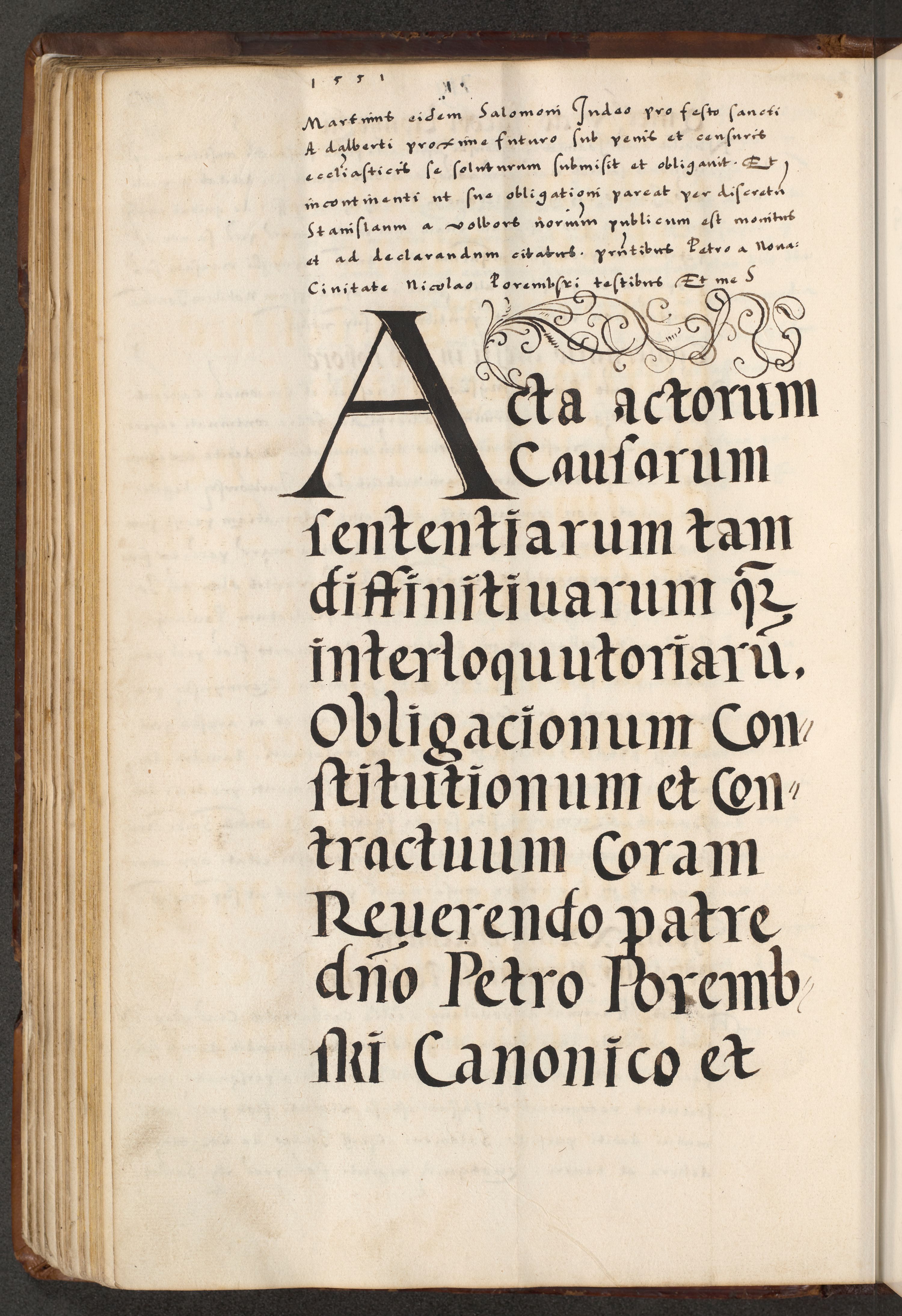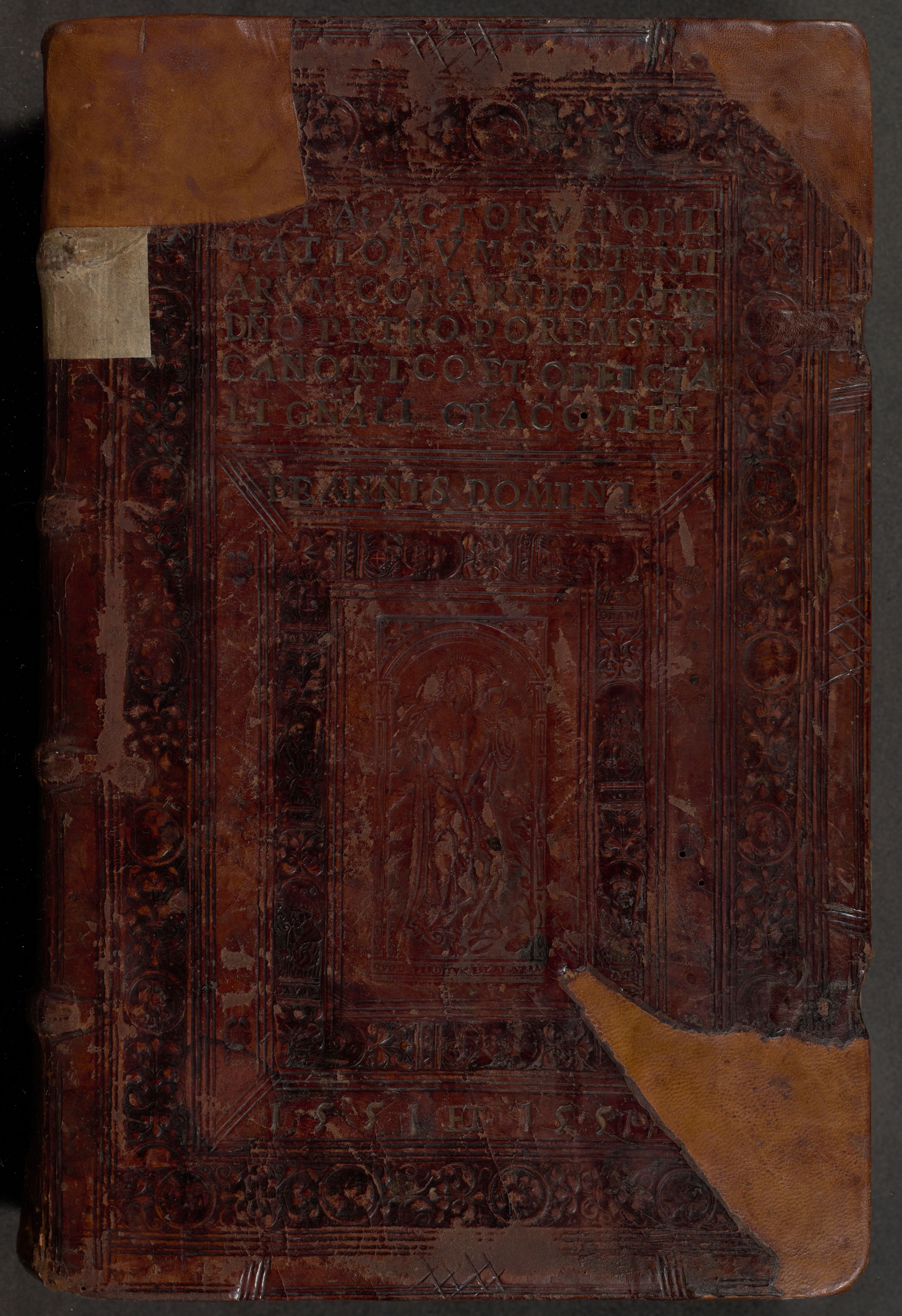 [A]cta actorum causarum, sententiarum tam diffinitivarum quam interloquutoriarum, obligationum, constitutionum et contractuum coram reverendo patre domino Petro Porembski preposito Osvieczimensi, canonico et officiali generali Cracoviensi de anno Domini millesimo quingentesimo quinguagesimo primo, cuius indictio est nona, pontificatus sanctissimi in Christo patris et domini nostri domini Juliii divina providencia pape tercii, anno secundo, a die et mense infrascriptis feliciter continiantur