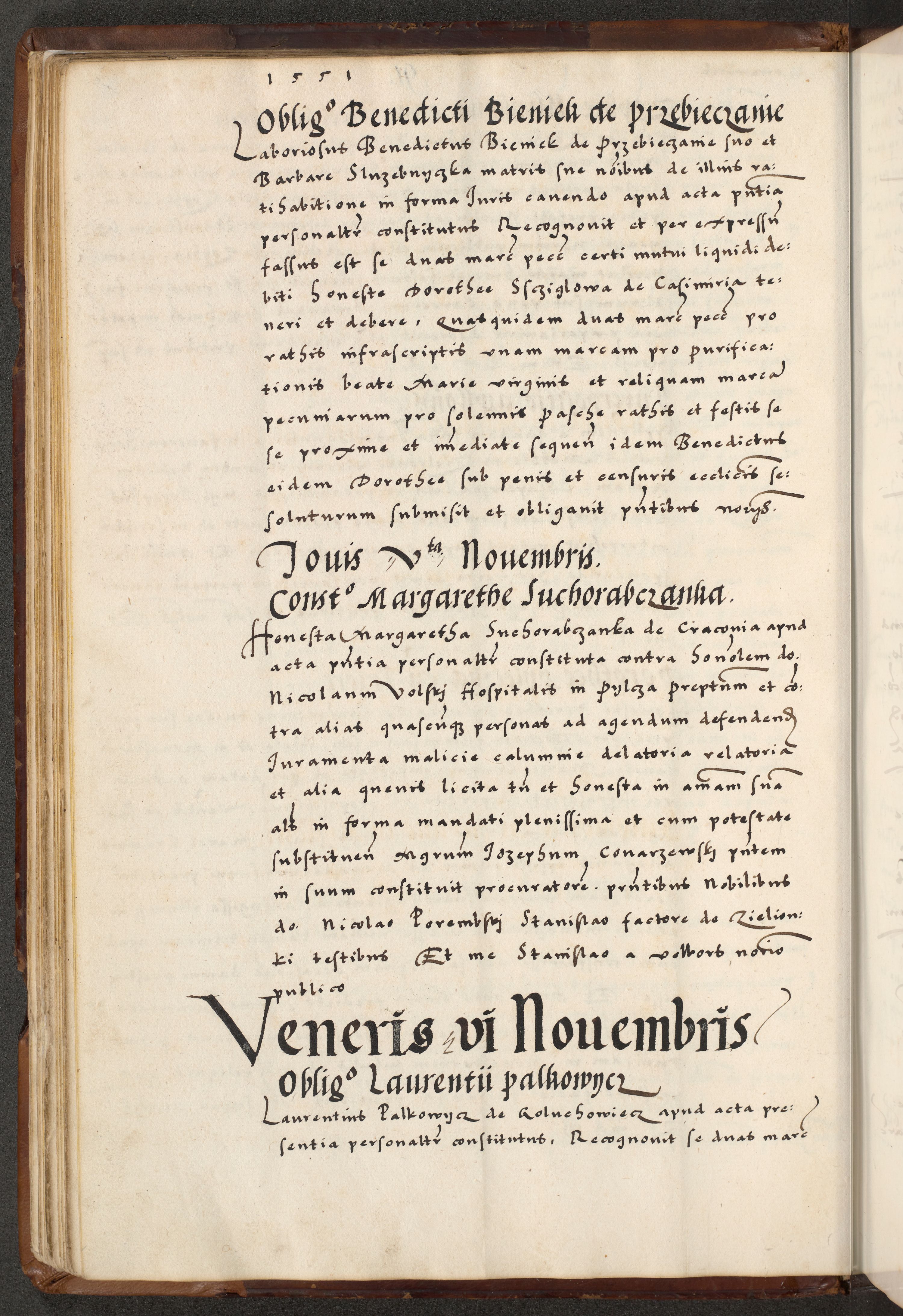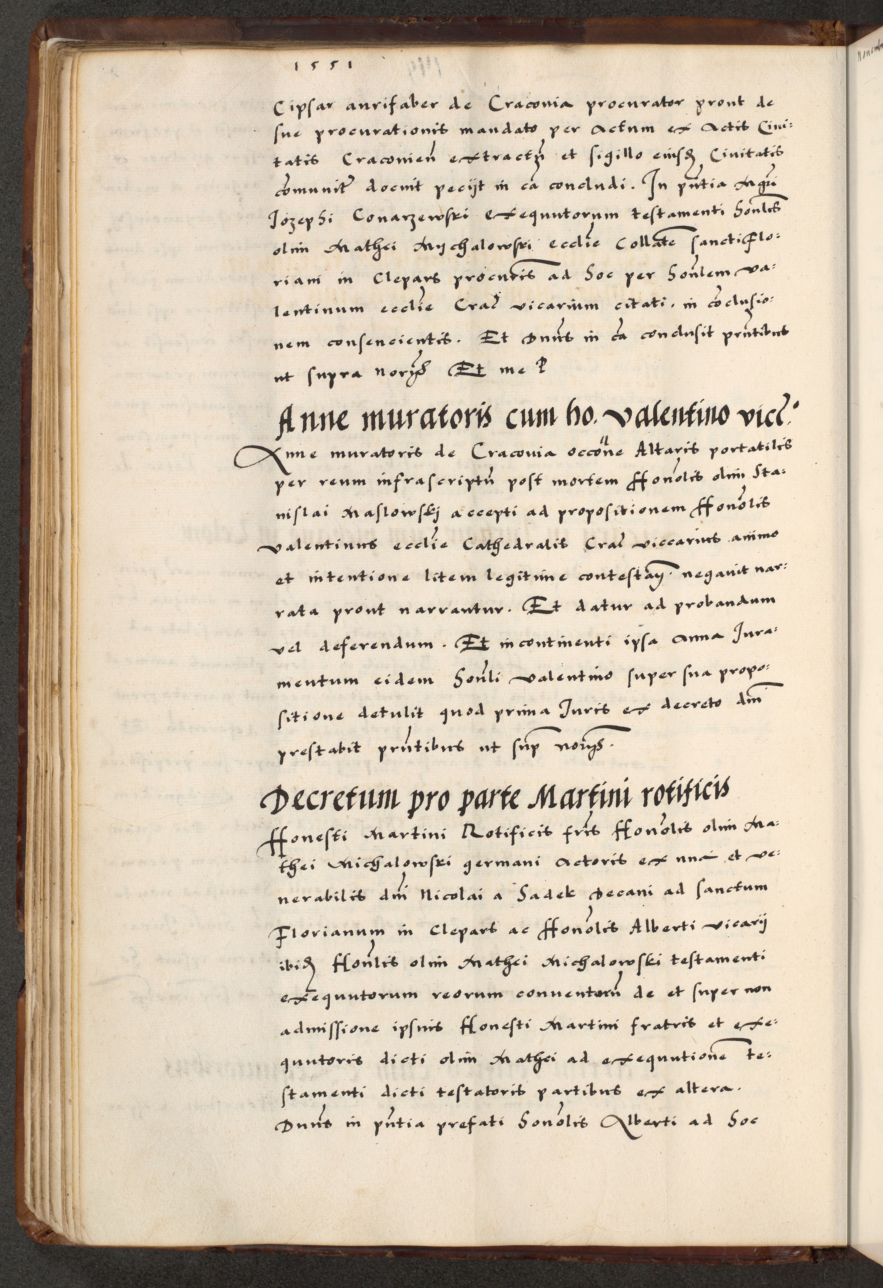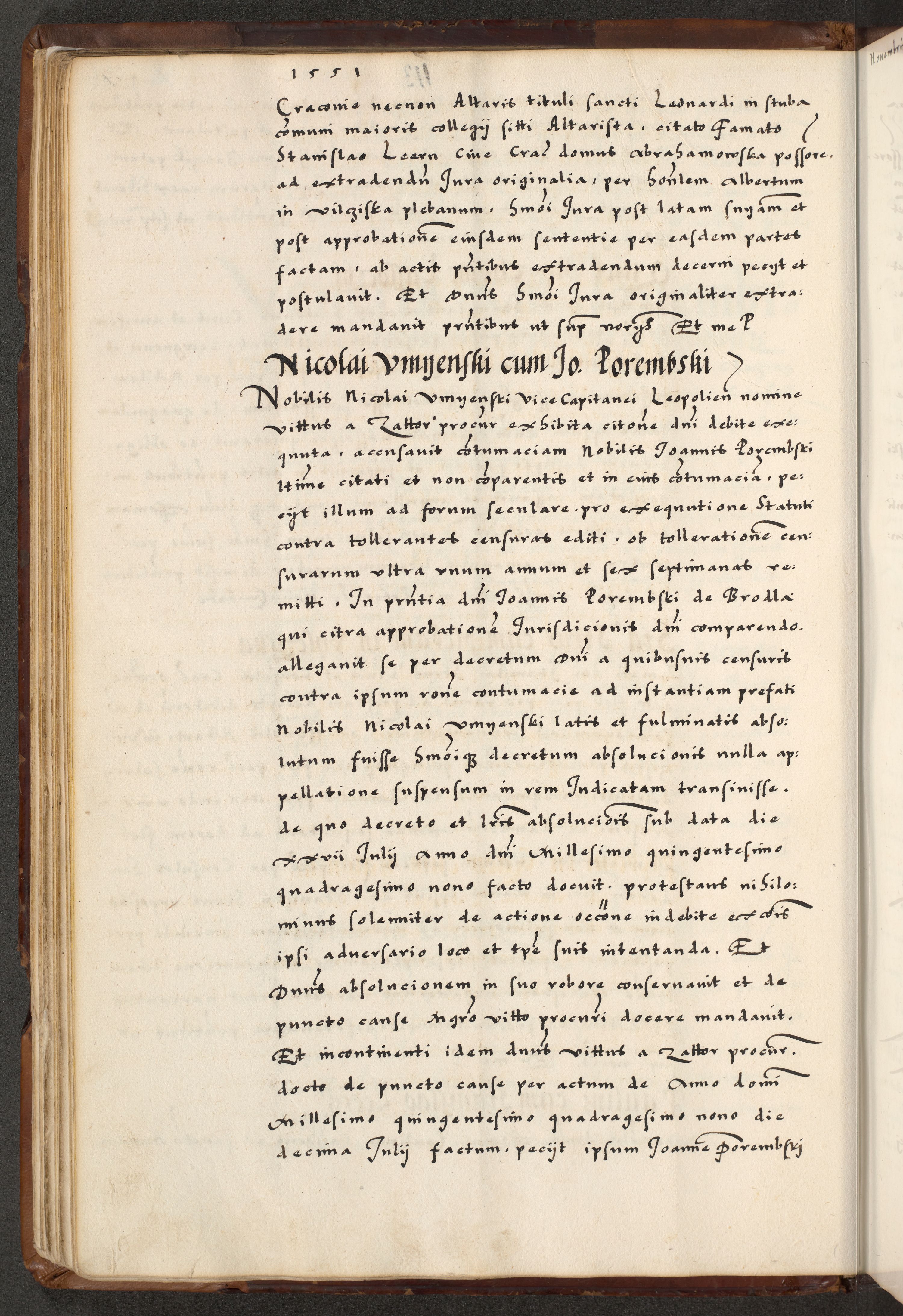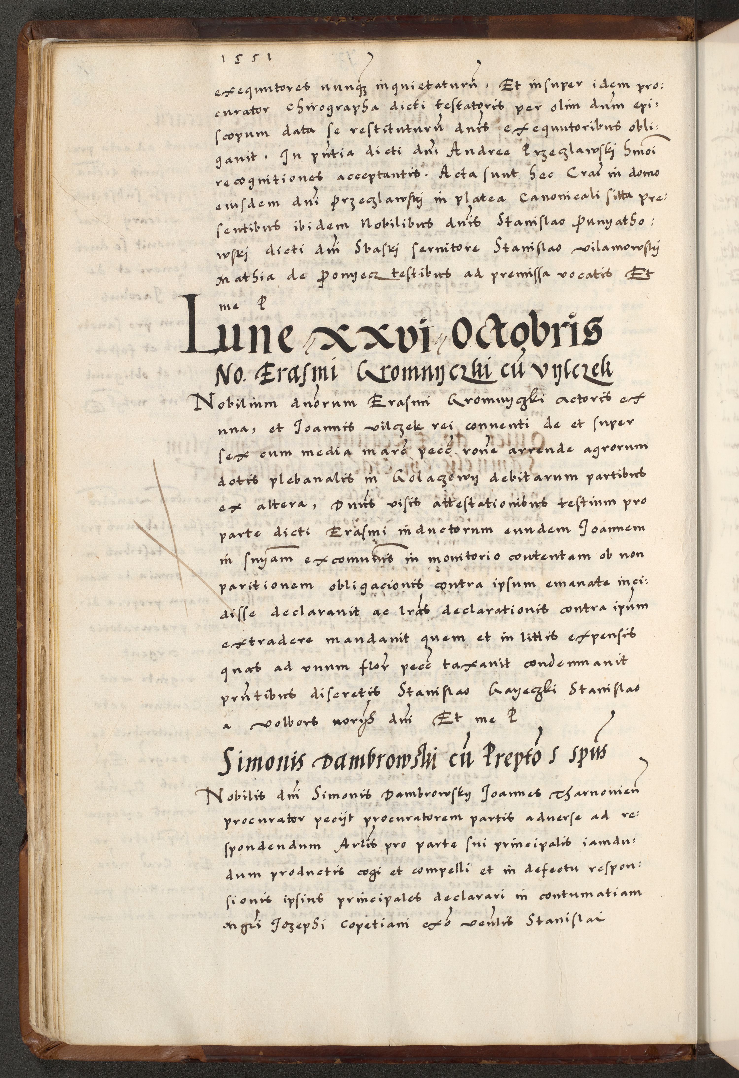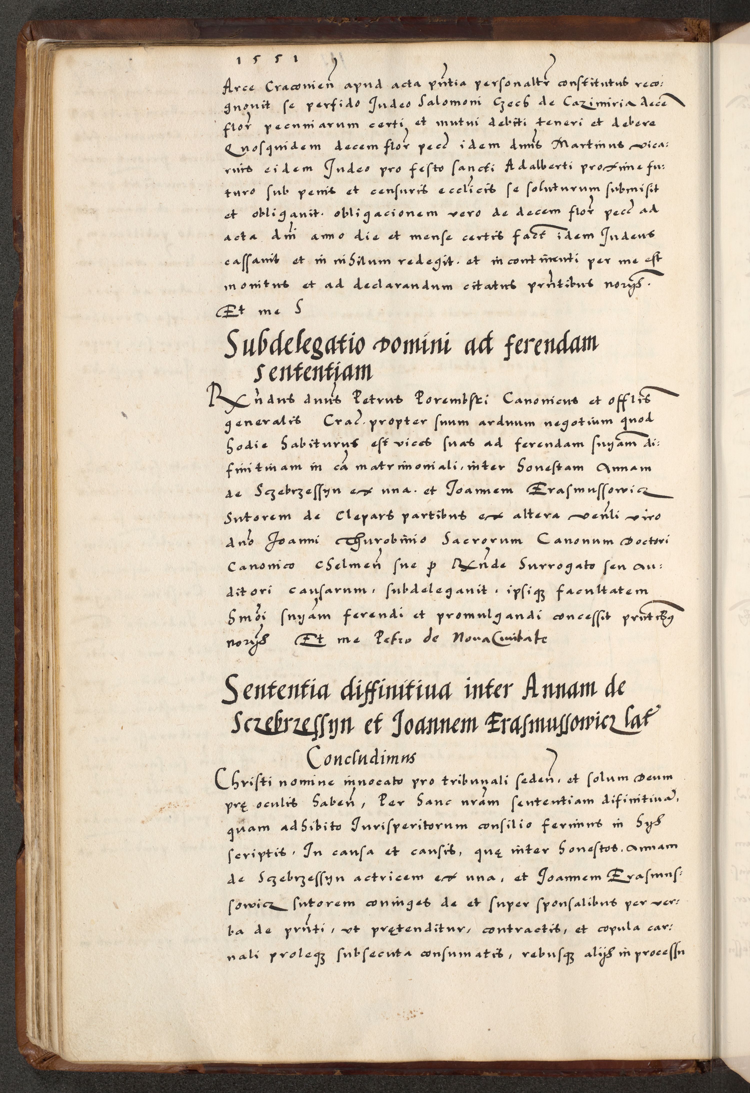 [A]cta actorum causarum, sententiarum tam diffinitivarum quam interloquutoriarum, obligationum, constitutionum et contractuum coram reverendo patre domino Petro Porembski preposito Osvieczimensi, canonico et officiali generali Cracoviensi de anno Domini millesimo quingentesimo quinguagesimo primo, cuius indictio est nona, pontificatus sanctissimi in Christo patris et domini nostri domini Juliii divina providencia pape tercii, anno secundo, a die et mense infrascriptis feliciter continiantur