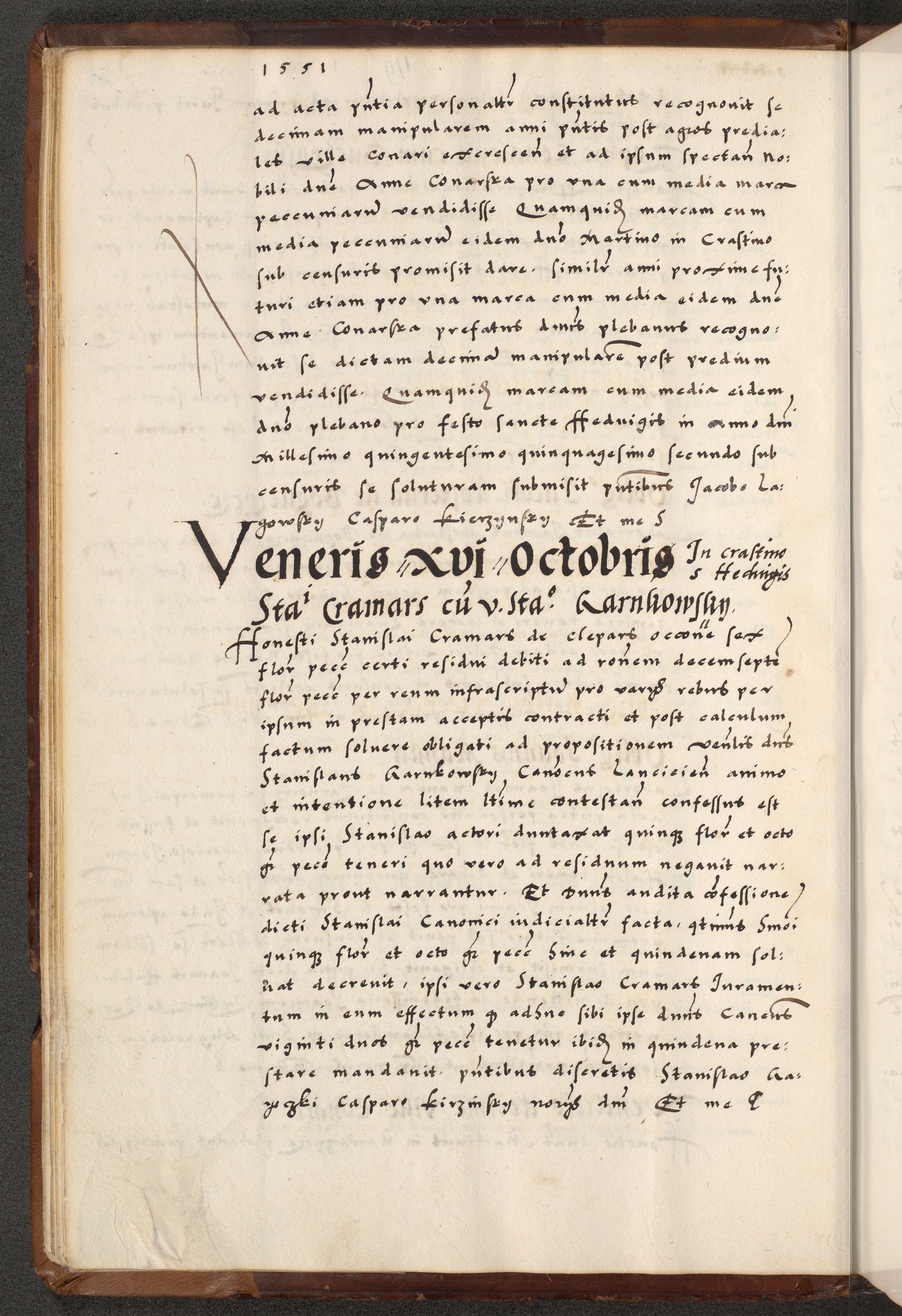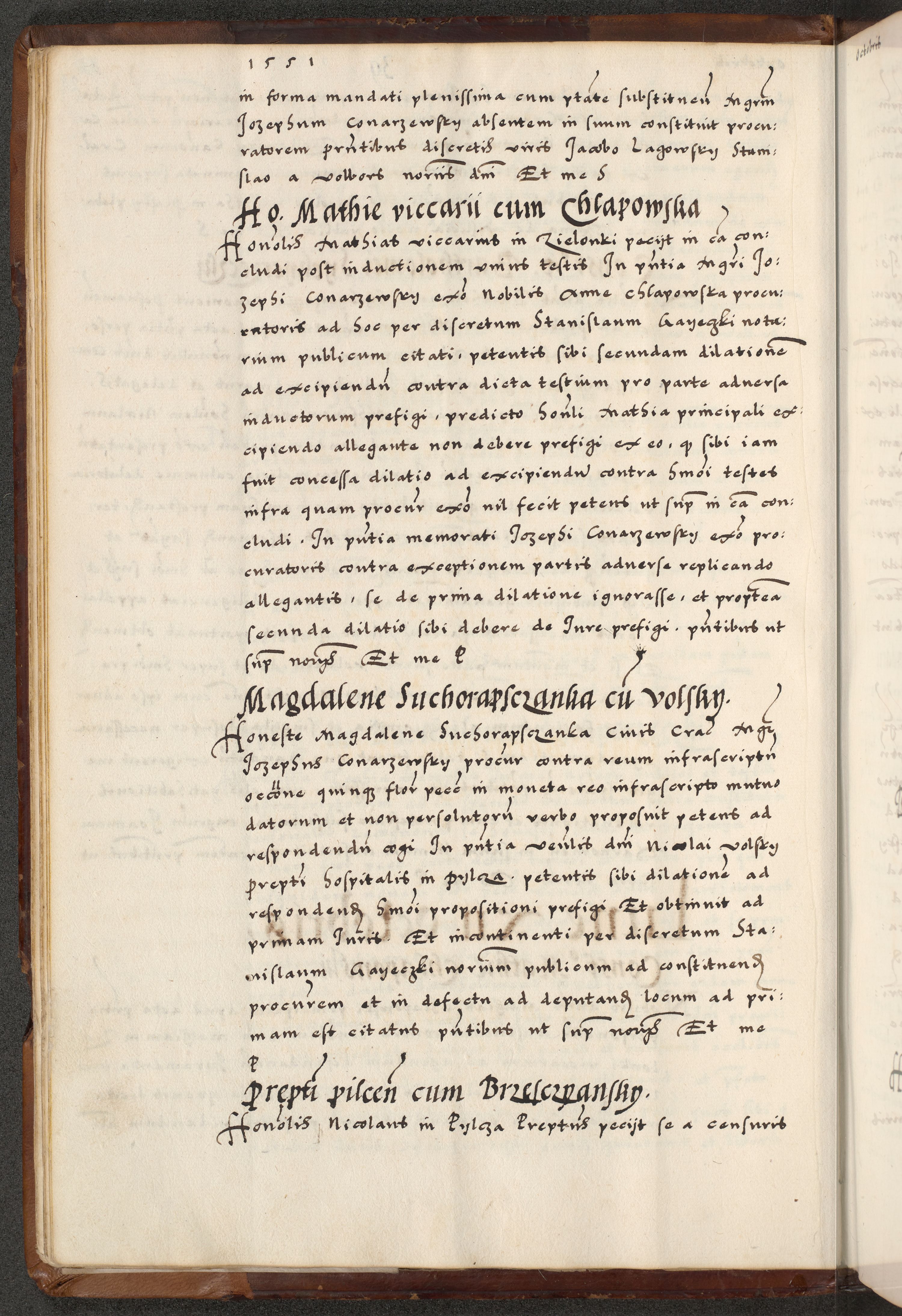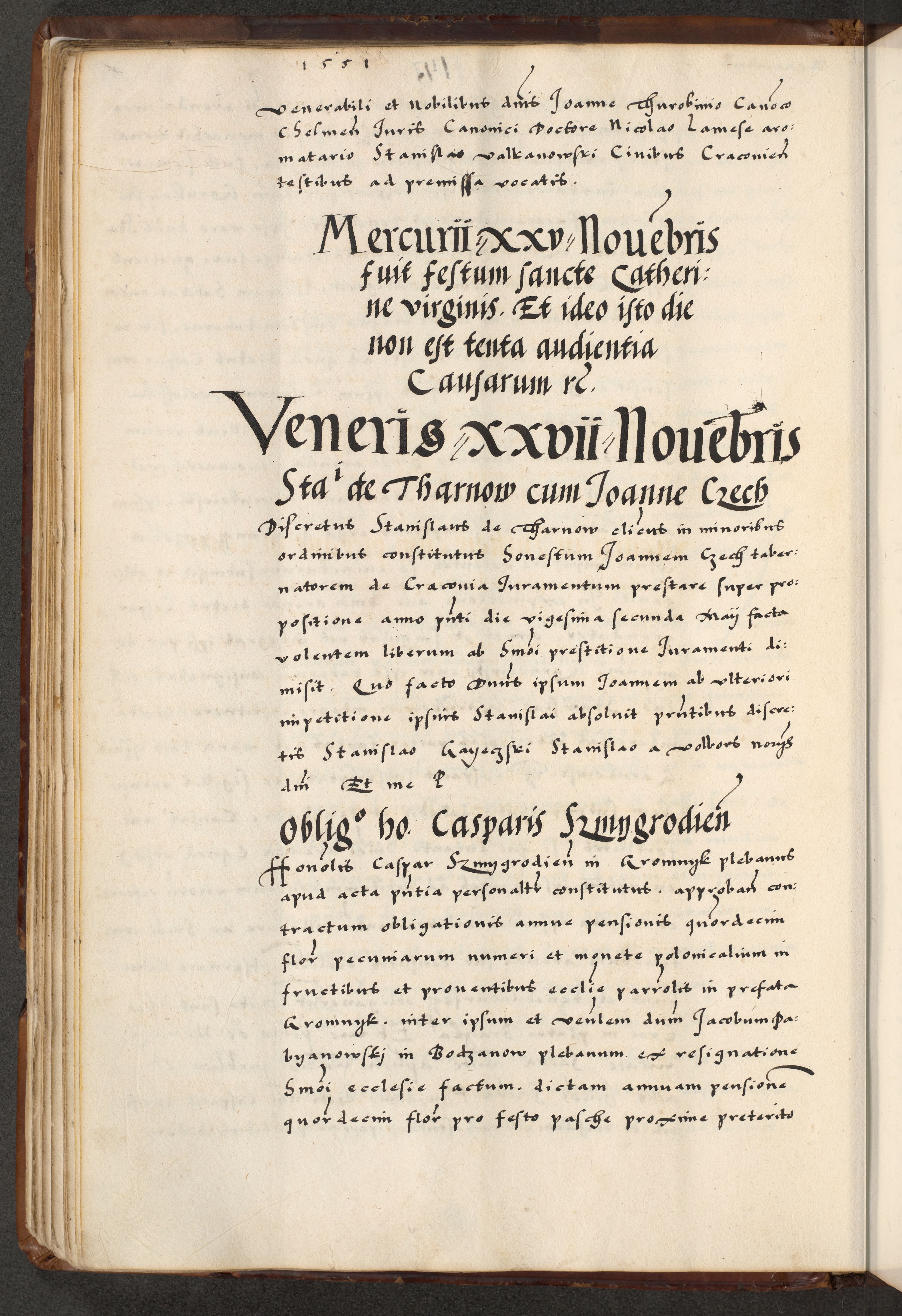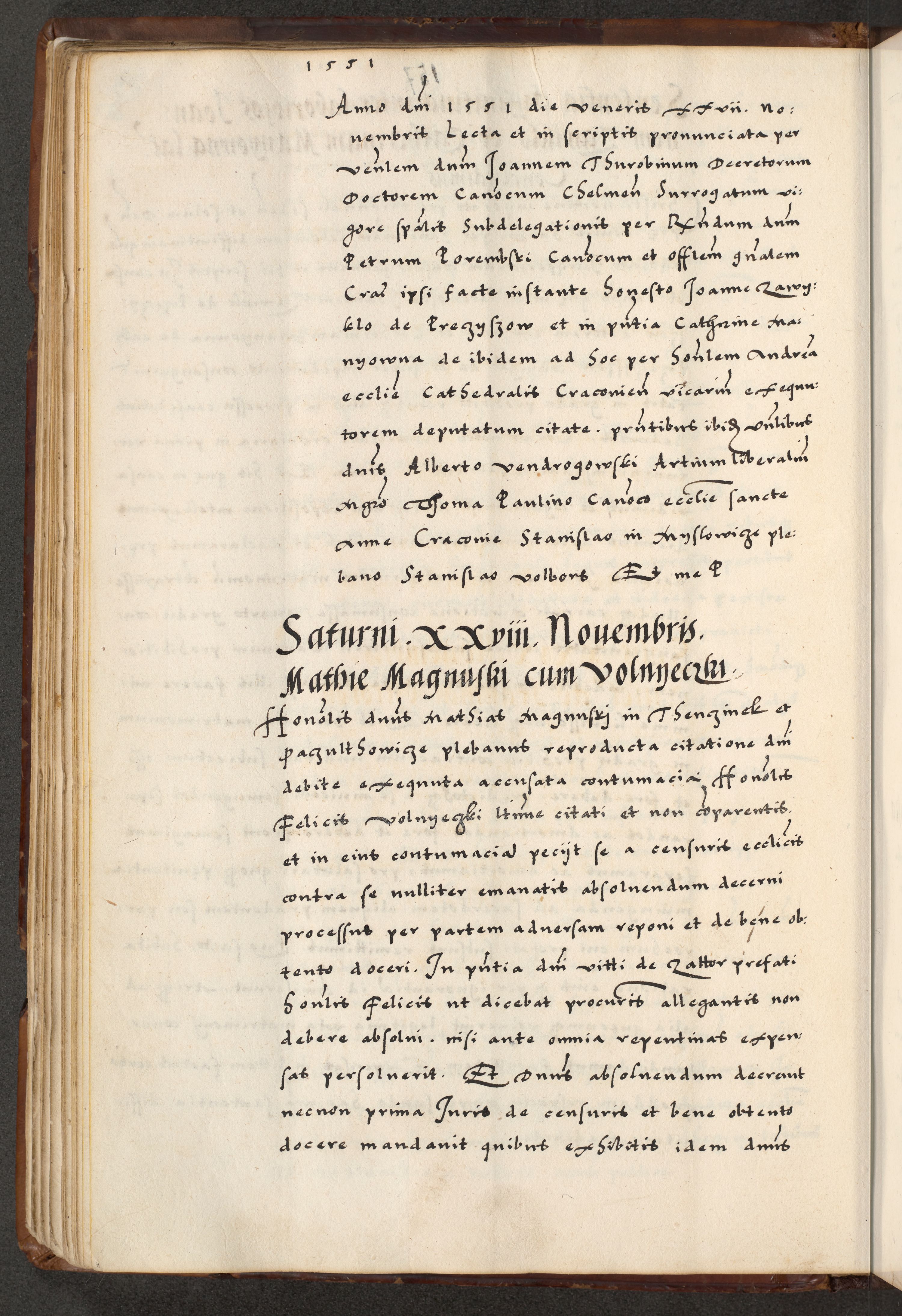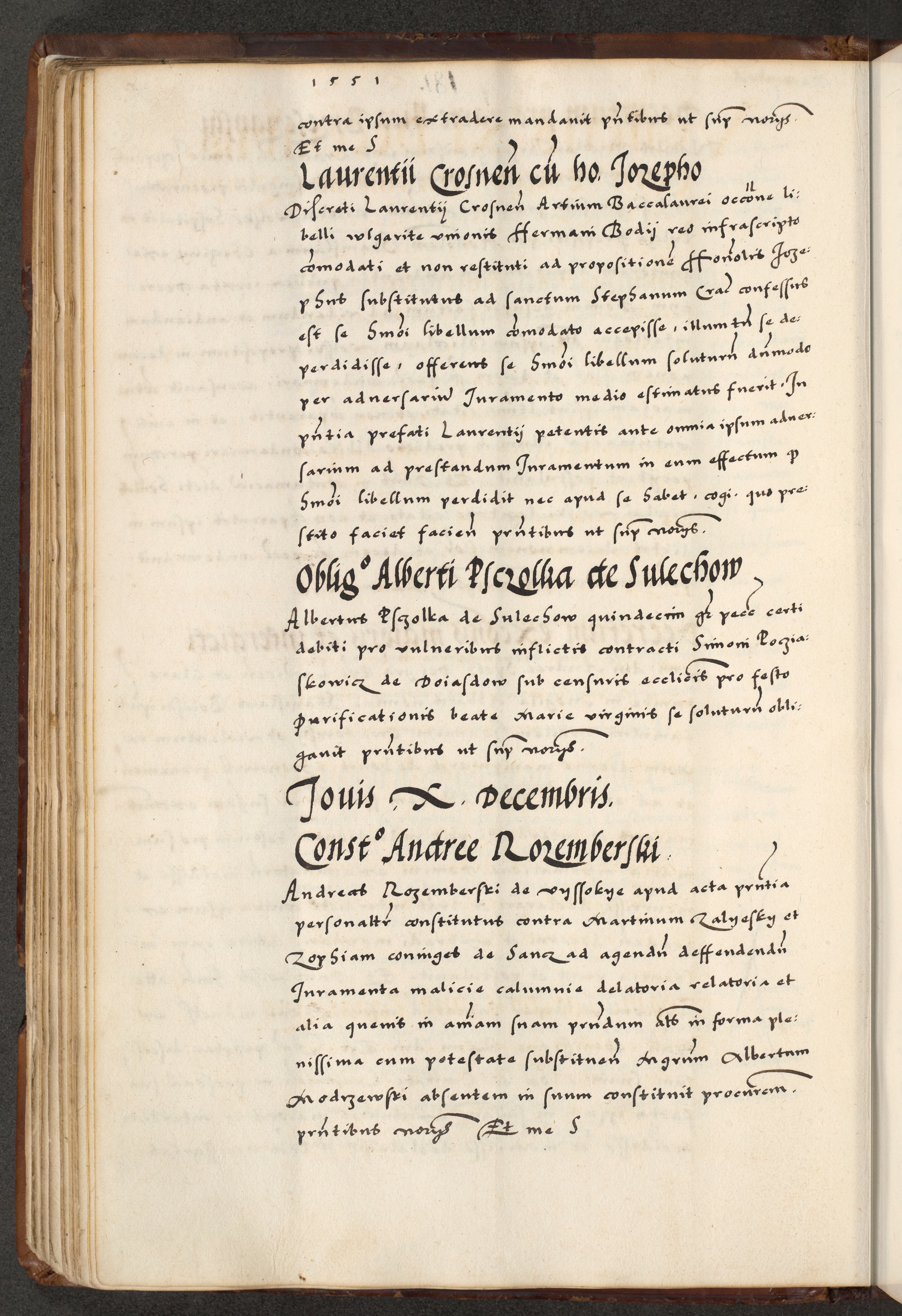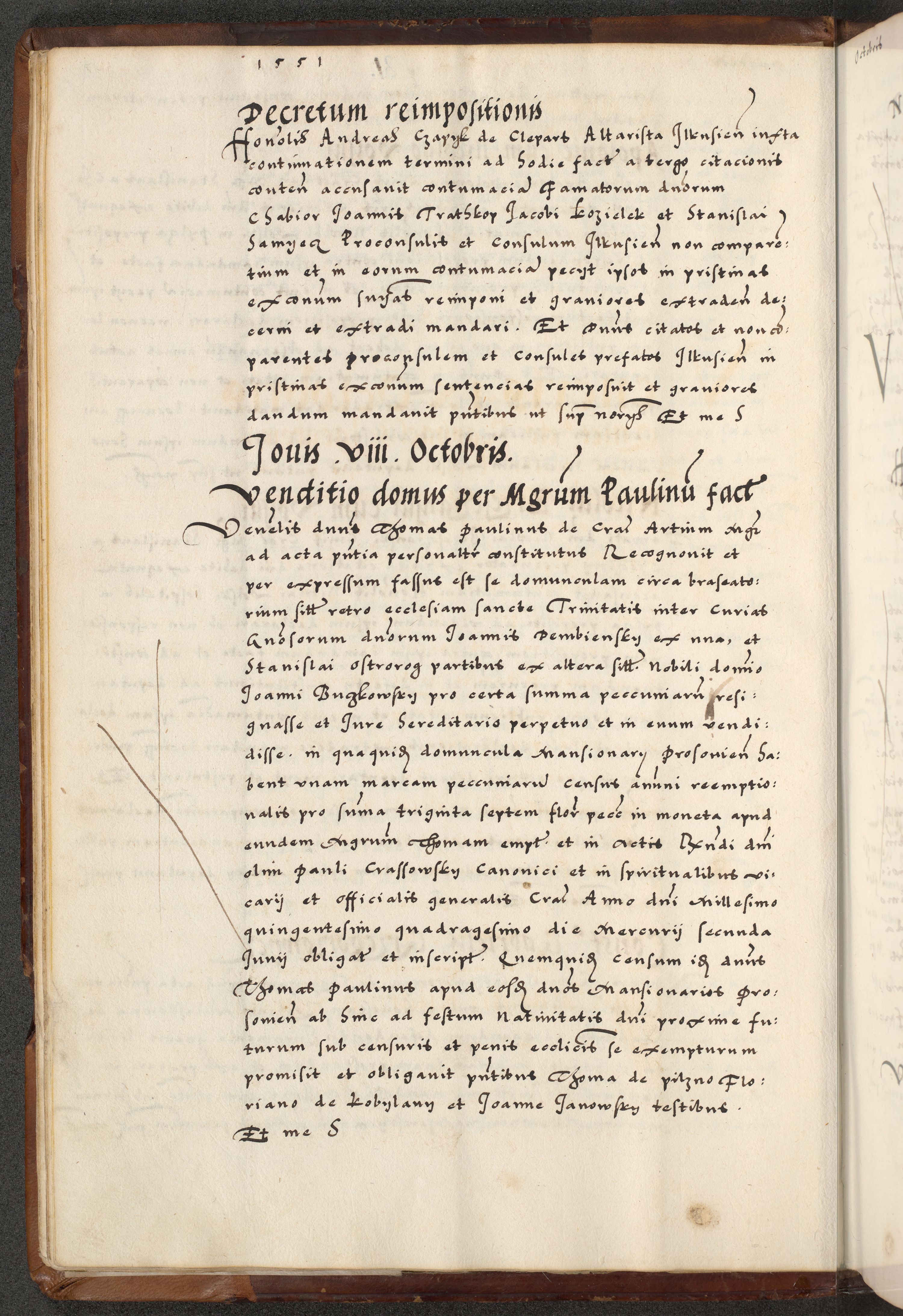 [A]cta actorum causarum, sententiarum tam diffinitivarum quam interloquutoriarum, obligationum, constitutionum et contractuum coram reverendo patre domino Petro Porembski preposito Osvieczimensi, canonico et officiali generali Cracoviensi de anno Domini millesimo quingentesimo quinguagesimo primo, cuius indictio est nona, pontificatus sanctissimi in Christo patris et domini nostri domini Juliii divina providencia pape tercii, anno secundo, a die et mense infrascriptis feliciter continiantur