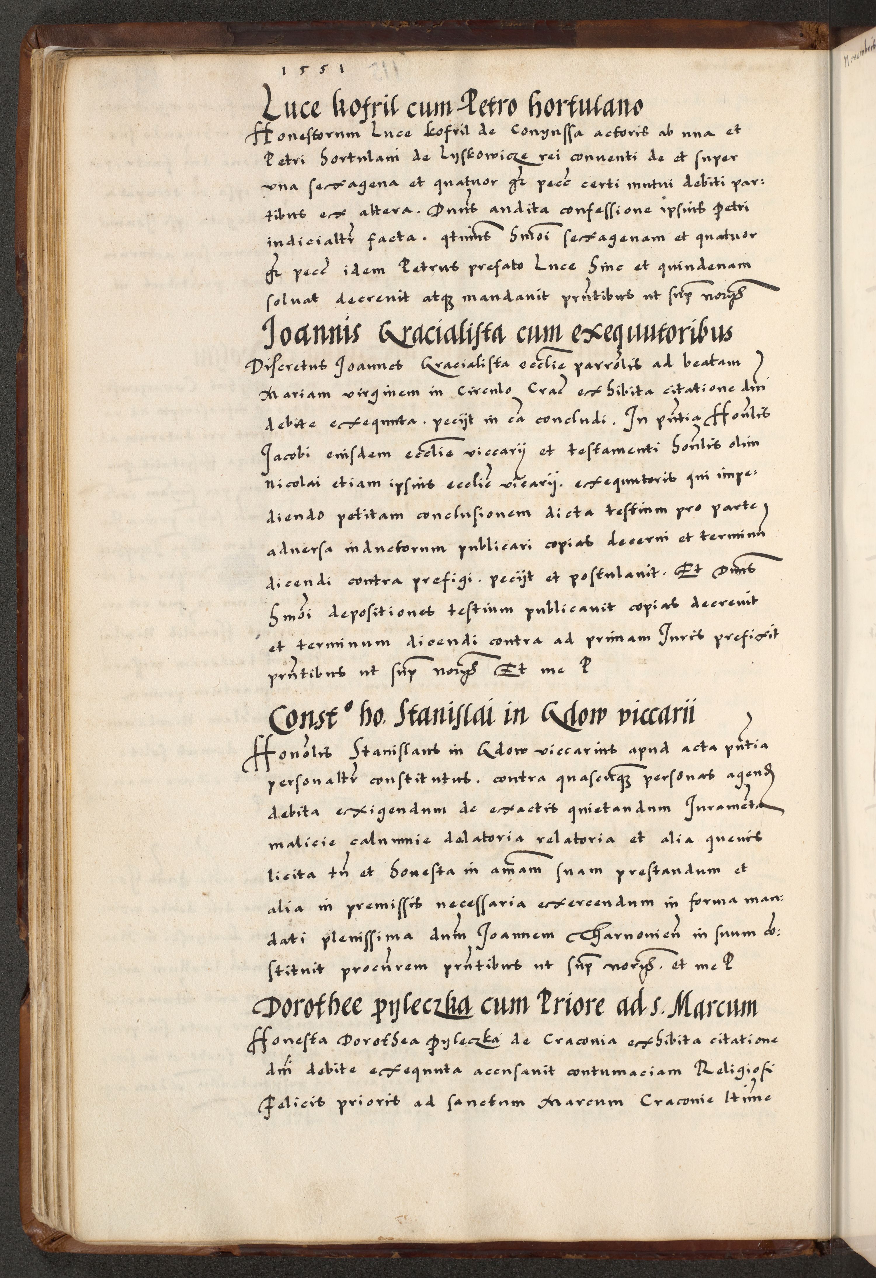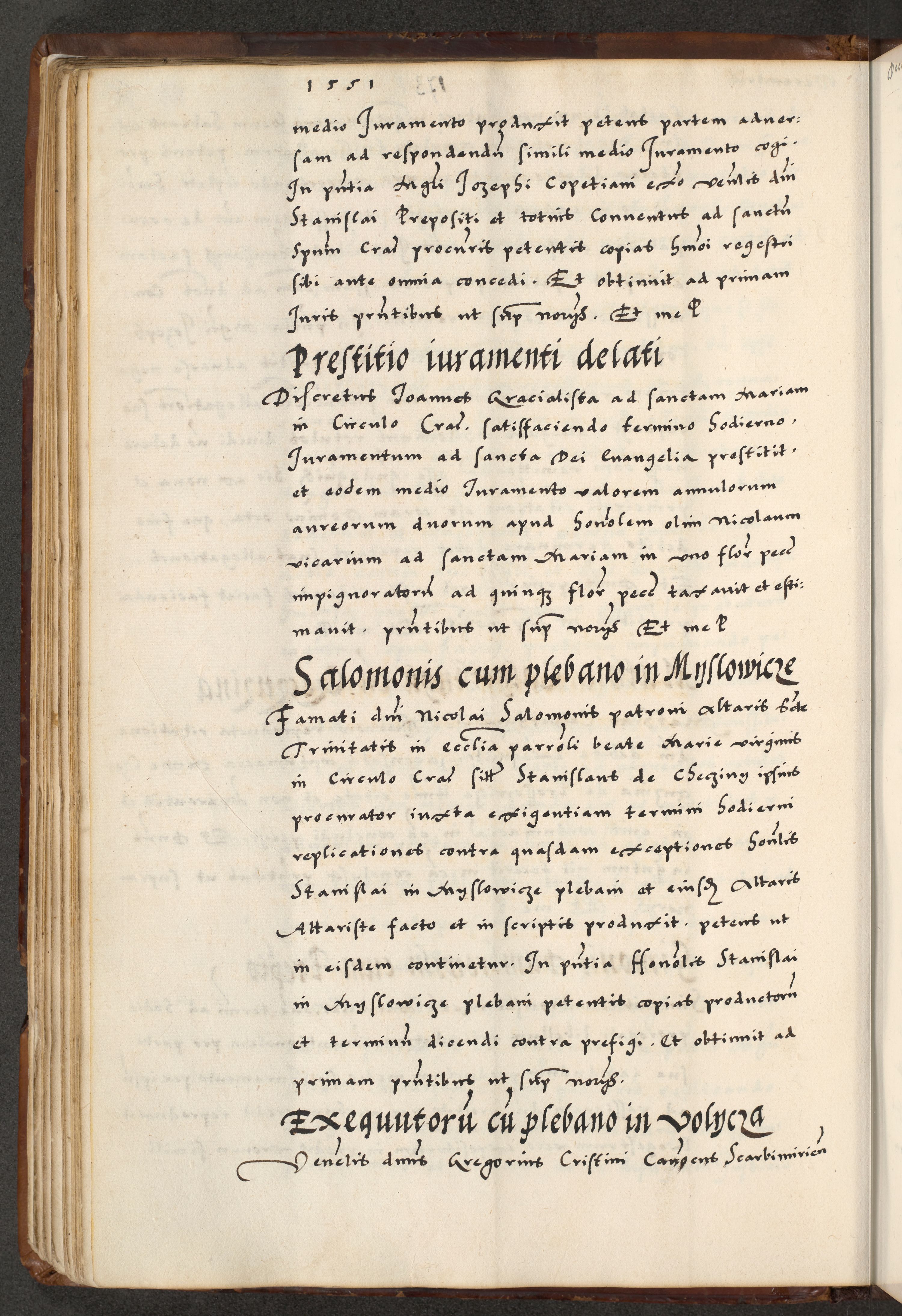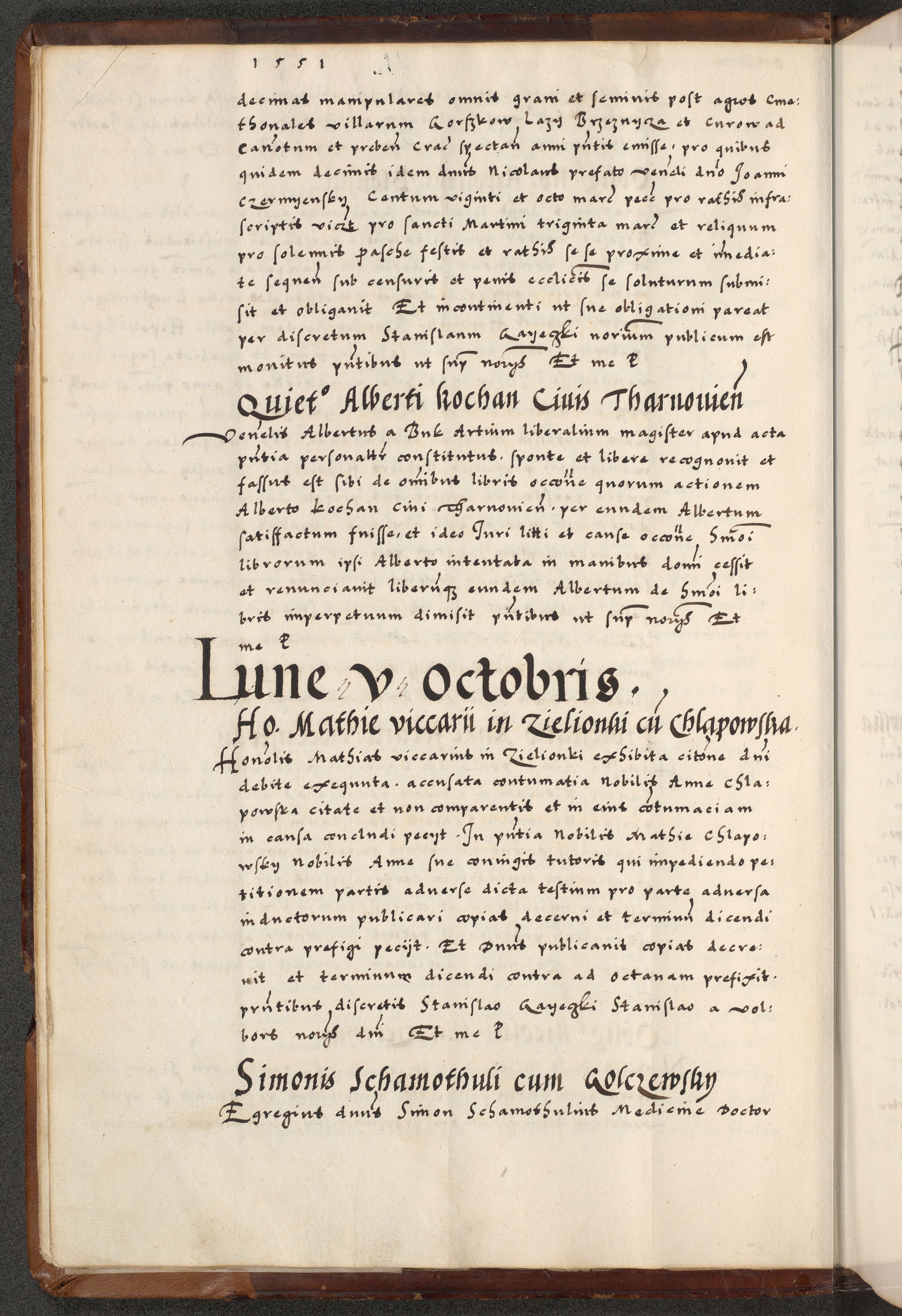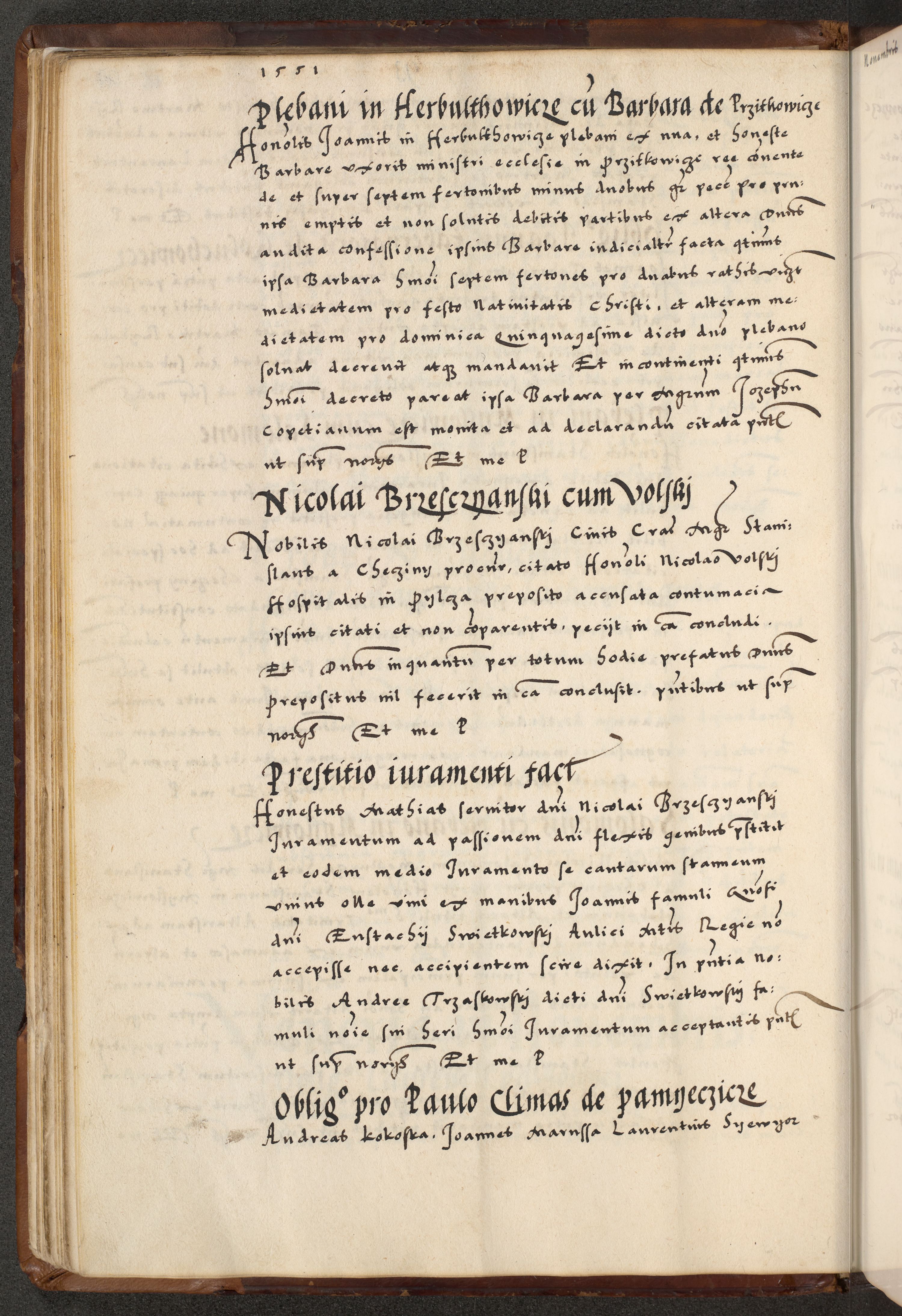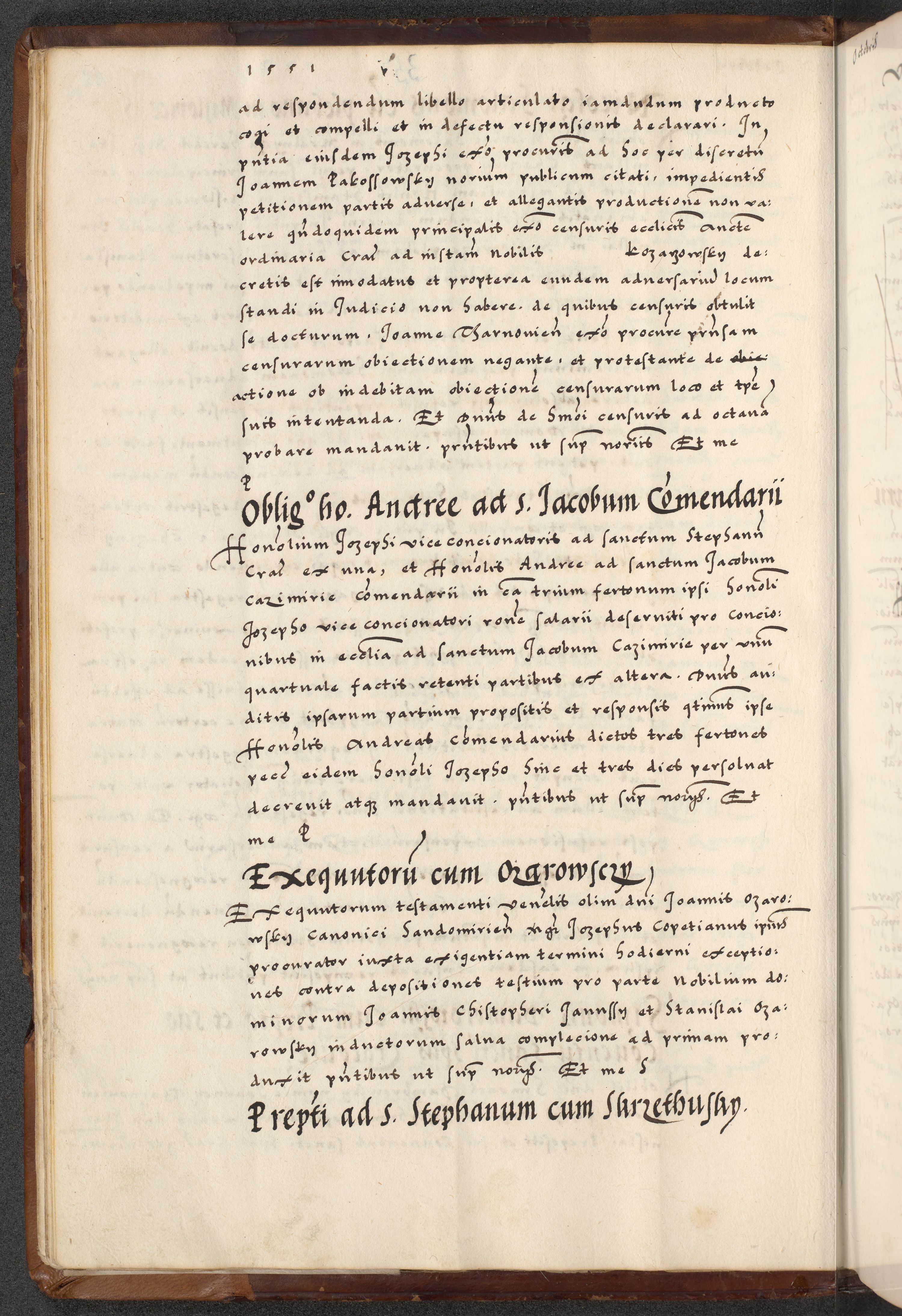 [A]cta actorum causarum, sententiarum tam diffinitivarum quam interloquutoriarum, obligationum, constitutionum et contractuum coram reverendo patre domino Petro Porembski preposito Osvieczimensi, canonico et officiali generali Cracoviensi de anno Domini millesimo quingentesimo quinguagesimo primo, cuius indictio est nona, pontificatus sanctissimi in Christo patris et domini nostri domini Juliii divina providencia pape tercii, anno secundo, a die et mense infrascriptis feliciter continiantur