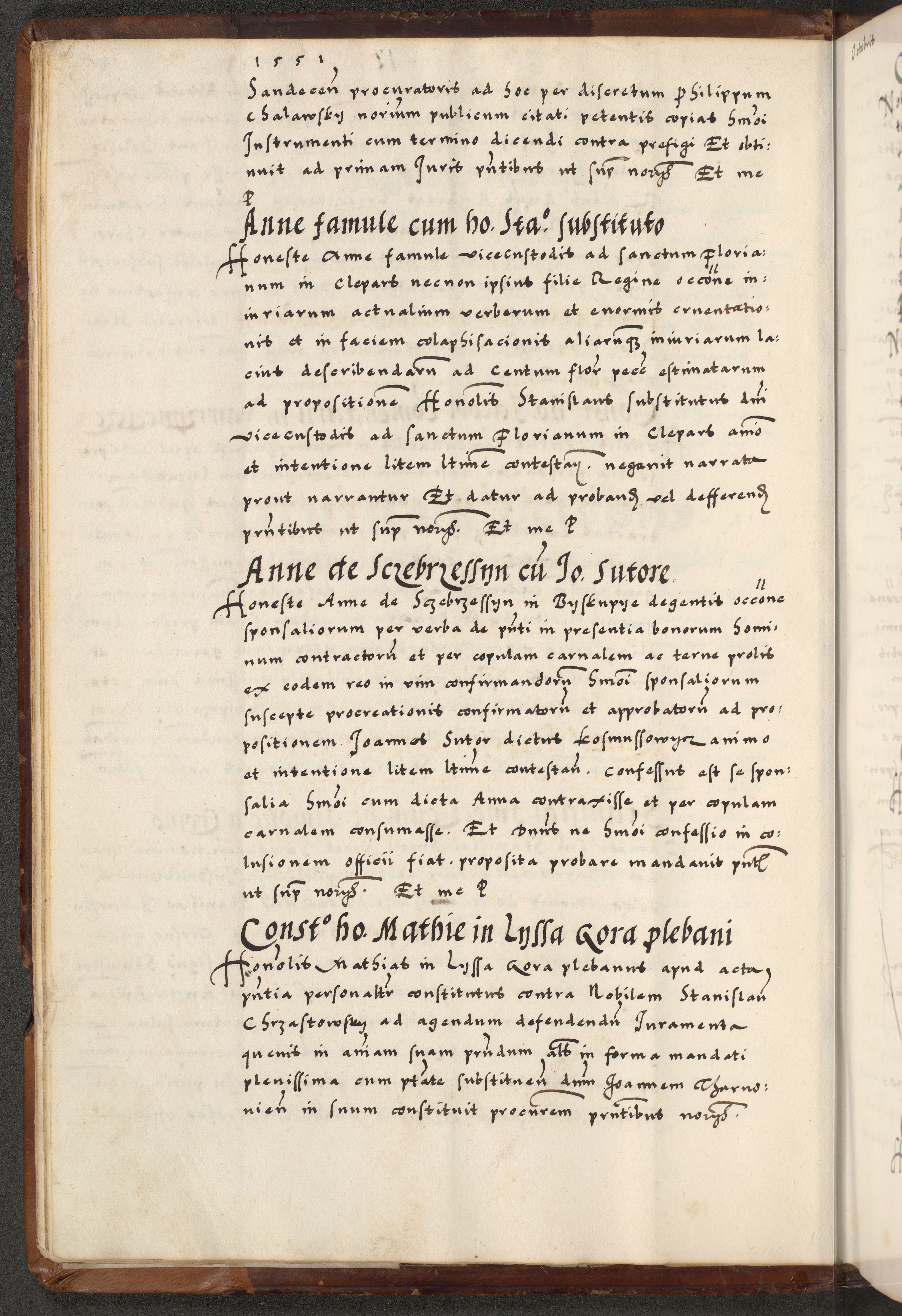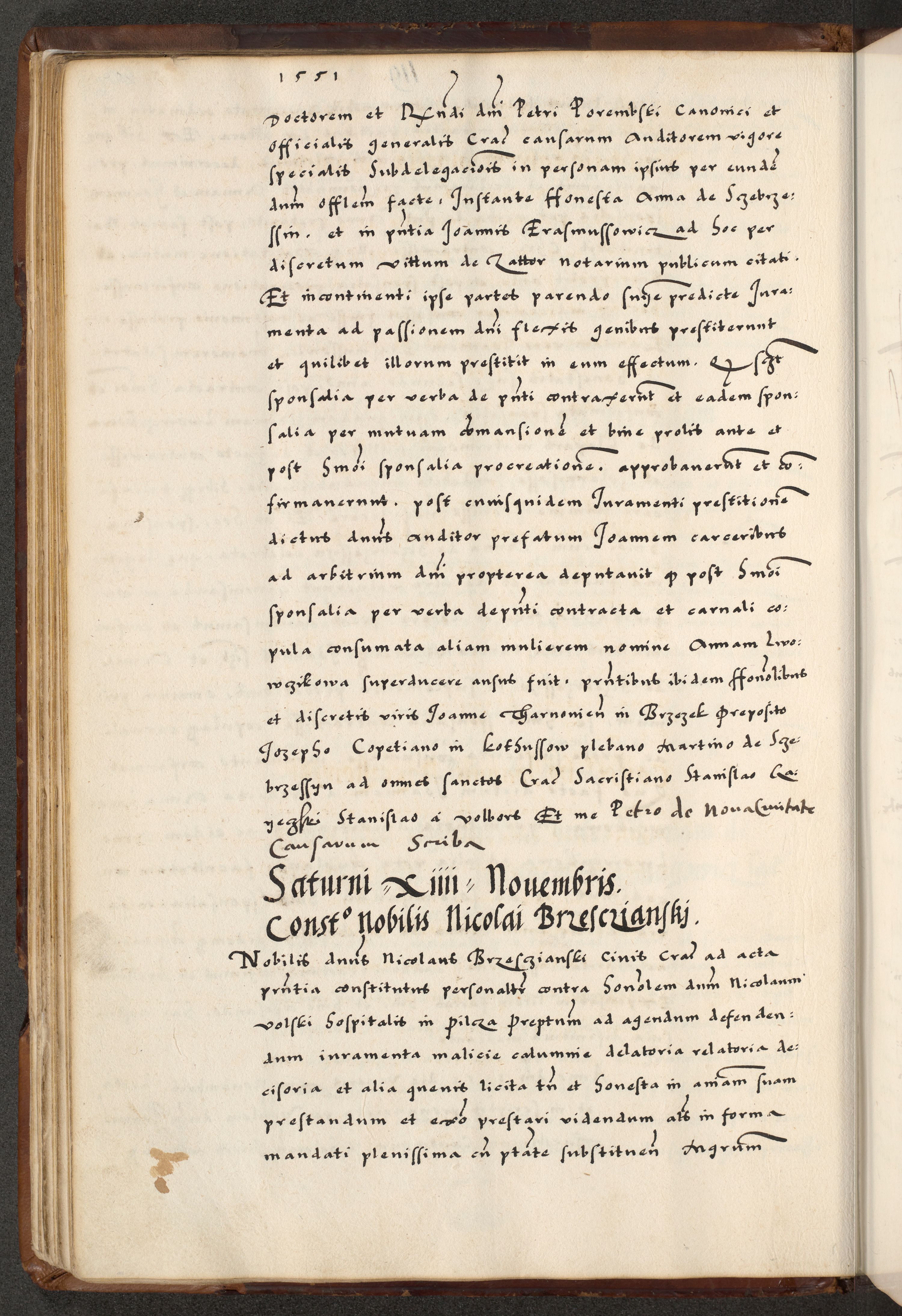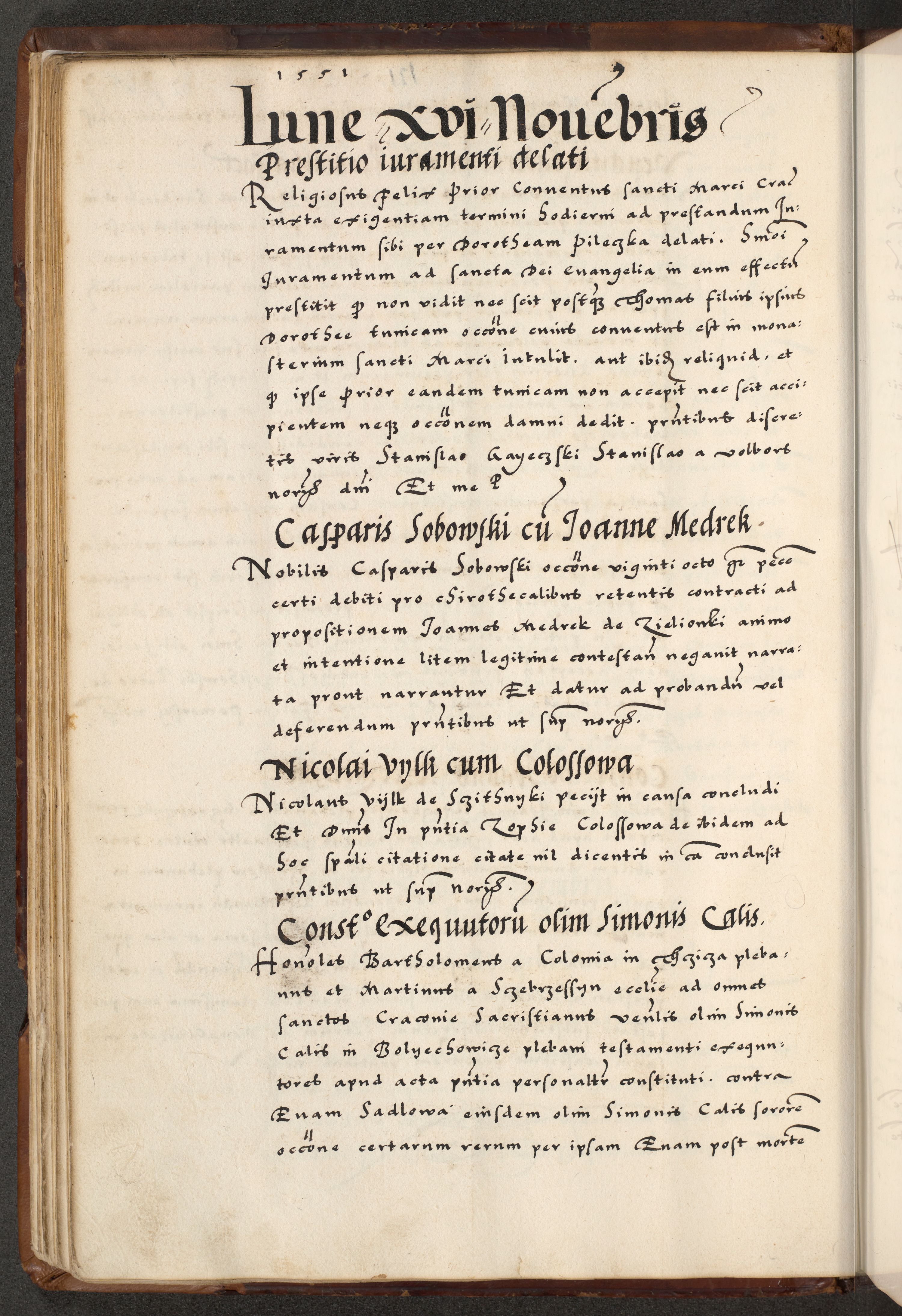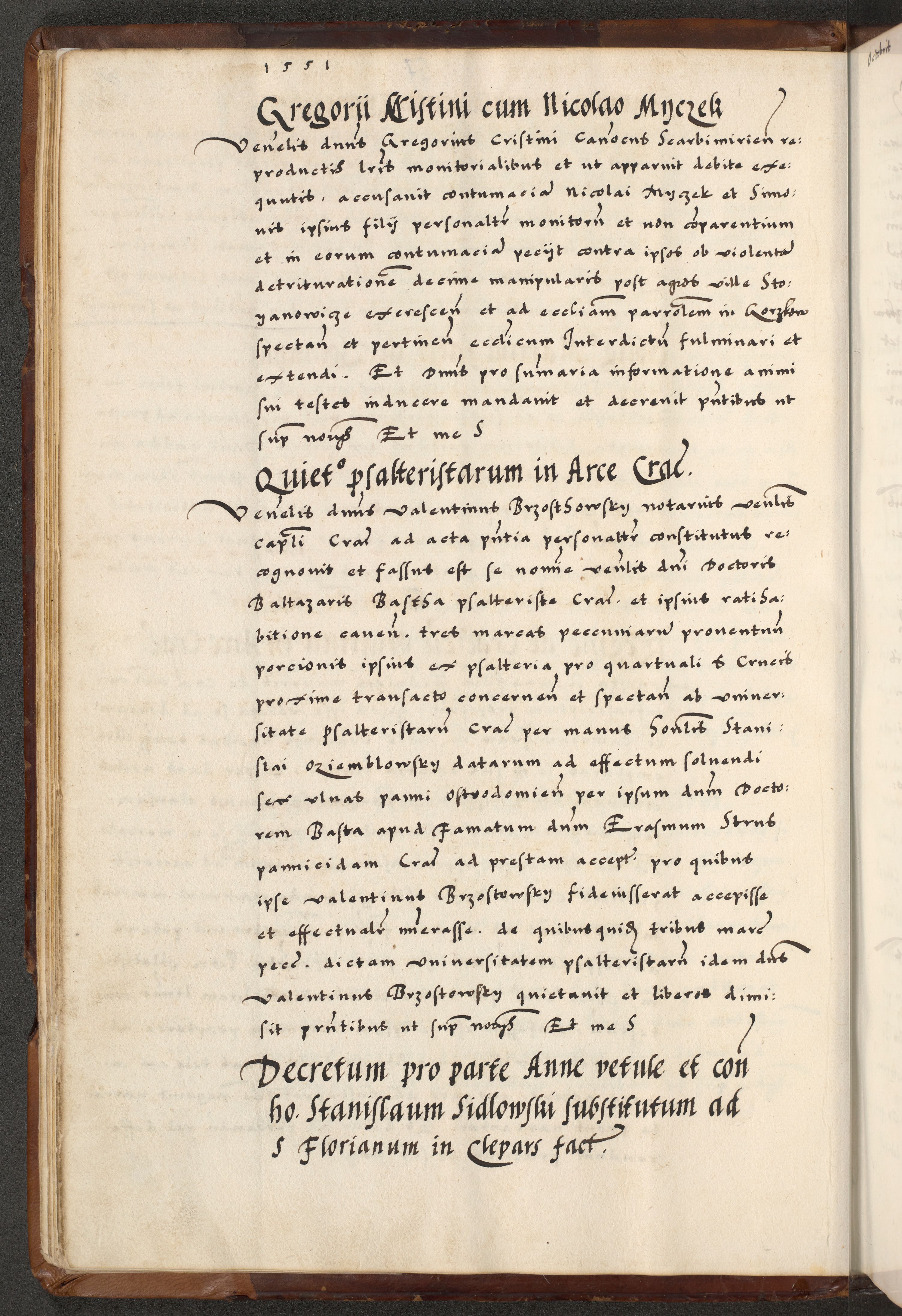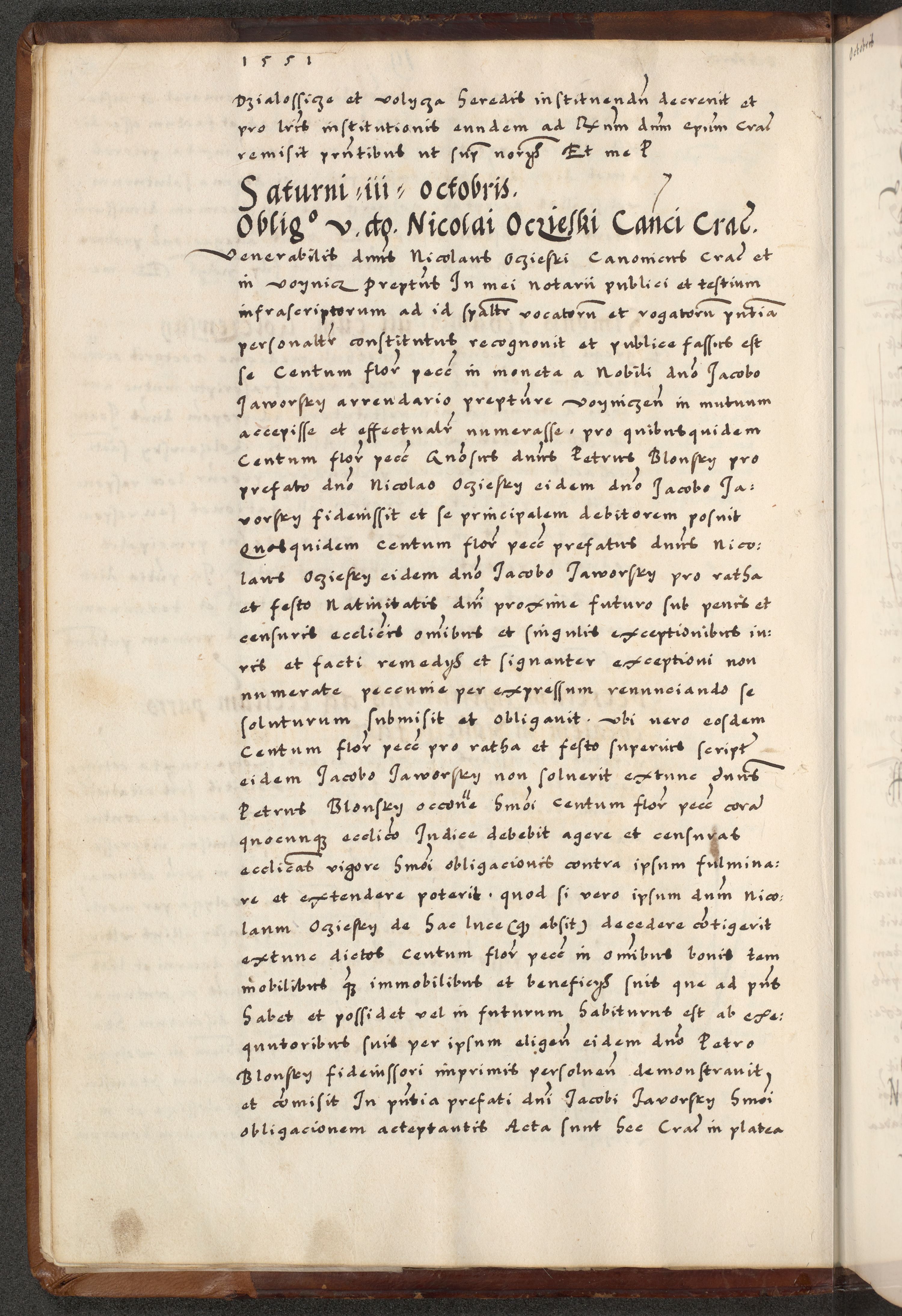 [A]cta actorum causarum, sententiarum tam diffinitivarum quam interloquutoriarum, obligationum, constitutionum et contractuum coram reverendo patre domino Petro Porembski preposito Osvieczimensi, canonico et officiali generali Cracoviensi de anno Domini millesimo quingentesimo quinguagesimo primo, cuius indictio est nona, pontificatus sanctissimi in Christo patris et domini nostri domini Juliii divina providencia pape tercii, anno secundo, a die et mense infrascriptis feliciter continiantur