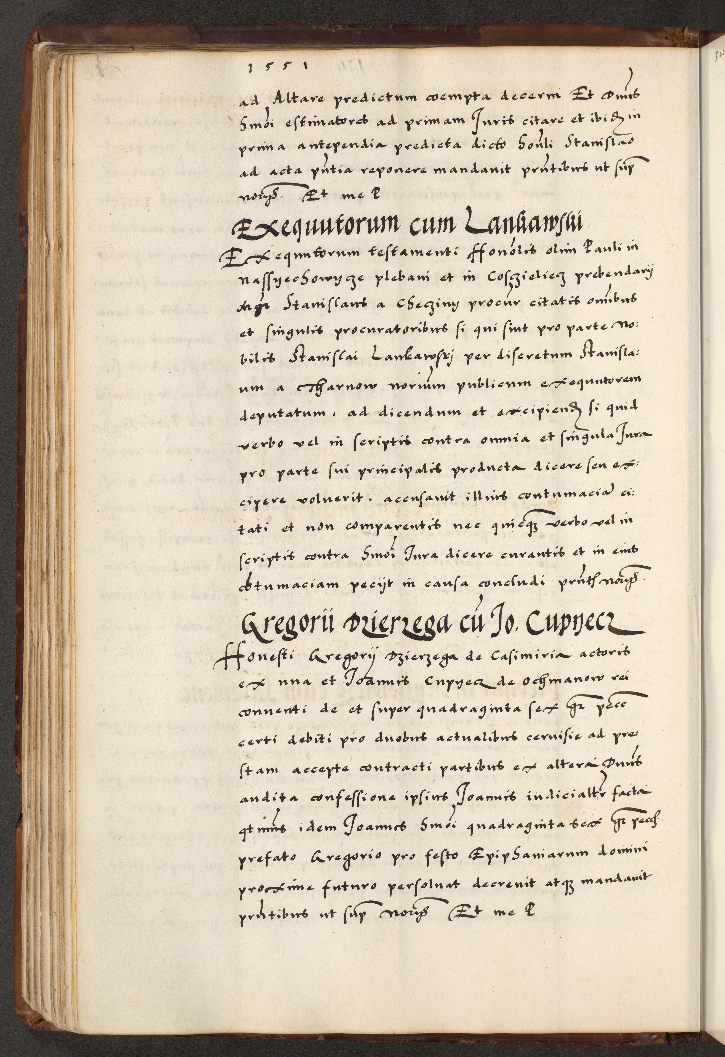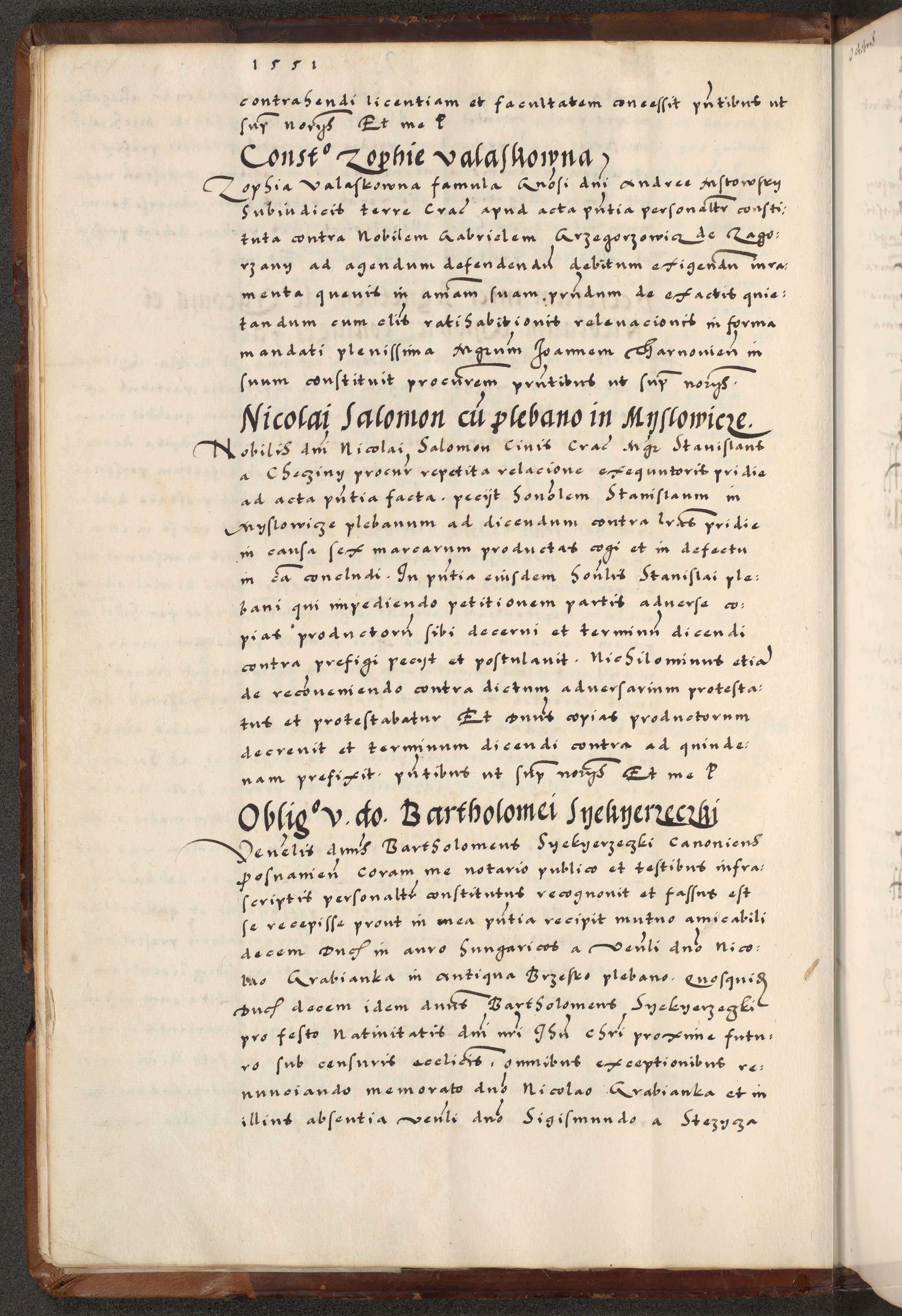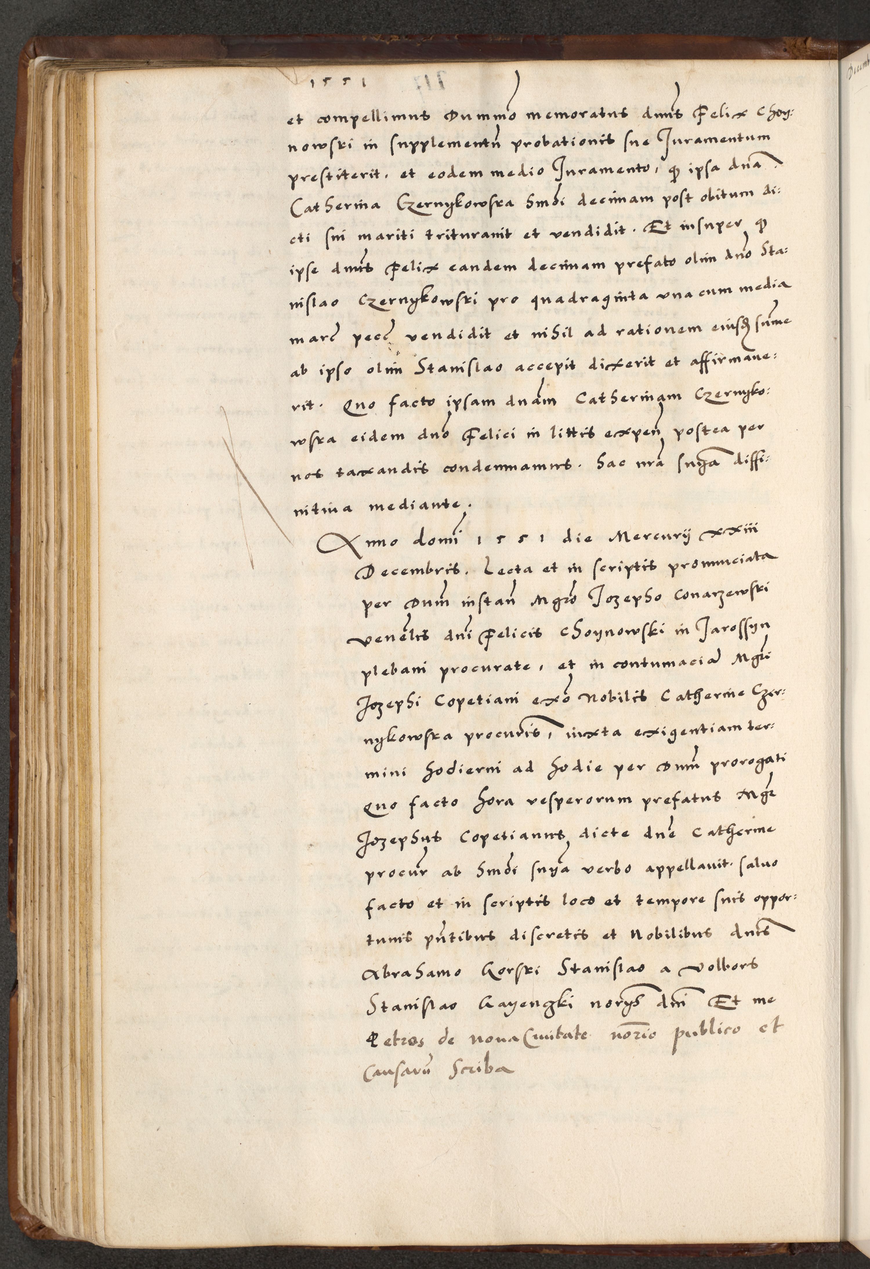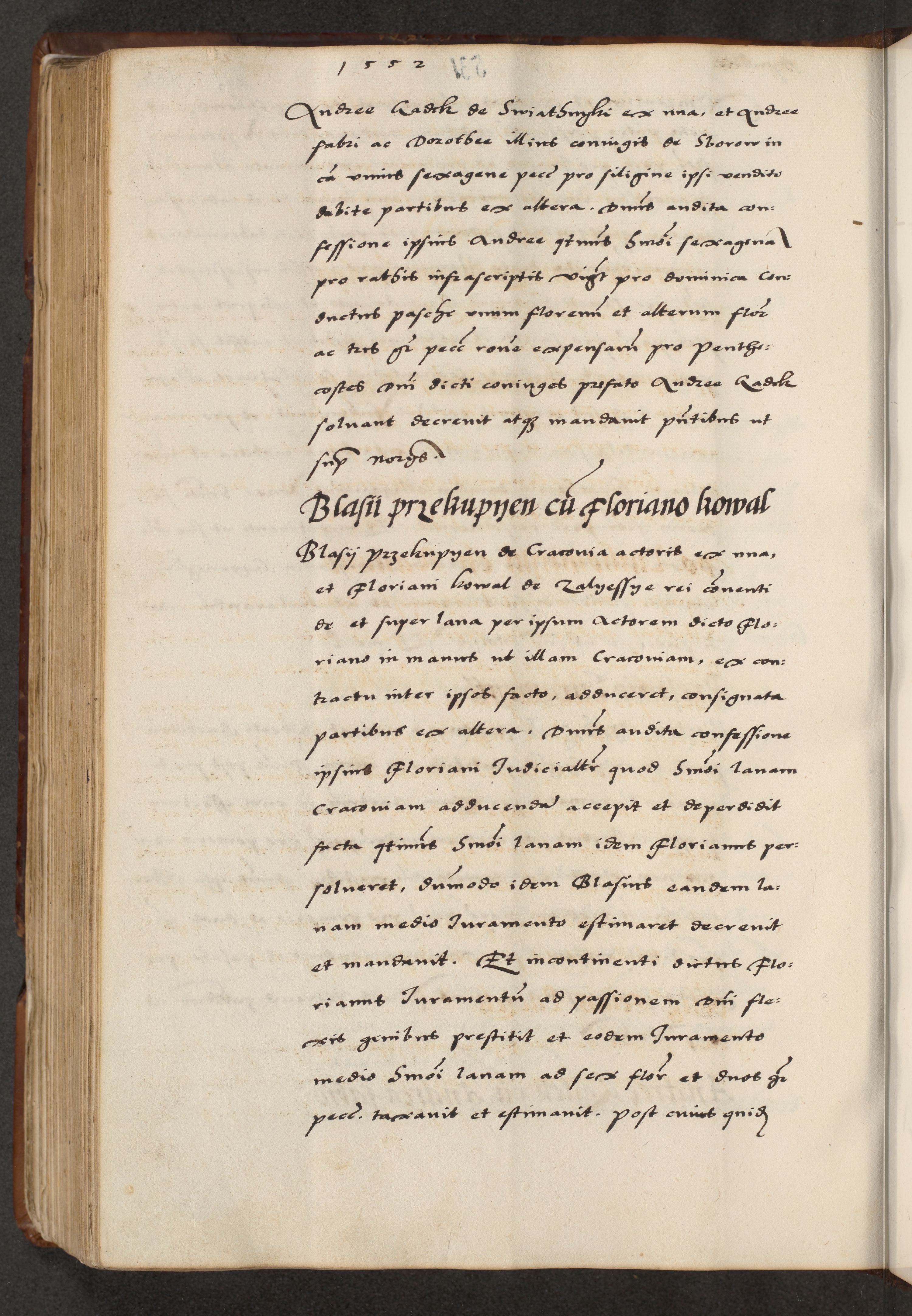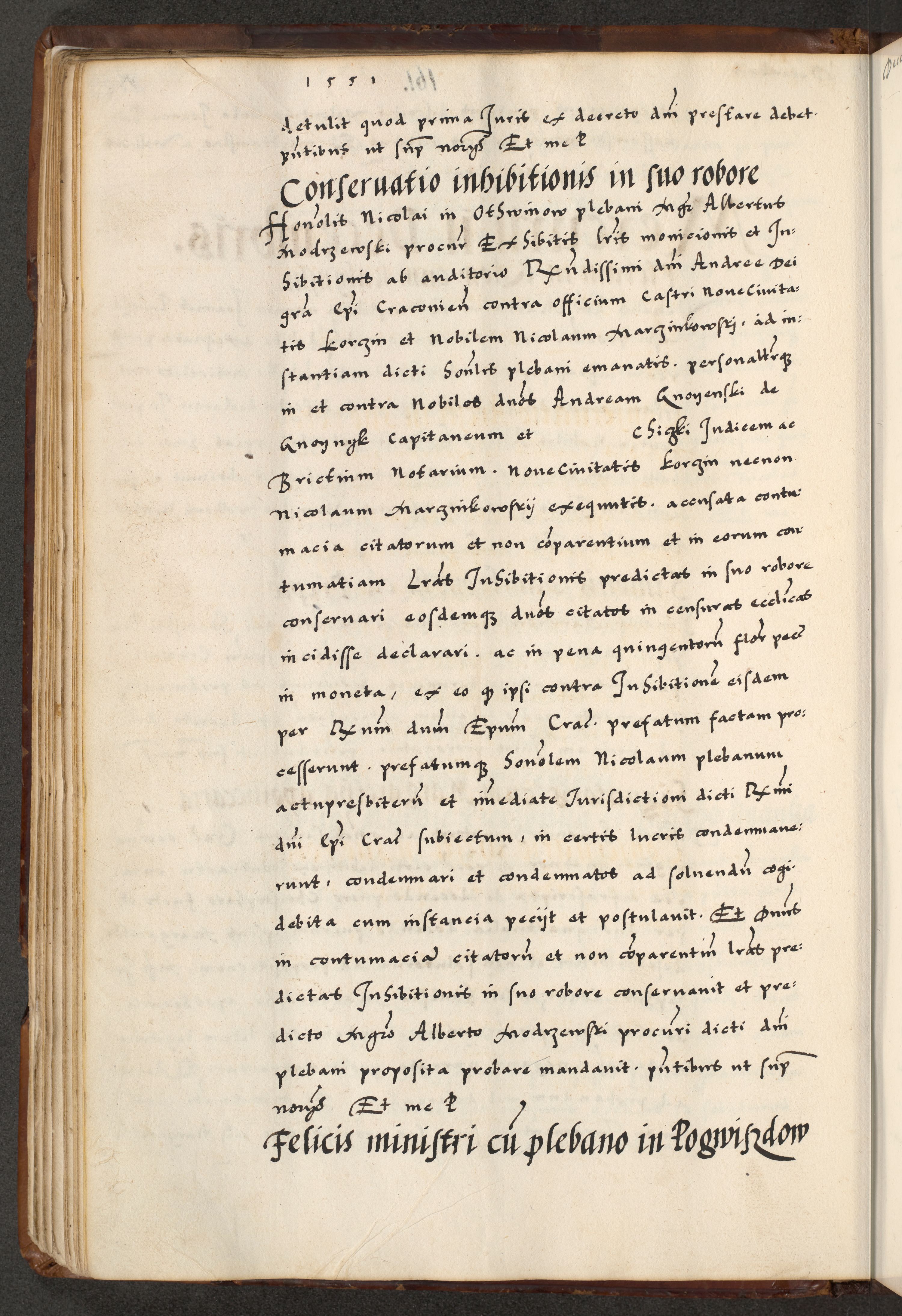 [A]cta actorum causarum, sententiarum tam diffinitivarum quam interloquutoriarum, obligationum, constitutionum et contractuum coram reverendo patre domino Petro Porembski preposito Osvieczimensi, canonico et officiali generali Cracoviensi de anno Domini millesimo quingentesimo quinguagesimo primo, cuius indictio est nona, pontificatus sanctissimi in Christo patris et domini nostri domini Juliii divina providencia pape tercii, anno secundo, a die et mense infrascriptis feliciter continiantur