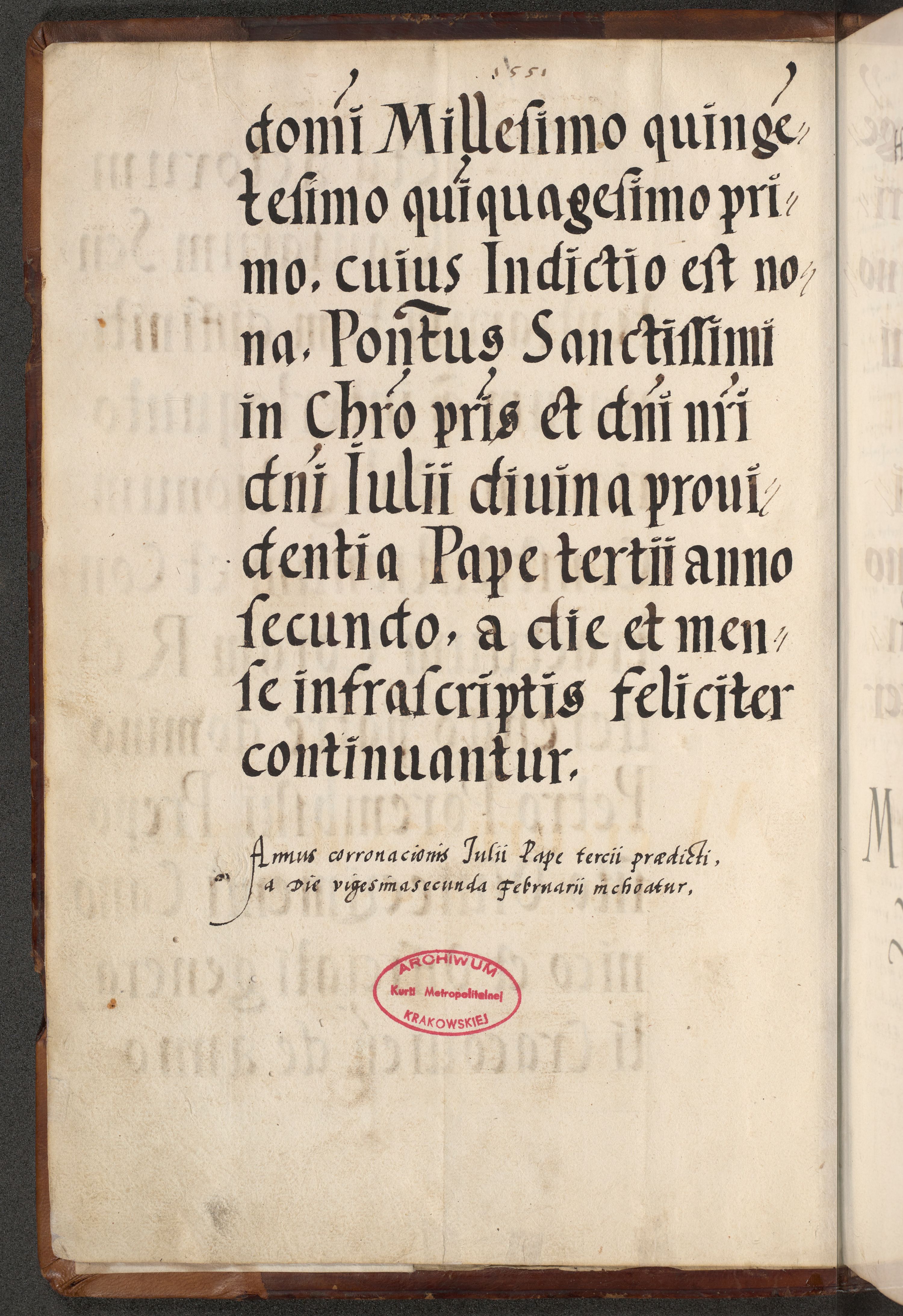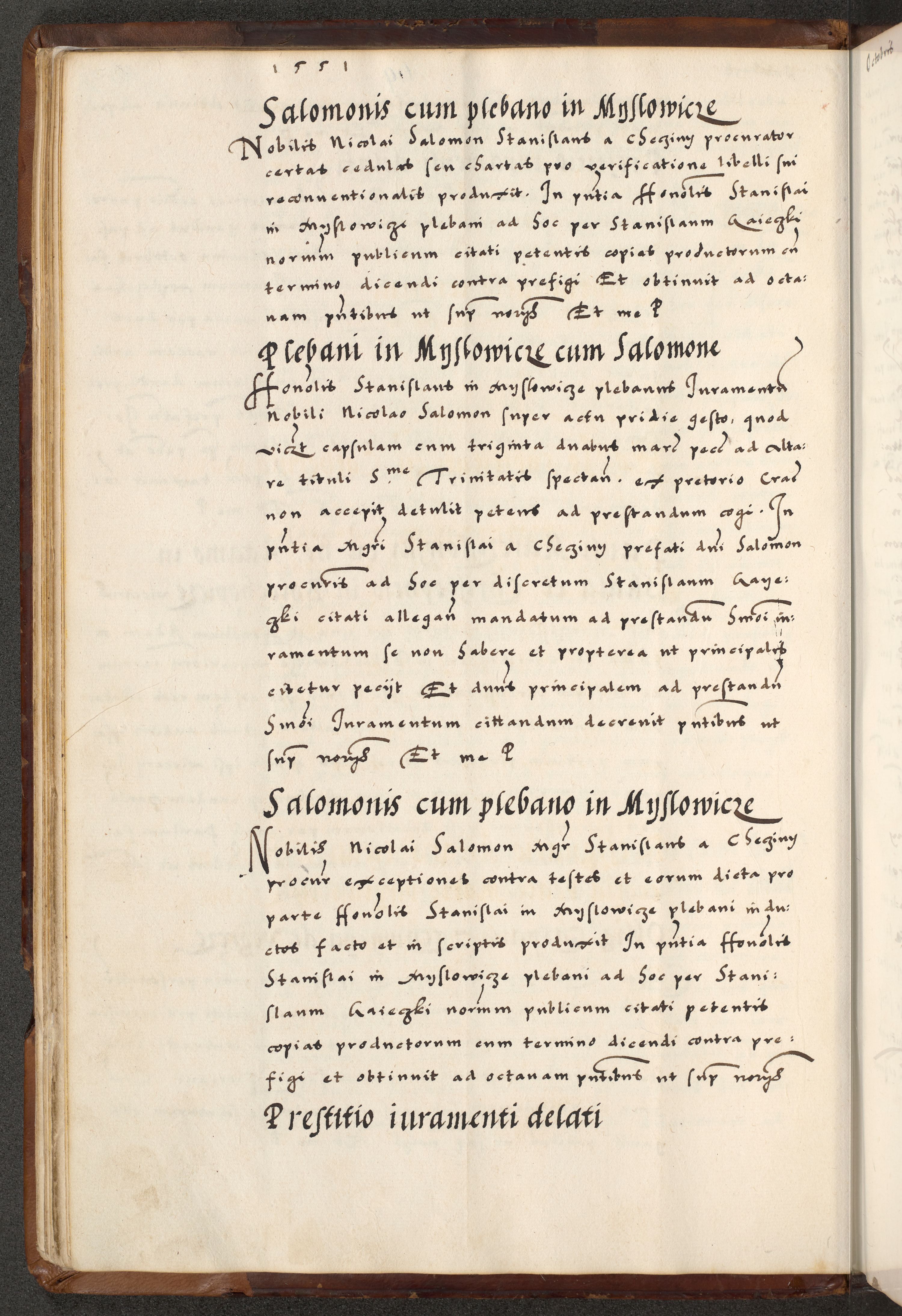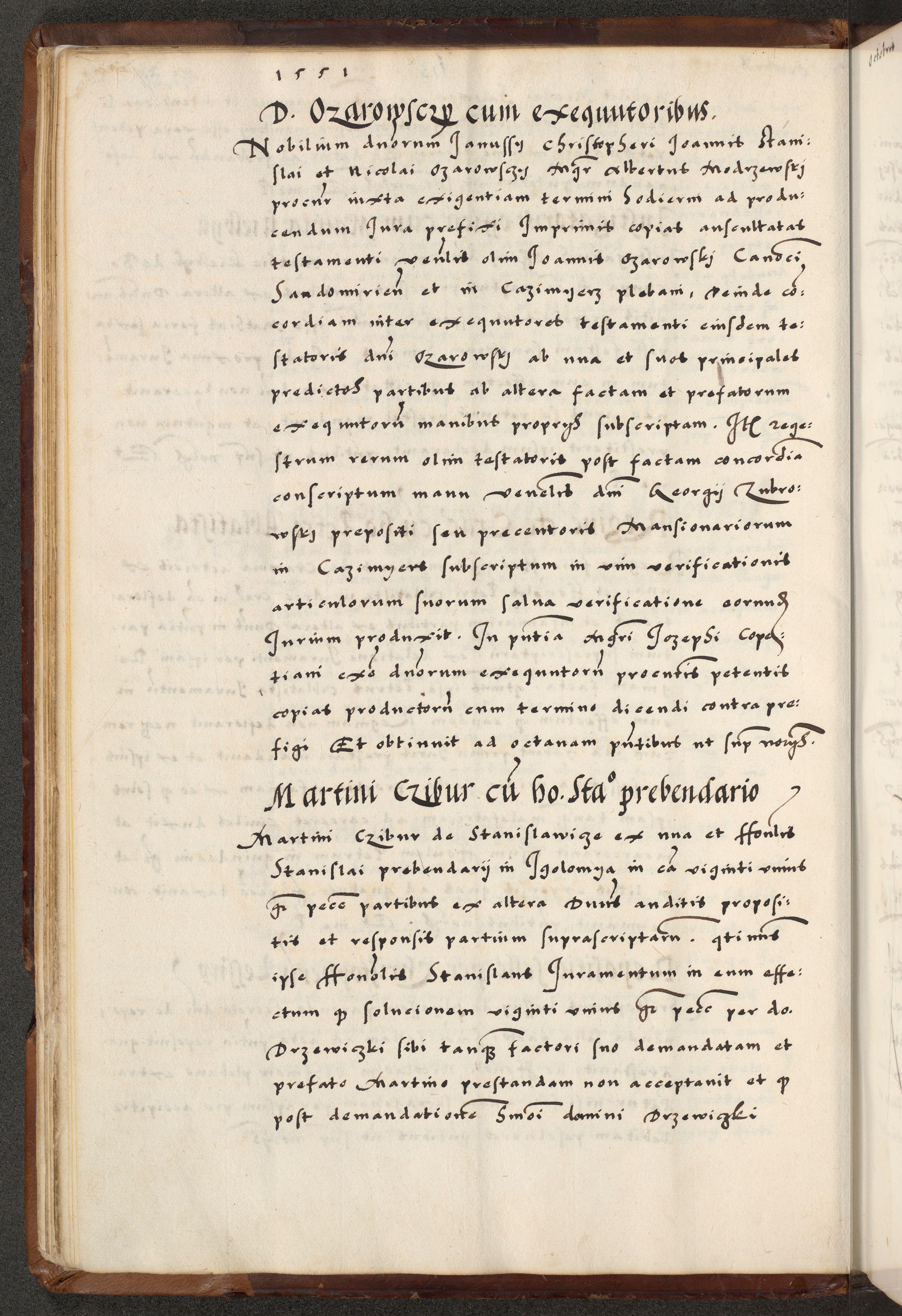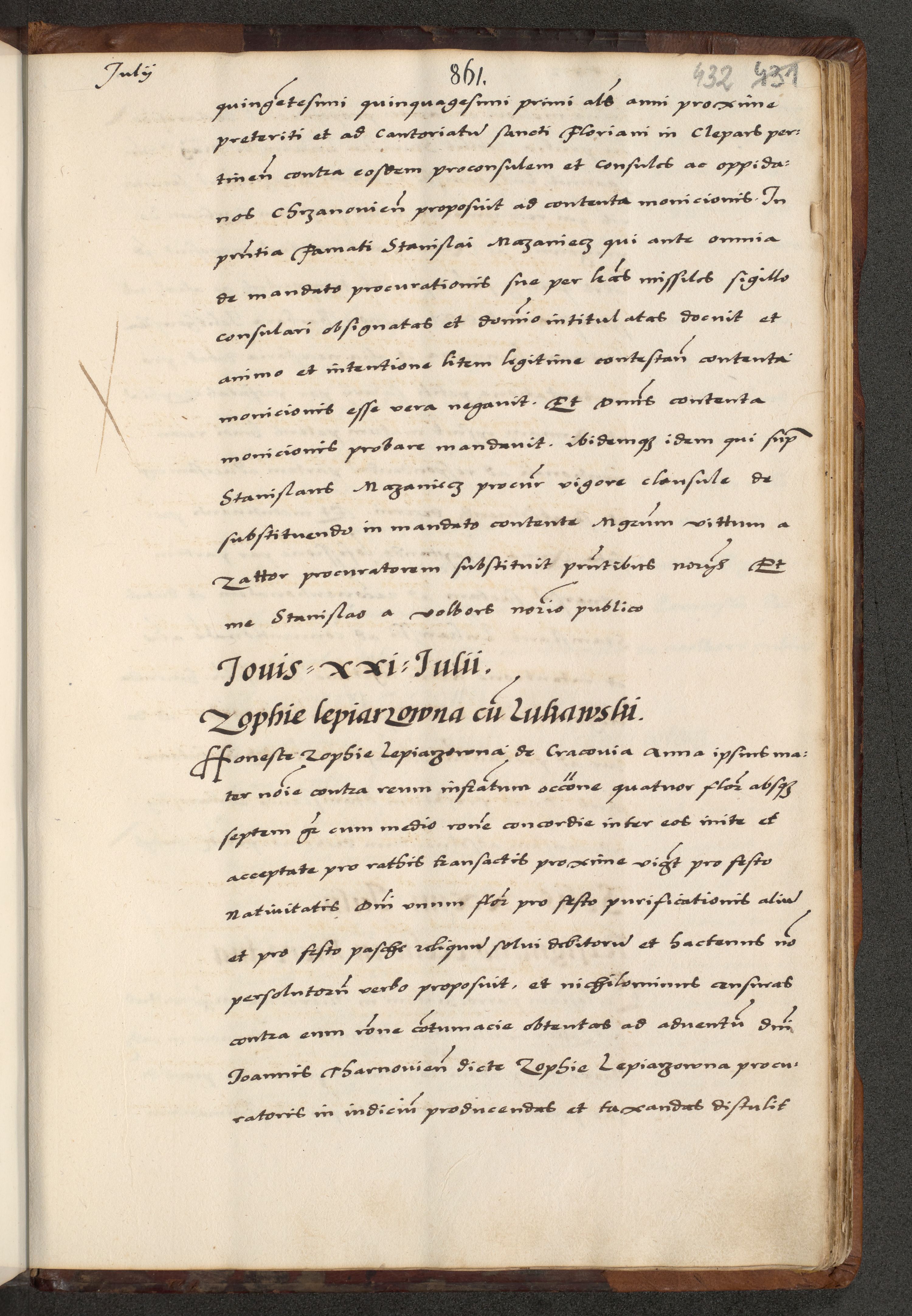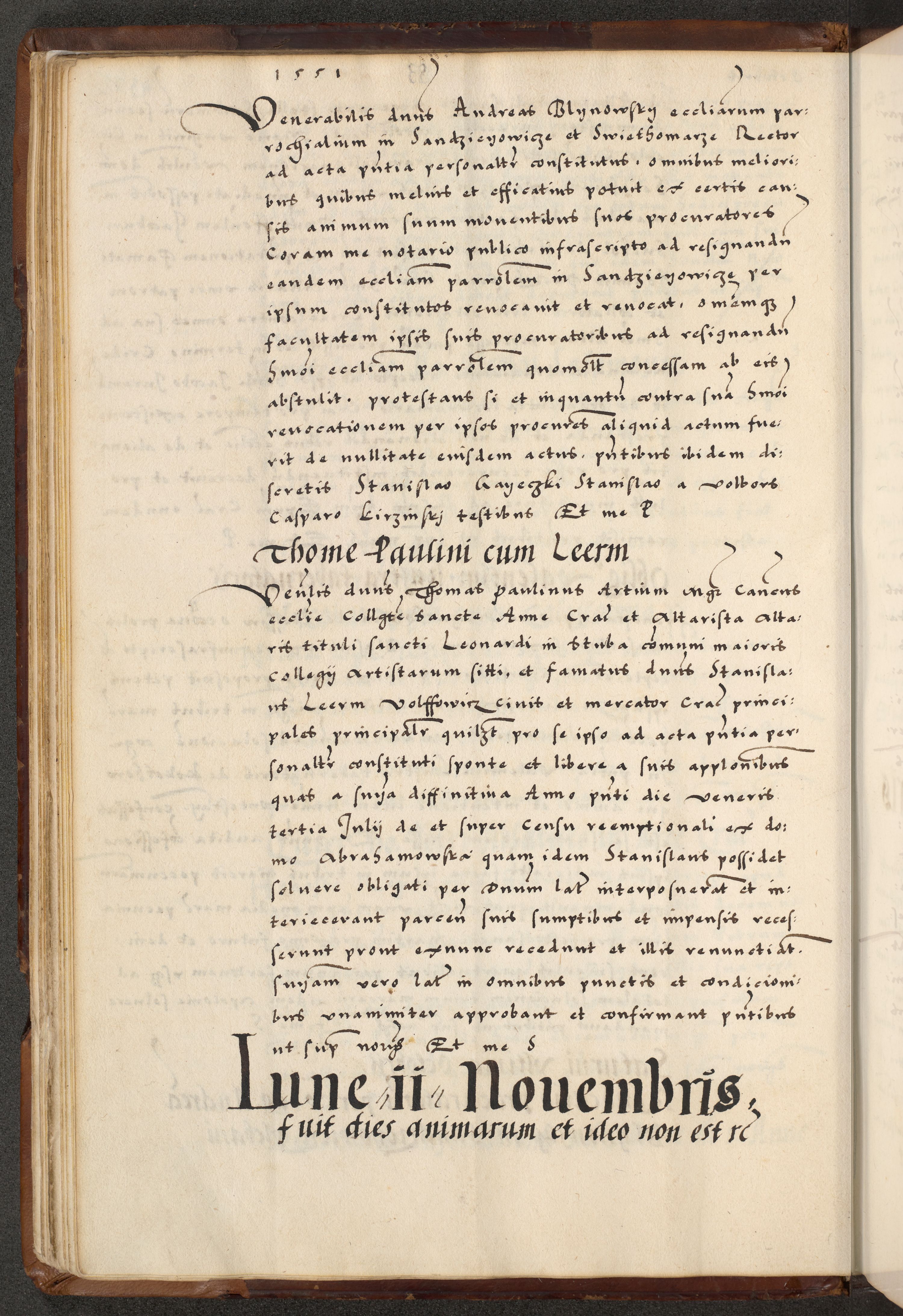 [A]cta actorum causarum, sententiarum tam diffinitivarum quam interloquutoriarum, obligationum, constitutionum et contractuum coram reverendo patre domino Petro Porembski preposito Osvieczimensi, canonico et officiali generali Cracoviensi de anno Domini millesimo quingentesimo quinguagesimo primo, cuius indictio est nona, pontificatus sanctissimi in Christo patris et domini nostri domini Juliii divina providencia pape tercii, anno secundo, a die et mense infrascriptis feliciter continiantur