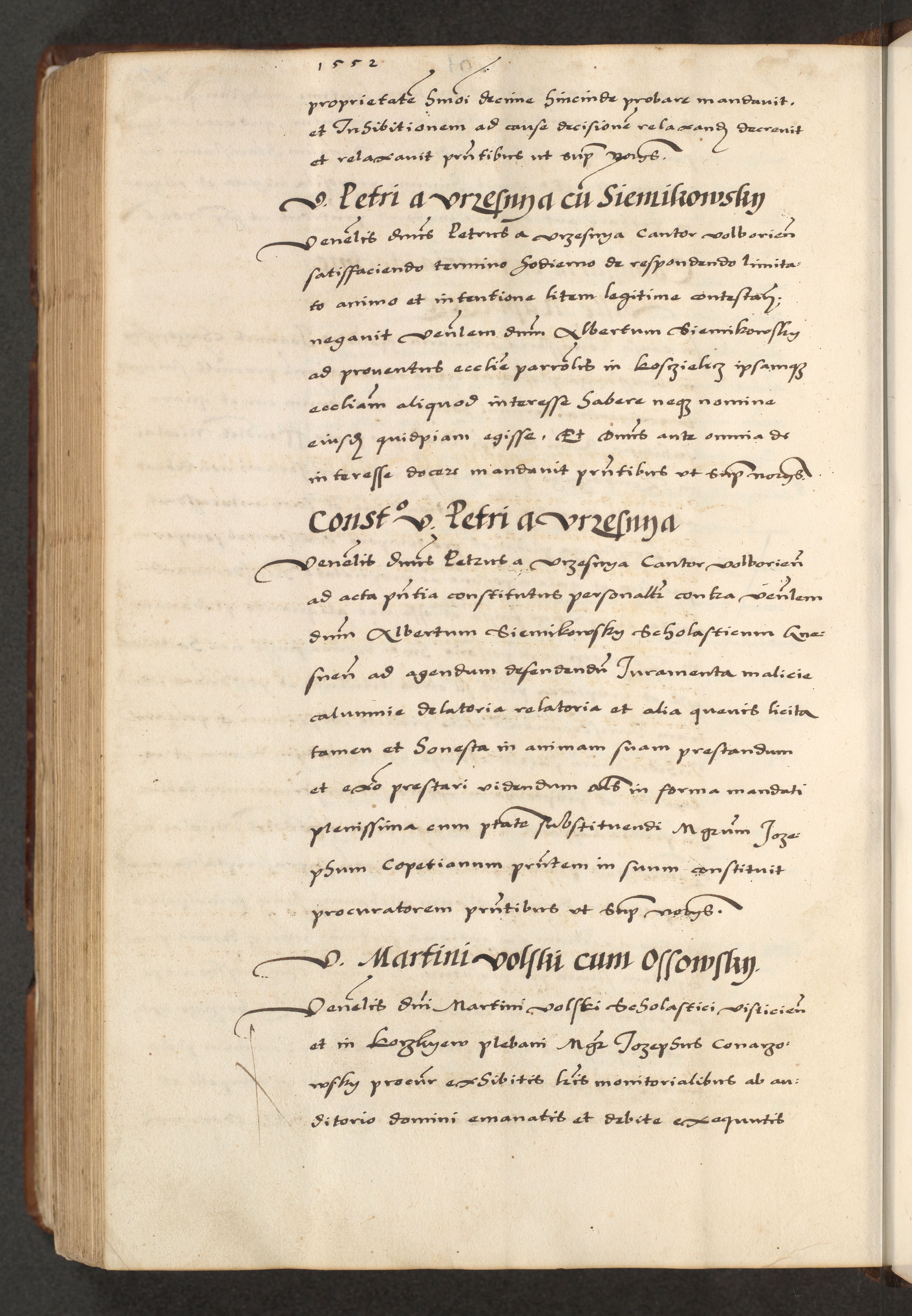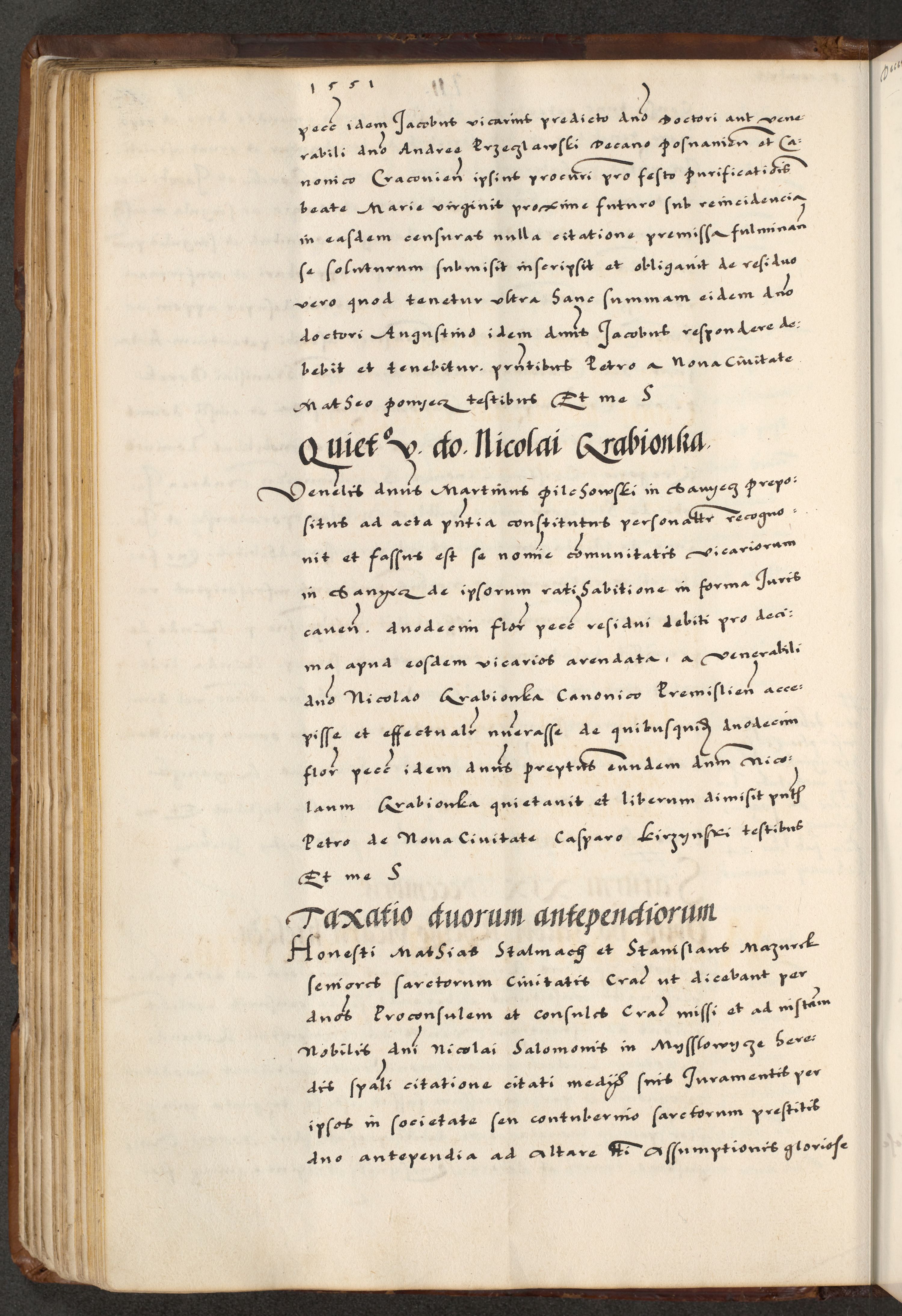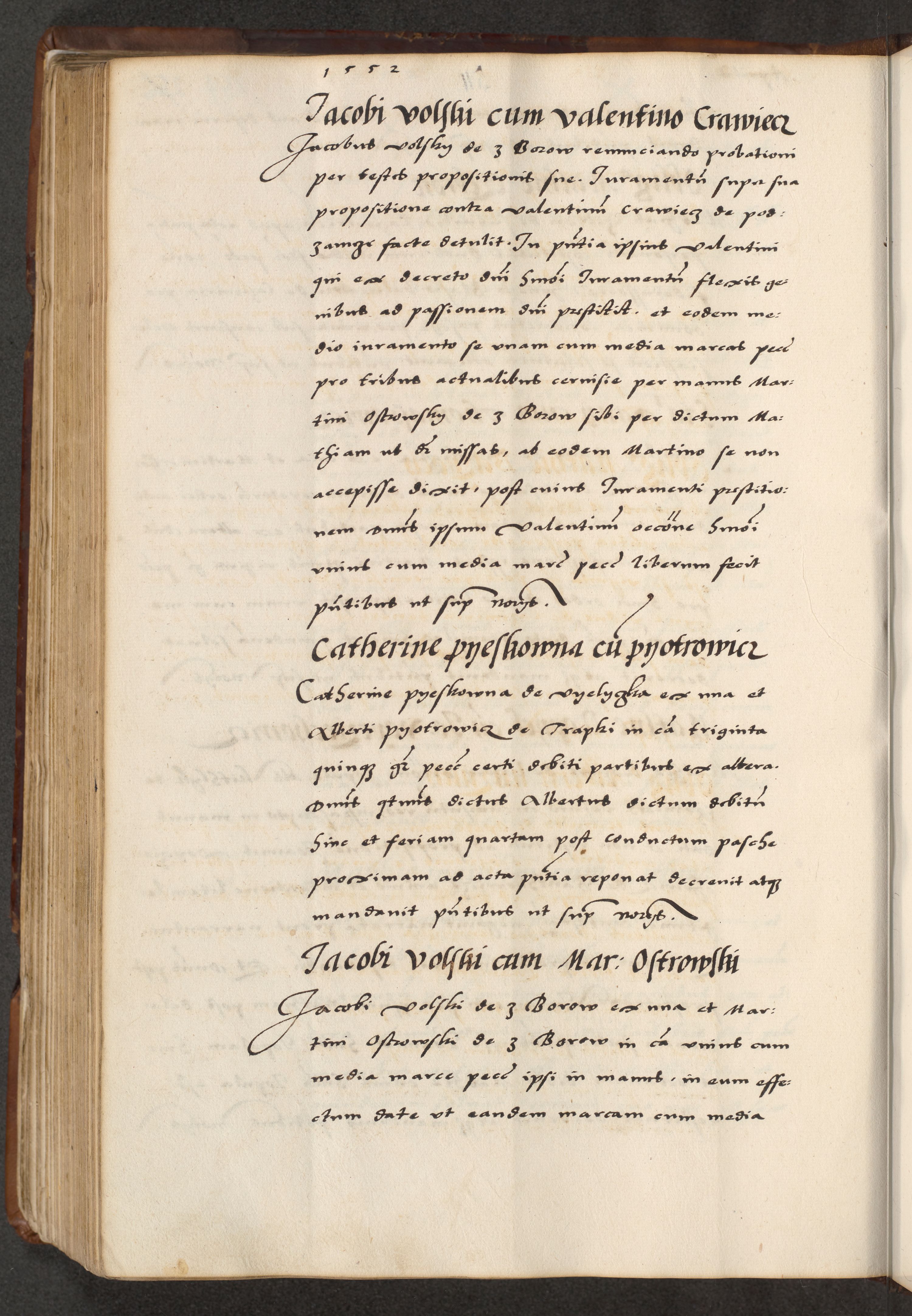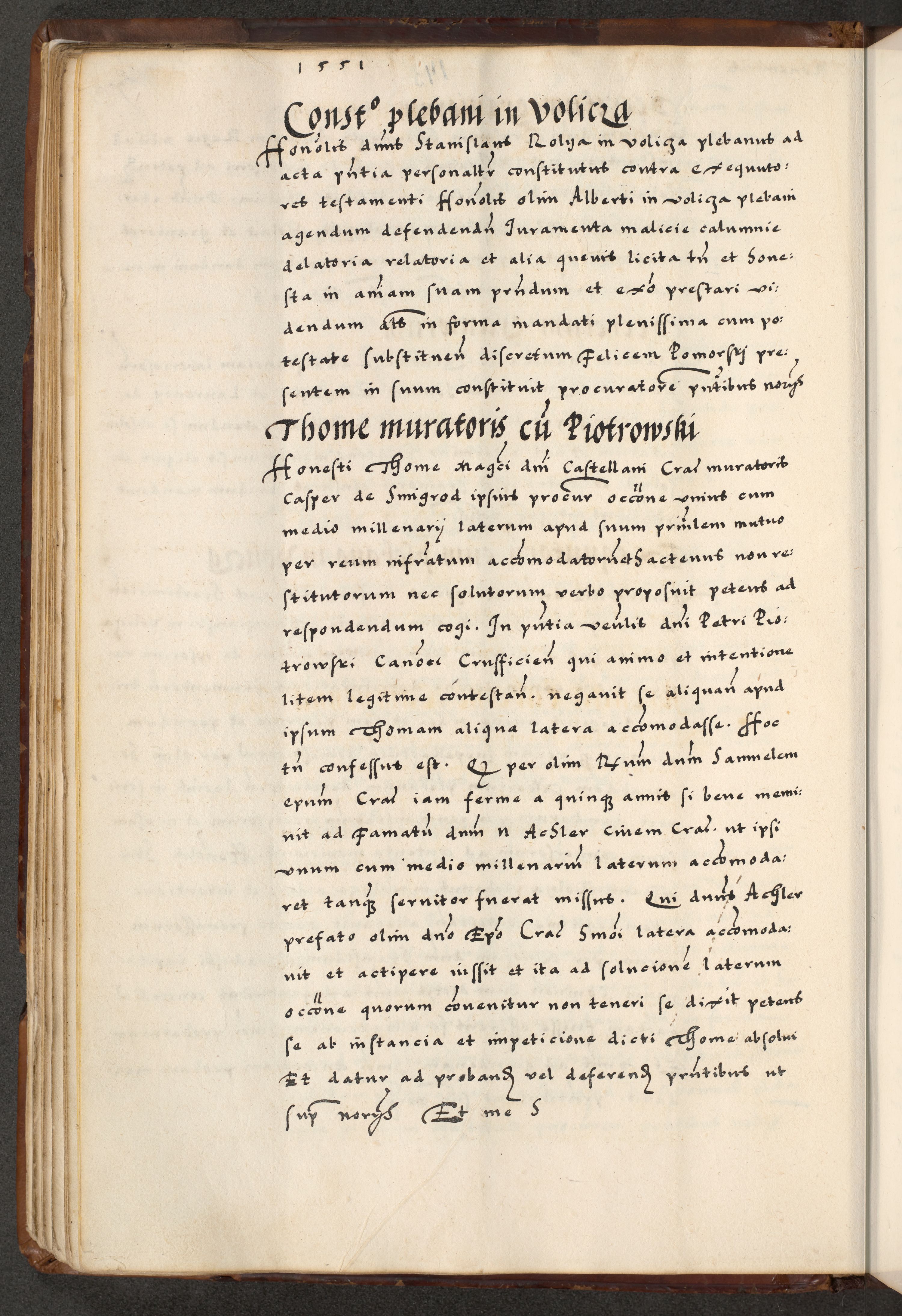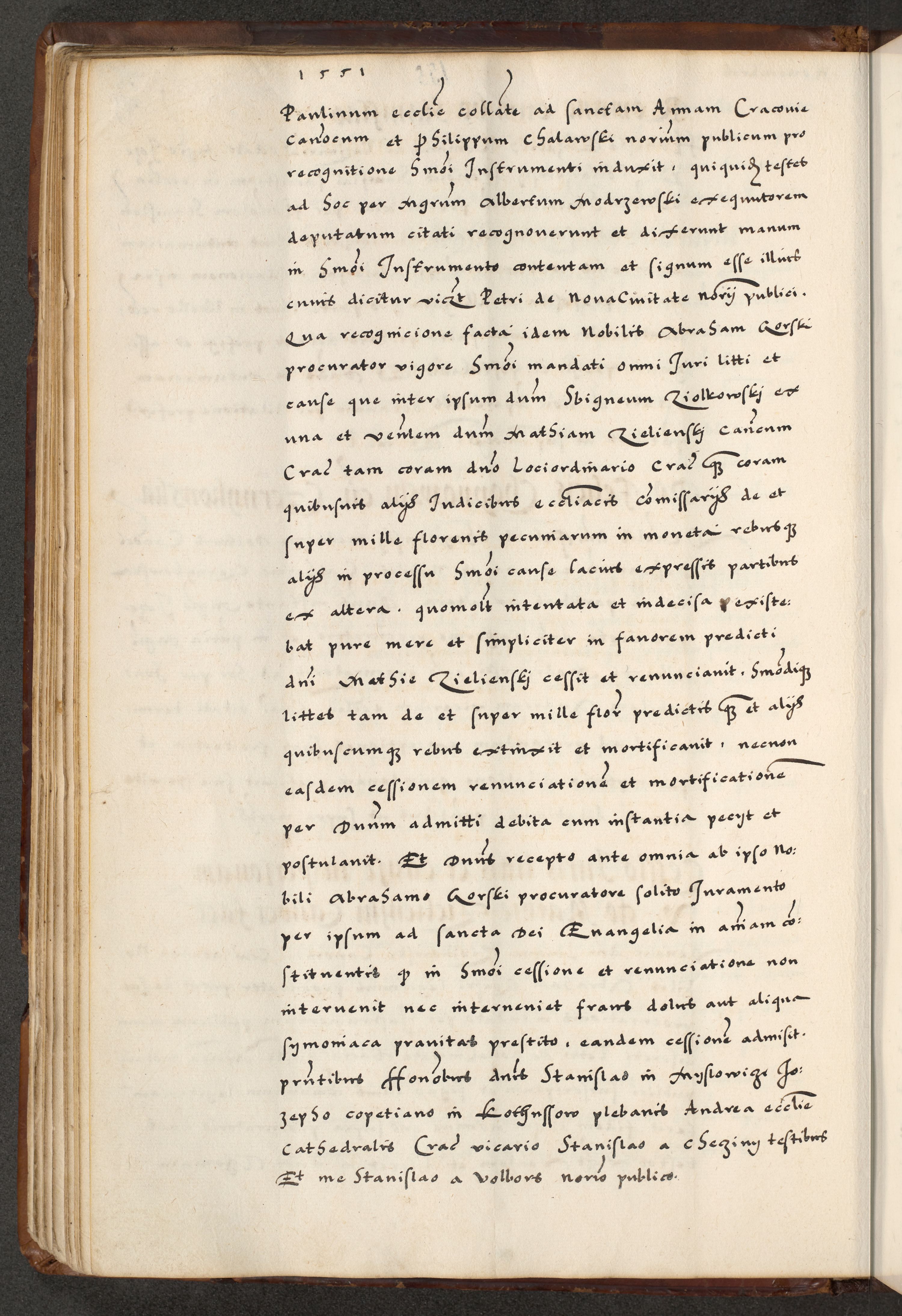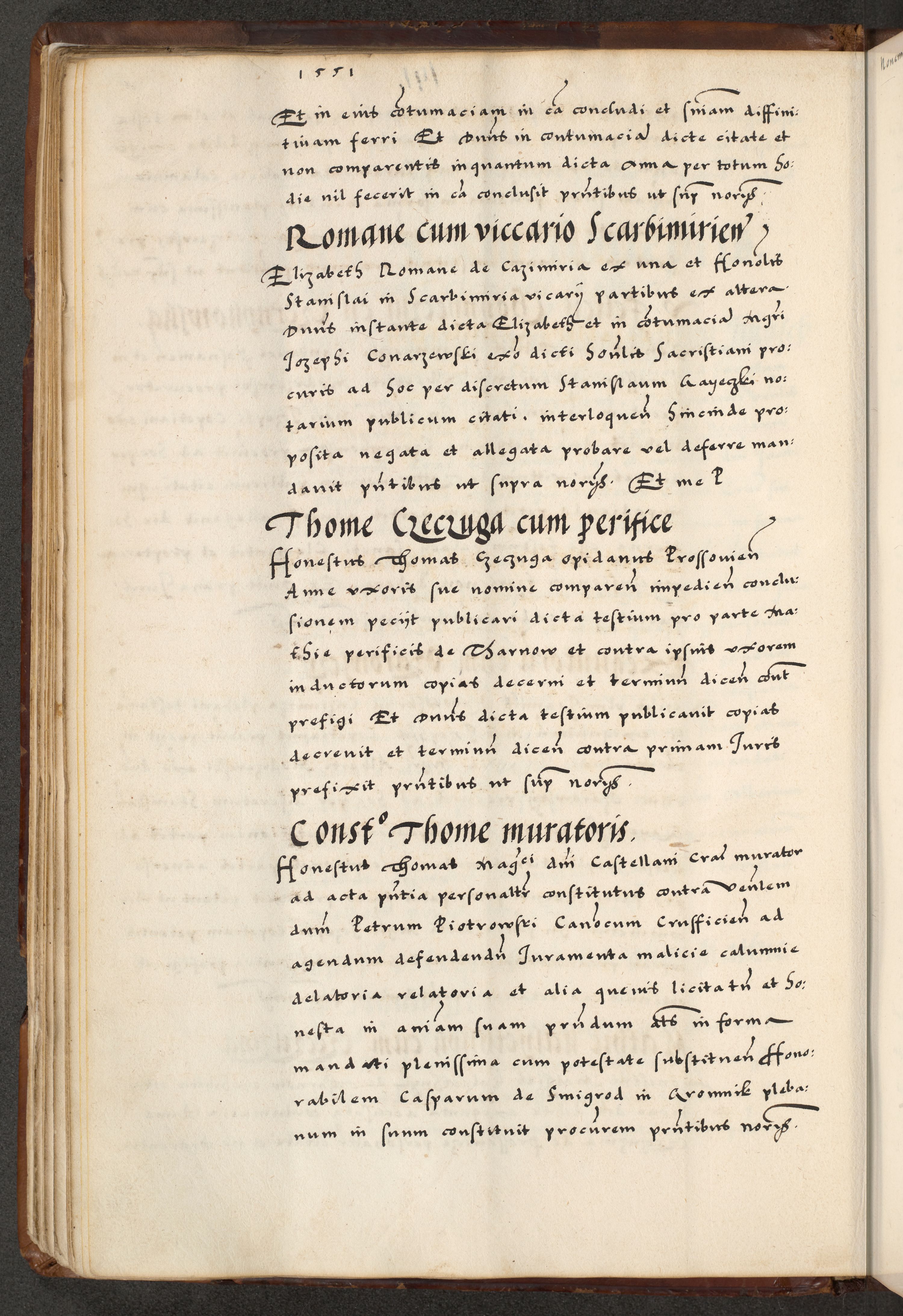 [A]cta actorum causarum, sententiarum tam diffinitivarum quam interloquutoriarum, obligationum, constitutionum et contractuum coram reverendo patre domino Petro Porembski preposito Osvieczimensi, canonico et officiali generali Cracoviensi de anno Domini millesimo quingentesimo quinguagesimo primo, cuius indictio est nona, pontificatus sanctissimi in Christo patris et domini nostri domini Juliii divina providencia pape tercii, anno secundo, a die et mense infrascriptis feliciter continiantur