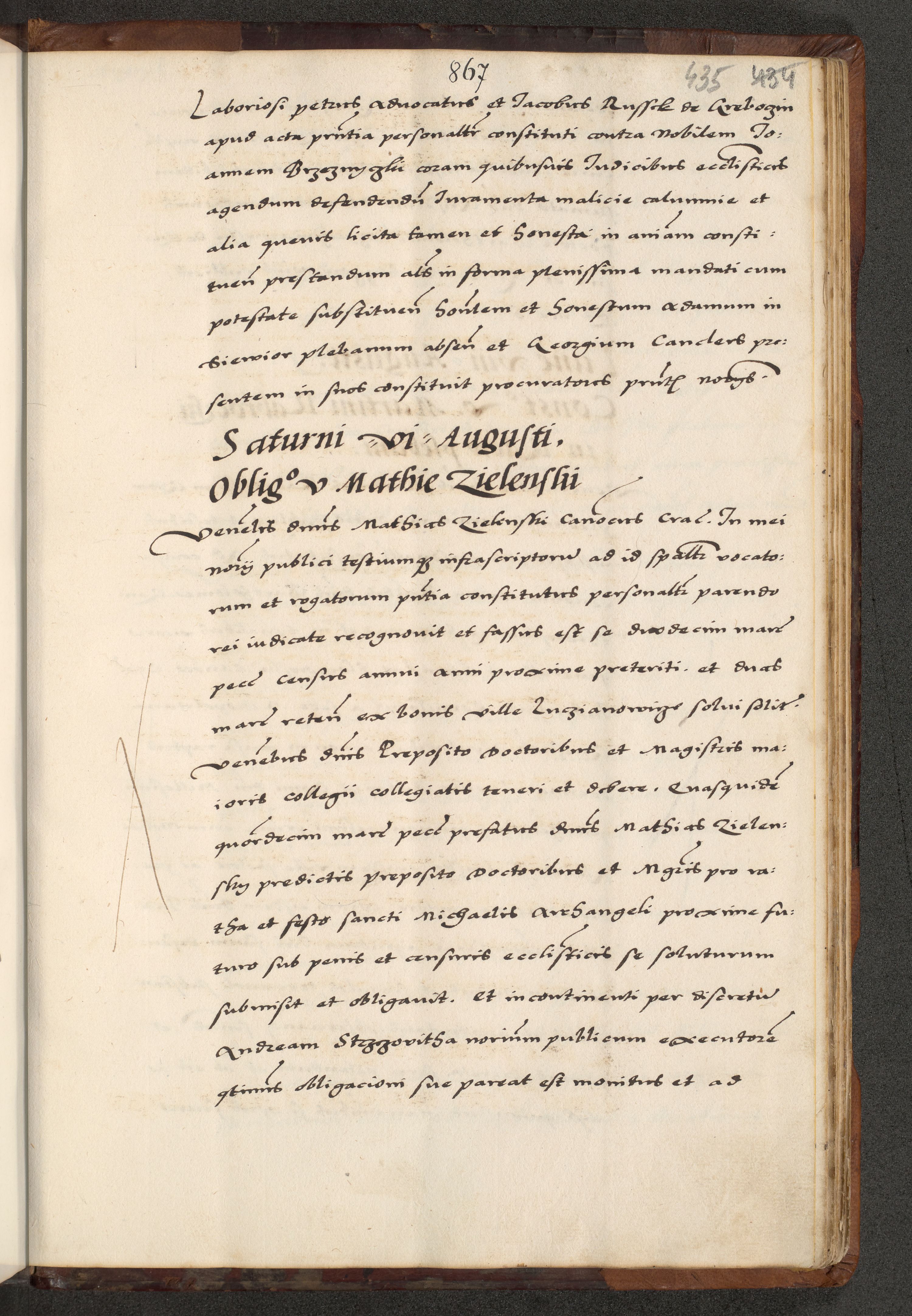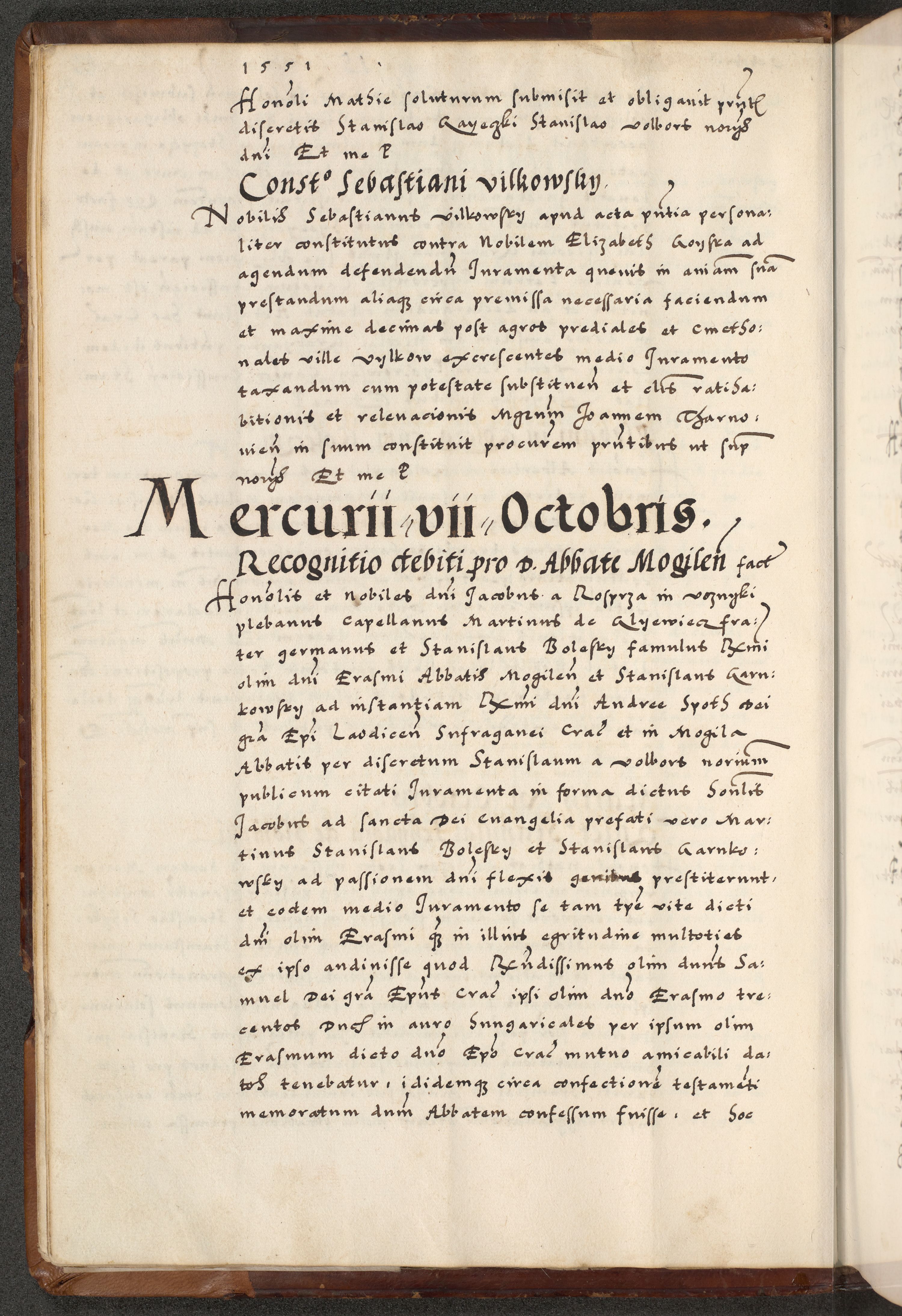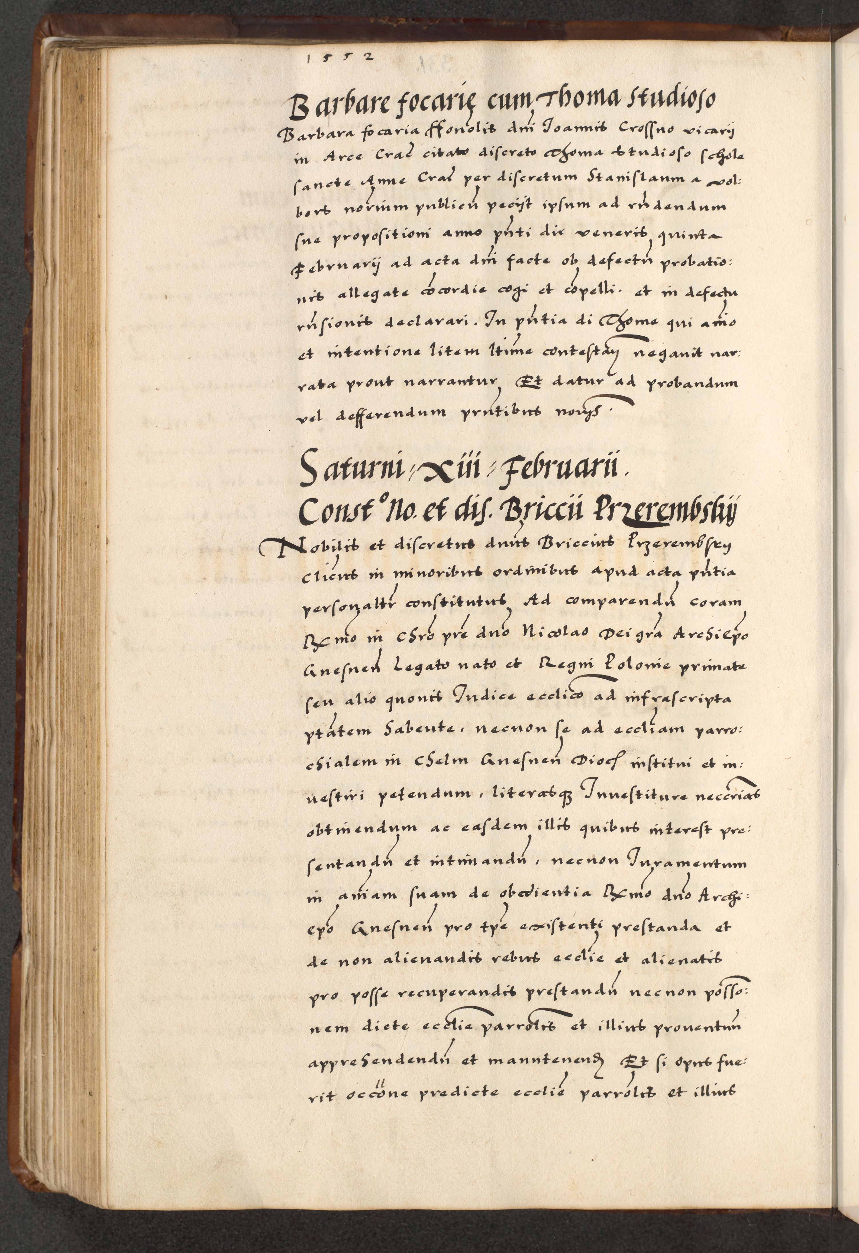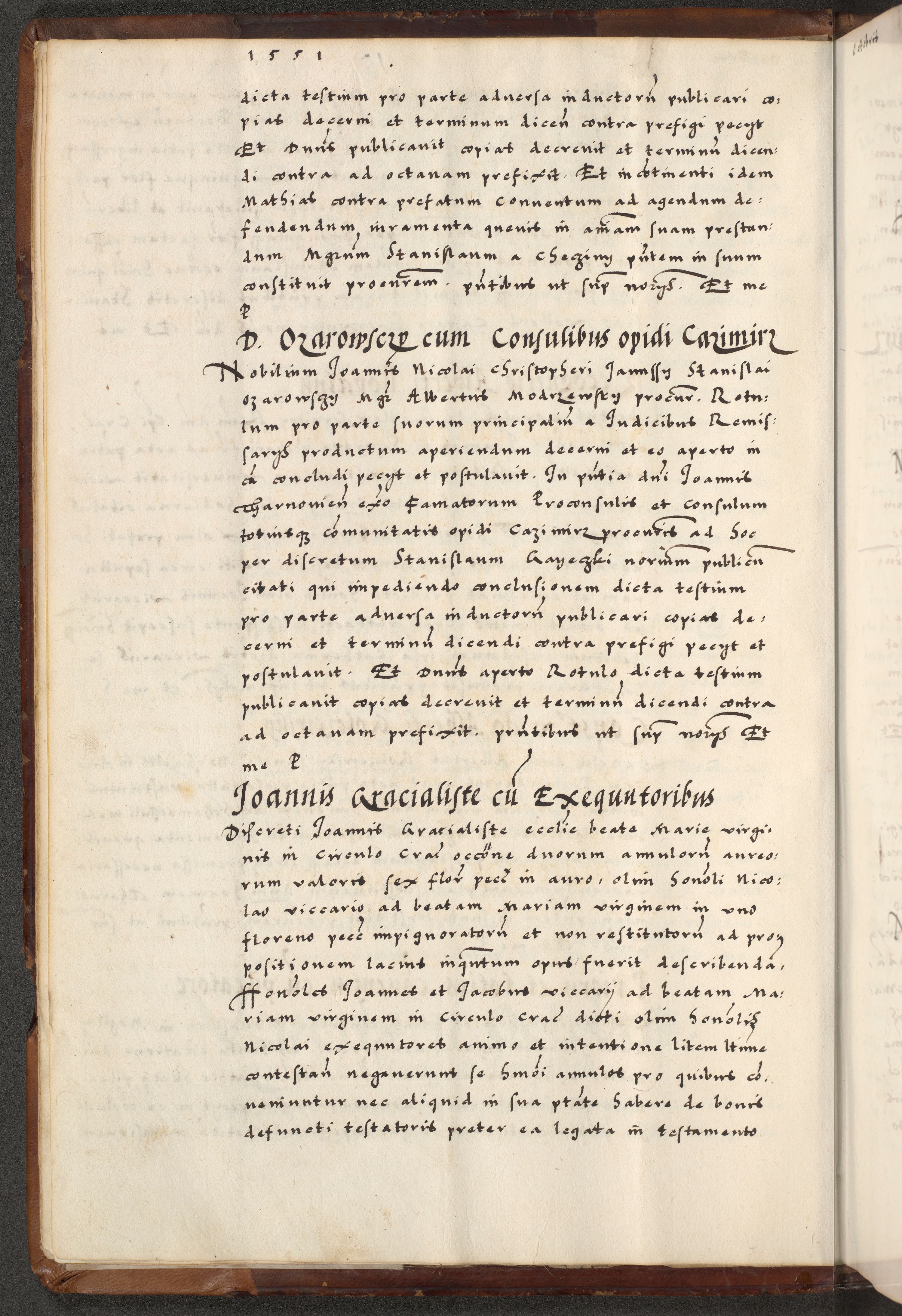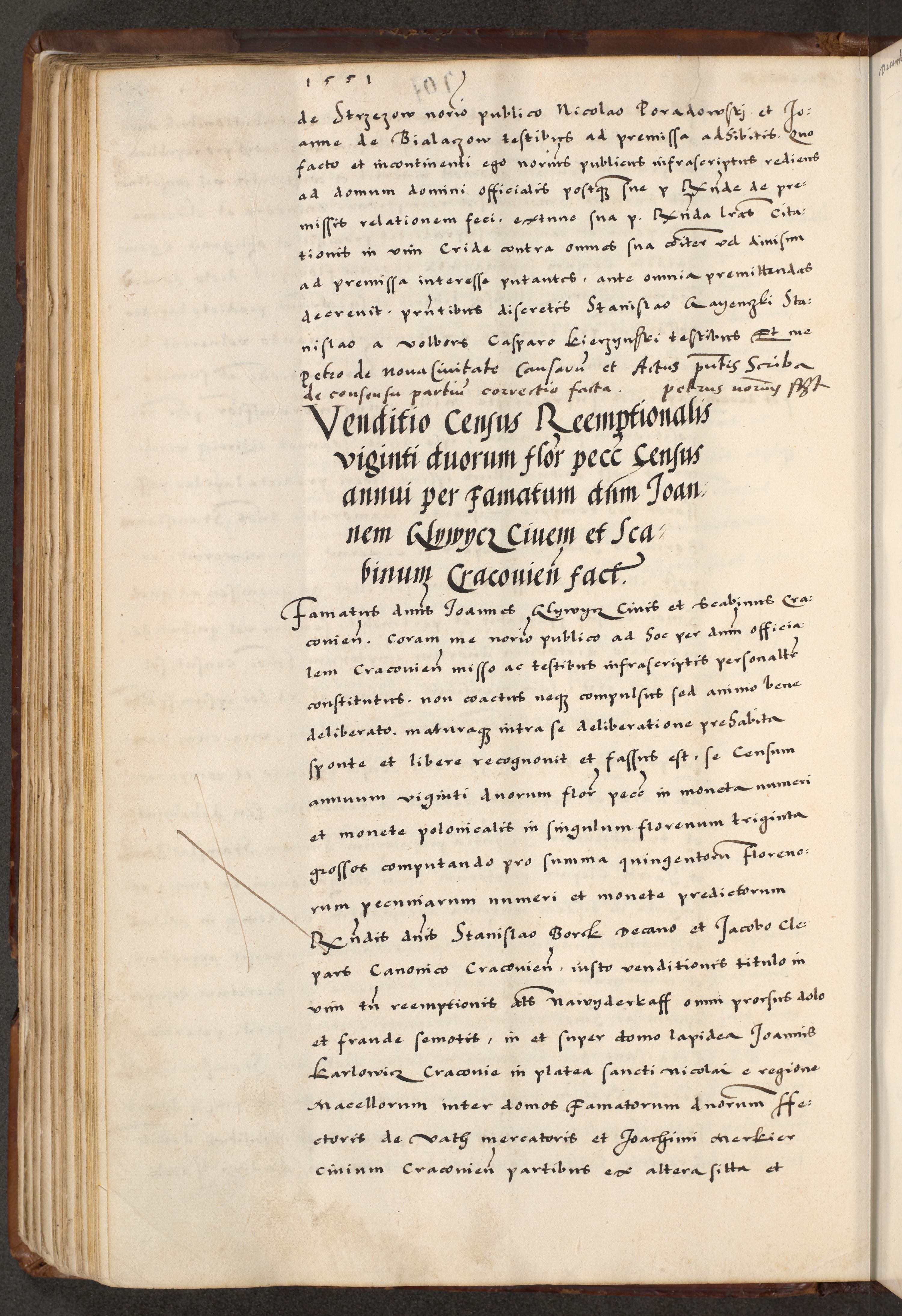 [A]cta actorum causarum, sententiarum tam diffinitivarum quam interloquutoriarum, obligationum, constitutionum et contractuum coram reverendo patre domino Petro Porembski preposito Osvieczimensi, canonico et officiali generali Cracoviensi de anno Domini millesimo quingentesimo quinguagesimo primo, cuius indictio est nona, pontificatus sanctissimi in Christo patris et domini nostri domini Juliii divina providencia pape tercii, anno secundo, a die et mense infrascriptis feliciter continiantur