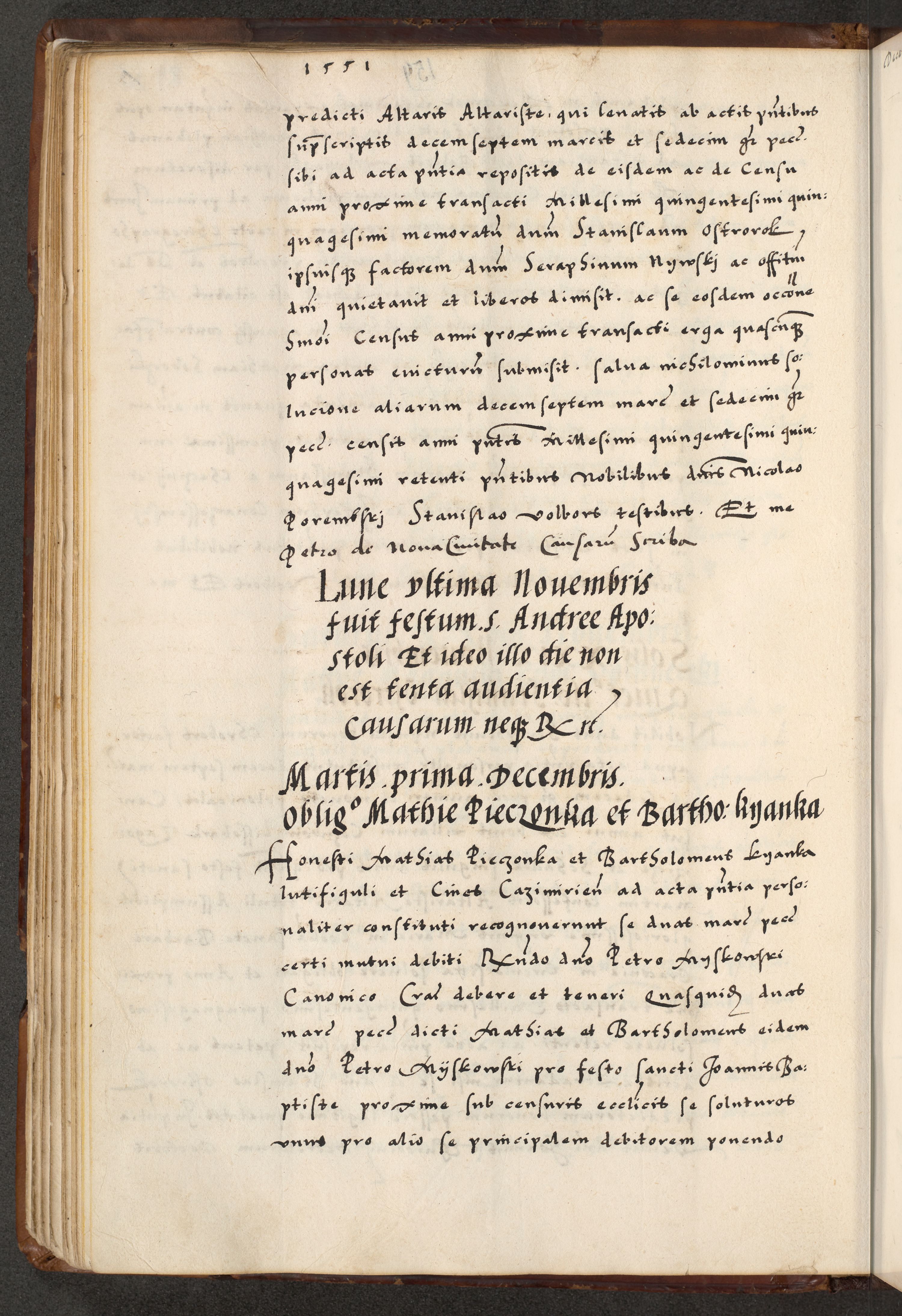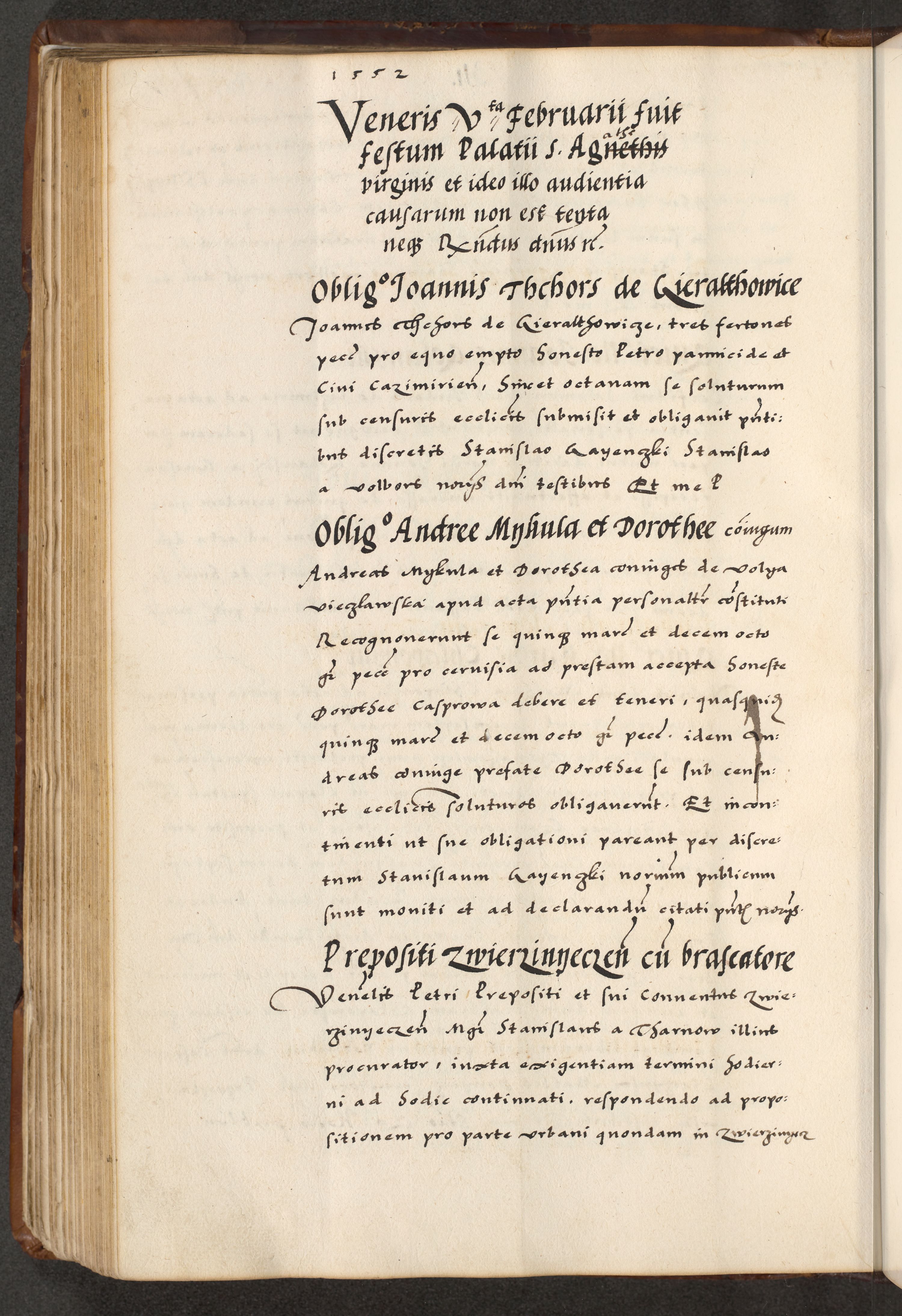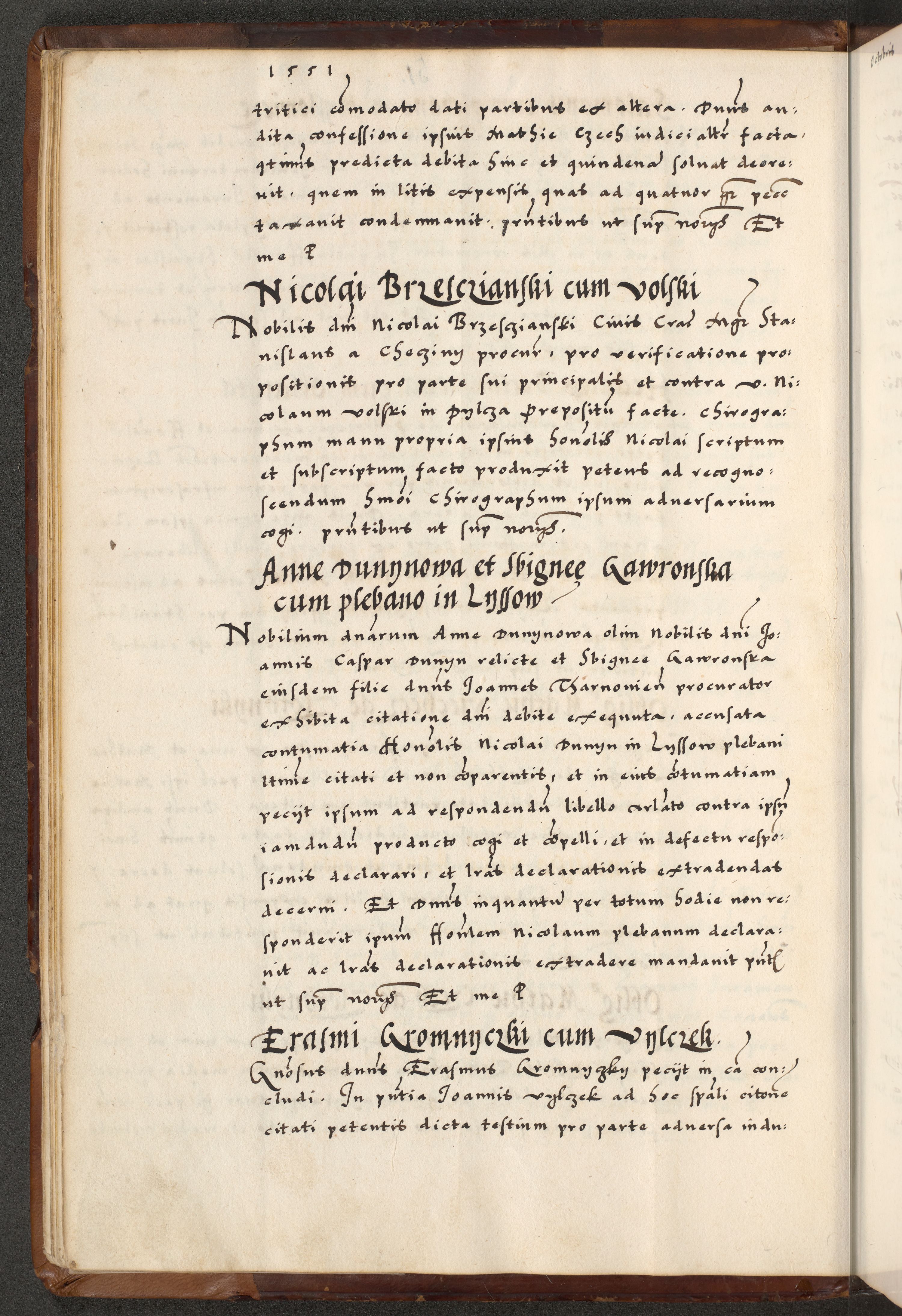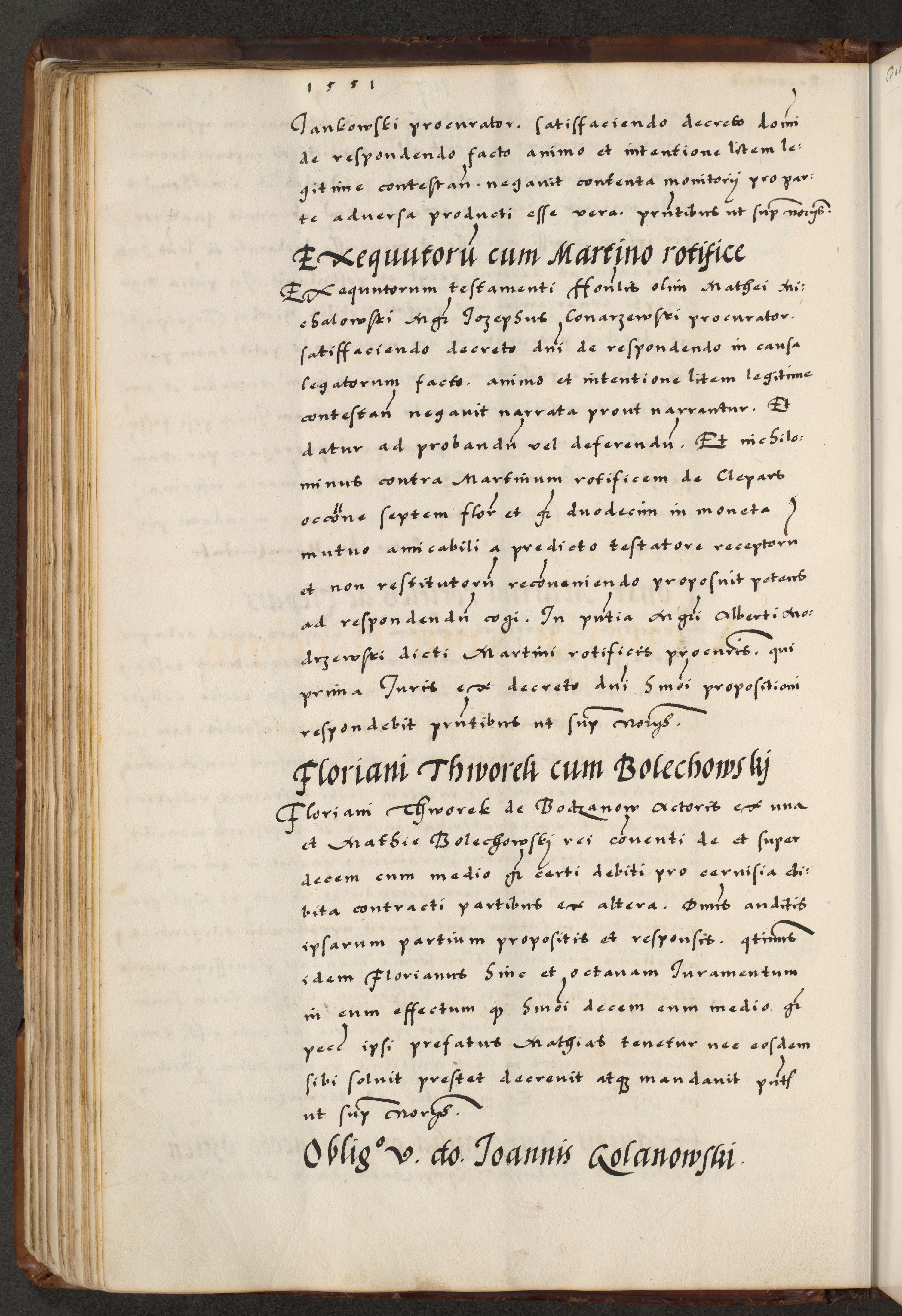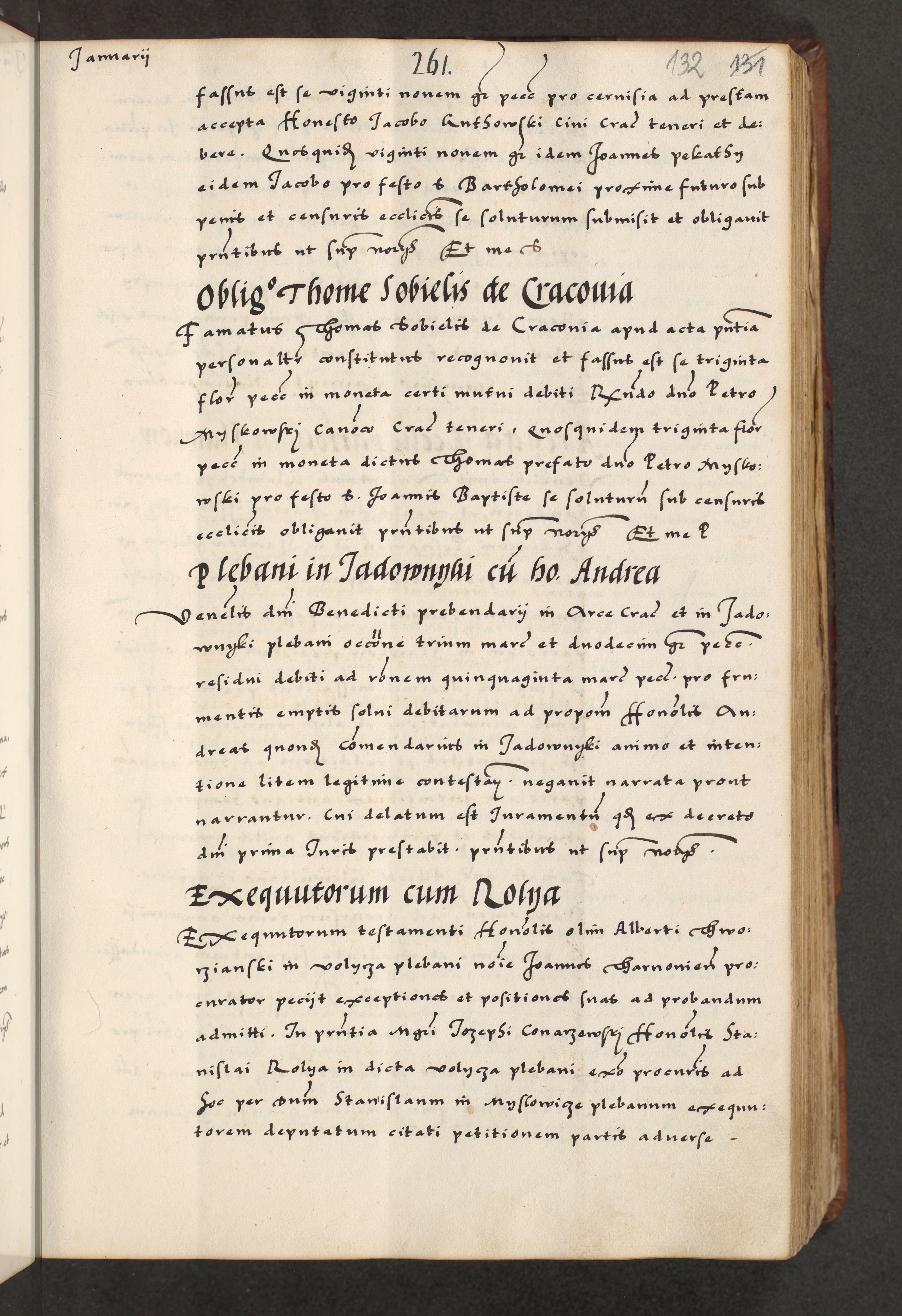 [A]cta actorum causarum, sententiarum tam diffinitivarum quam interloquutoriarum, obligationum, constitutionum et contractuum coram reverendo patre domino Petro Porembski preposito Osvieczimensi, canonico et officiali generali Cracoviensi de anno Domini millesimo quingentesimo quinguagesimo primo, cuius indictio est nona, pontificatus sanctissimi in Christo patris et domini nostri domini Juliii divina providencia pape tercii, anno secundo, a die et mense infrascriptis feliciter continiantur