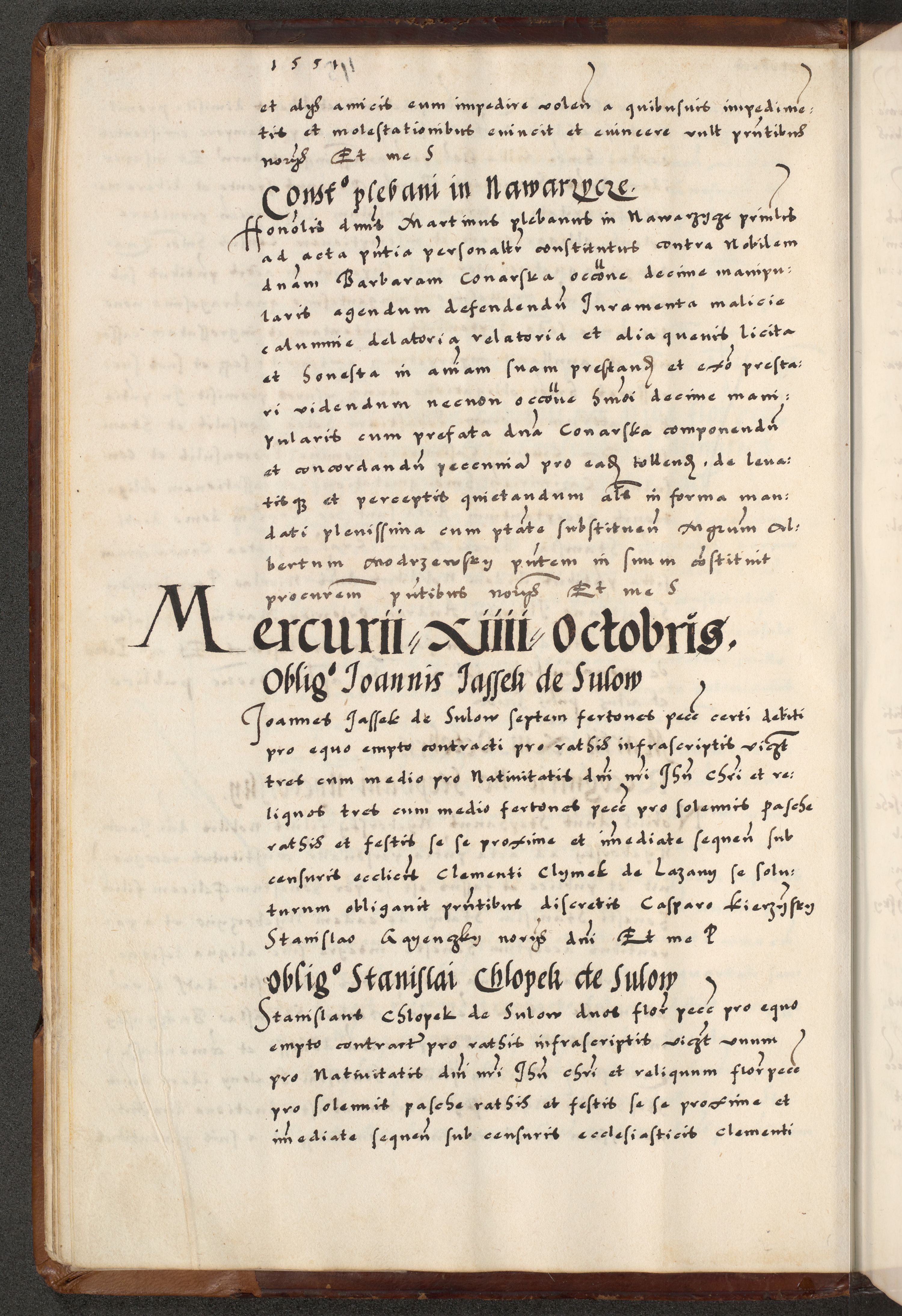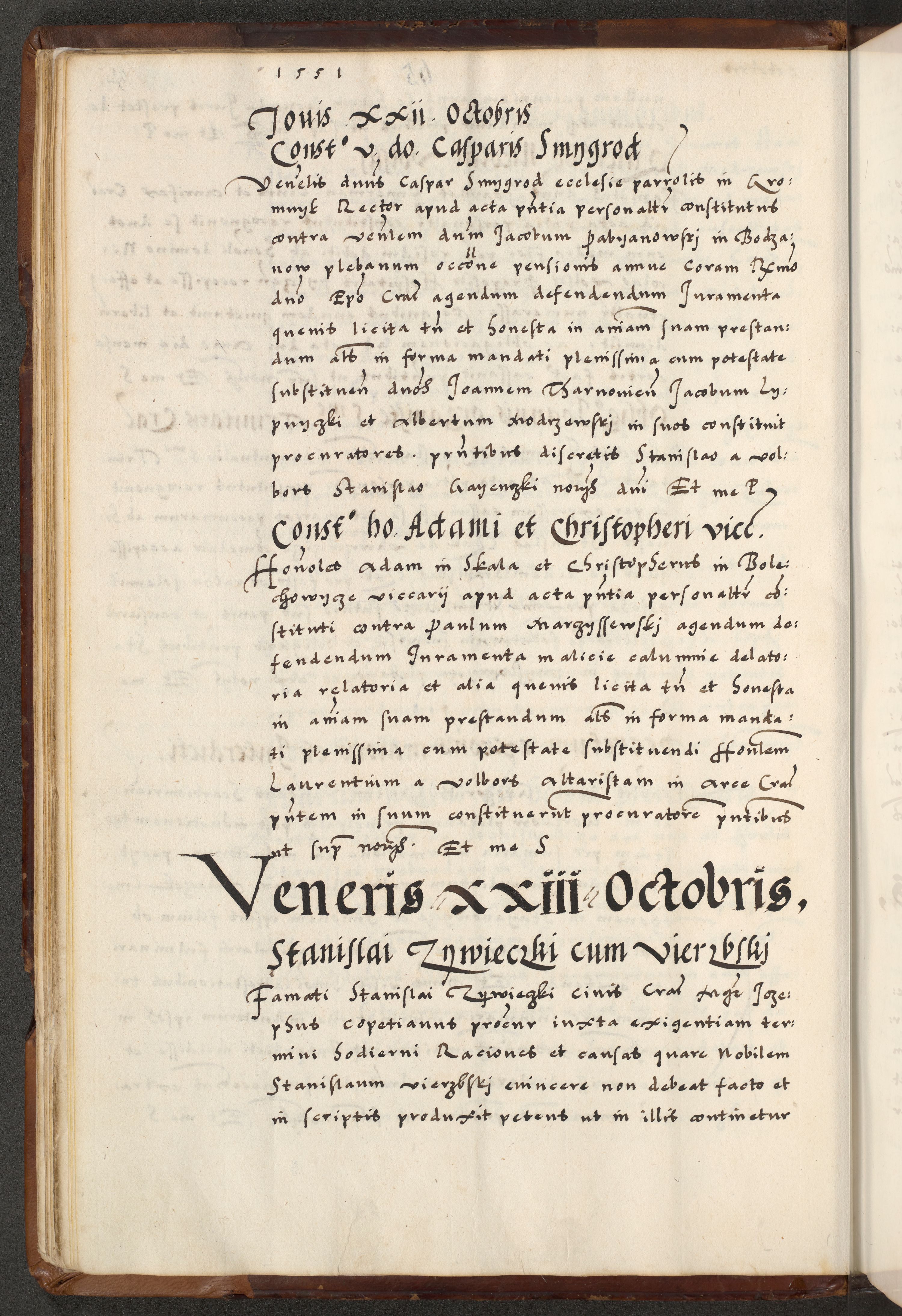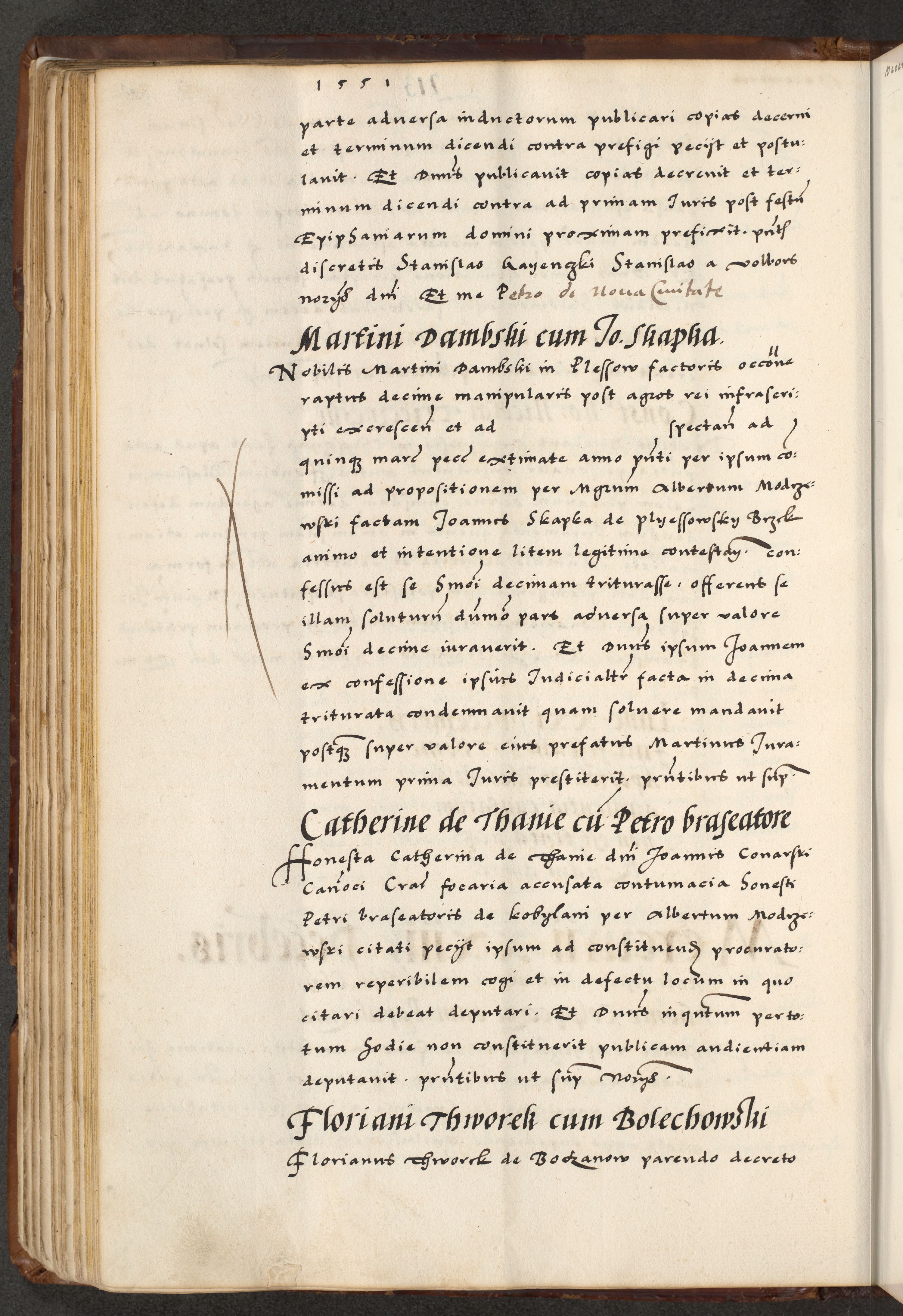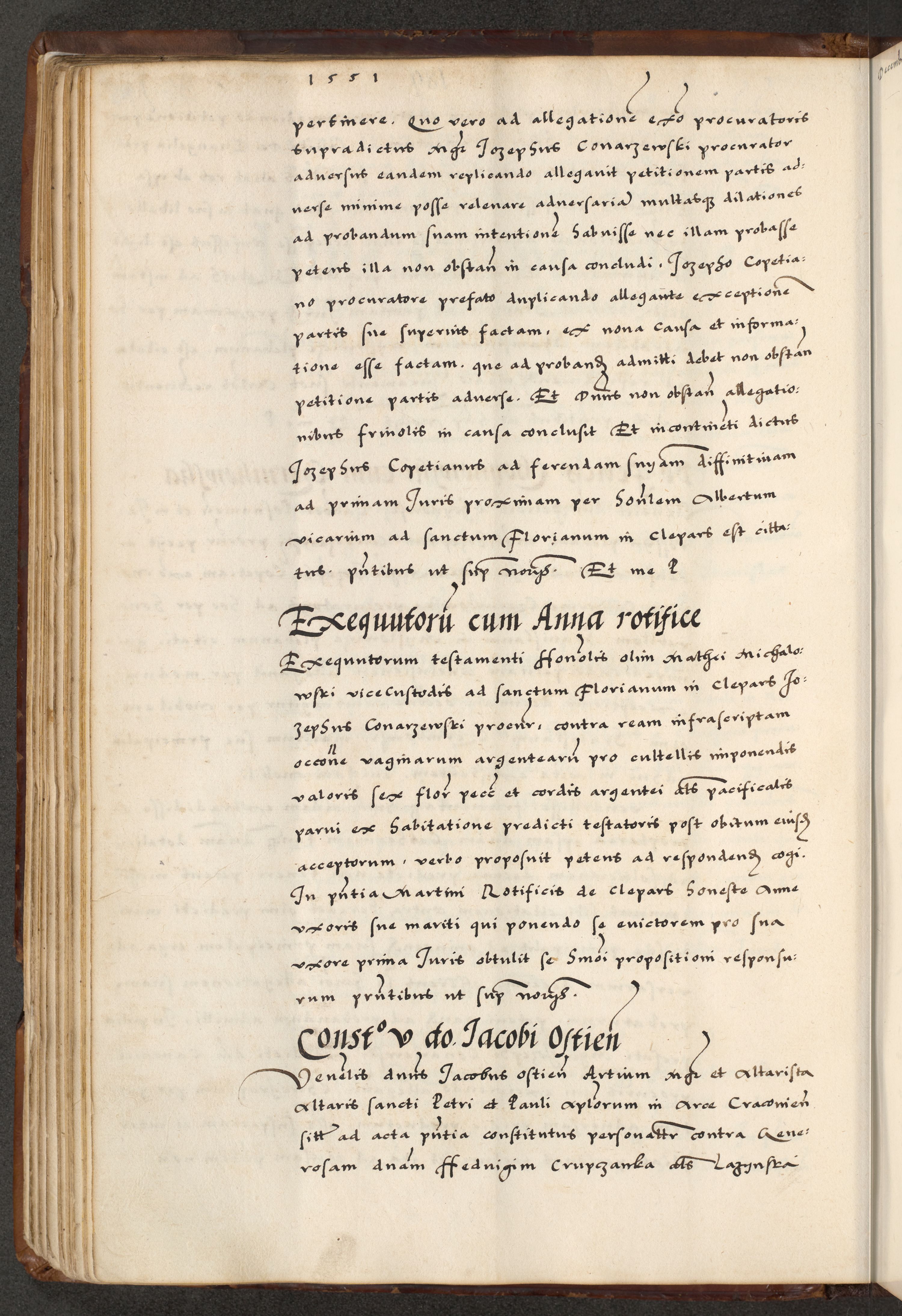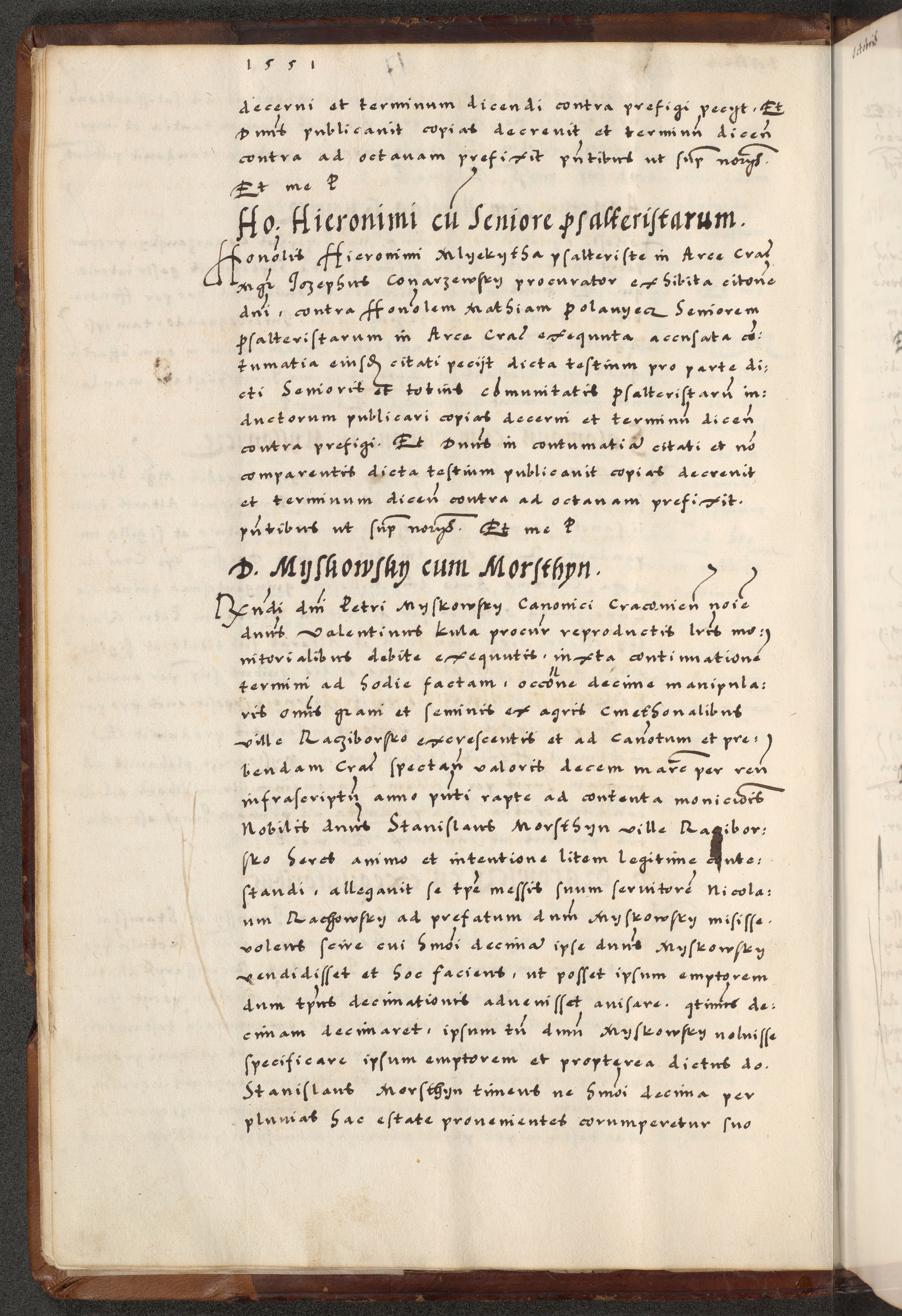 [A]cta actorum causarum, sententiarum tam diffinitivarum quam interloquutoriarum, obligationum, constitutionum et contractuum coram reverendo patre domino Petro Porembski preposito Osvieczimensi, canonico et officiali generali Cracoviensi de anno Domini millesimo quingentesimo quinguagesimo primo, cuius indictio est nona, pontificatus sanctissimi in Christo patris et domini nostri domini Juliii divina providencia pape tercii, anno secundo, a die et mense infrascriptis feliciter continiantur