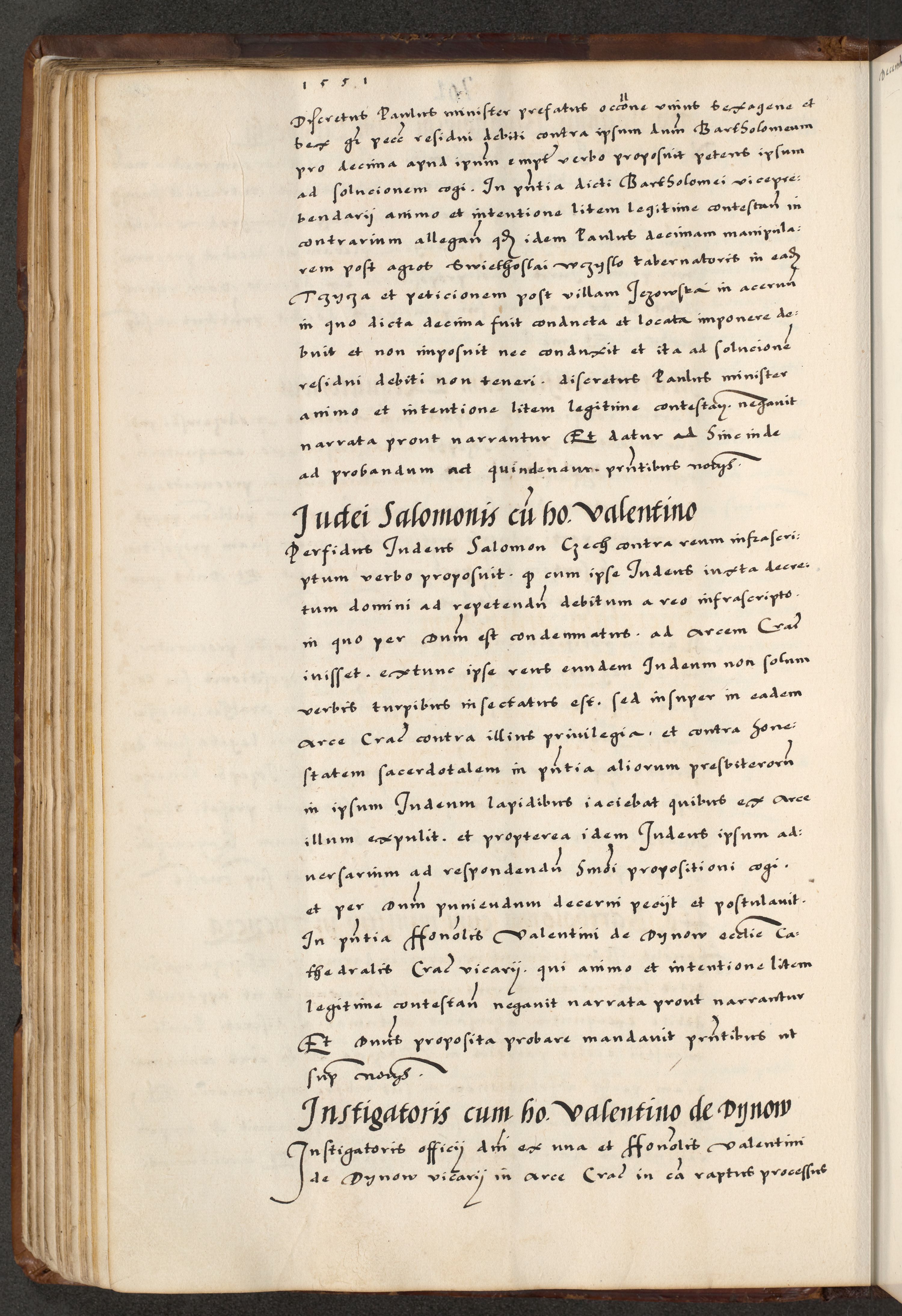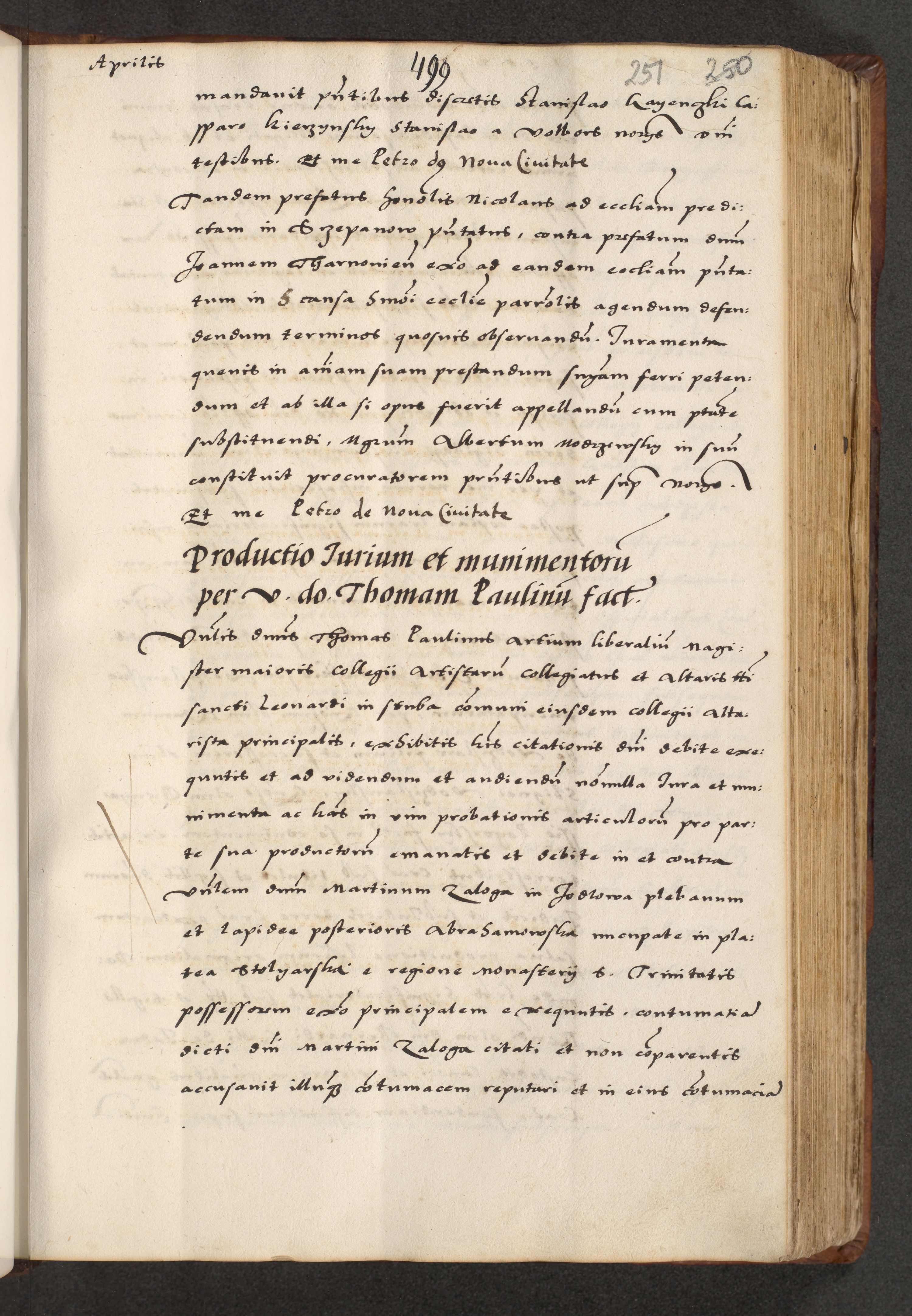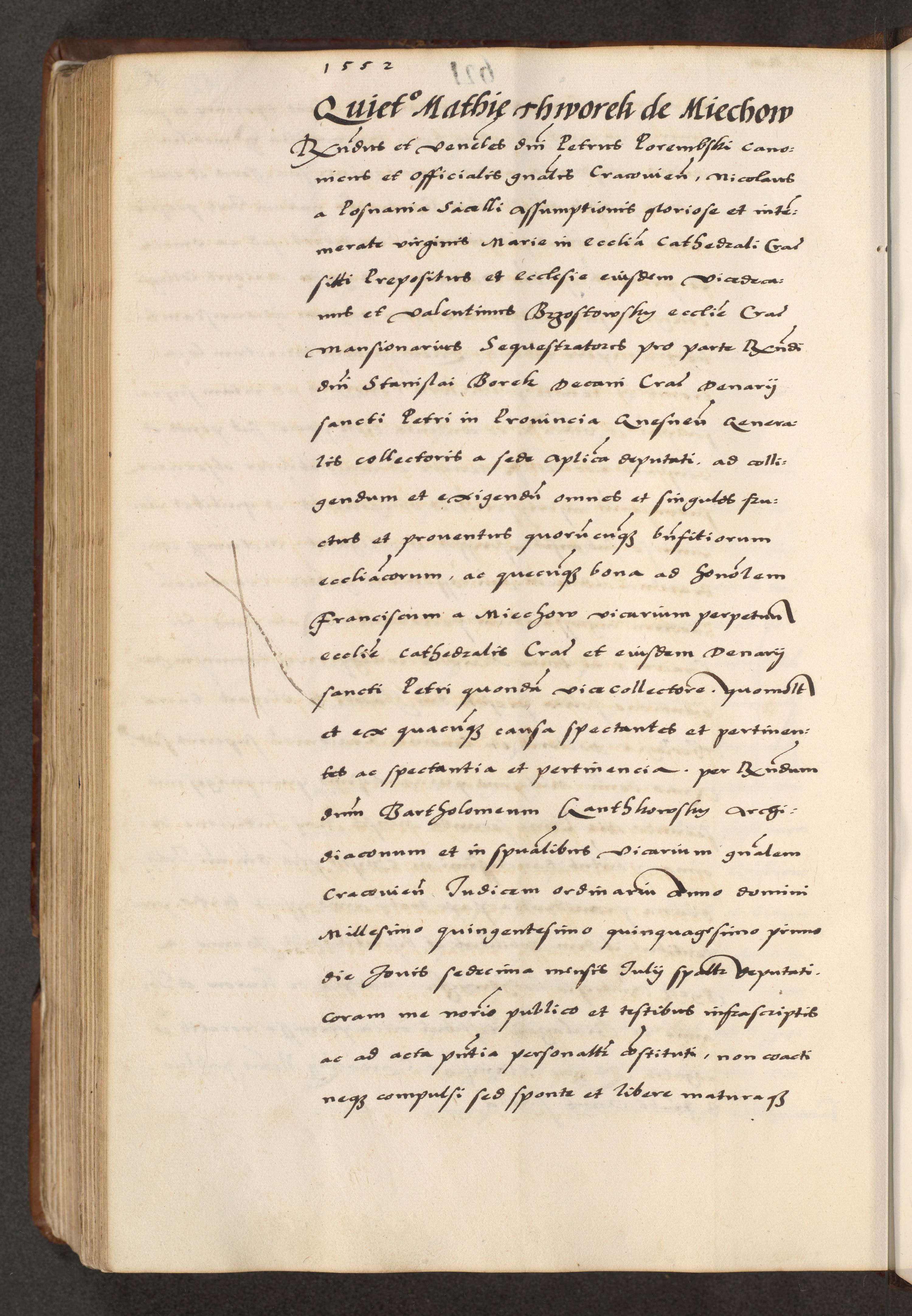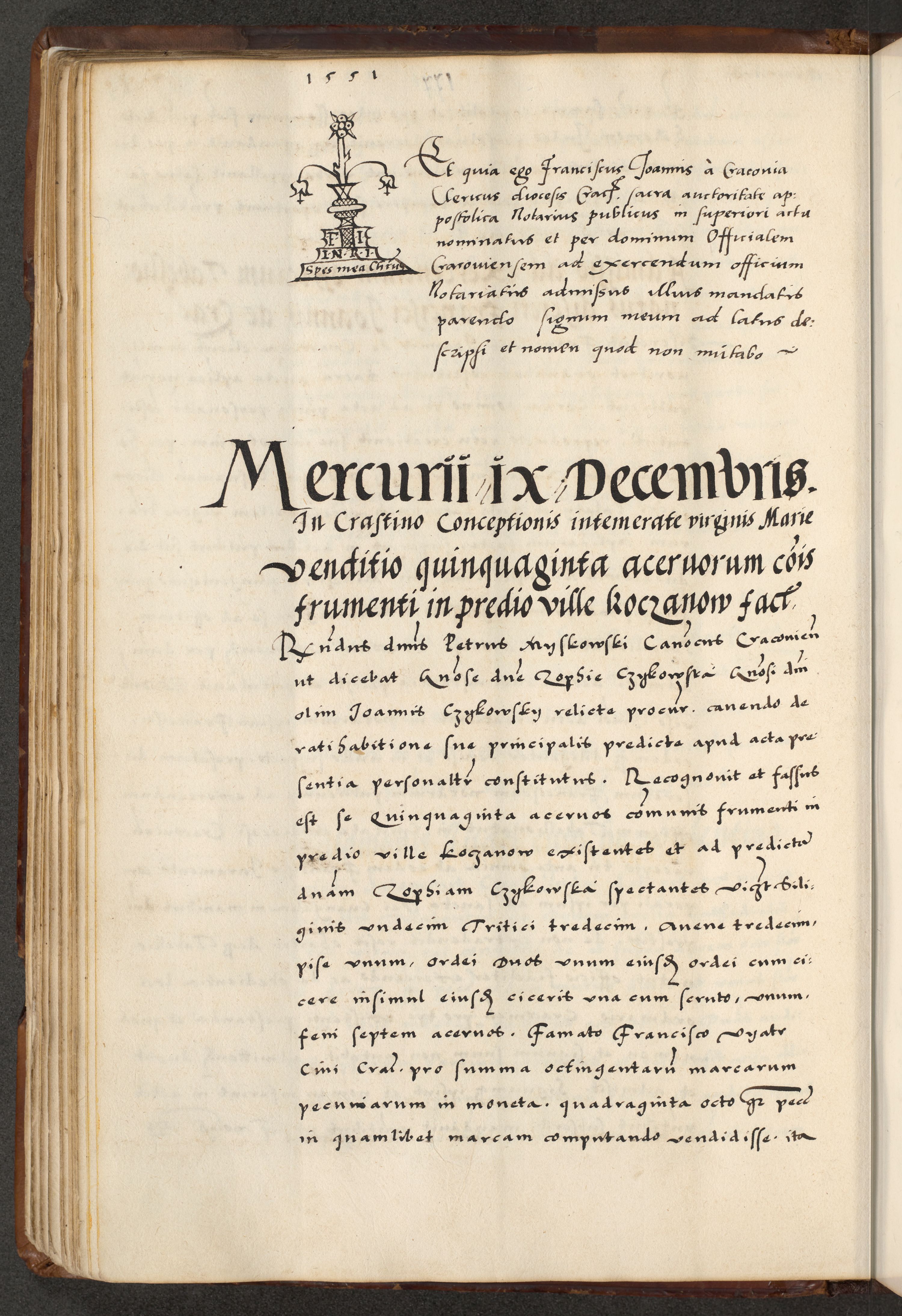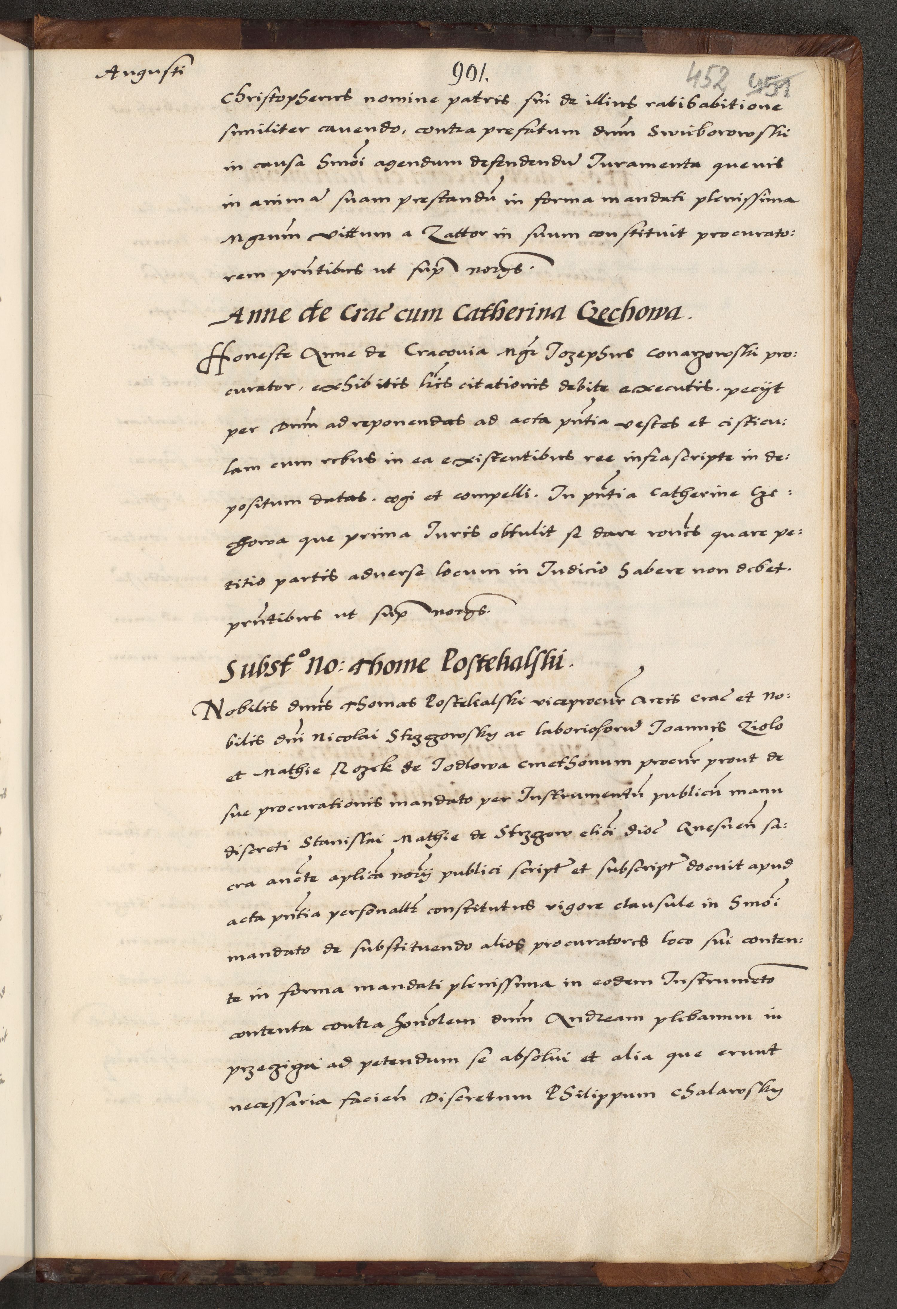 [A]cta actorum causarum, sententiarum tam diffinitivarum quam interloquutoriarum, obligationum, constitutionum et contractuum coram reverendo patre domino Petro Porembski preposito Osvieczimensi, canonico et officiali generali Cracoviensi de anno Domini millesimo quingentesimo quinguagesimo primo, cuius indictio est nona, pontificatus sanctissimi in Christo patris et domini nostri domini Juliii divina providencia pape tercii, anno secundo, a die et mense infrascriptis feliciter continiantur