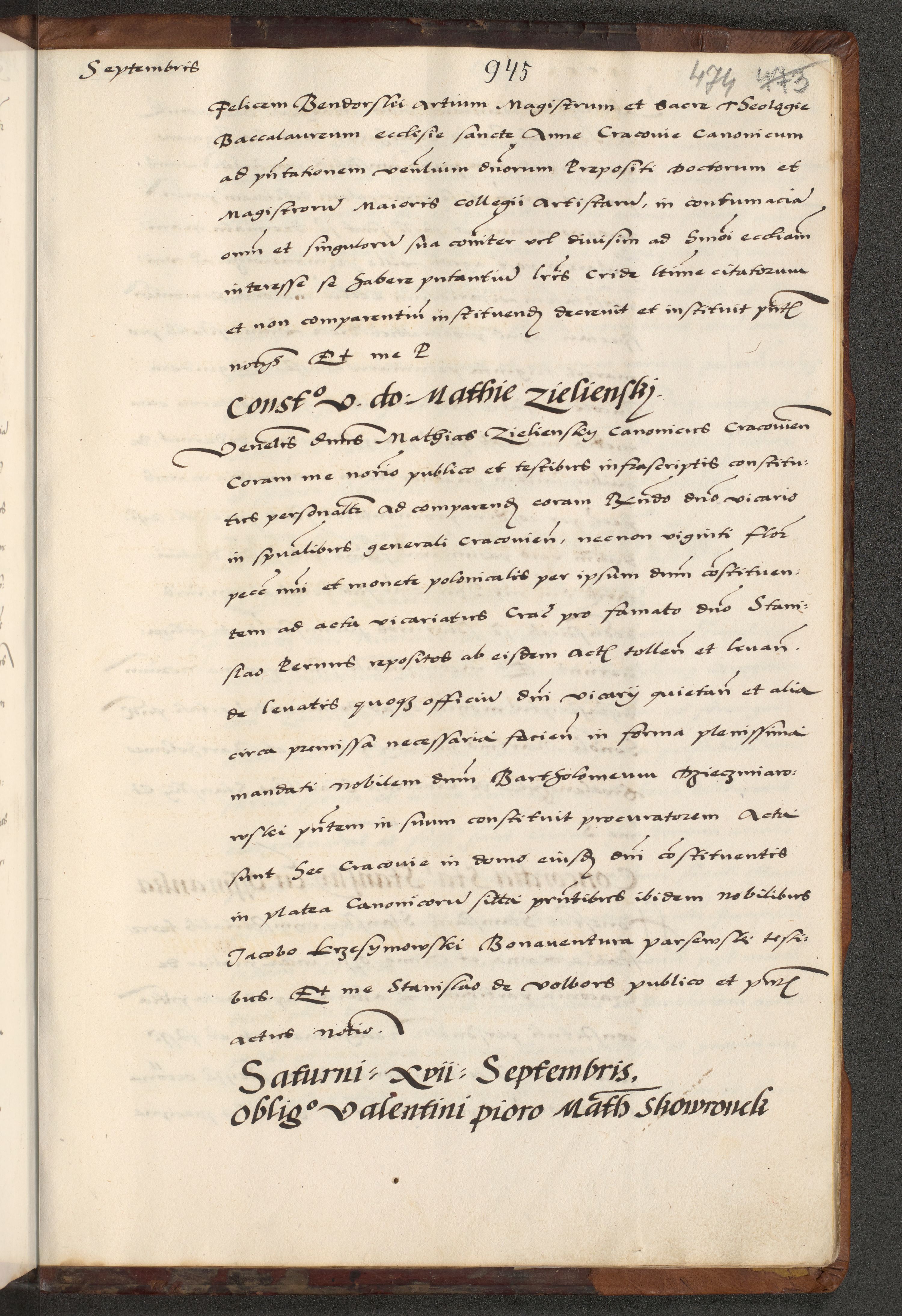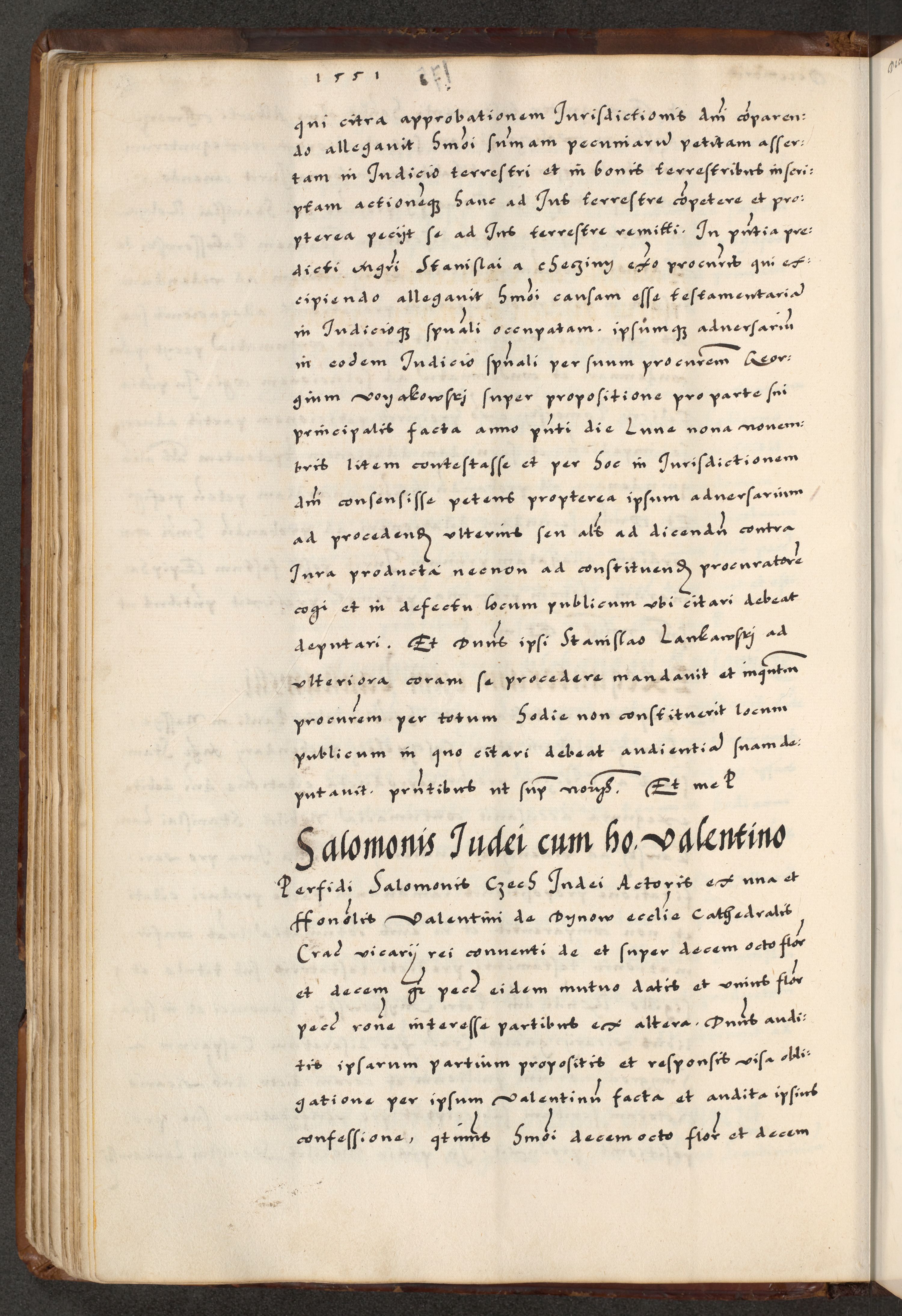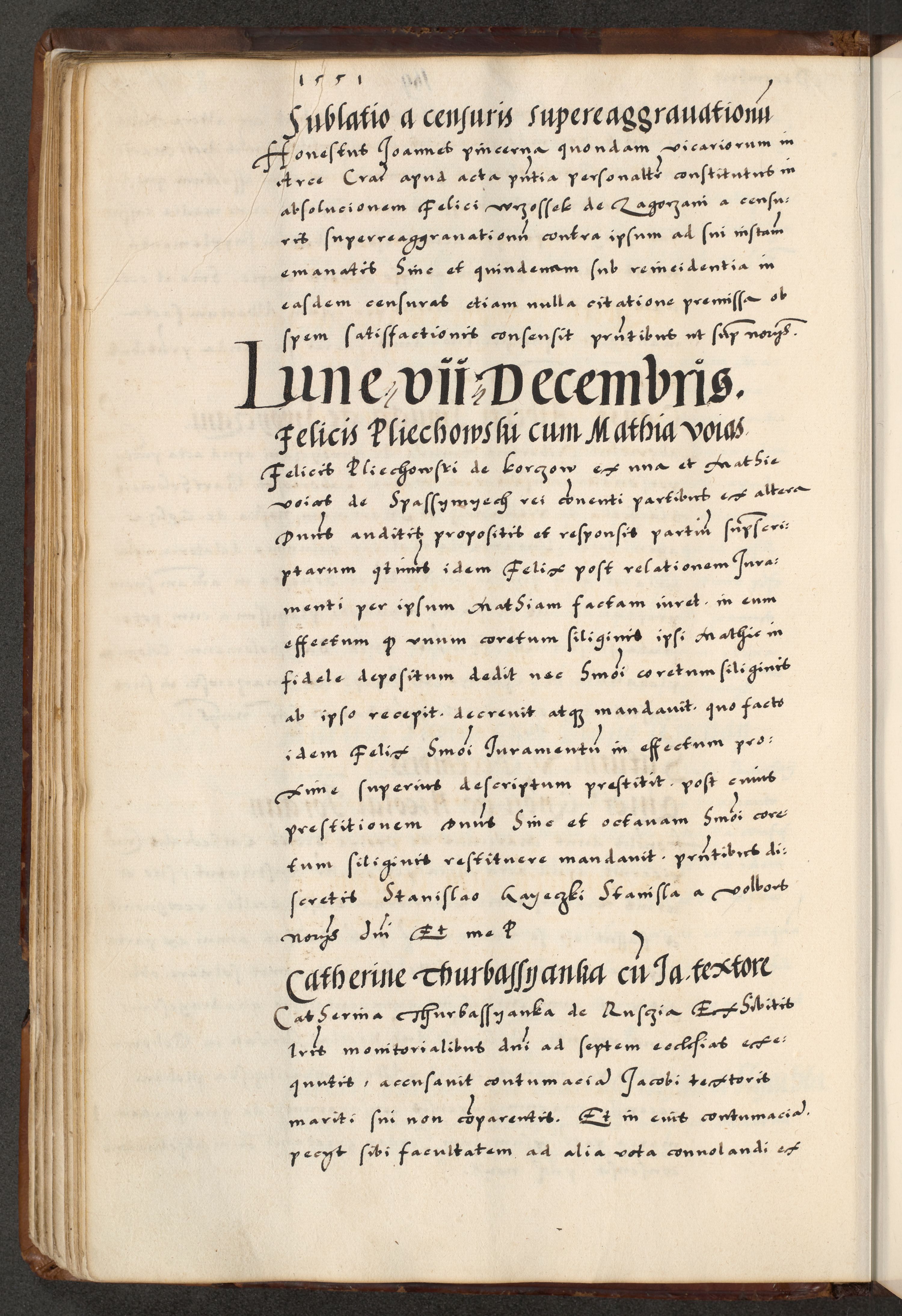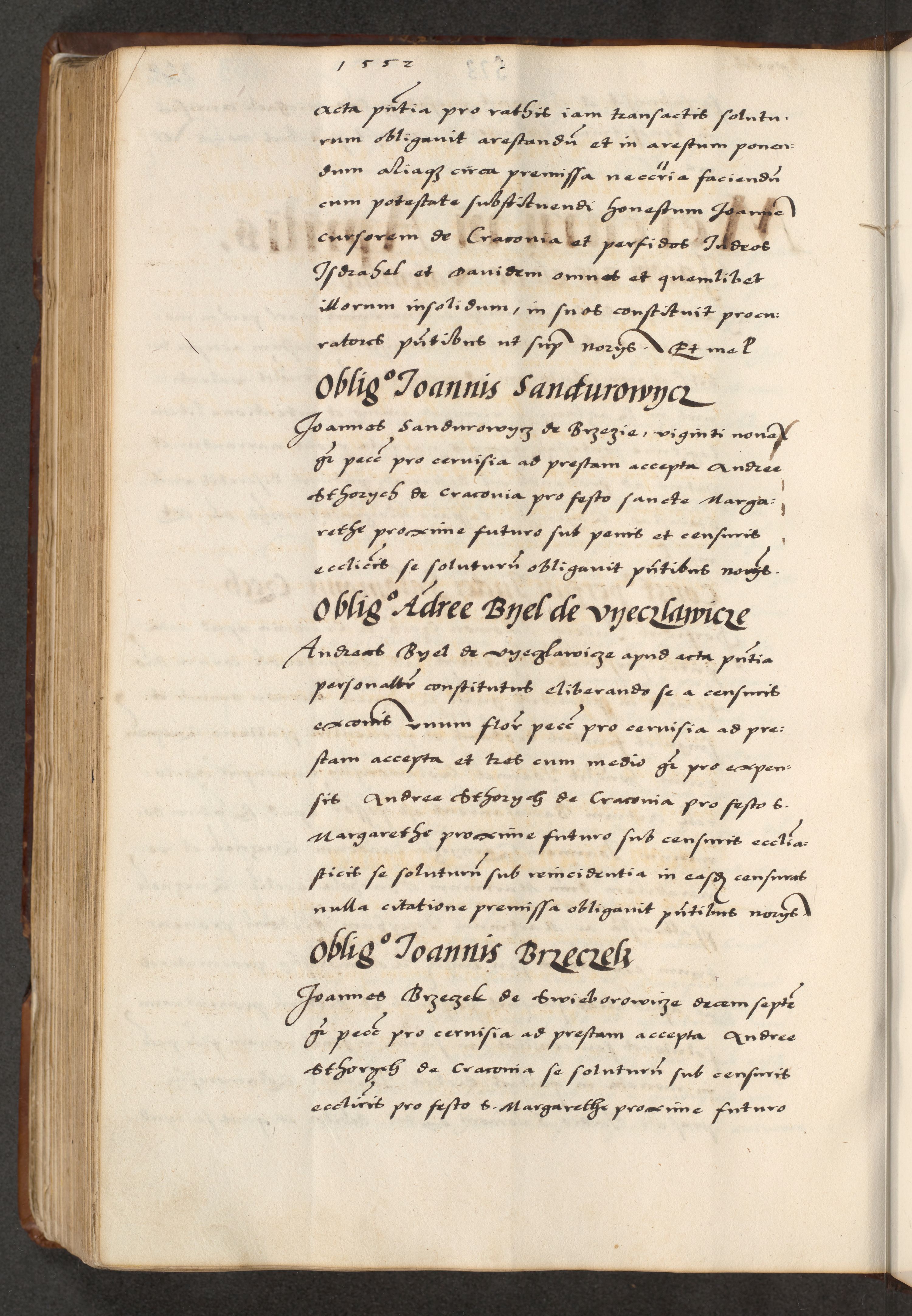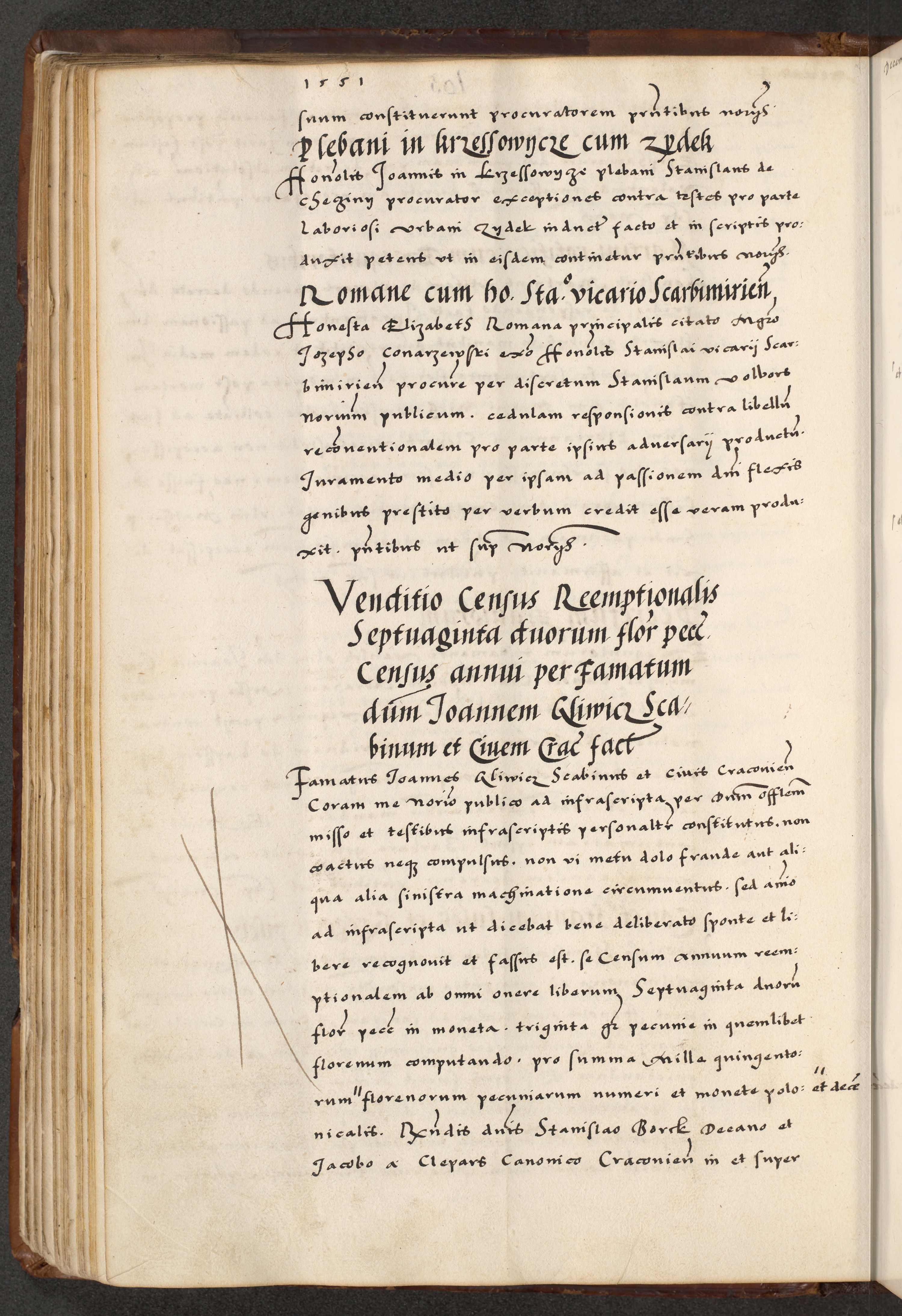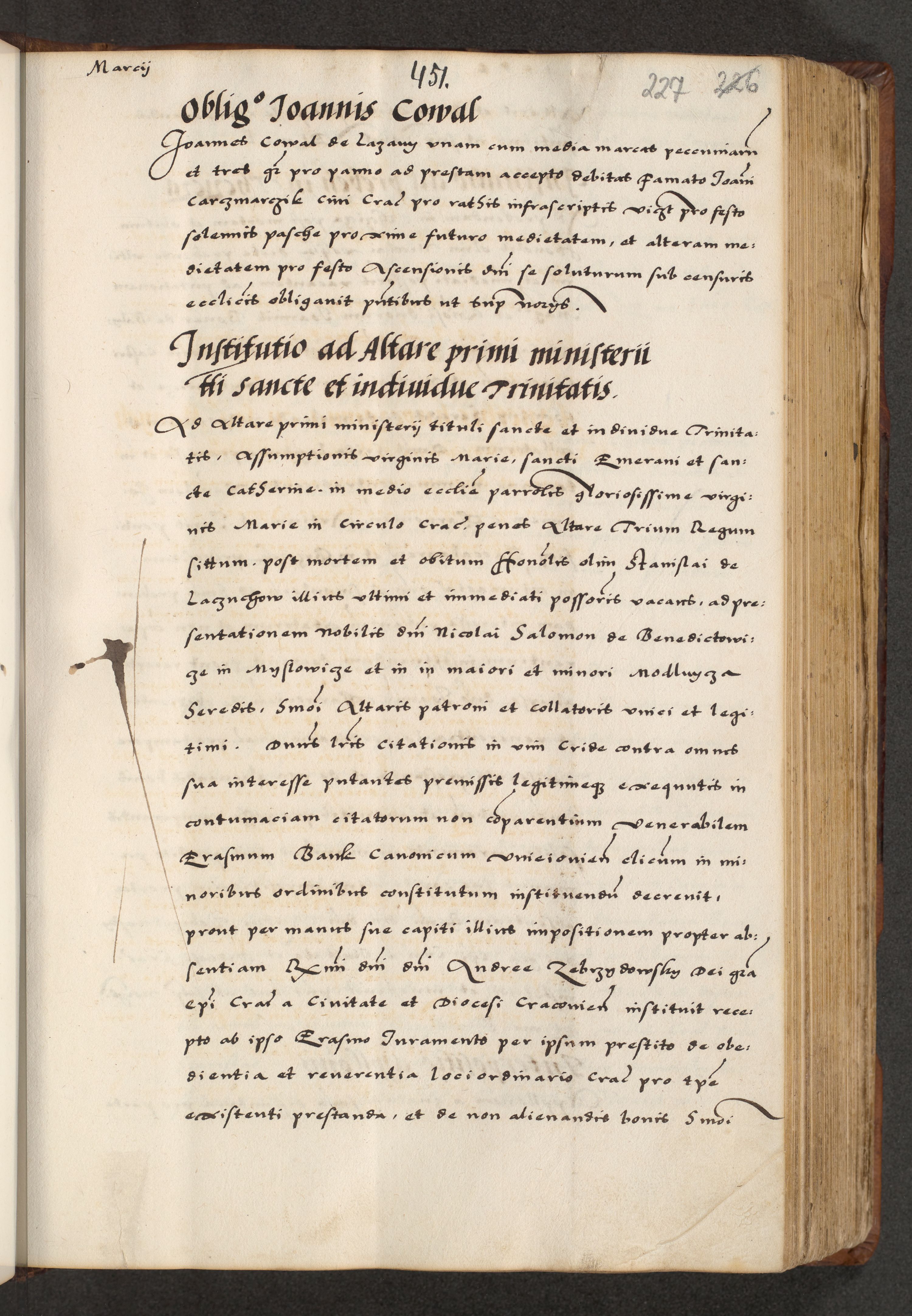 [A]cta actorum causarum, sententiarum tam diffinitivarum quam interloquutoriarum, obligationum, constitutionum et contractuum coram reverendo patre domino Petro Porembski preposito Osvieczimensi, canonico et officiali generali Cracoviensi de anno Domini millesimo quingentesimo quinguagesimo primo, cuius indictio est nona, pontificatus sanctissimi in Christo patris et domini nostri domini Juliii divina providencia pape tercii, anno secundo, a die et mense infrascriptis feliciter continiantur