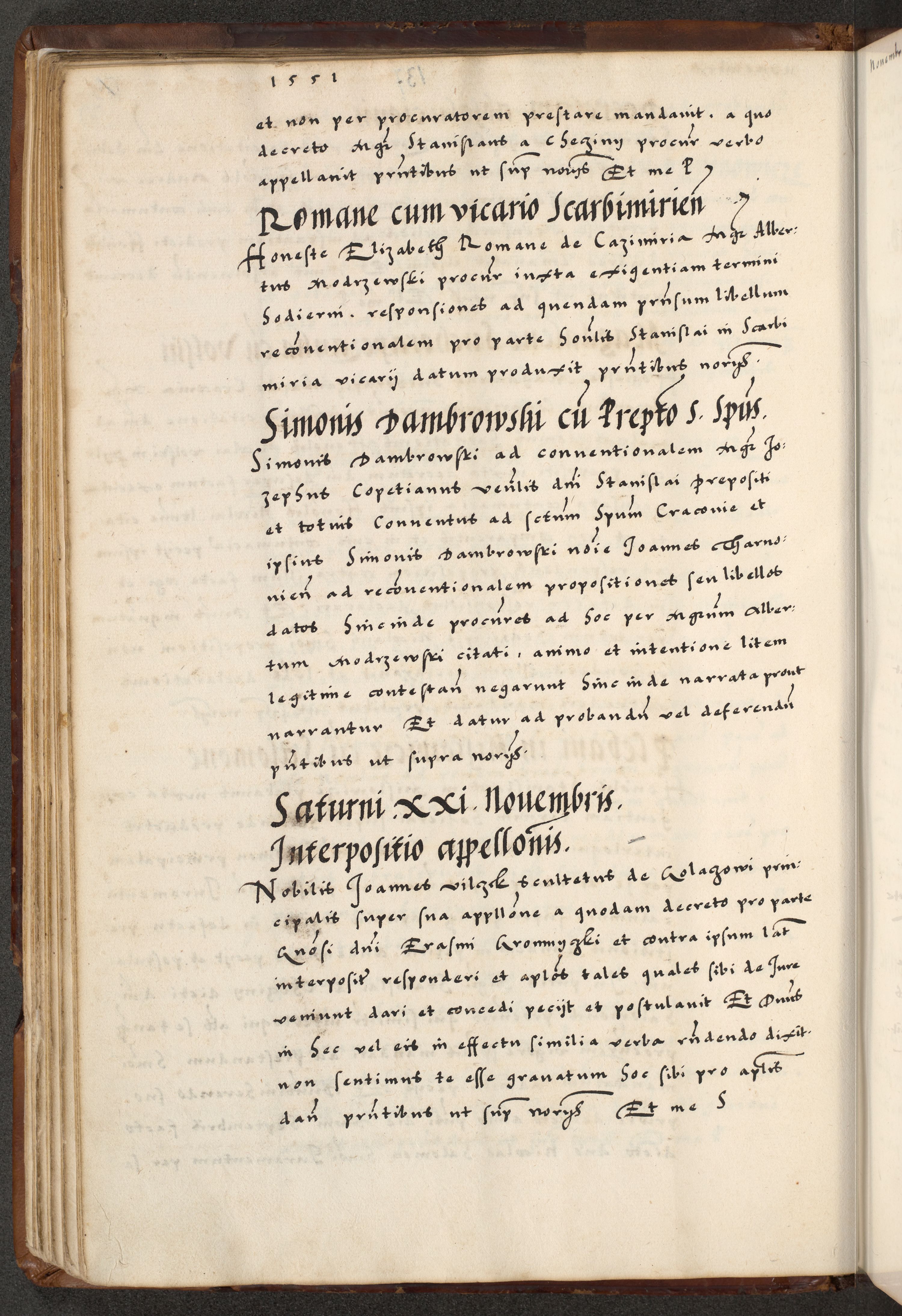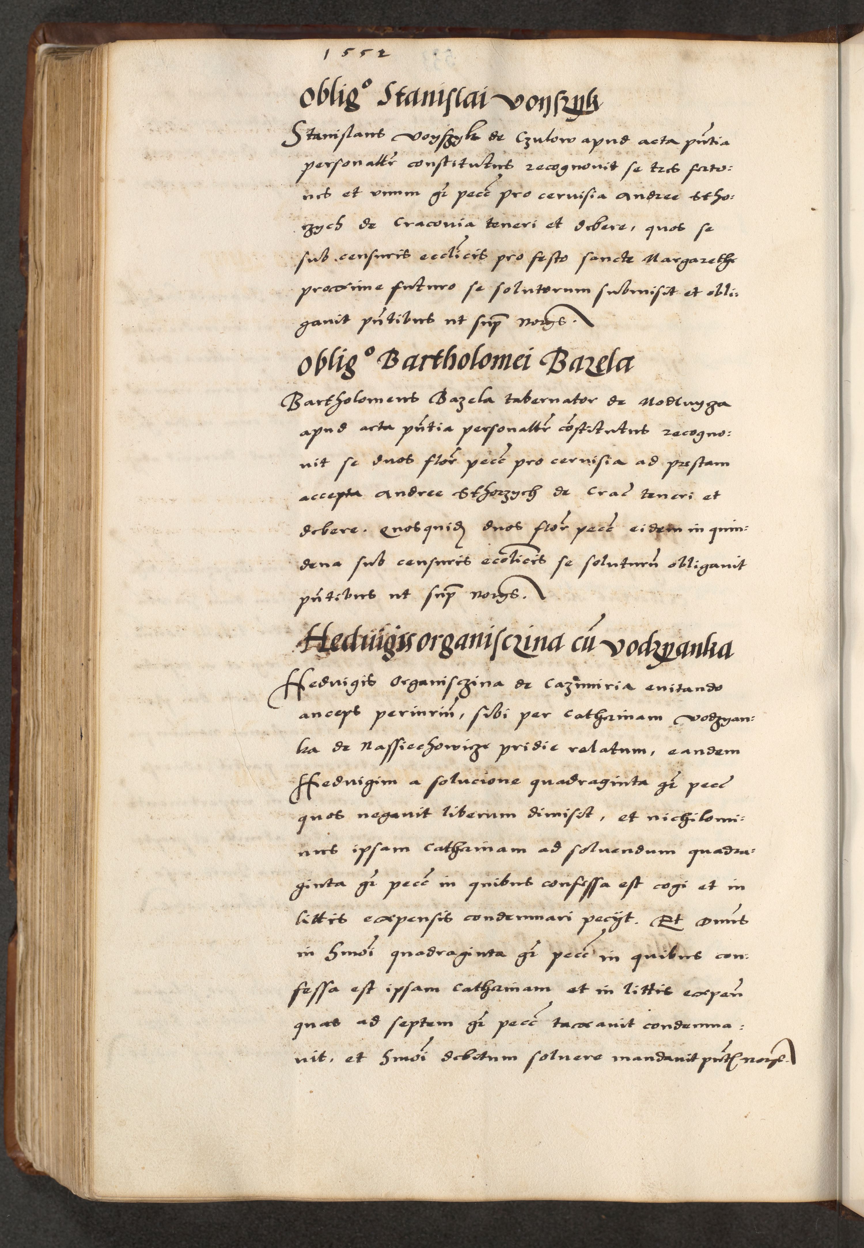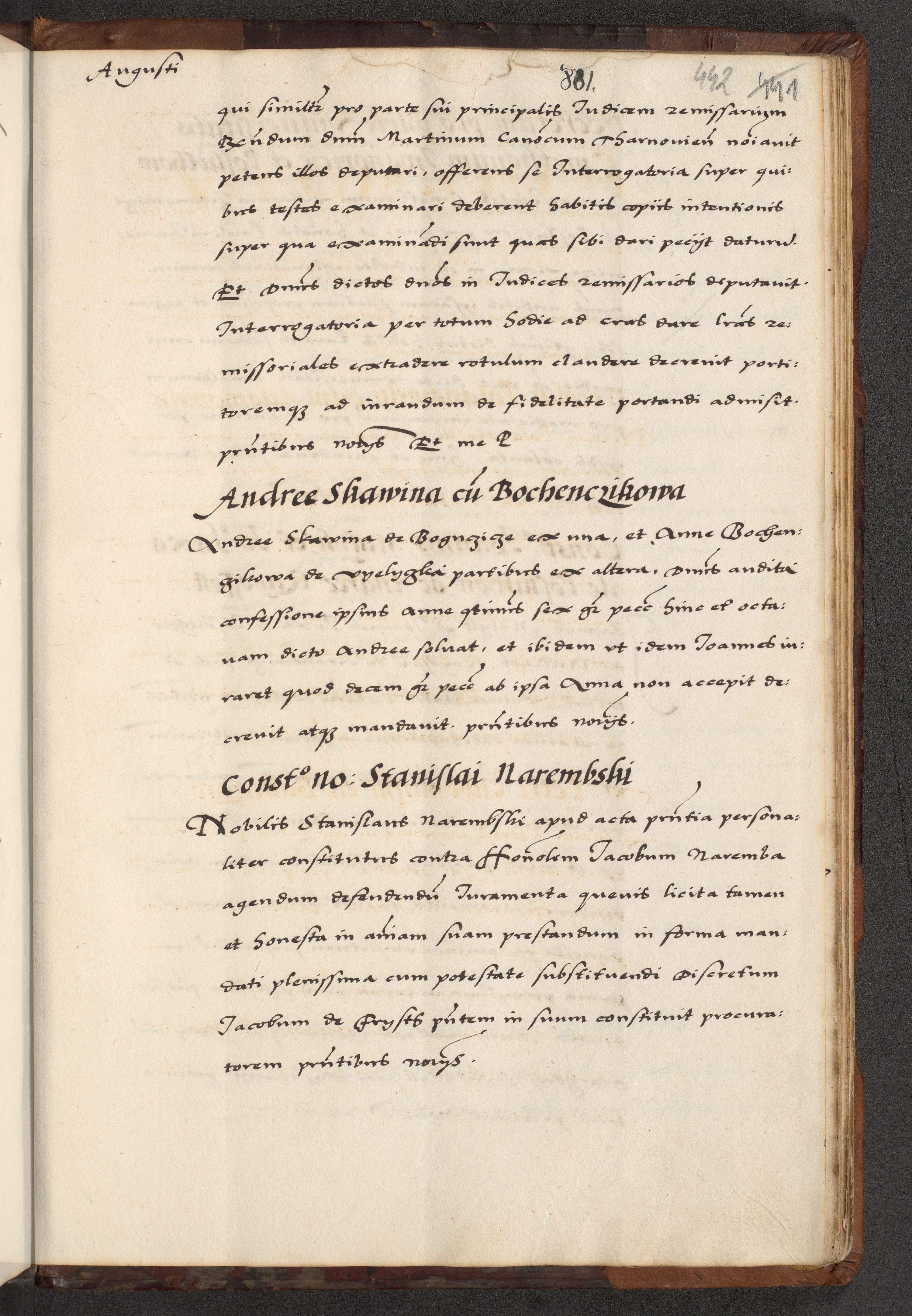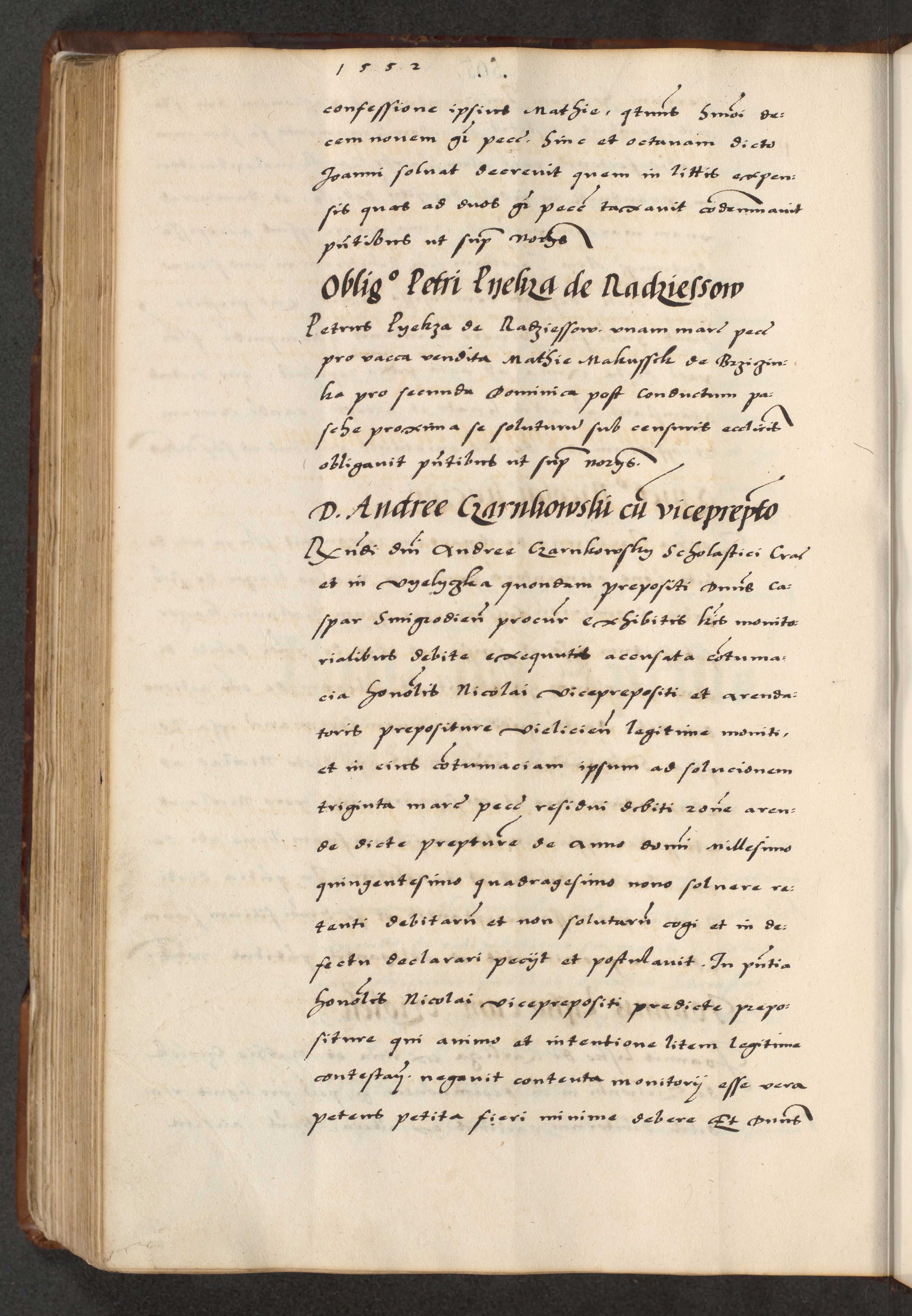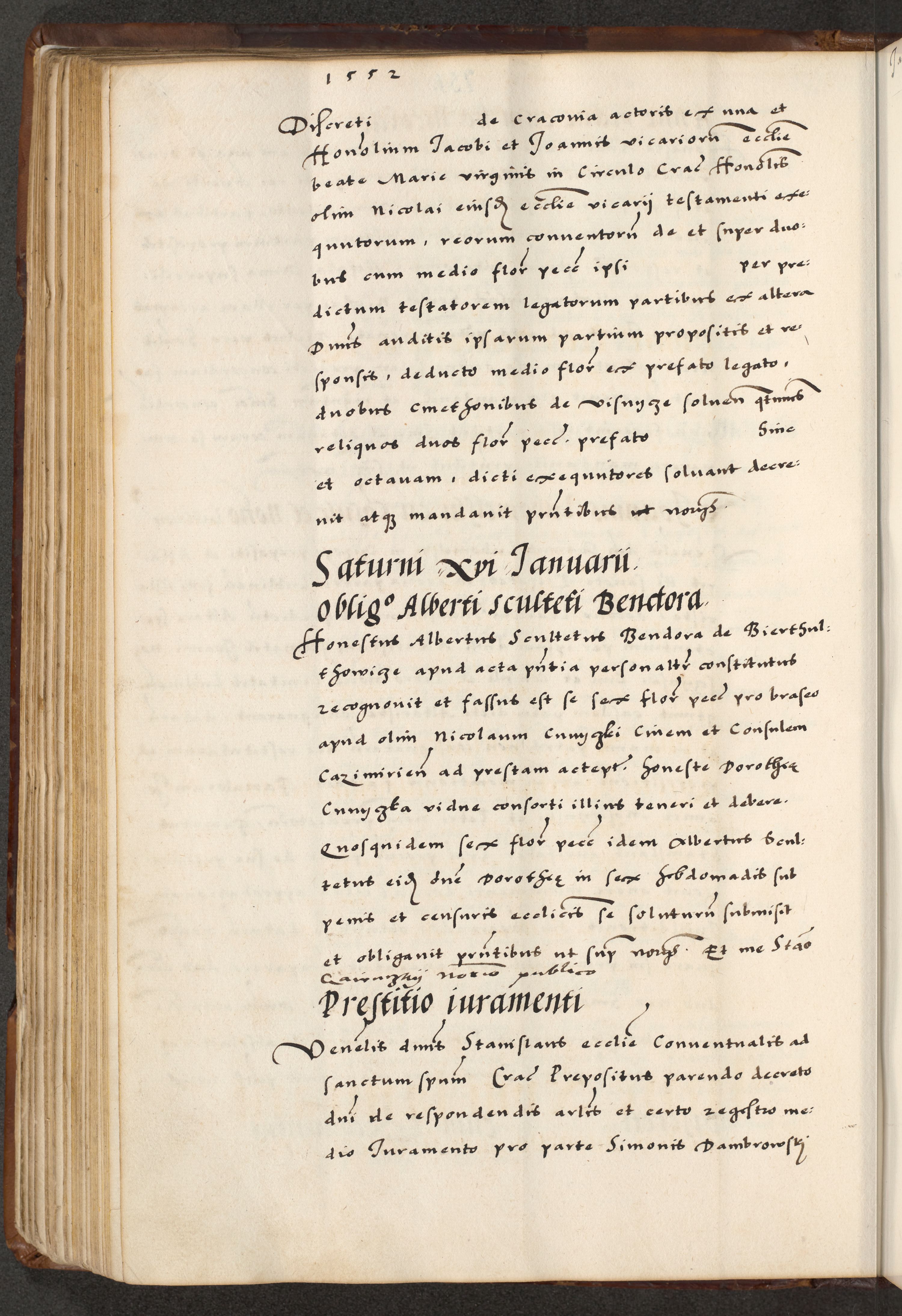 [A]cta actorum causarum, sententiarum tam diffinitivarum quam interloquutoriarum, obligationum, constitutionum et contractuum coram reverendo patre domino Petro Porembski preposito Osvieczimensi, canonico et officiali generali Cracoviensi de anno Domini millesimo quingentesimo quinguagesimo primo, cuius indictio est nona, pontificatus sanctissimi in Christo patris et domini nostri domini Juliii divina providencia pape tercii, anno secundo, a die et mense infrascriptis feliciter continiantur