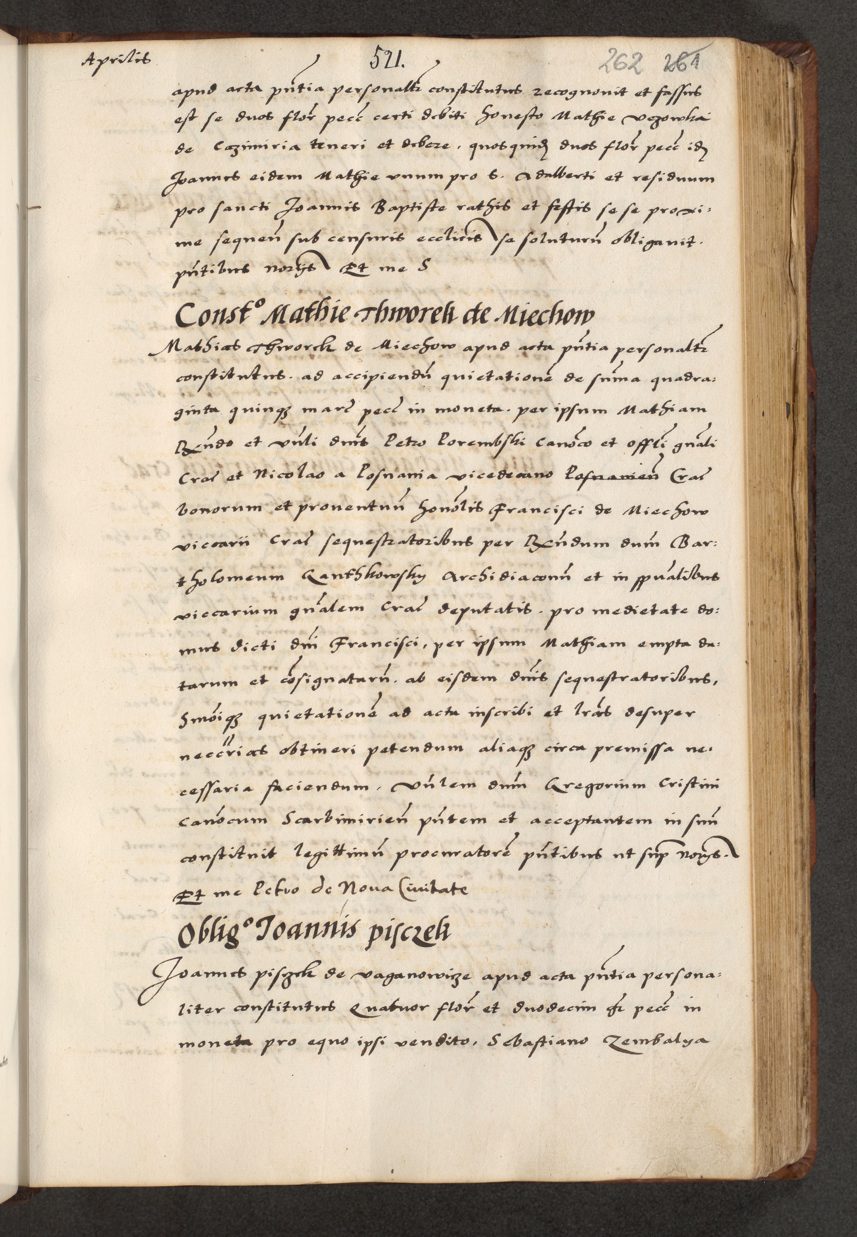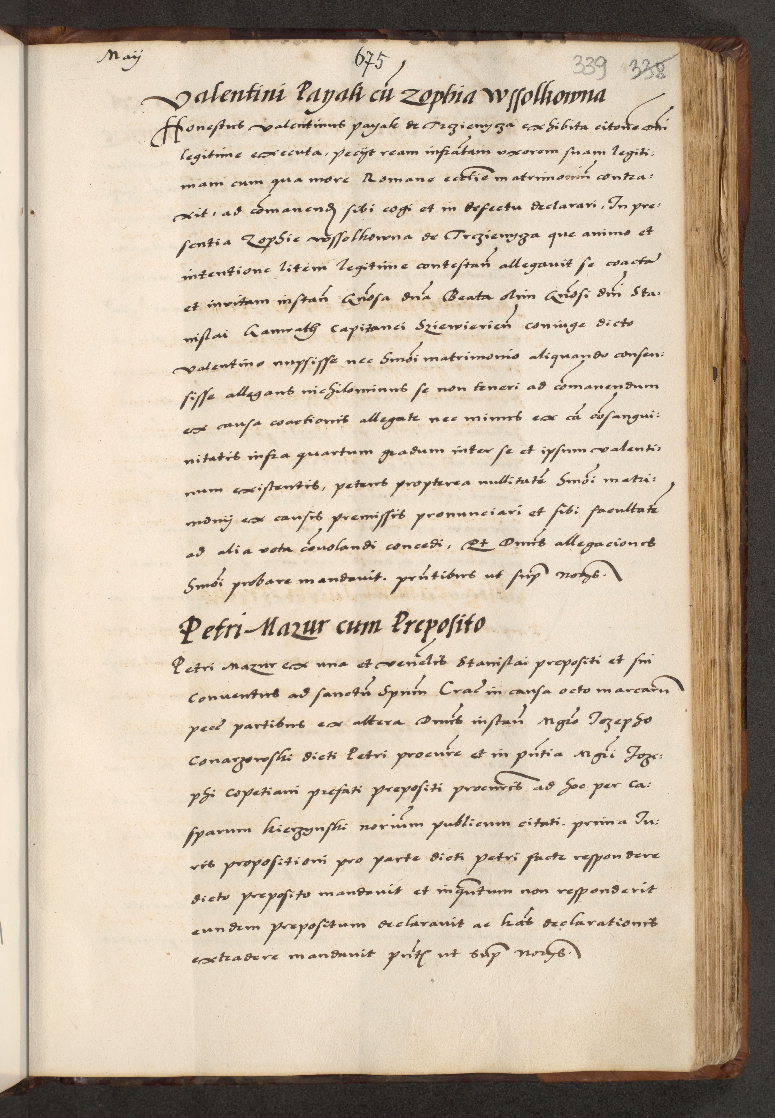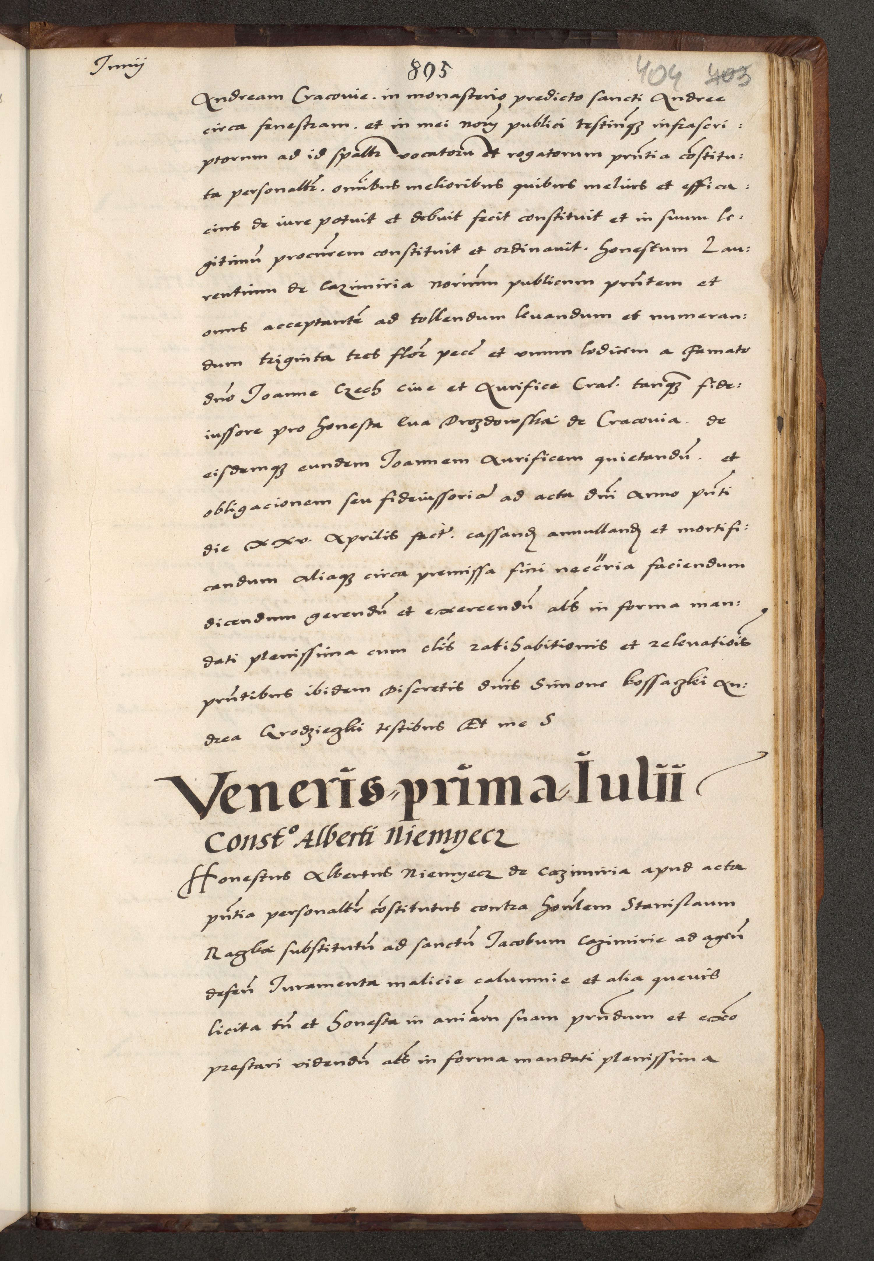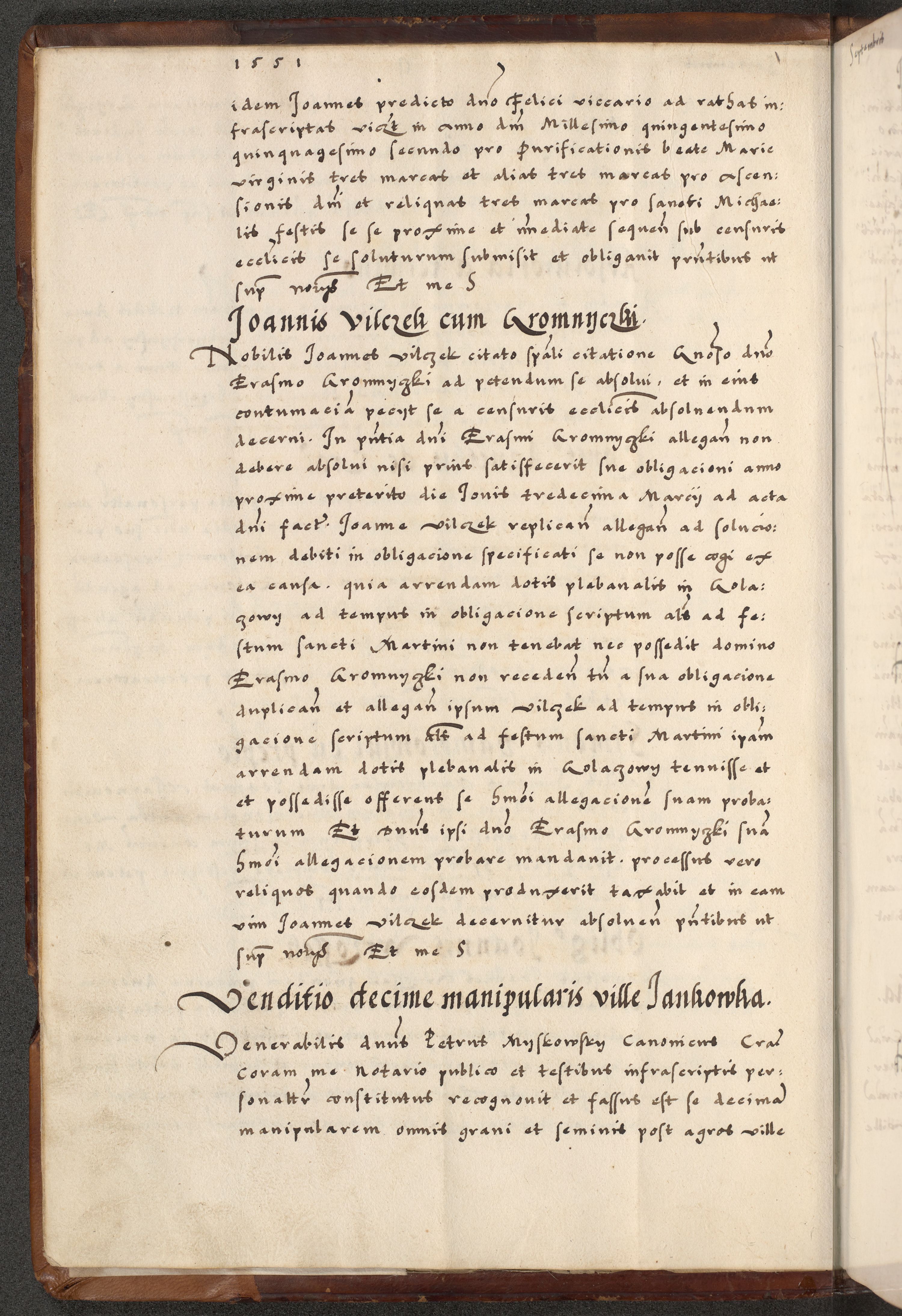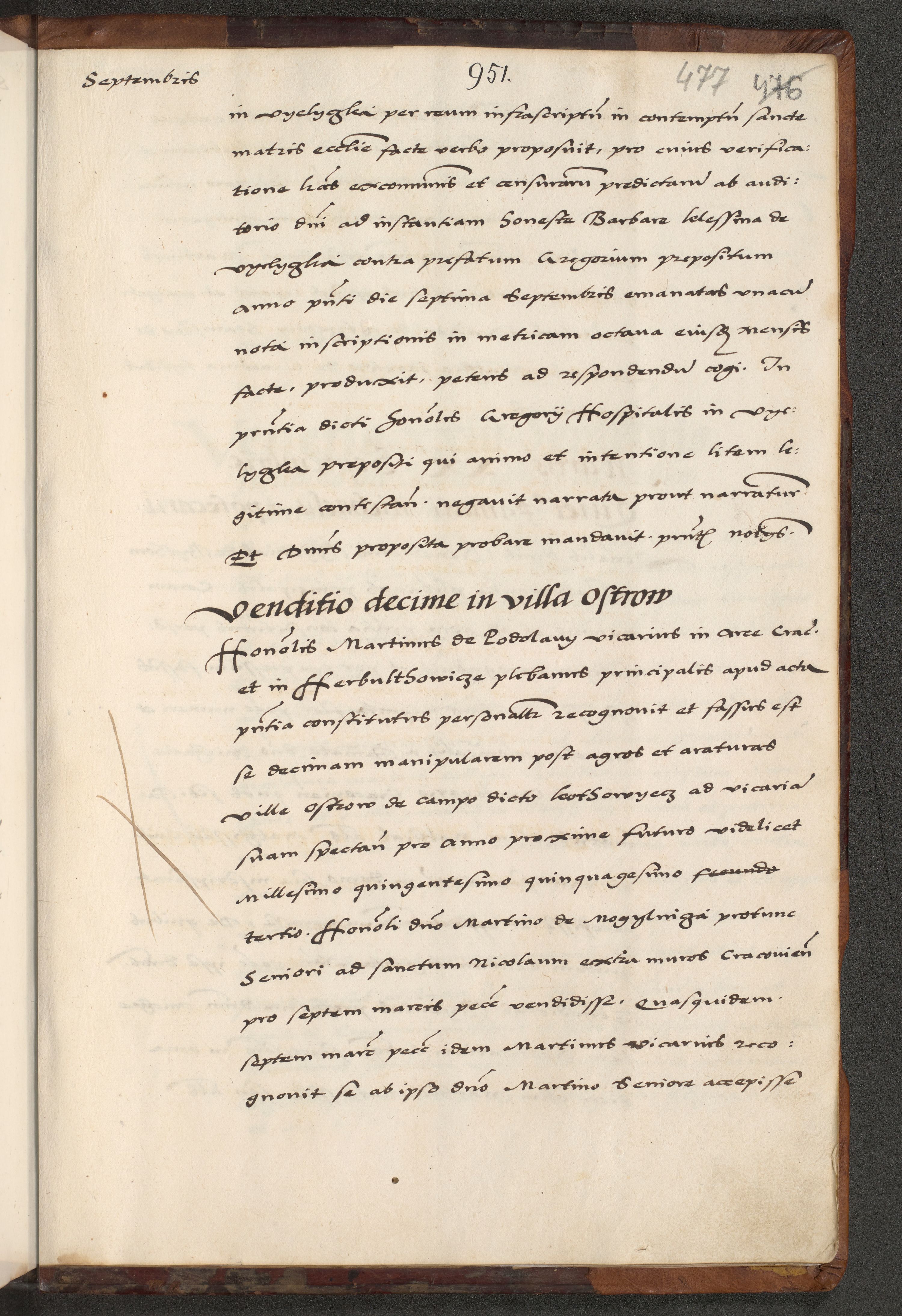 [A]cta actorum causarum, sententiarum tam diffinitivarum quam interloquutoriarum, obligationum, constitutionum et contractuum coram reverendo patre domino Petro Porembski preposito Osvieczimensi, canonico et officiali generali Cracoviensi de anno Domini millesimo quingentesimo quinguagesimo primo, cuius indictio est nona, pontificatus sanctissimi in Christo patris et domini nostri domini Juliii divina providencia pape tercii, anno secundo, a die et mense infrascriptis feliciter continiantur