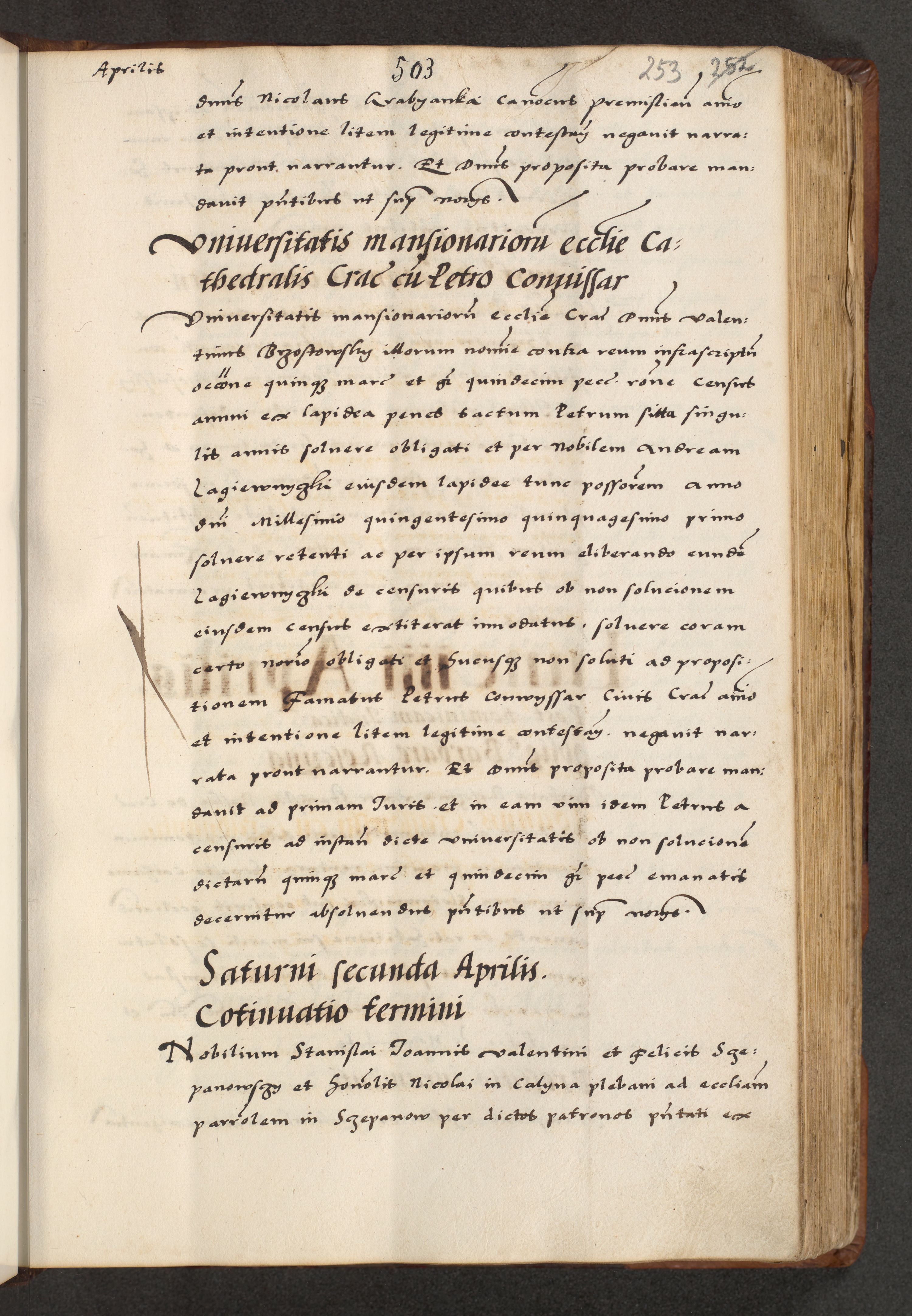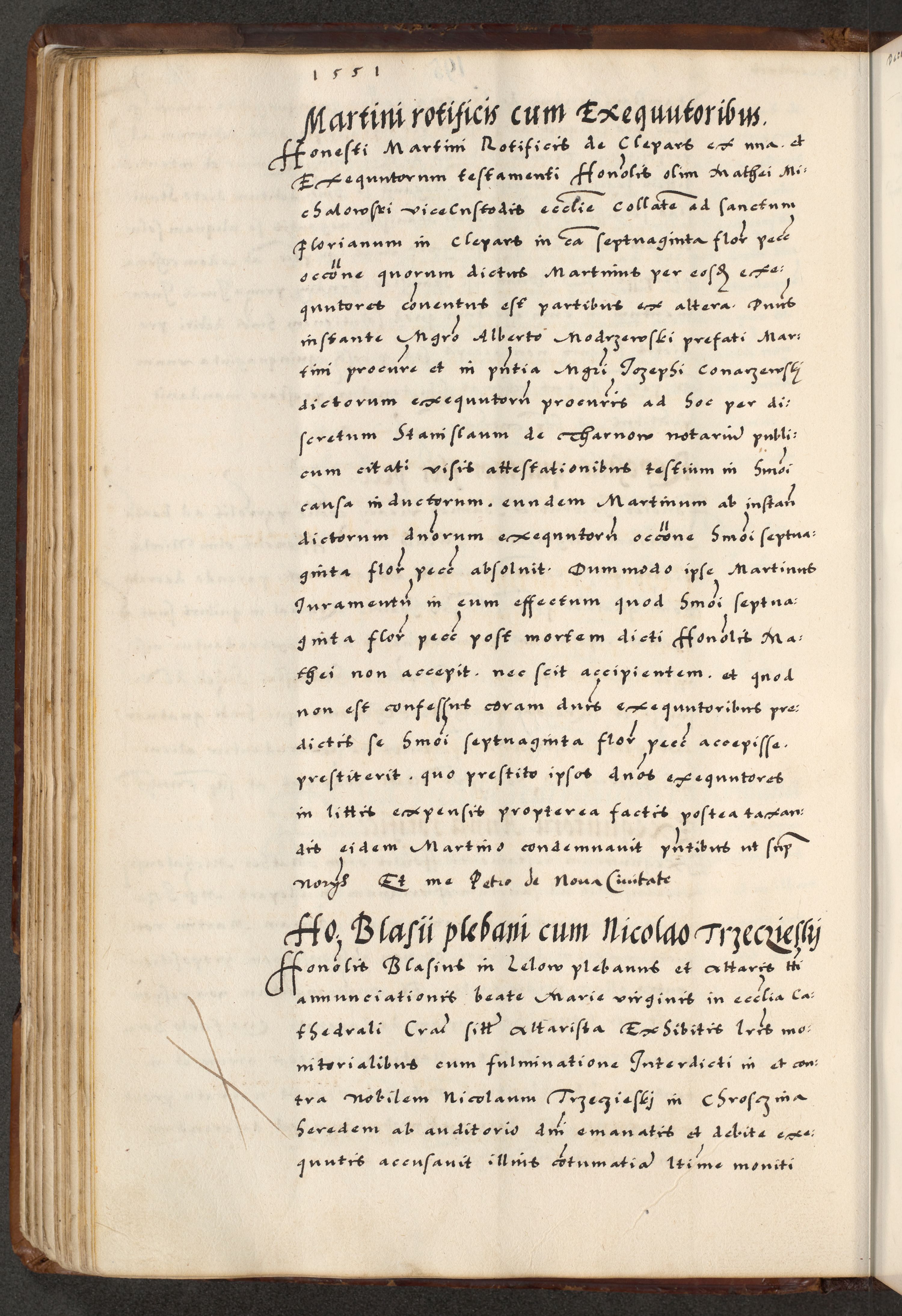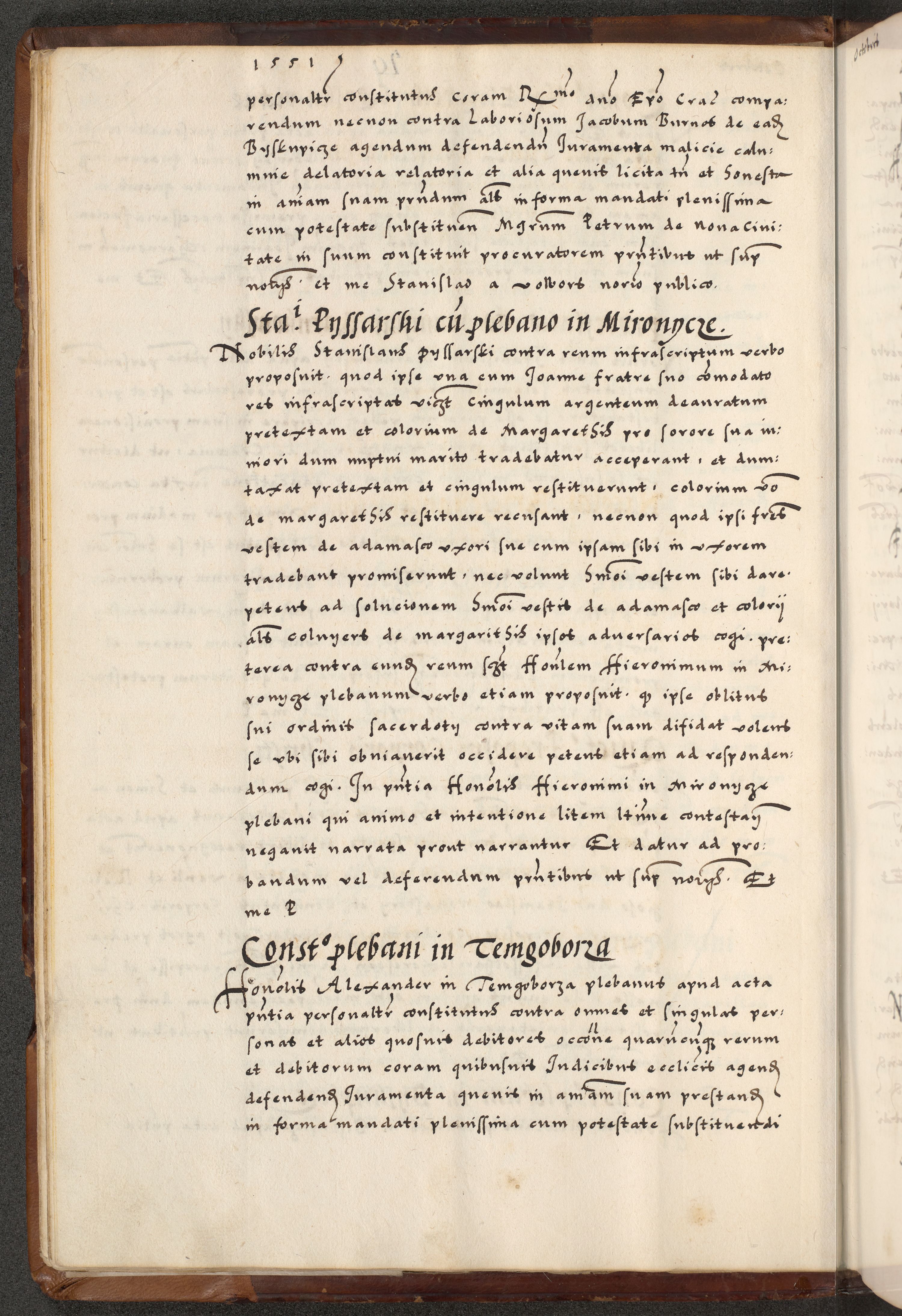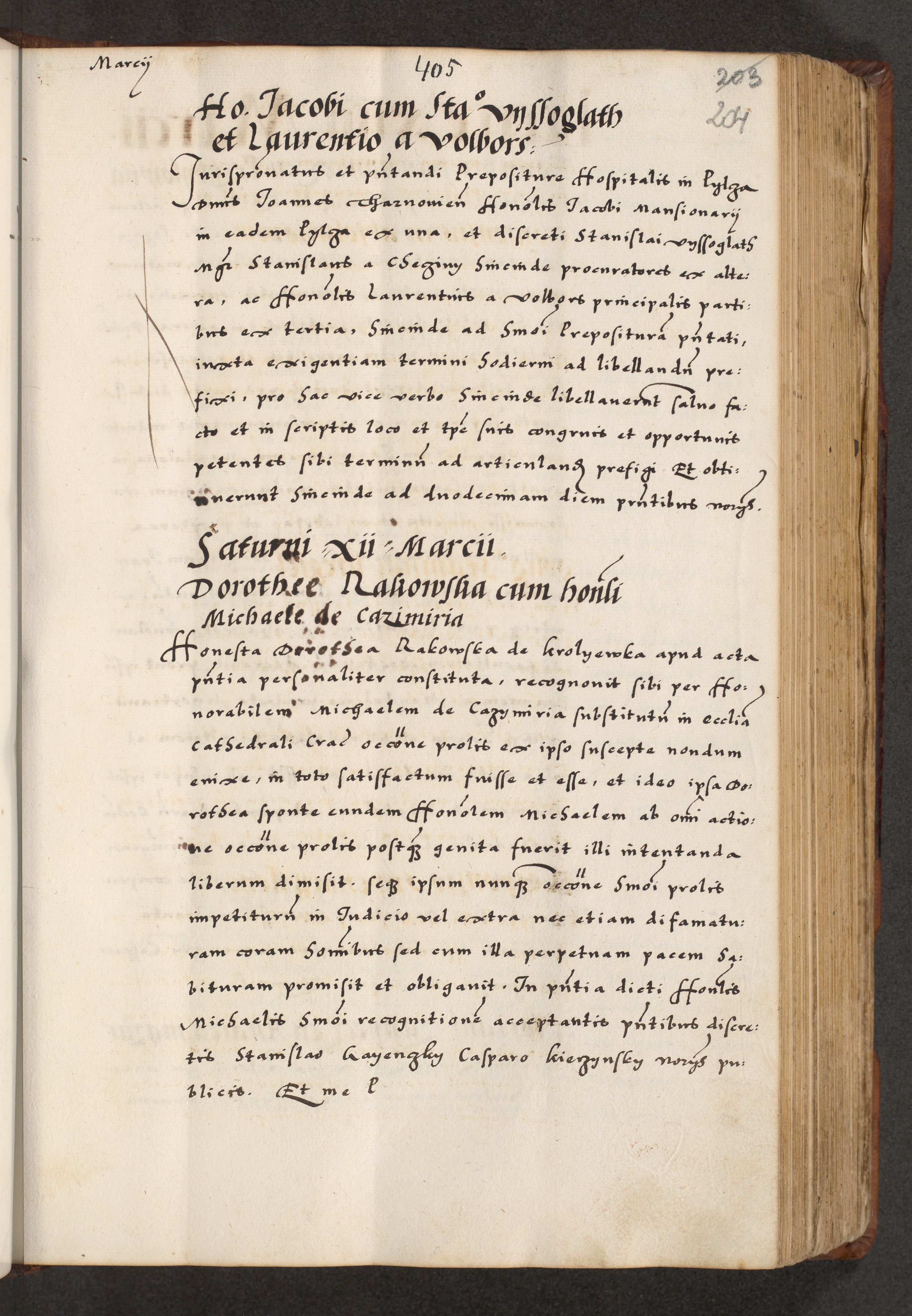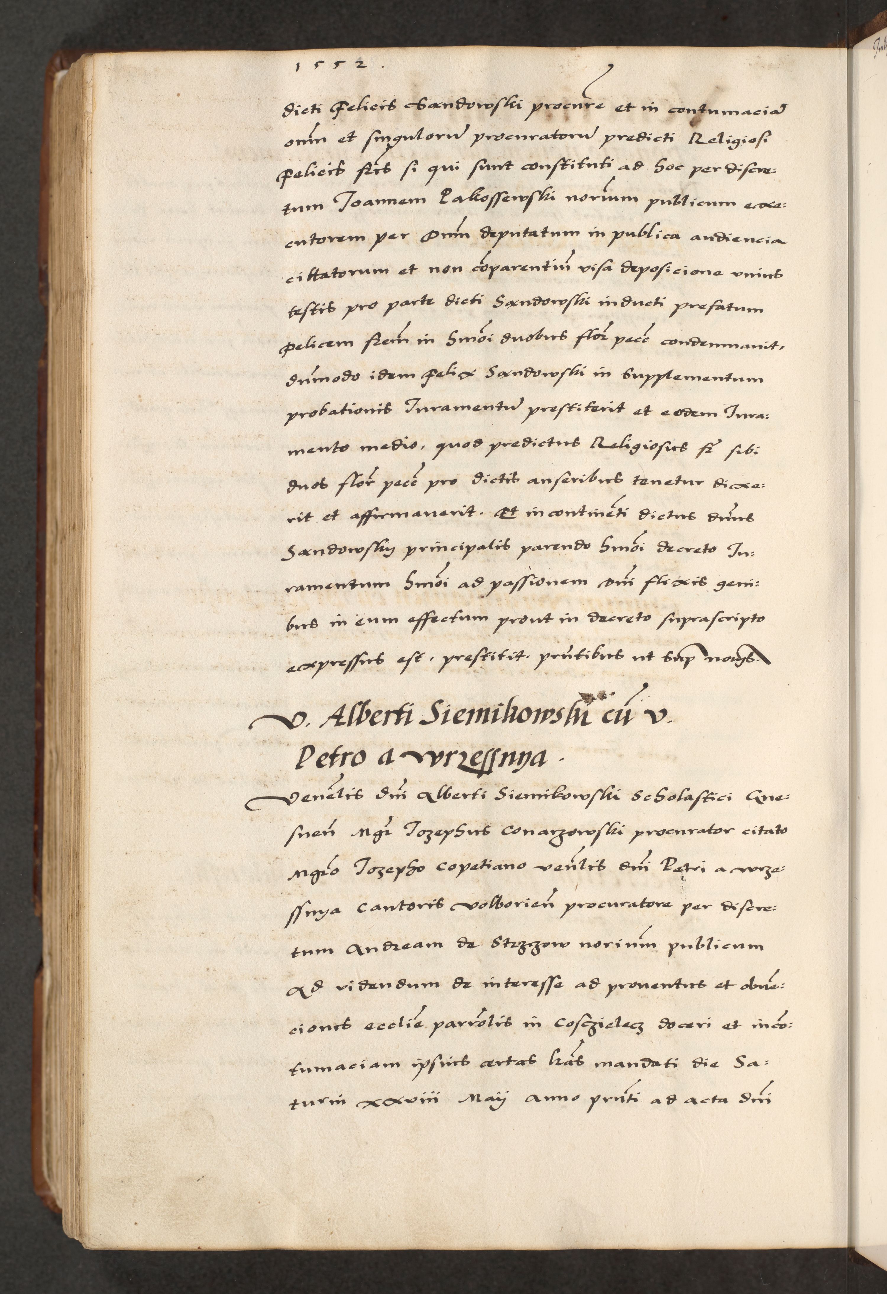 [A]cta actorum causarum, sententiarum tam diffinitivarum quam interloquutoriarum, obligationum, constitutionum et contractuum coram reverendo patre domino Petro Porembski preposito Osvieczimensi, canonico et officiali generali Cracoviensi de anno Domini millesimo quingentesimo quinguagesimo primo, cuius indictio est nona, pontificatus sanctissimi in Christo patris et domini nostri domini Juliii divina providencia pape tercii, anno secundo, a die et mense infrascriptis feliciter continiantur