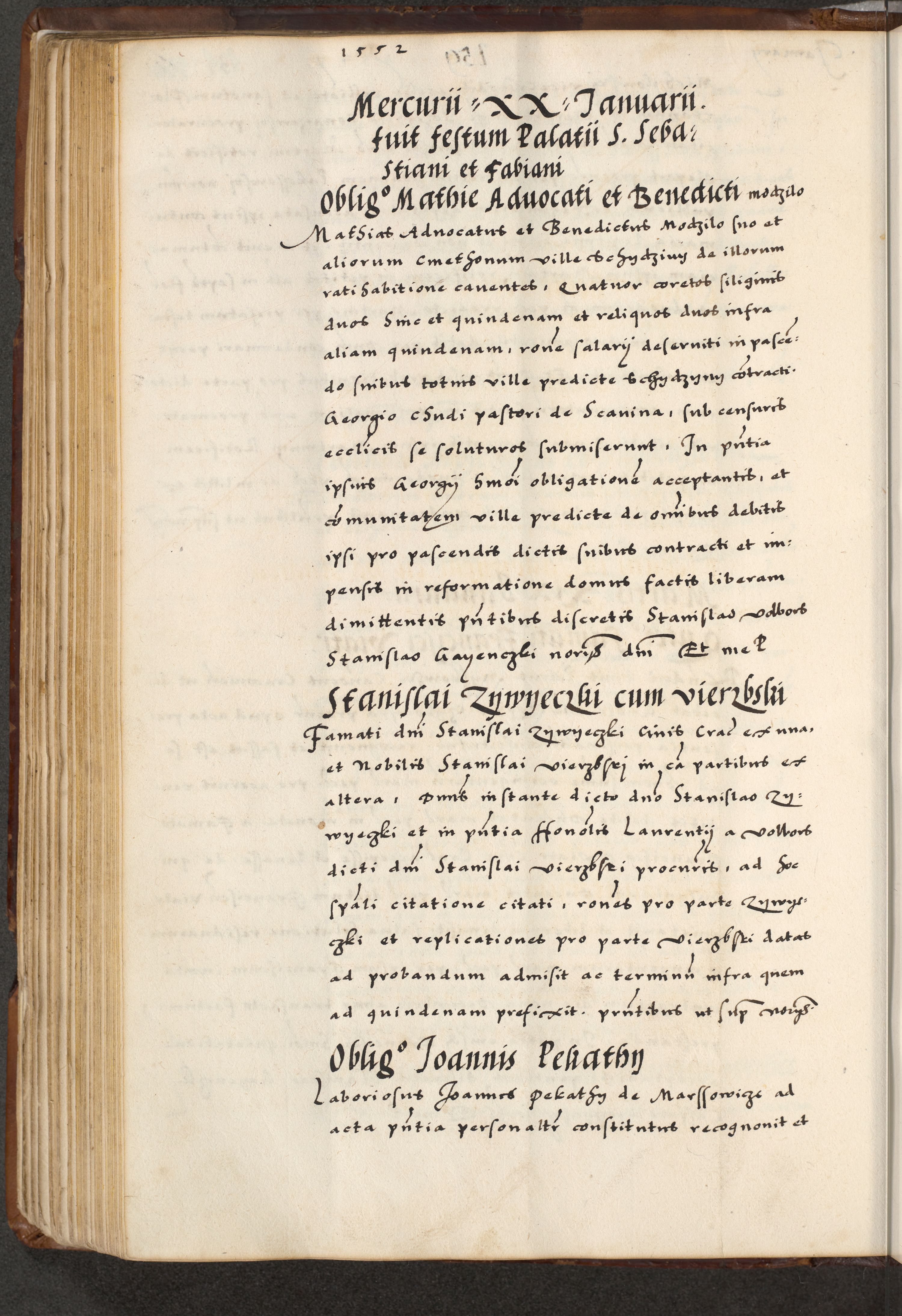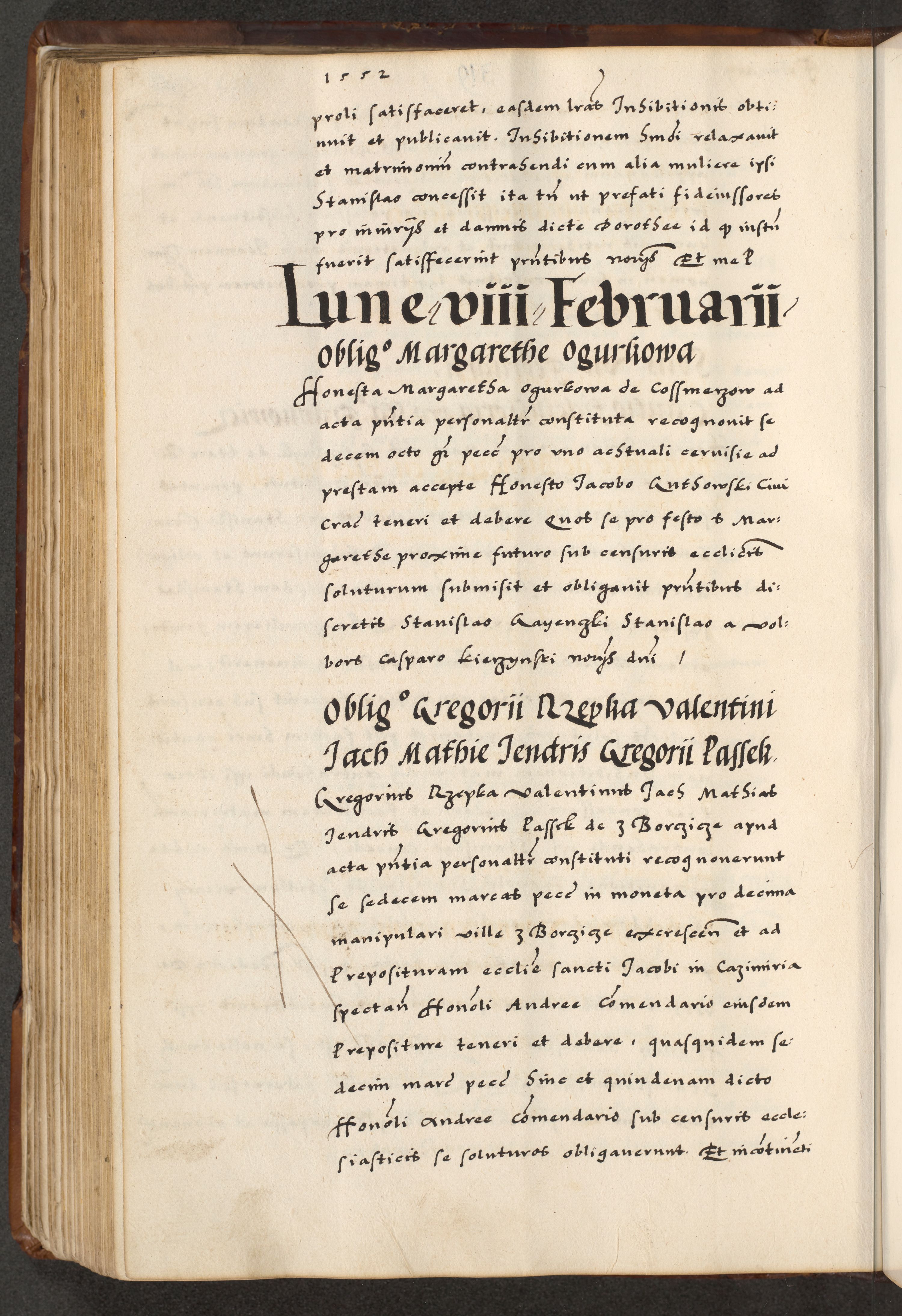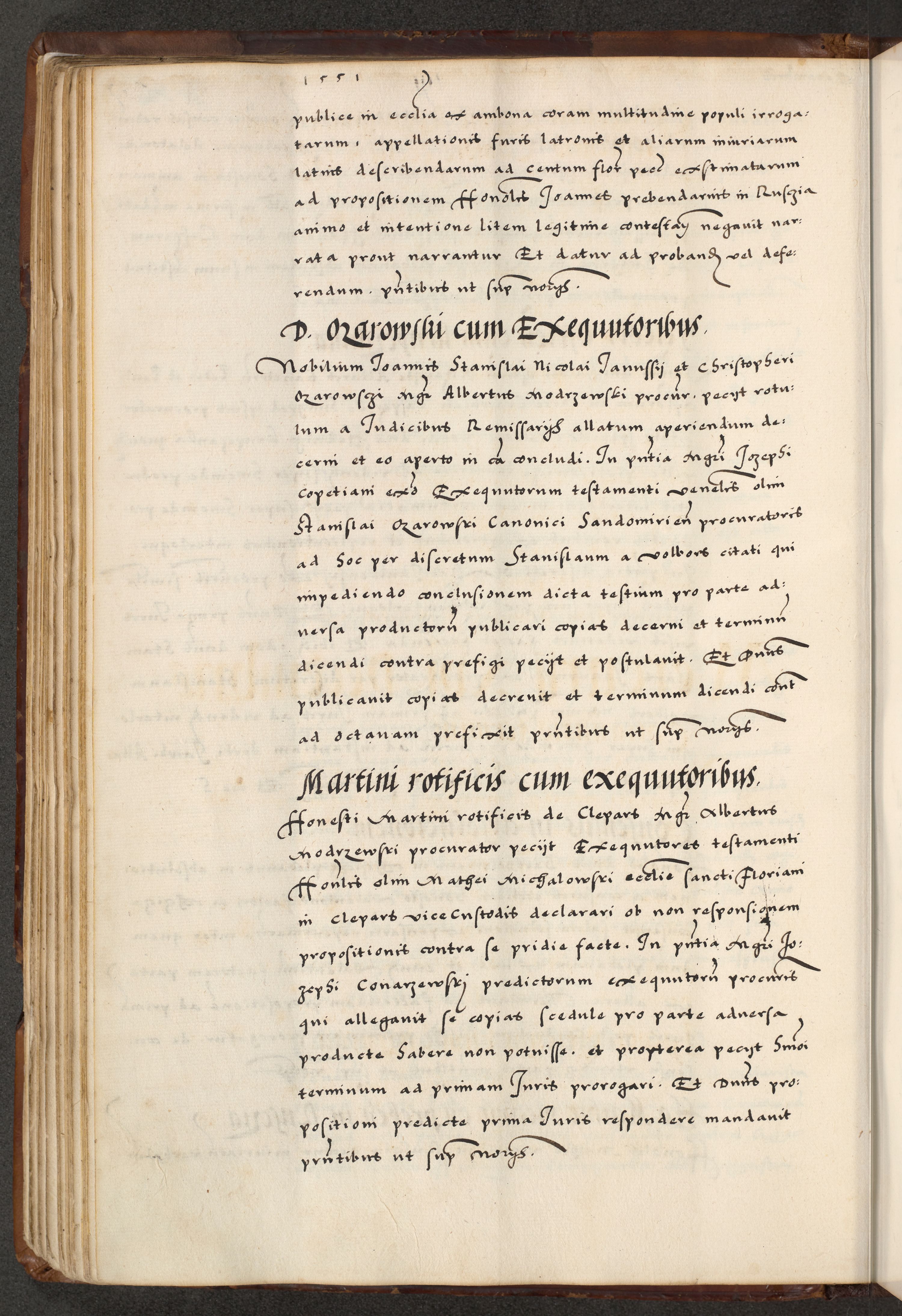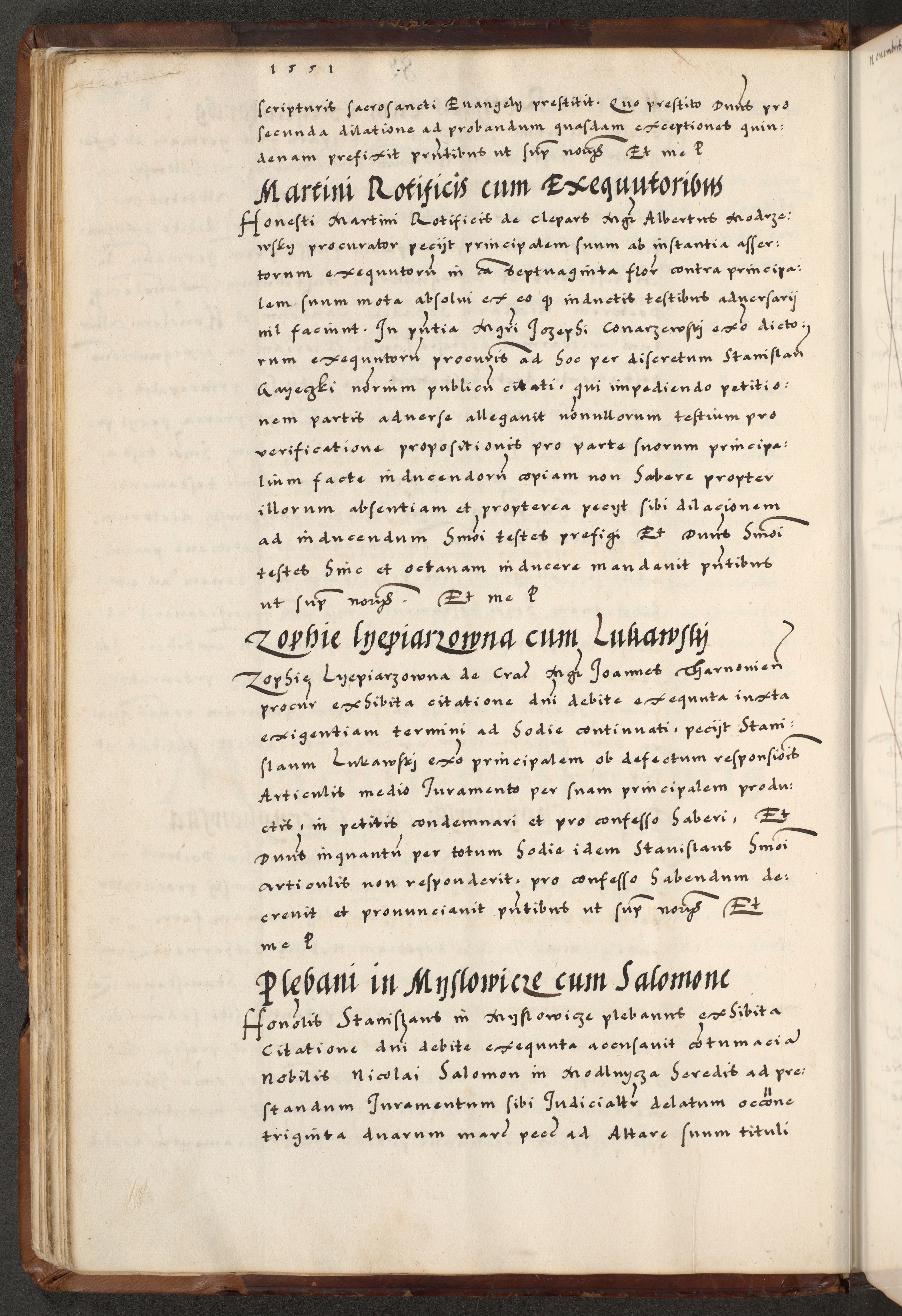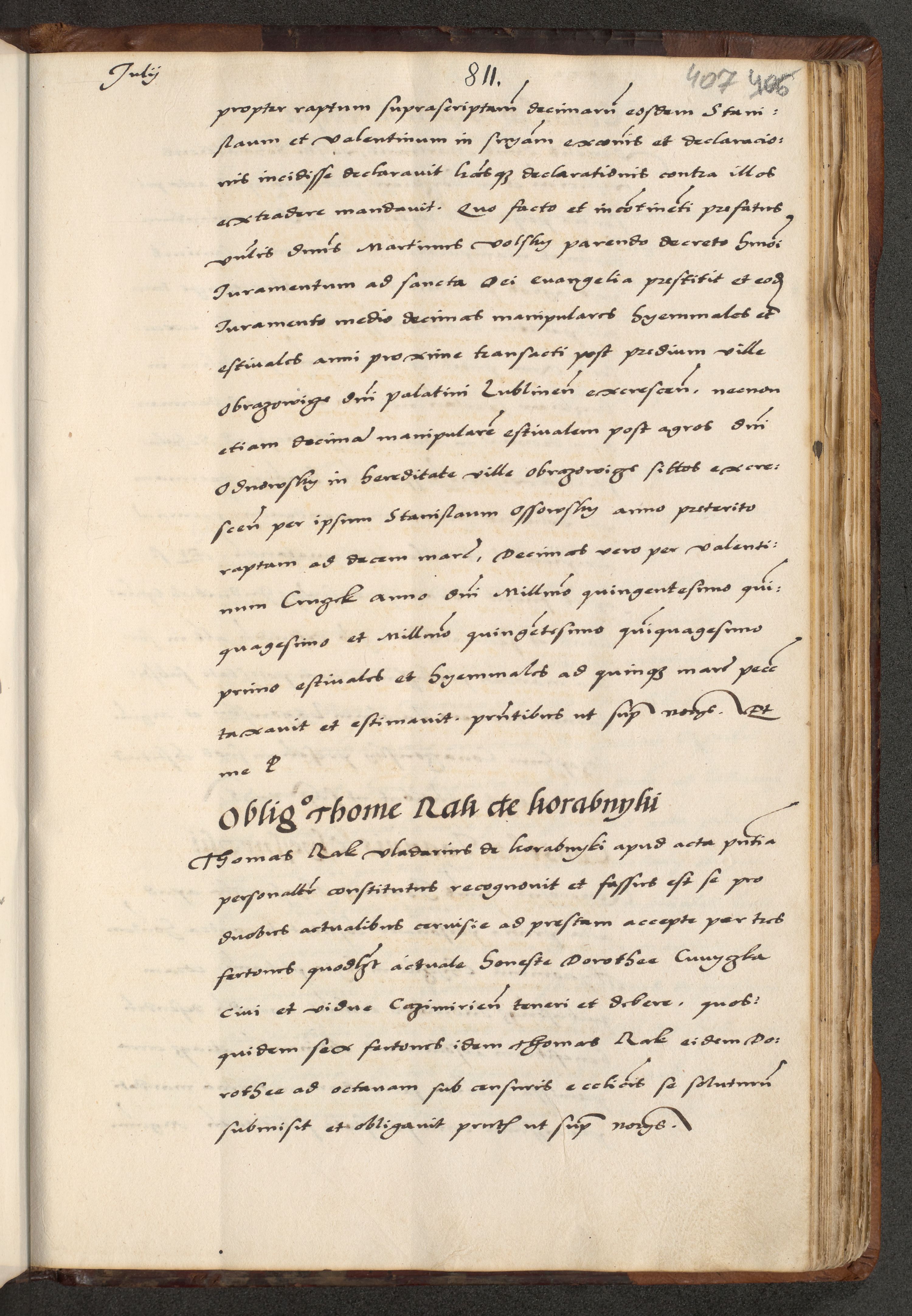 [A]cta actorum causarum, sententiarum tam diffinitivarum quam interloquutoriarum, obligationum, constitutionum et contractuum coram reverendo patre domino Petro Porembski preposito Osvieczimensi, canonico et officiali generali Cracoviensi de anno Domini millesimo quingentesimo quinguagesimo primo, cuius indictio est nona, pontificatus sanctissimi in Christo patris et domini nostri domini Juliii divina providencia pape tercii, anno secundo, a die et mense infrascriptis feliciter continiantur
