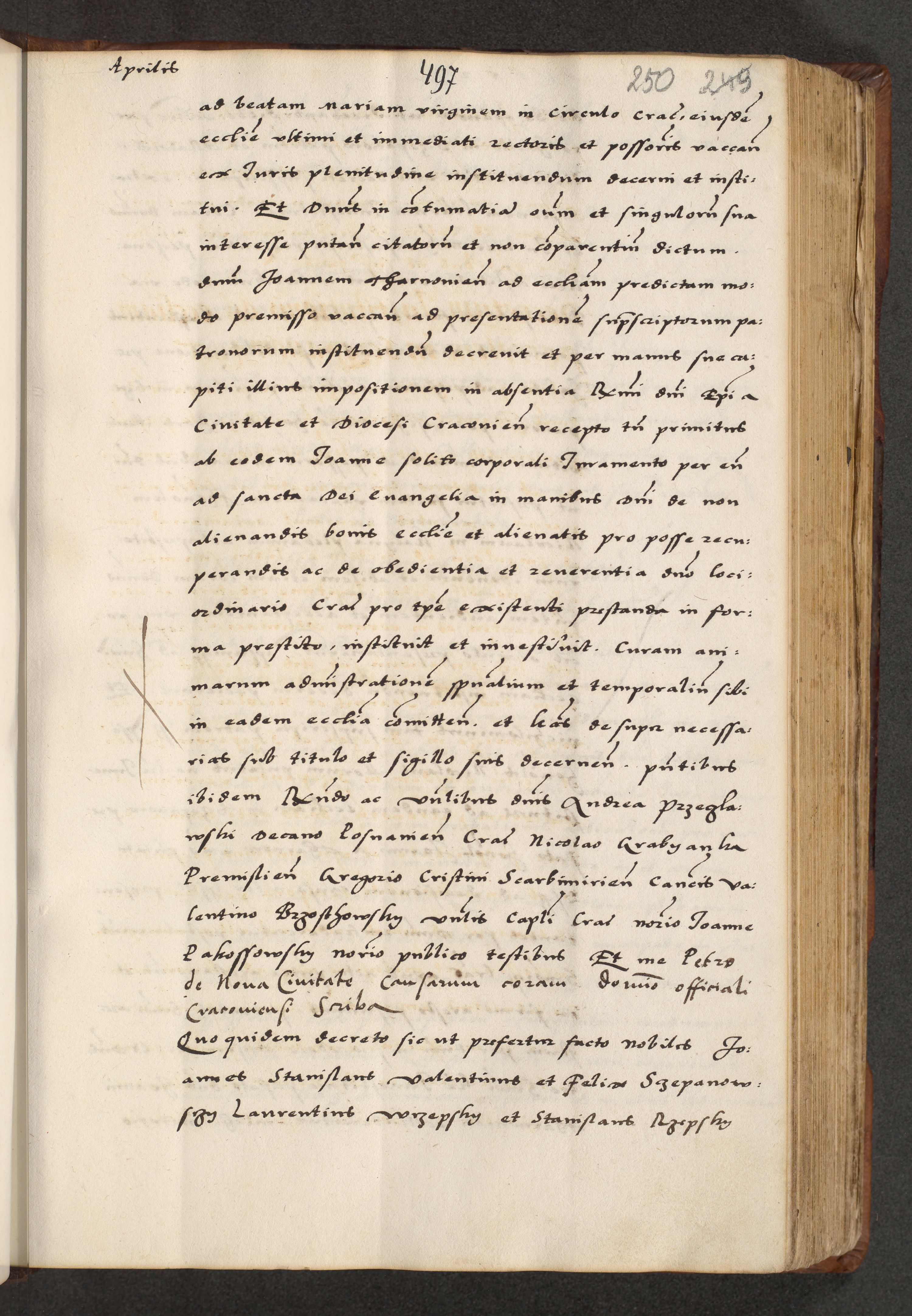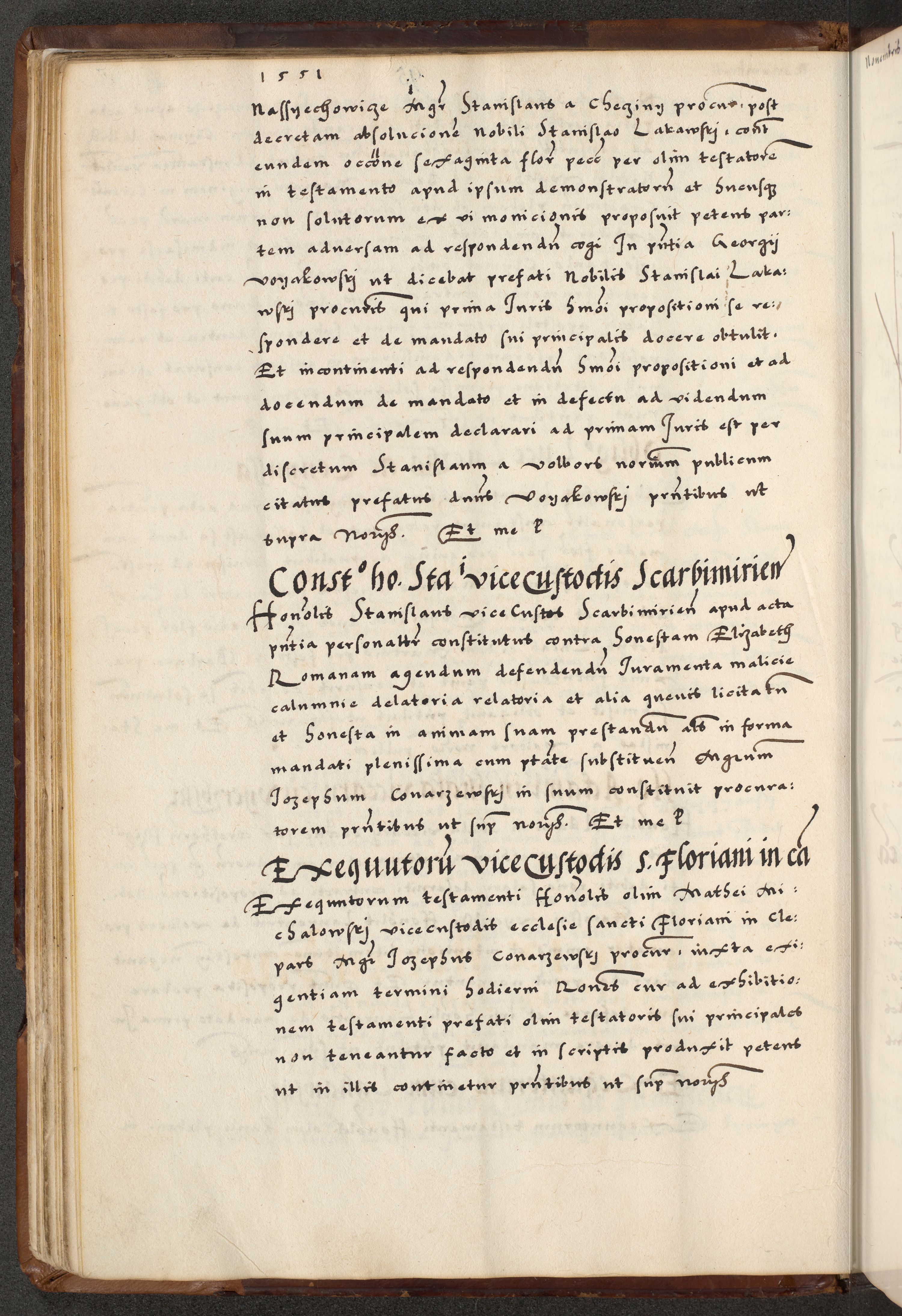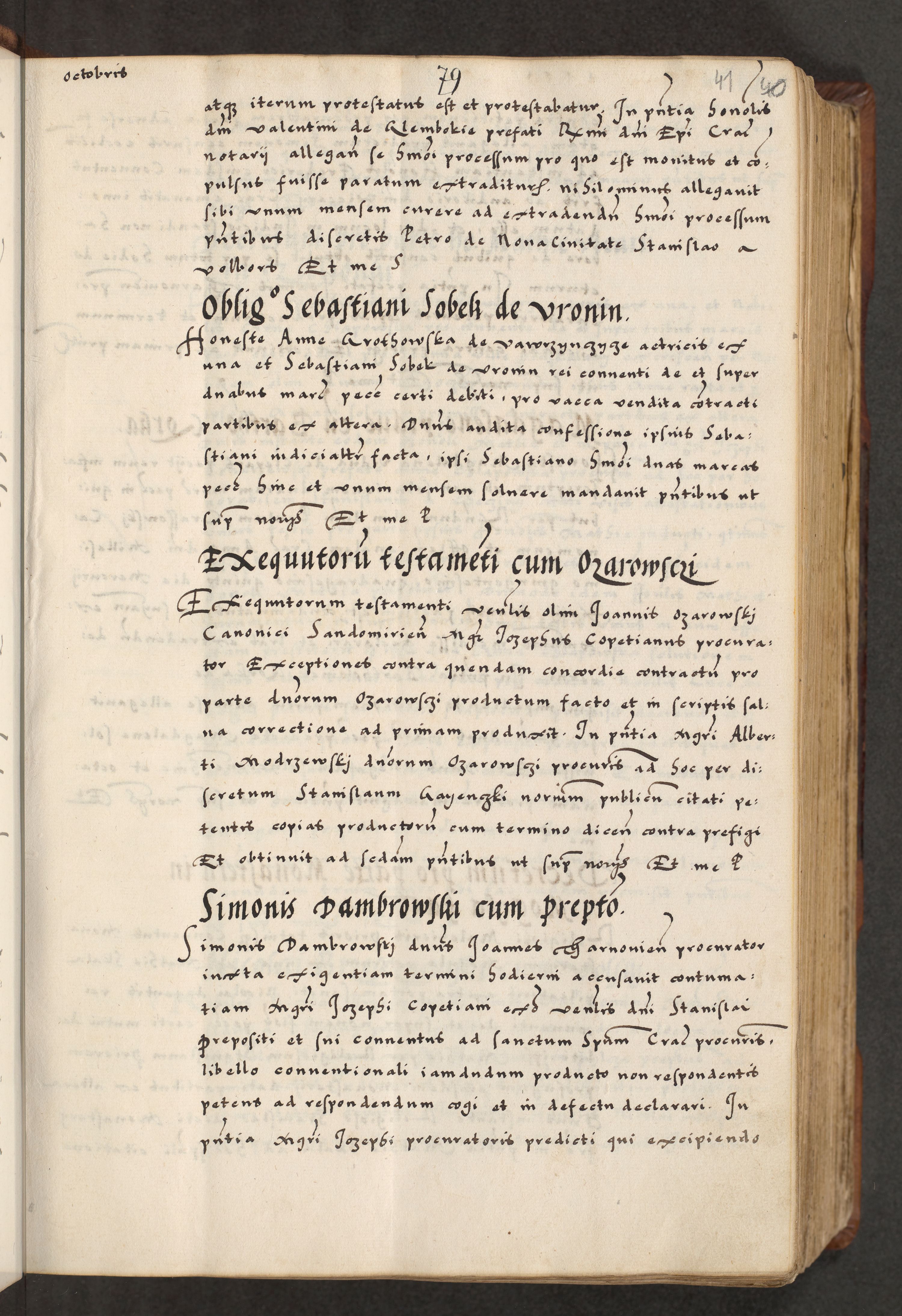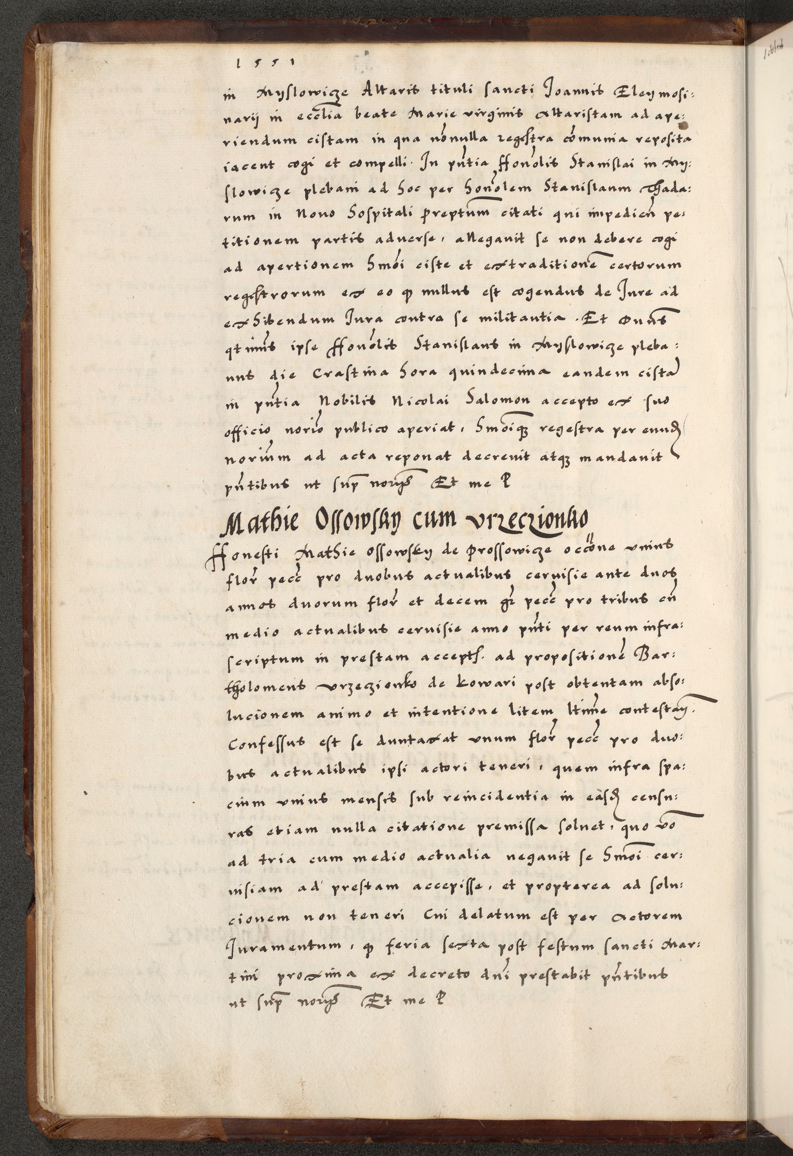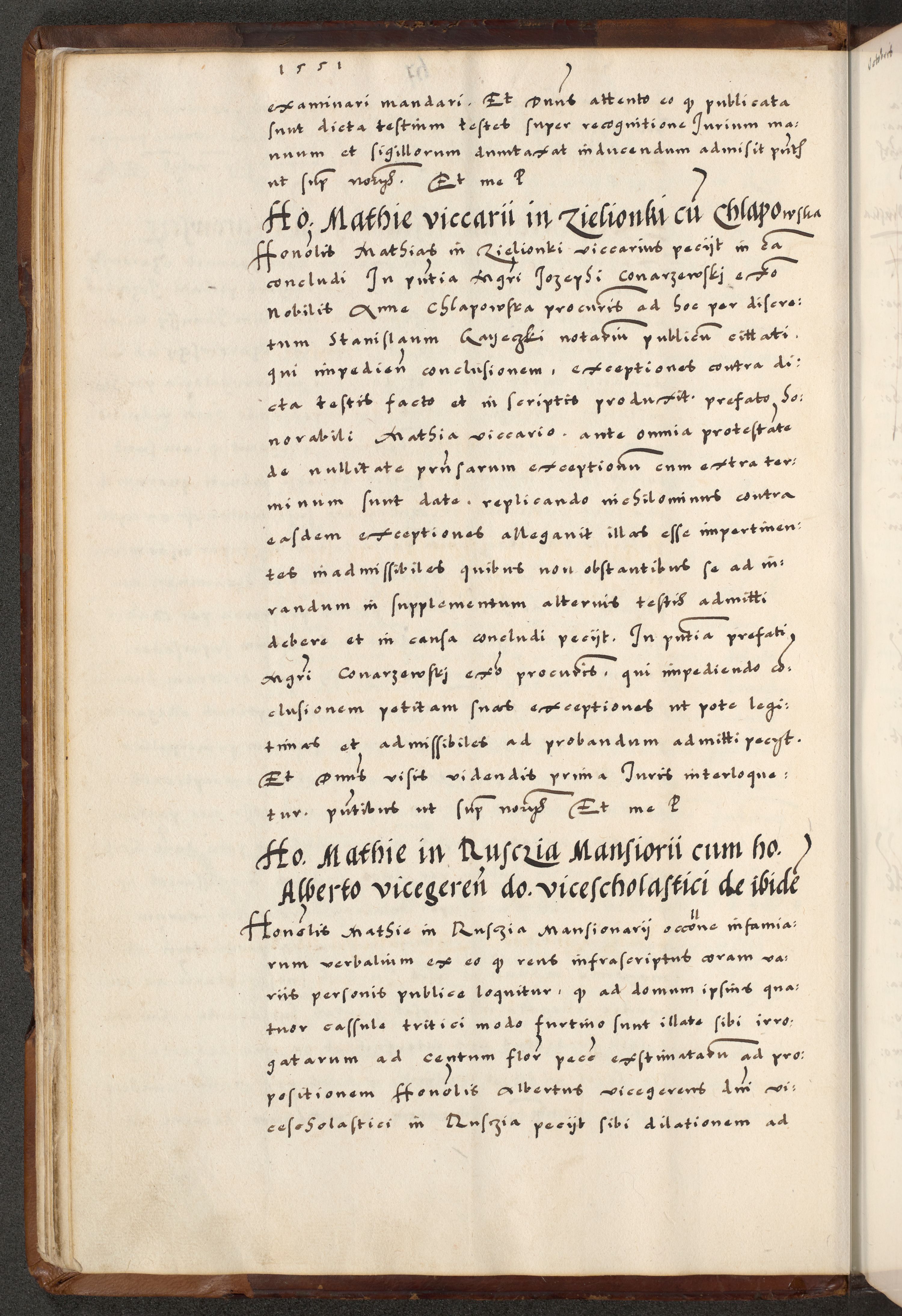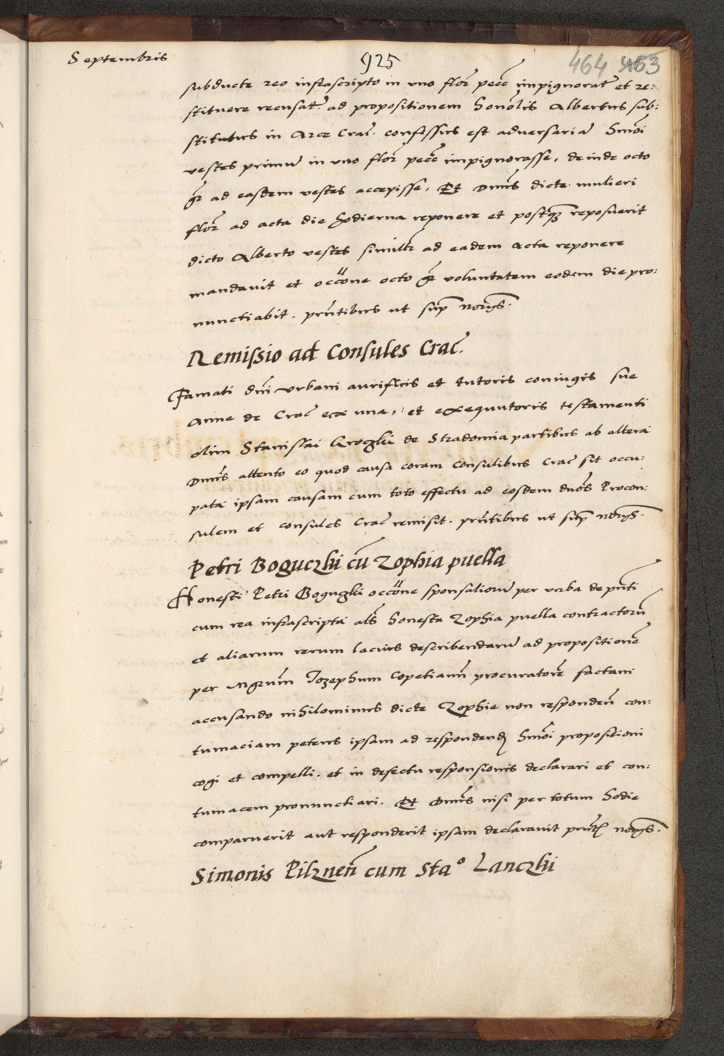 [A]cta actorum causarum, sententiarum tam diffinitivarum quam interloquutoriarum, obligationum, constitutionum et contractuum coram reverendo patre domino Petro Porembski preposito Osvieczimensi, canonico et officiali generali Cracoviensi de anno Domini millesimo quingentesimo quinguagesimo primo, cuius indictio est nona, pontificatus sanctissimi in Christo patris et domini nostri domini Juliii divina providencia pape tercii, anno secundo, a die et mense infrascriptis feliciter continiantur