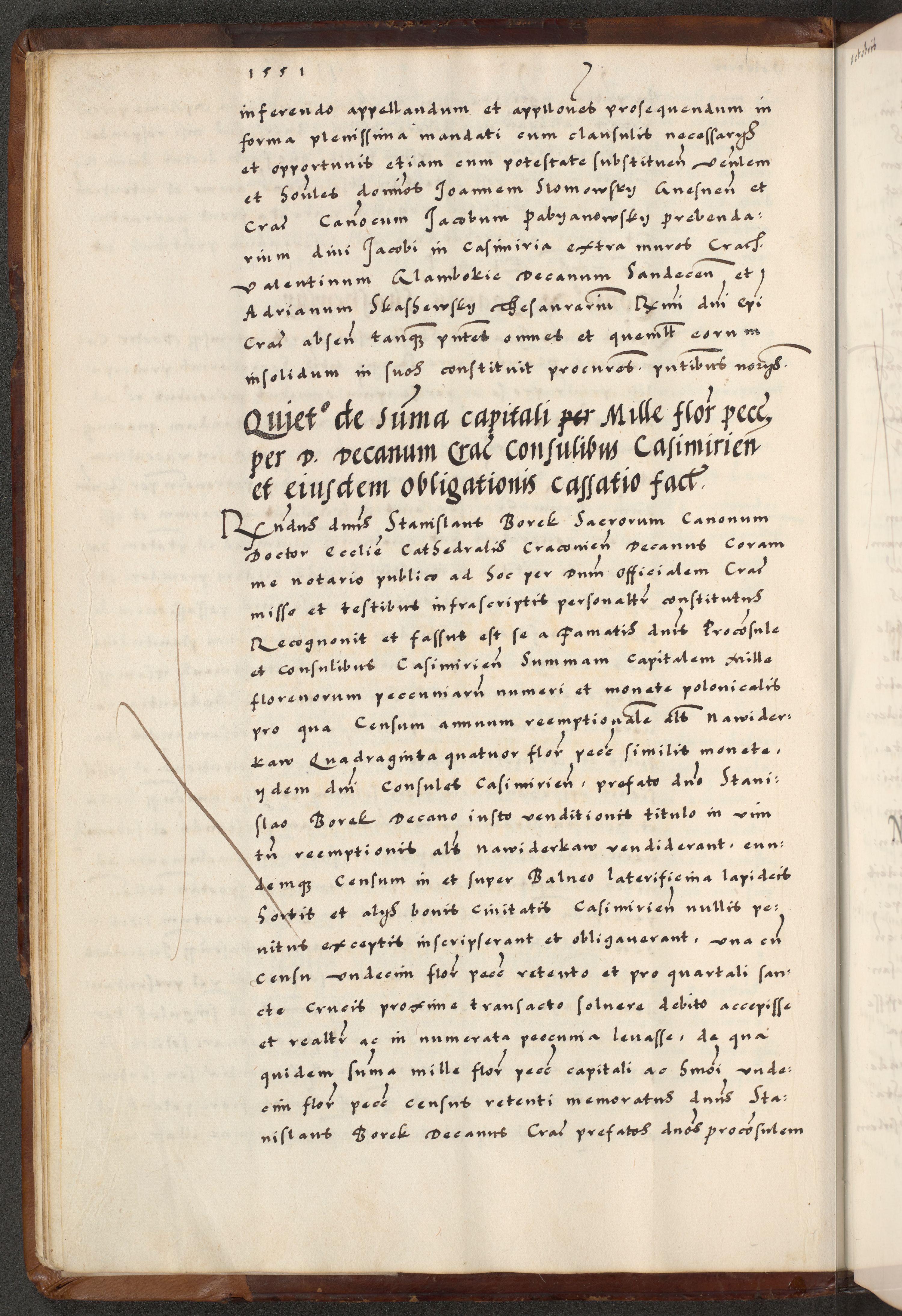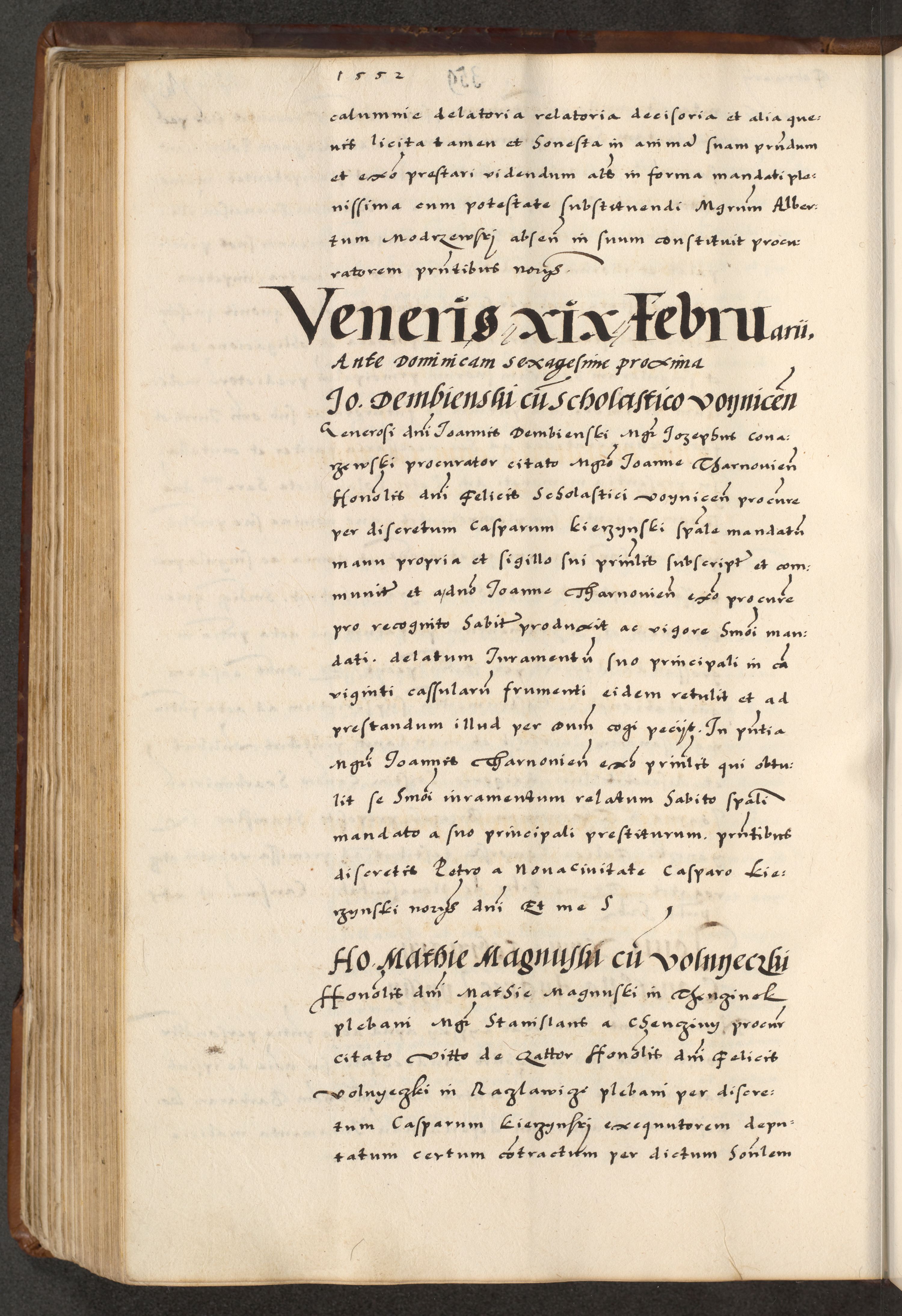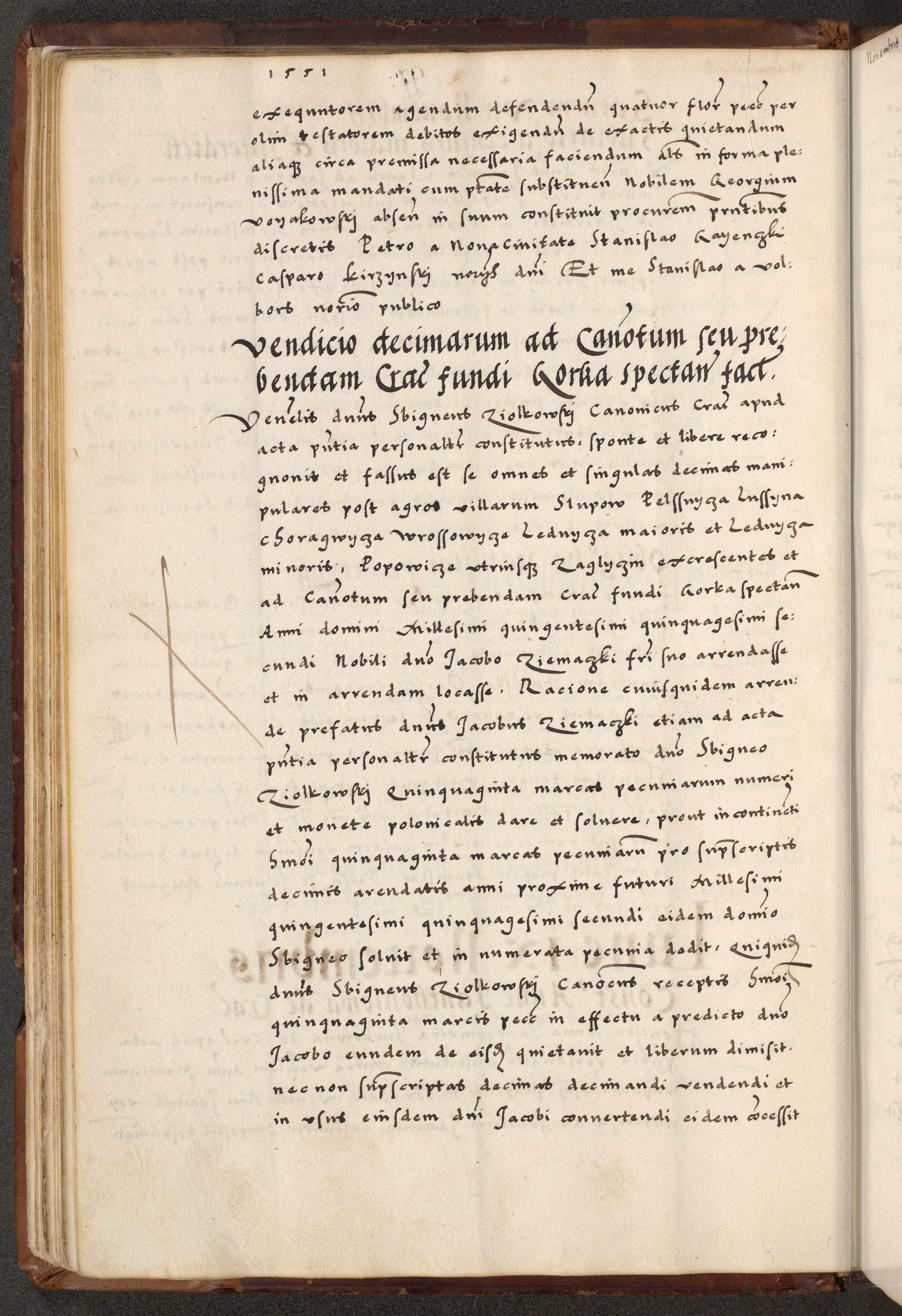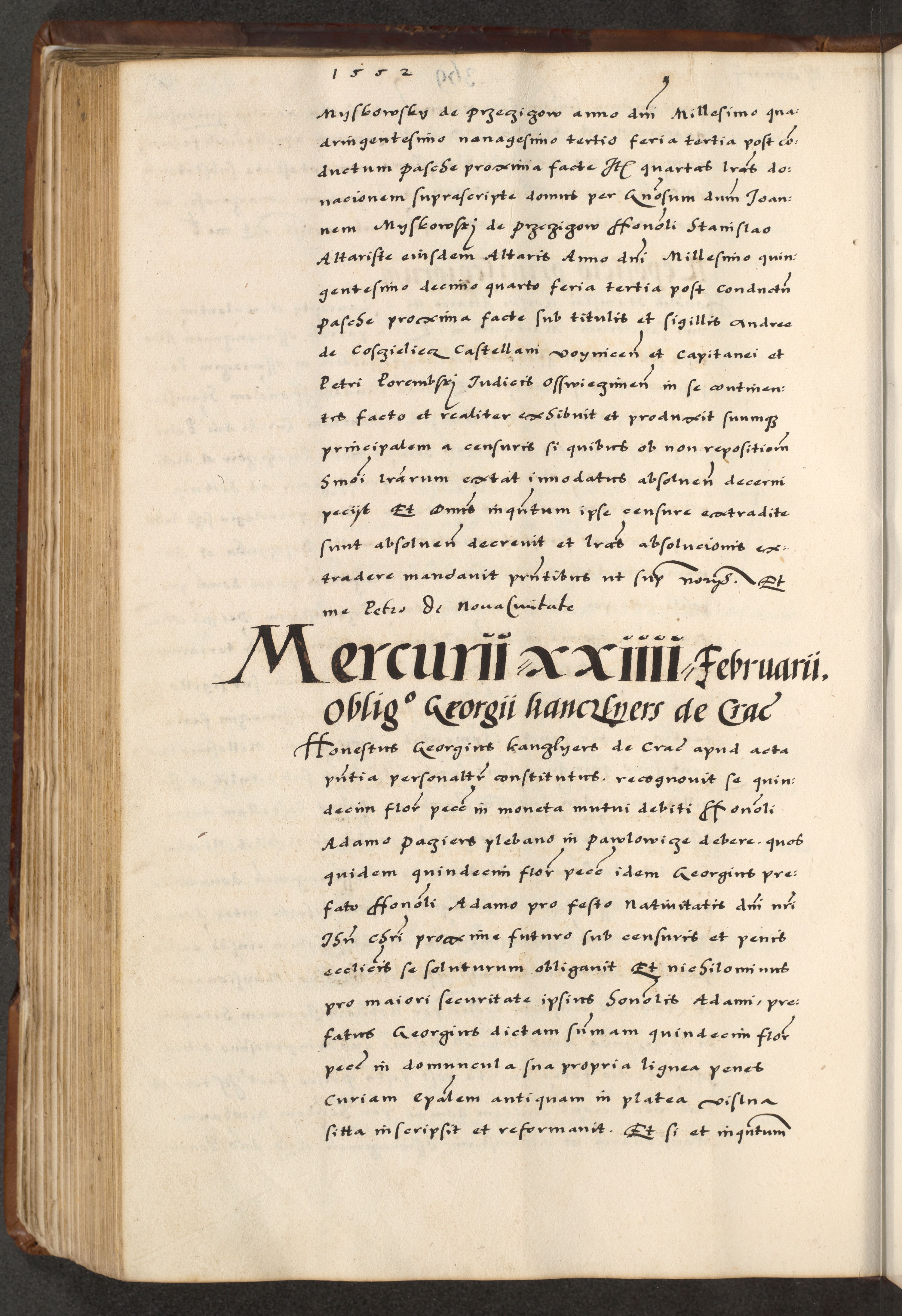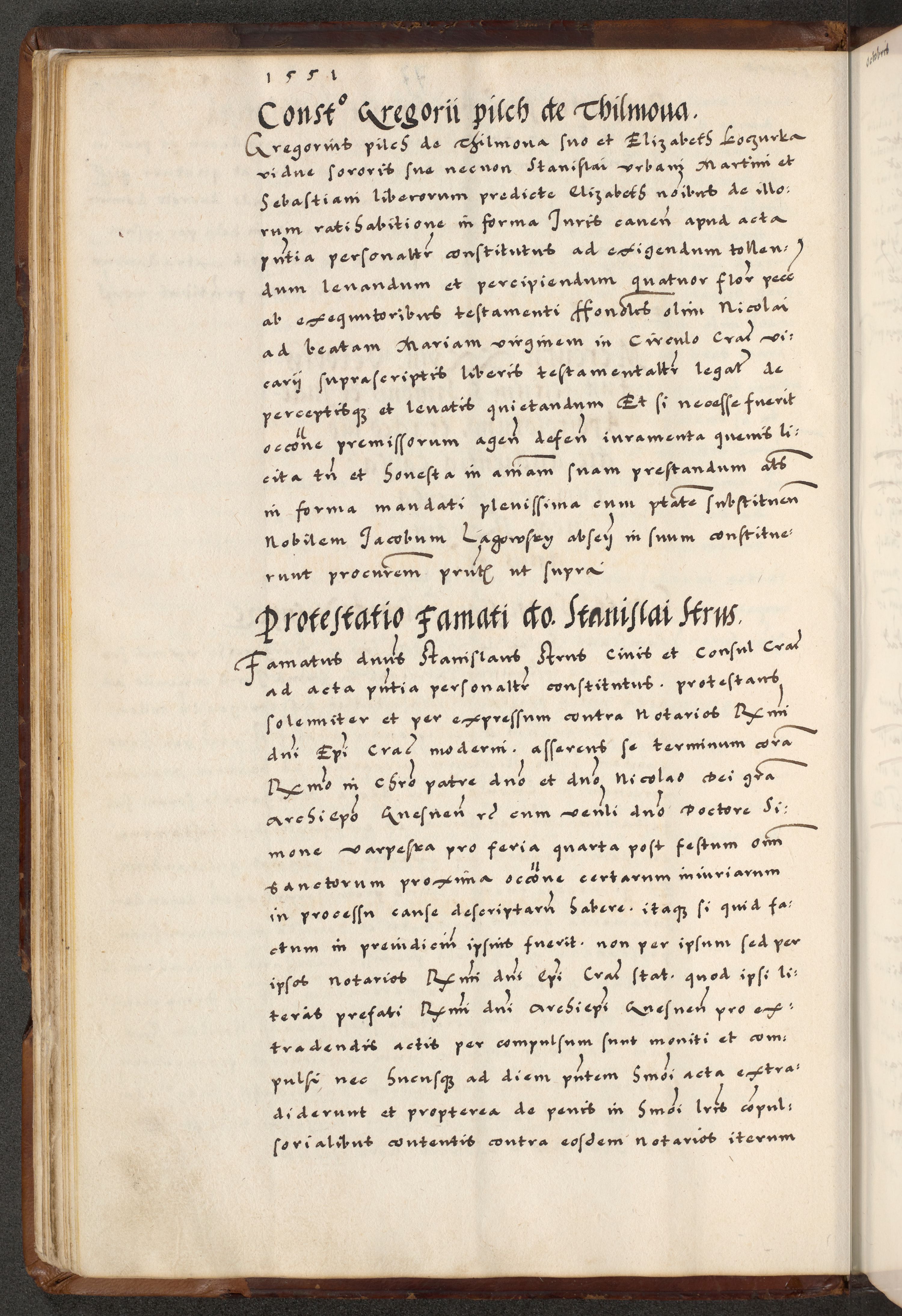 [A]cta actorum causarum, sententiarum tam diffinitivarum quam interloquutoriarum, obligationum, constitutionum et contractuum coram reverendo patre domino Petro Porembski preposito Osvieczimensi, canonico et officiali generali Cracoviensi de anno Domini millesimo quingentesimo quinguagesimo primo, cuius indictio est nona, pontificatus sanctissimi in Christo patris et domini nostri domini Juliii divina providencia pape tercii, anno secundo, a die et mense infrascriptis feliciter continiantur